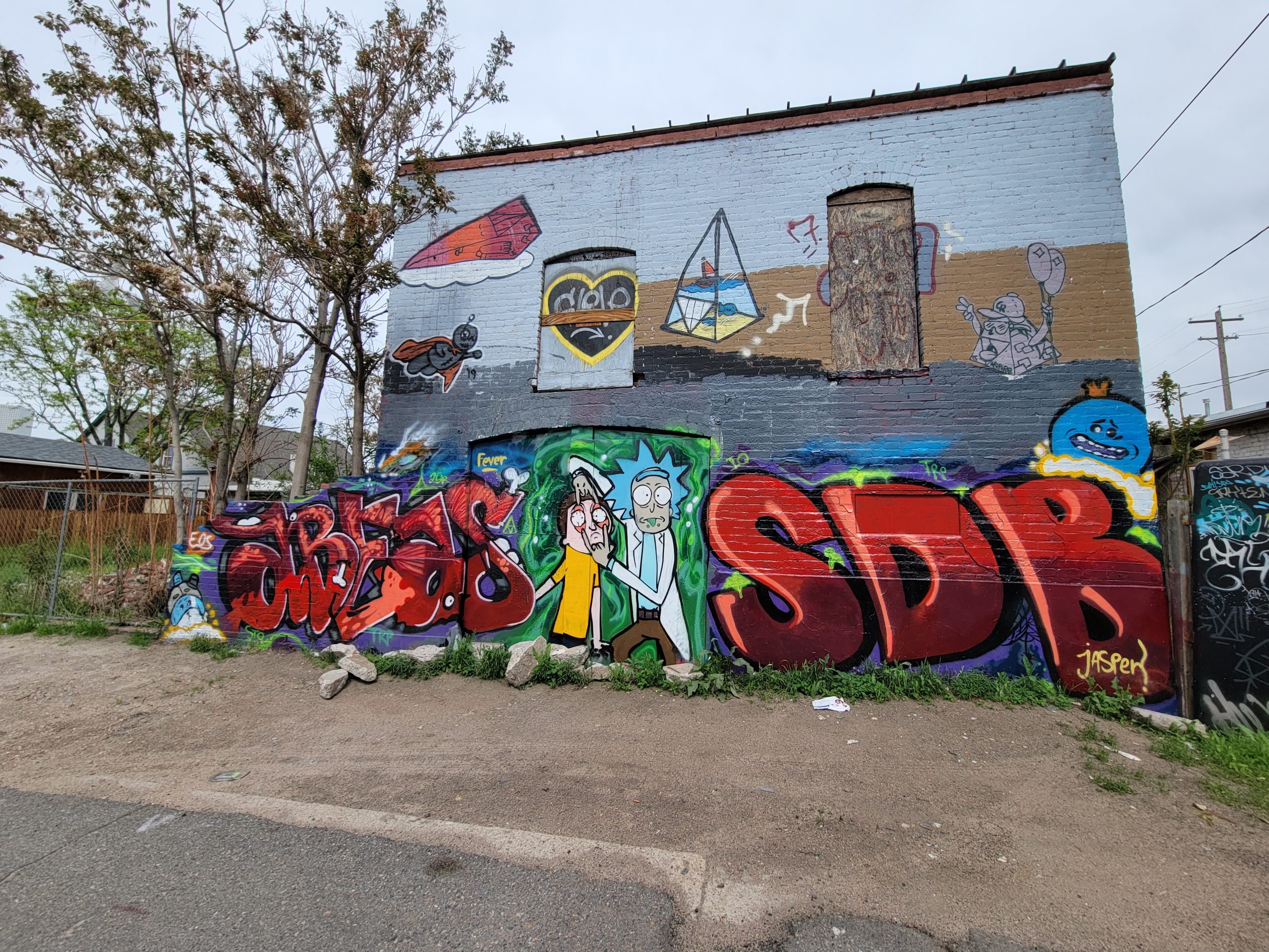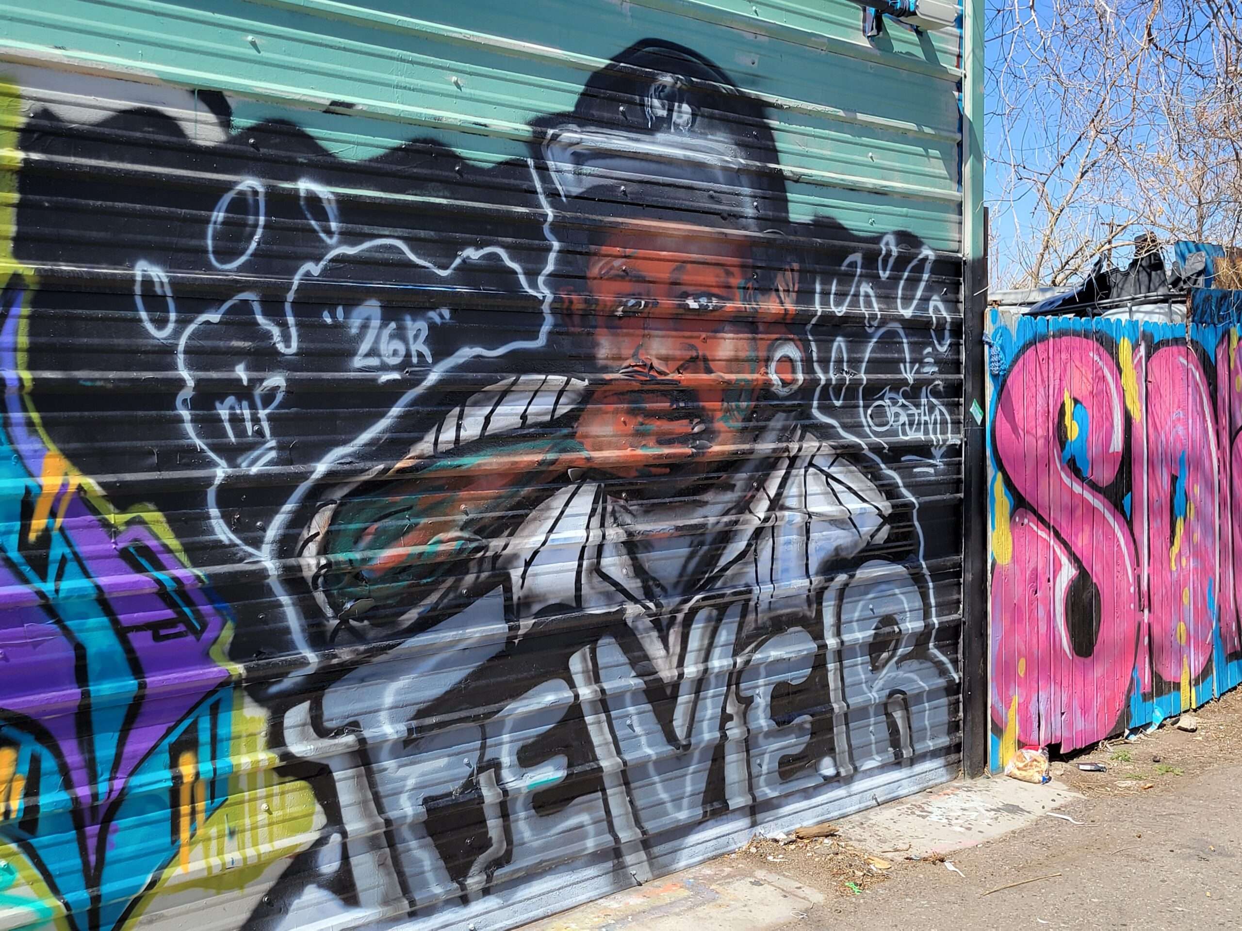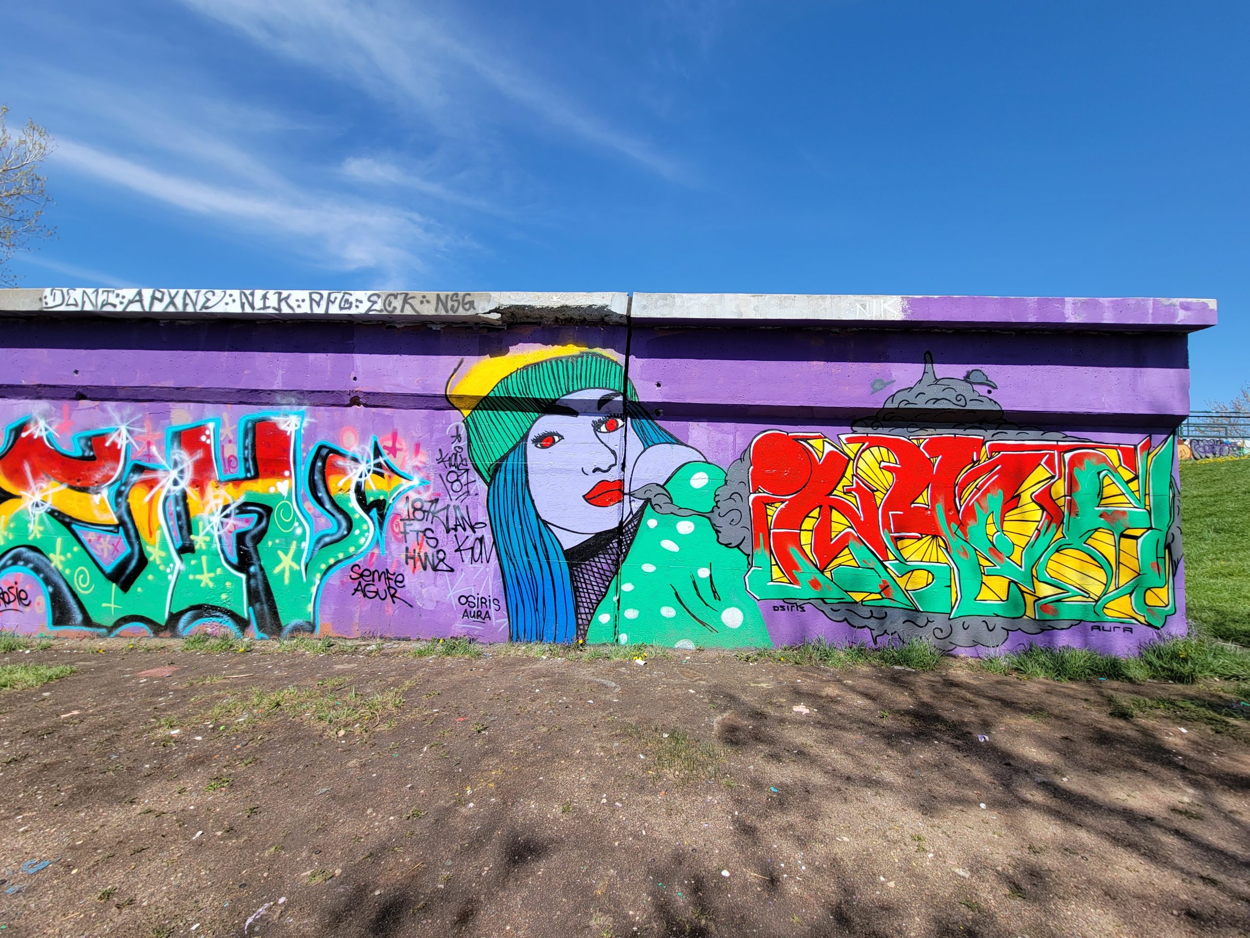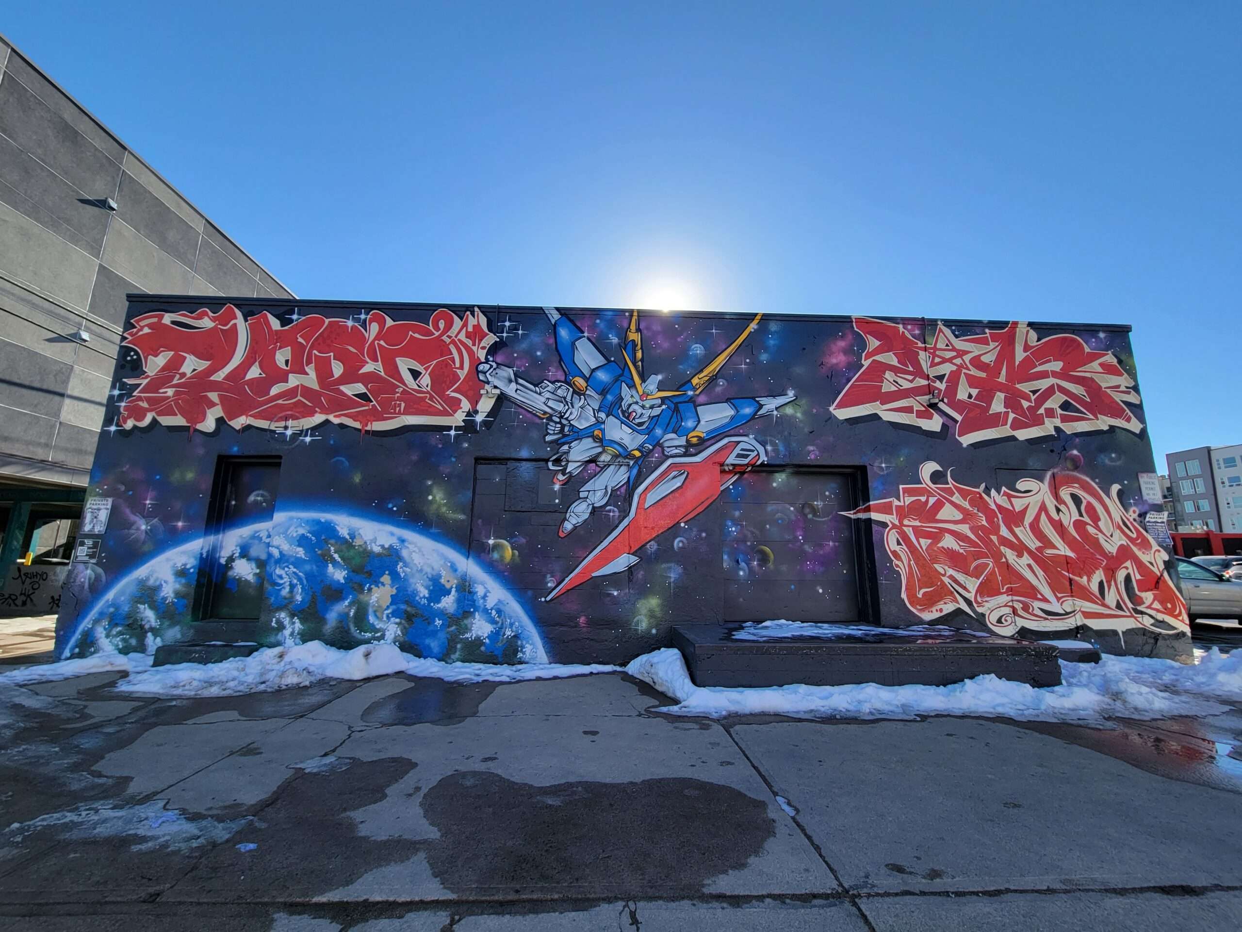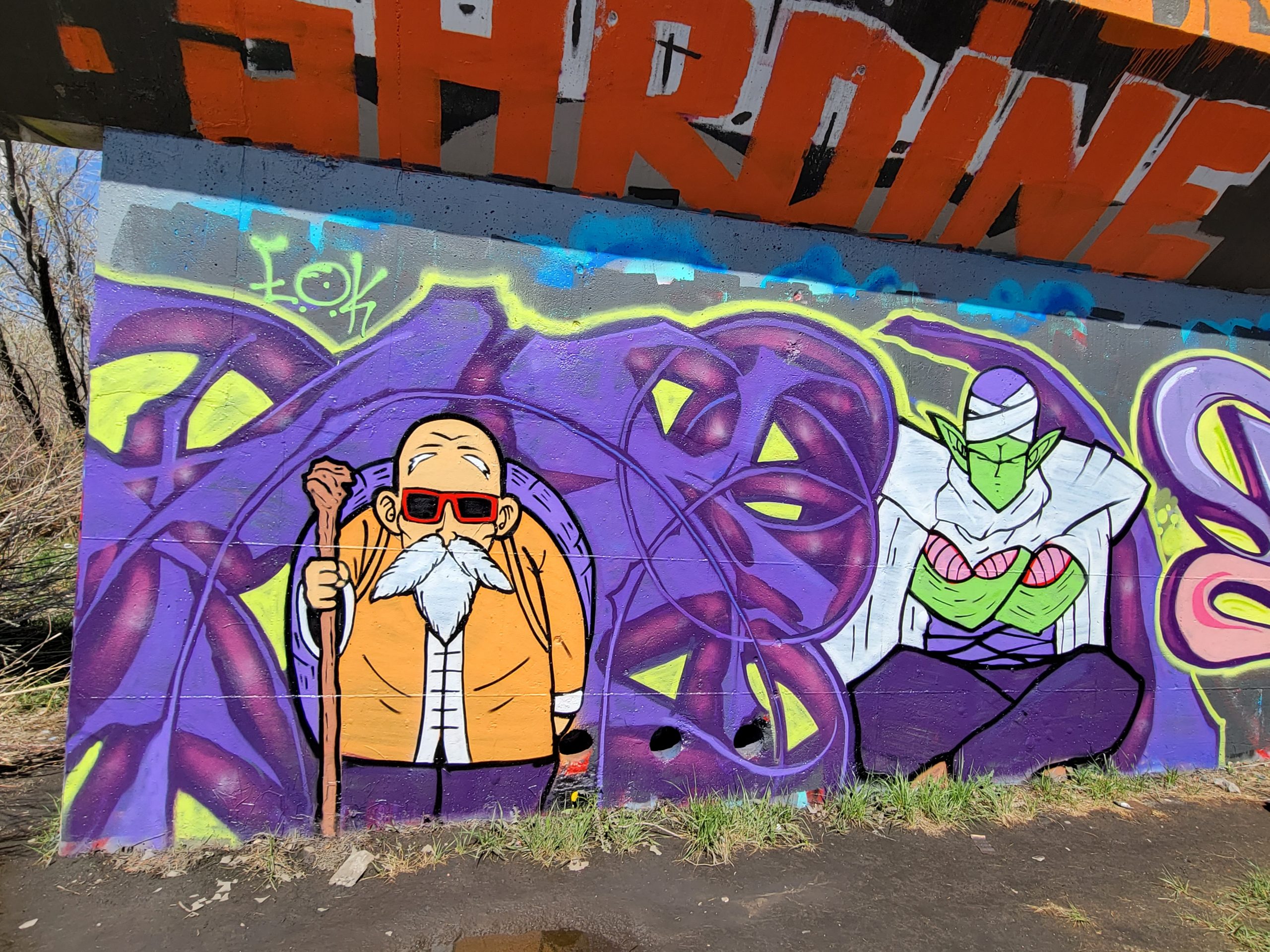 Painted along a concrete underpass wall, this vibrant piece of Denver street art pays homage to the classic anime series Dragon Ball Z. The mural features crisp, cartoon-accurate illustrations of Master Roshi in his signature orange shirt and sunglasses, standing next to a meditating Piccolo in his white cape and turban. Set against a backdrop of large, looping purple graffiti letters and situated beneath a bridge ledge tagged with bold orange text, this artwork highlights the playful intersection of global pop culture and the local urban canvas.