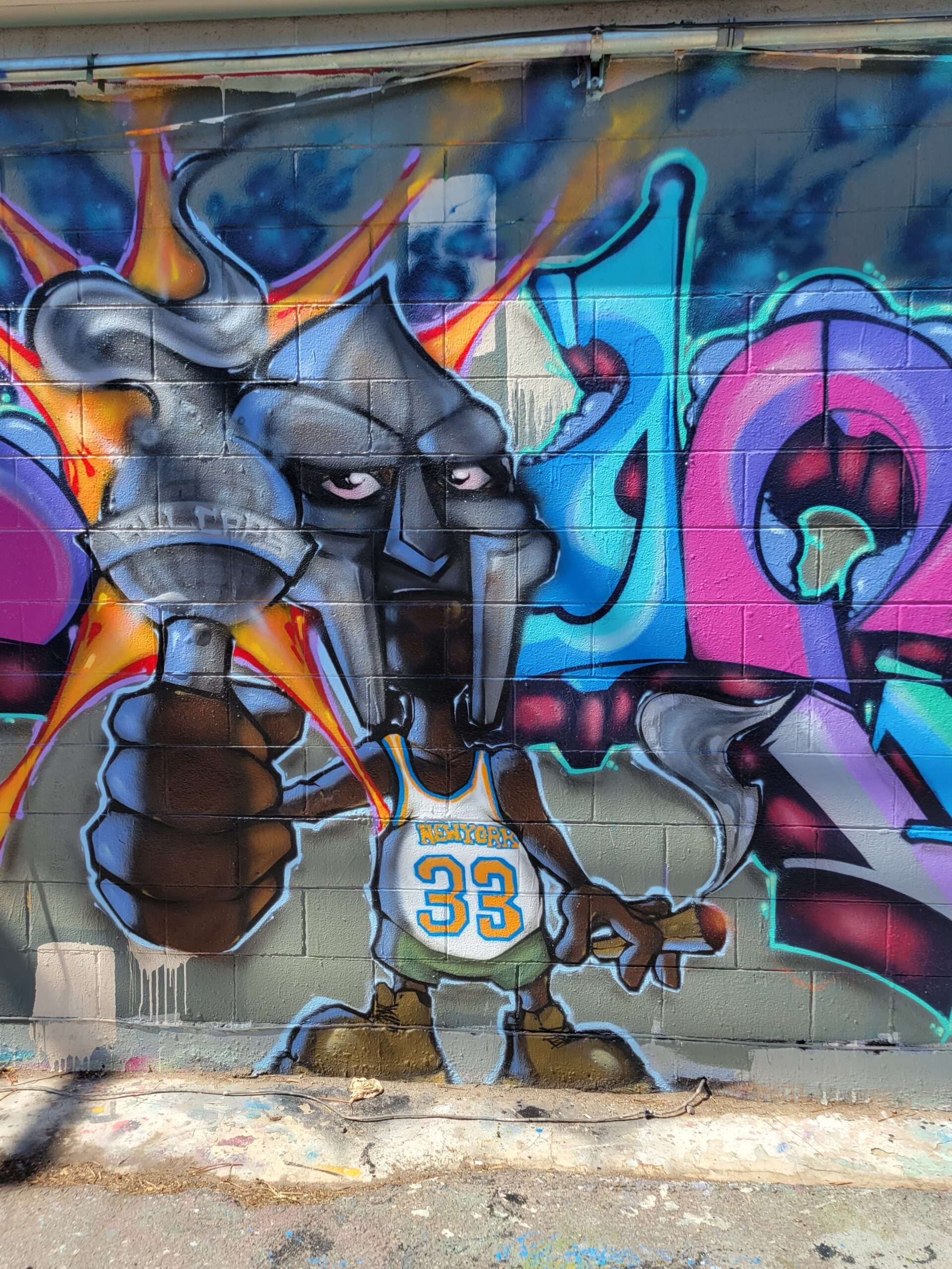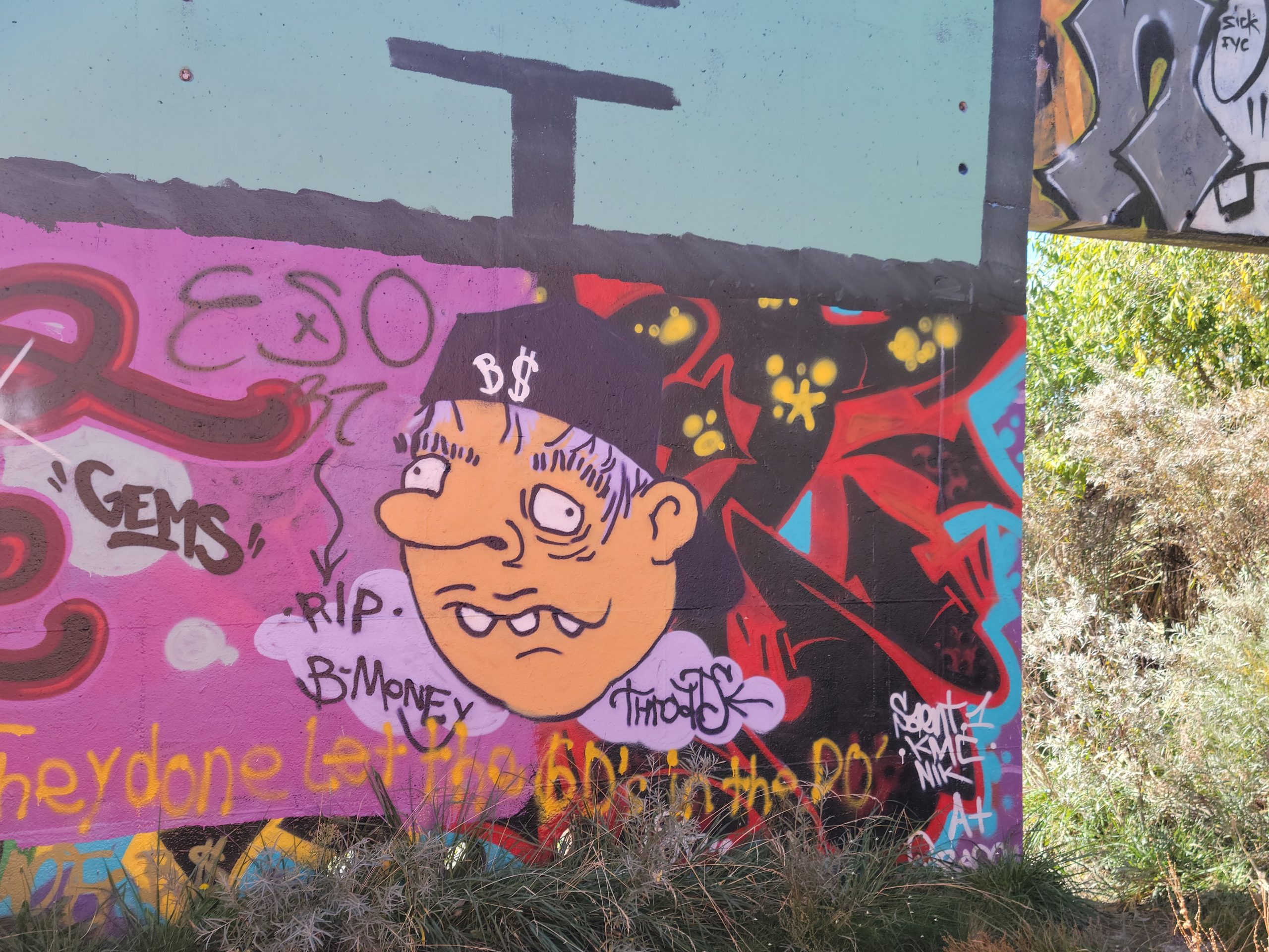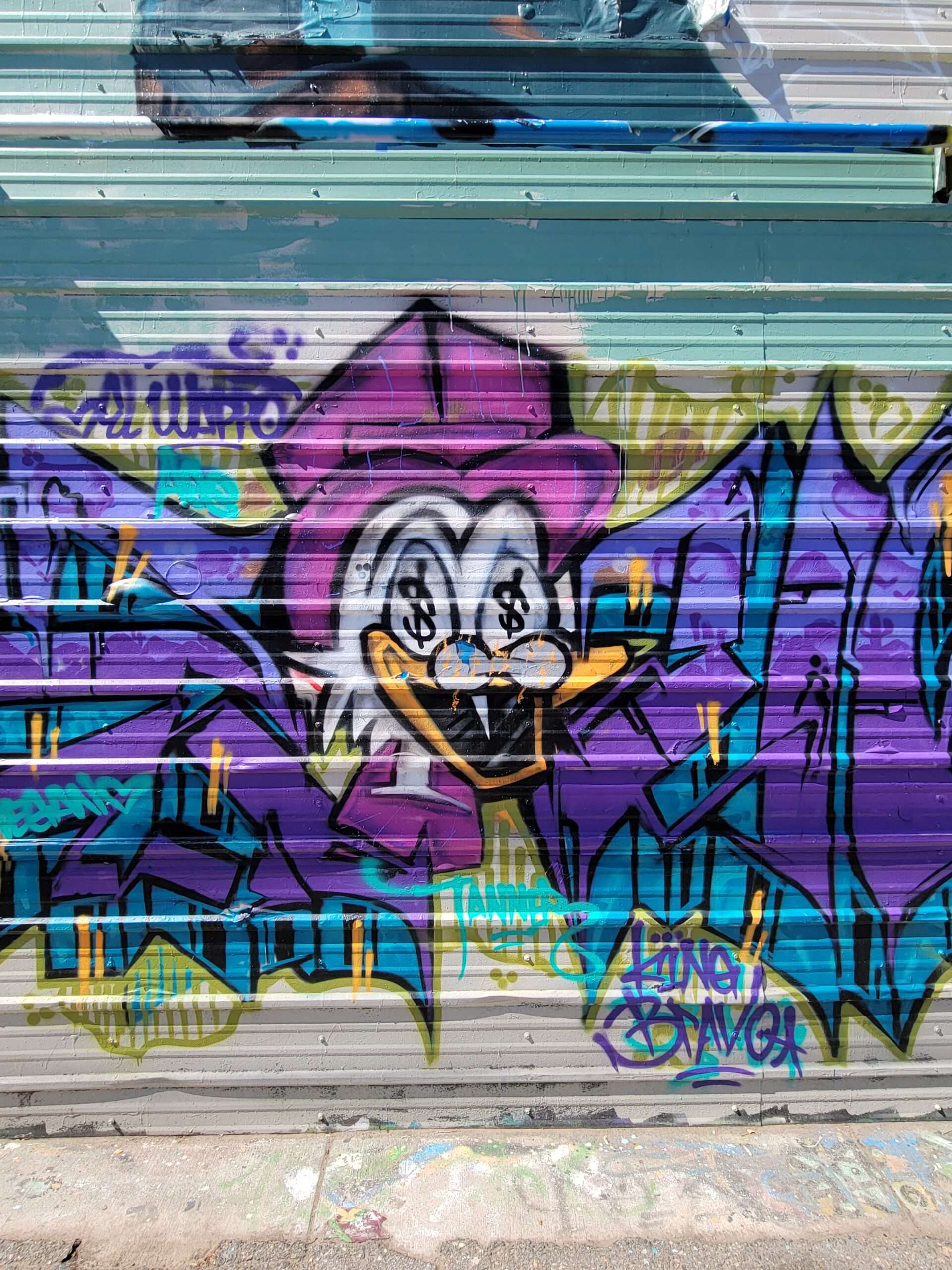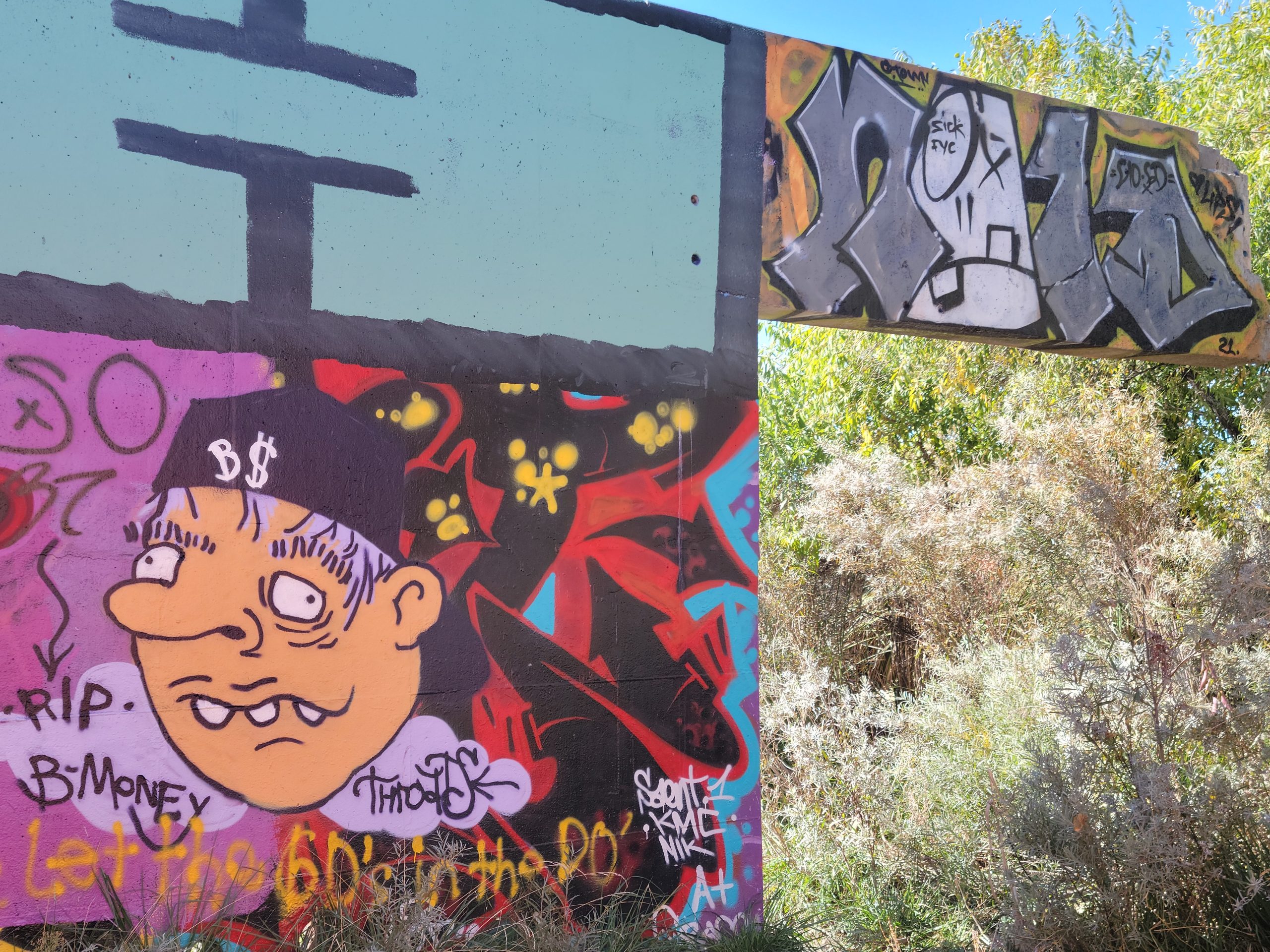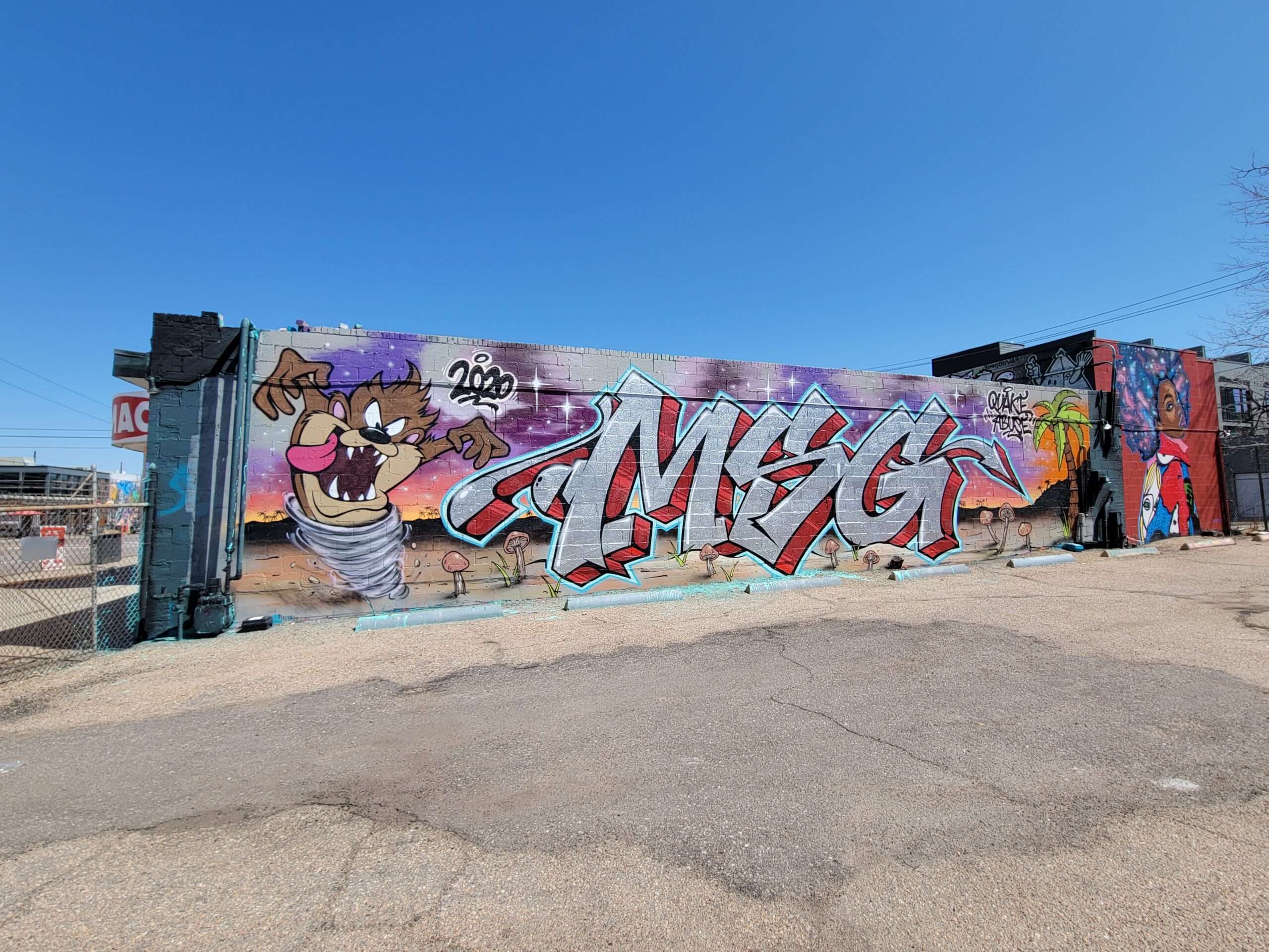 Painted along a concrete underpass wall, this vibrant piece of Denver street art pays homage to the classic anime series Dragon Ball Z. The mural features crisp, cartoon-accurate illustrations of Master Roshi in his signature orange shirt and sunglasses, standing next to a meditating Piccolo in his white cape and turban. Set against a backdrop of large, looping purple graffiti letters and situated beneath a bridge ledge tagged with bold orange text, this artwork highlights the playful intersection of global pop culture and the local urban canvas.
