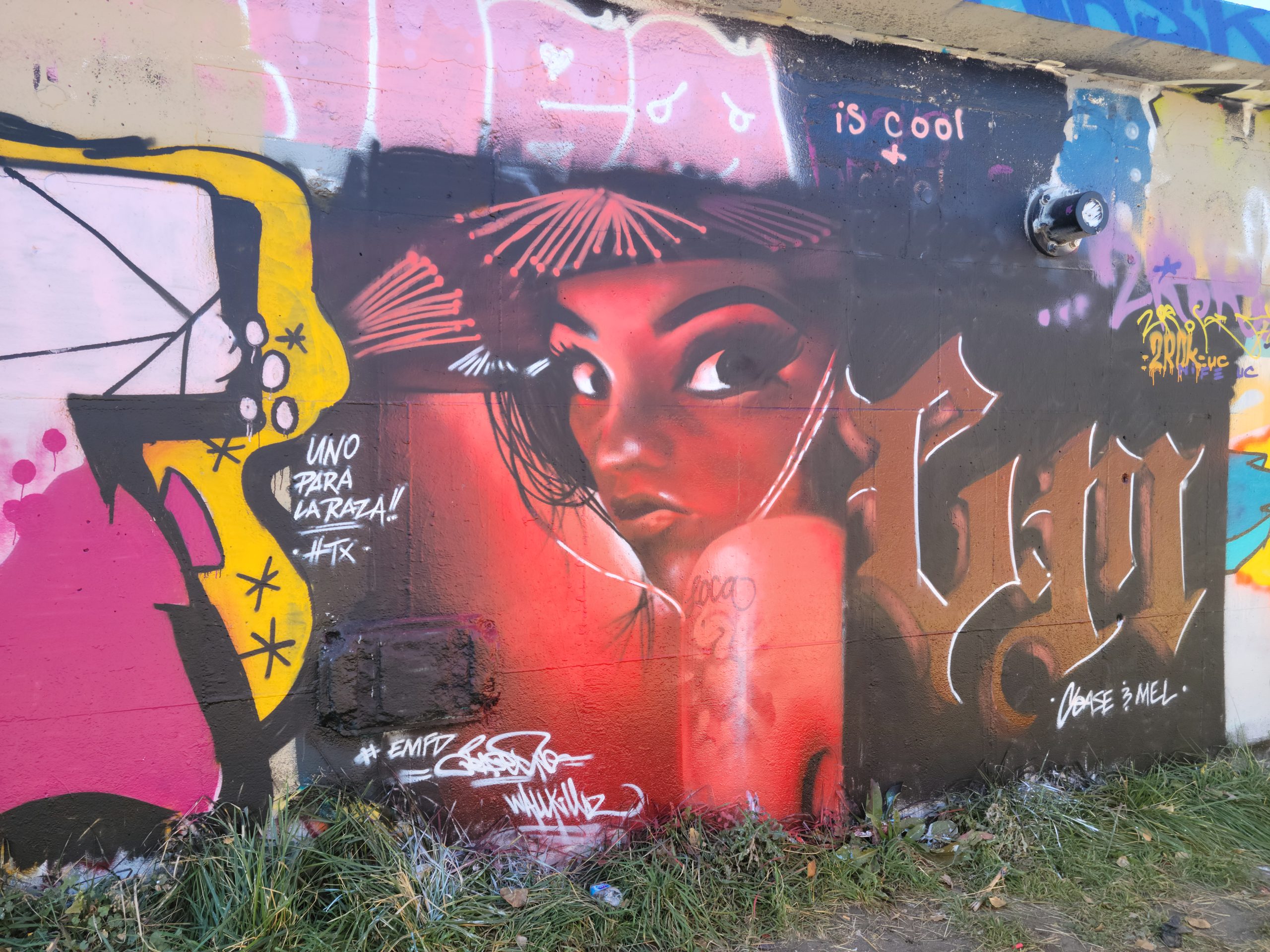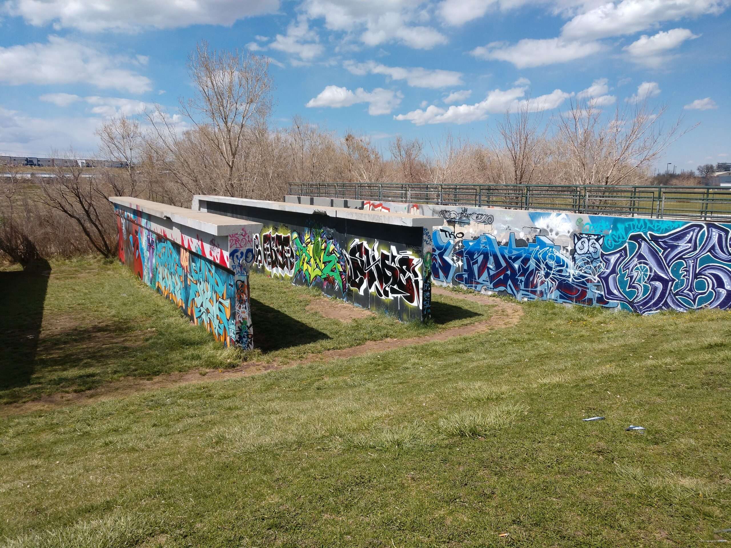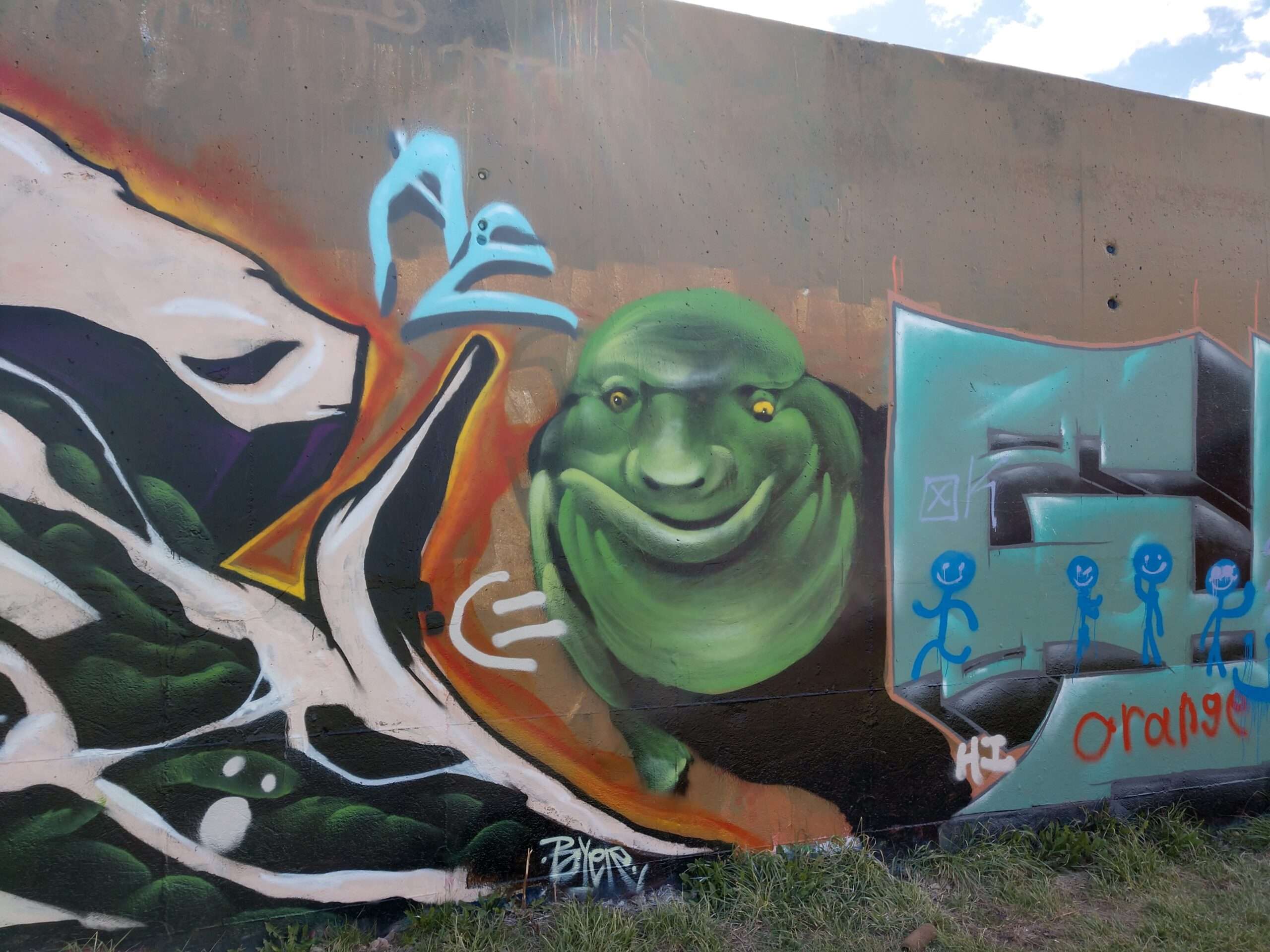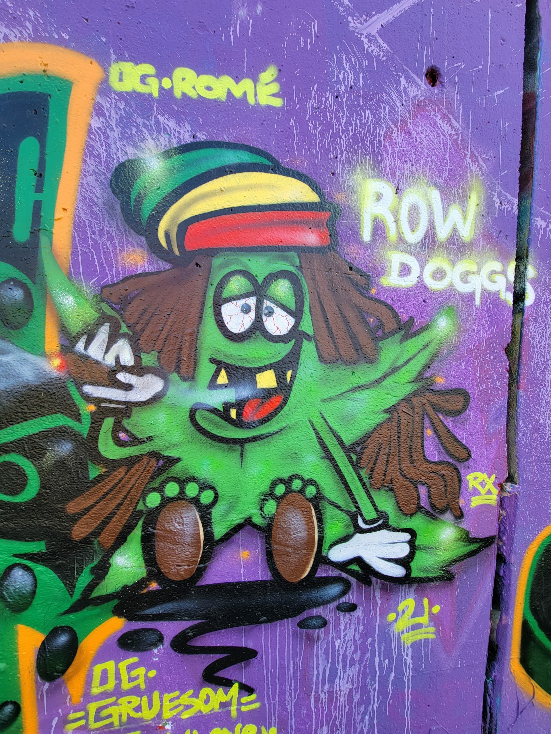 Painted along a concrete underpass wall, this vibrant piece of Denver street art pays homage to the classic anime series Dragon Ball Z. The mural features crisp, cartoon-accurate illustrations of Master Roshi in his signature orange shirt and sunglasses, standing next to a meditating Piccolo in his white cape and turban. Set against a backdrop of large, looping purple graffiti letters and situated beneath a bridge ledge tagged with bold orange text, this artwork highlights the playful intersection of global pop culture and the local urban canvas.