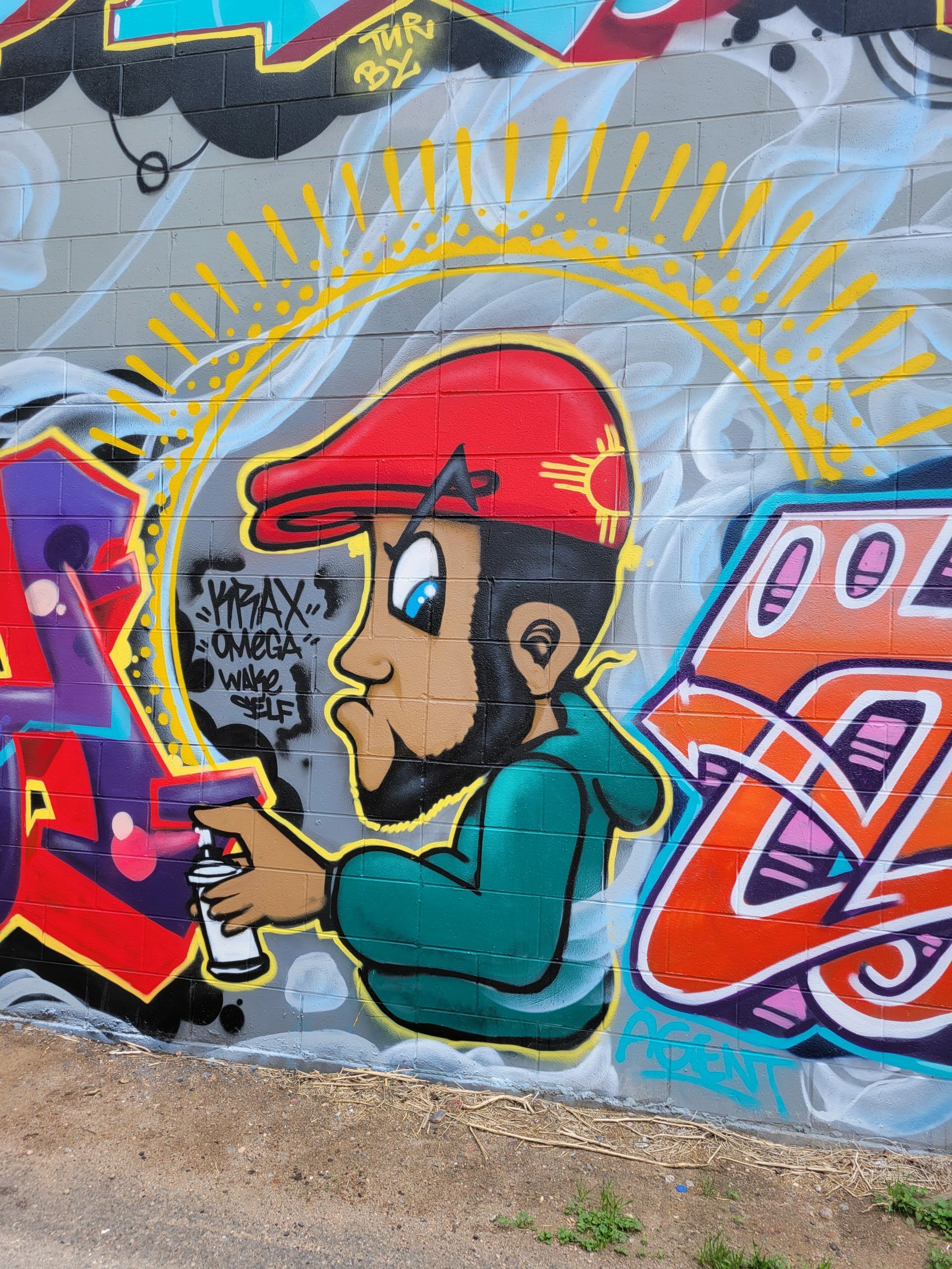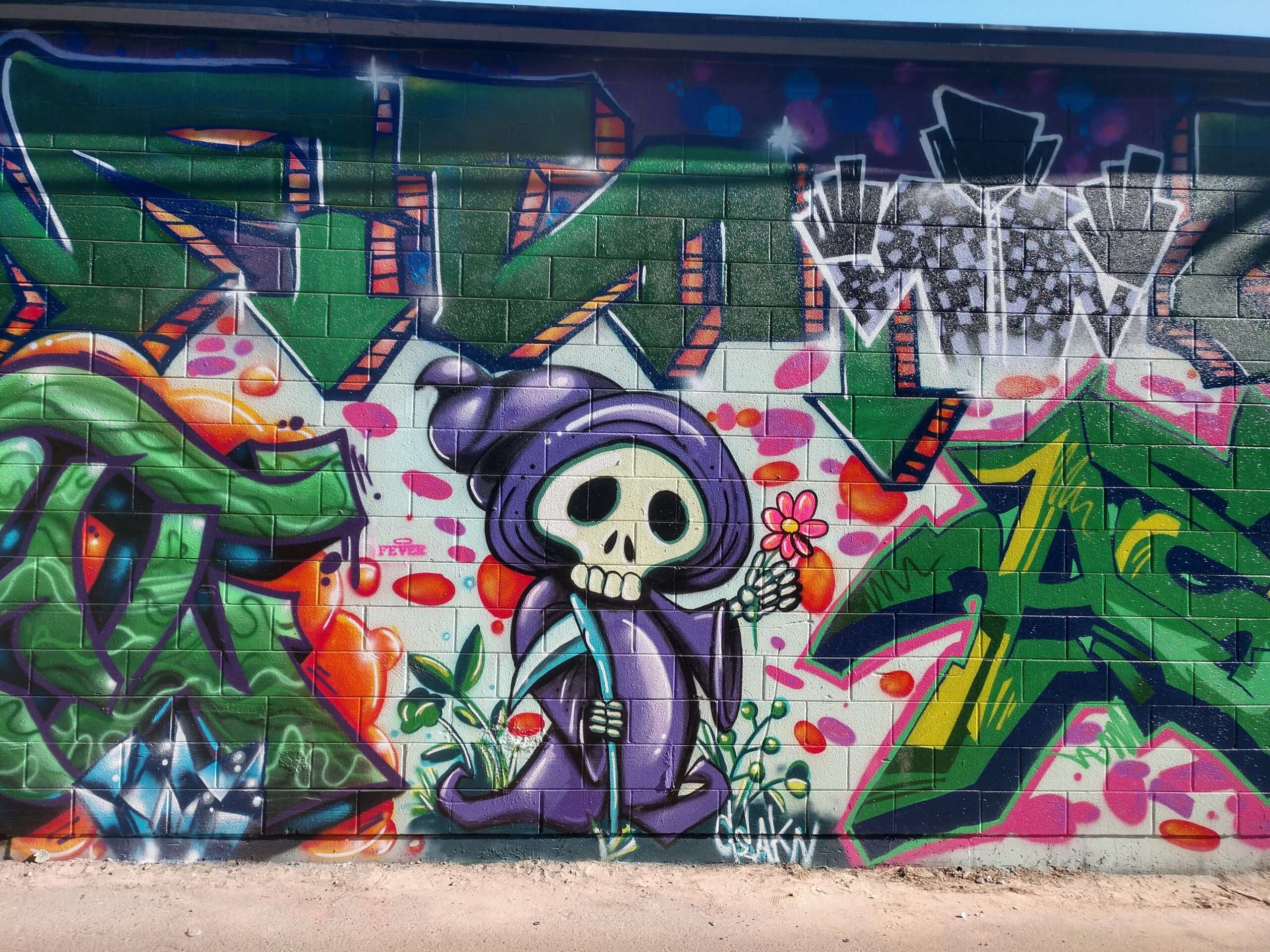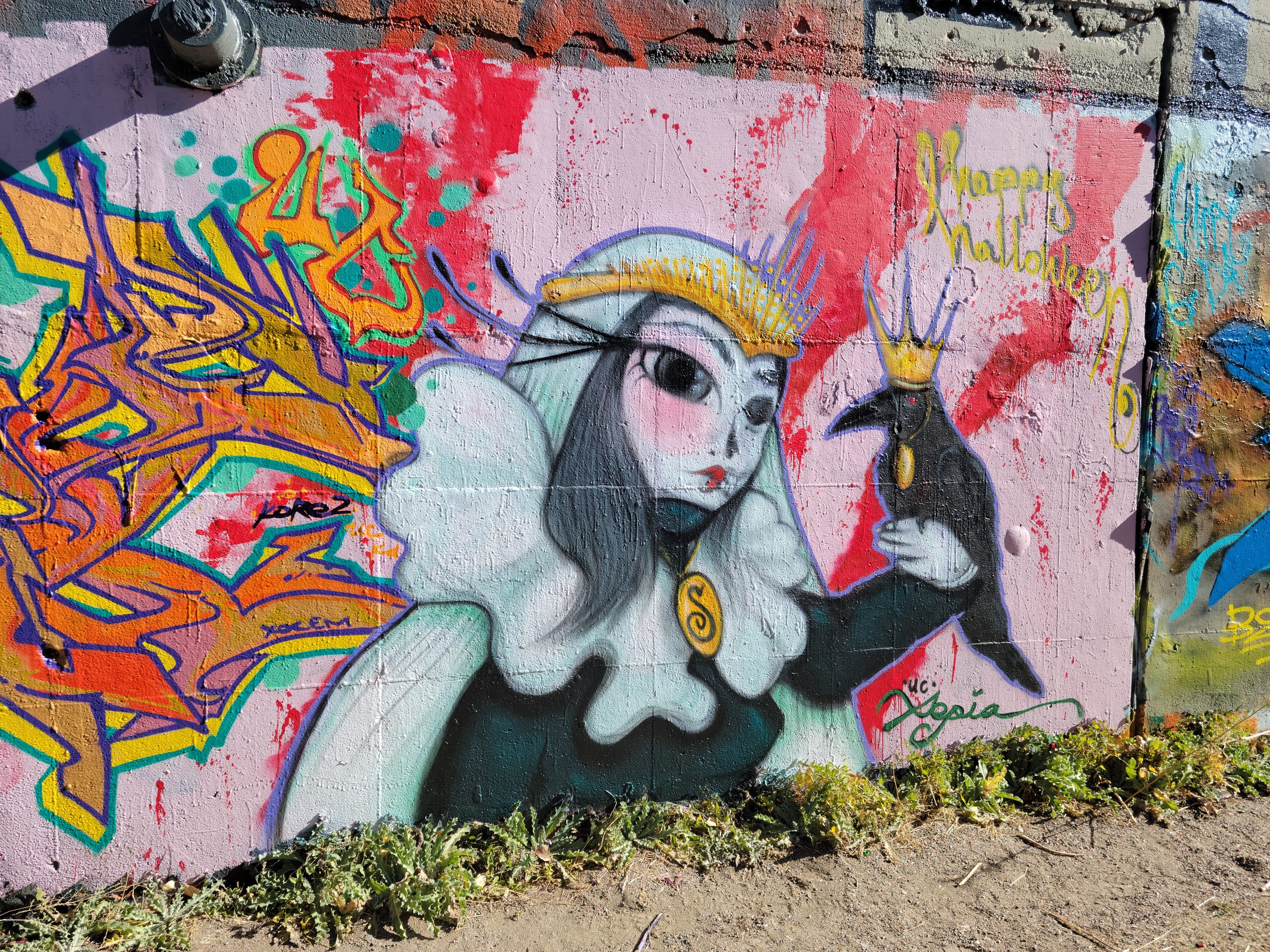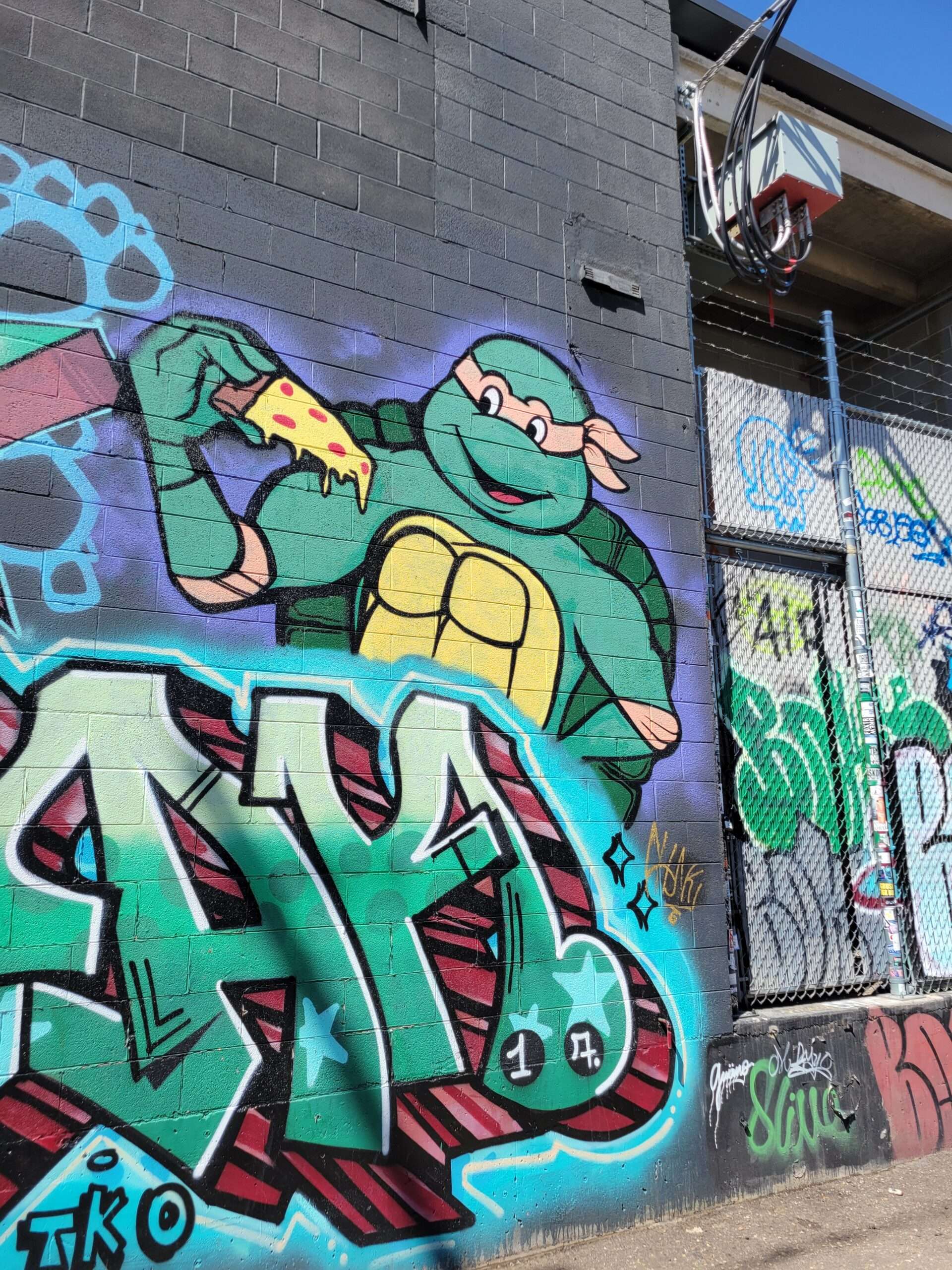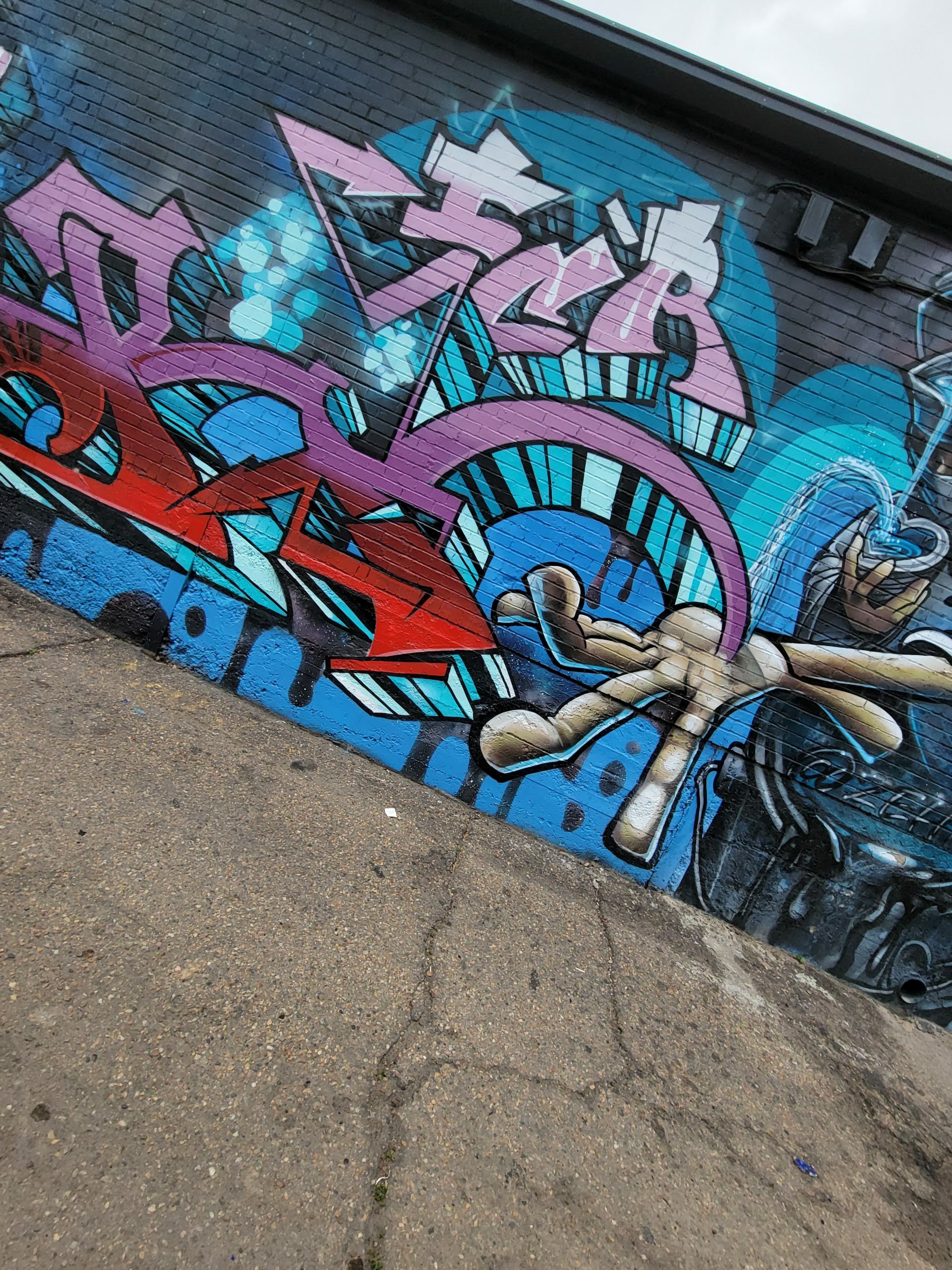 Painted along a concrete underpass wall, this vibrant piece of Denver street art pays homage to the classic anime series Dragon Ball Z. The mural features crisp, cartoon-accurate illustrations of Master Roshi in his signature orange shirt and sunglasses, standing next to a meditating Piccolo in his white cape and turban. Set against a backdrop of large, looping purple graffiti letters and situated beneath a bridge ledge tagged with bold orange text, this artwork highlights the playful intersection of global pop culture and the local urban canvas.