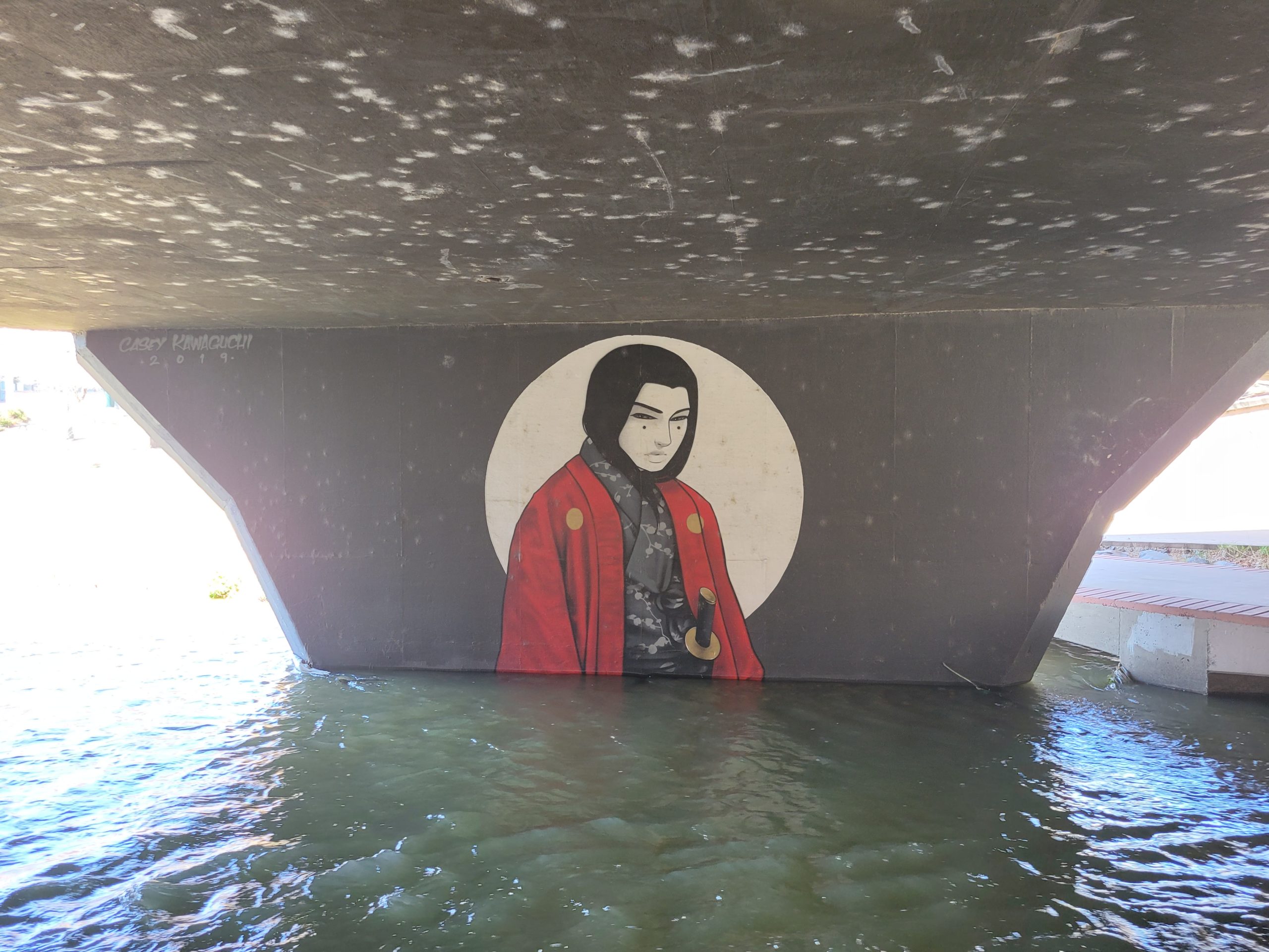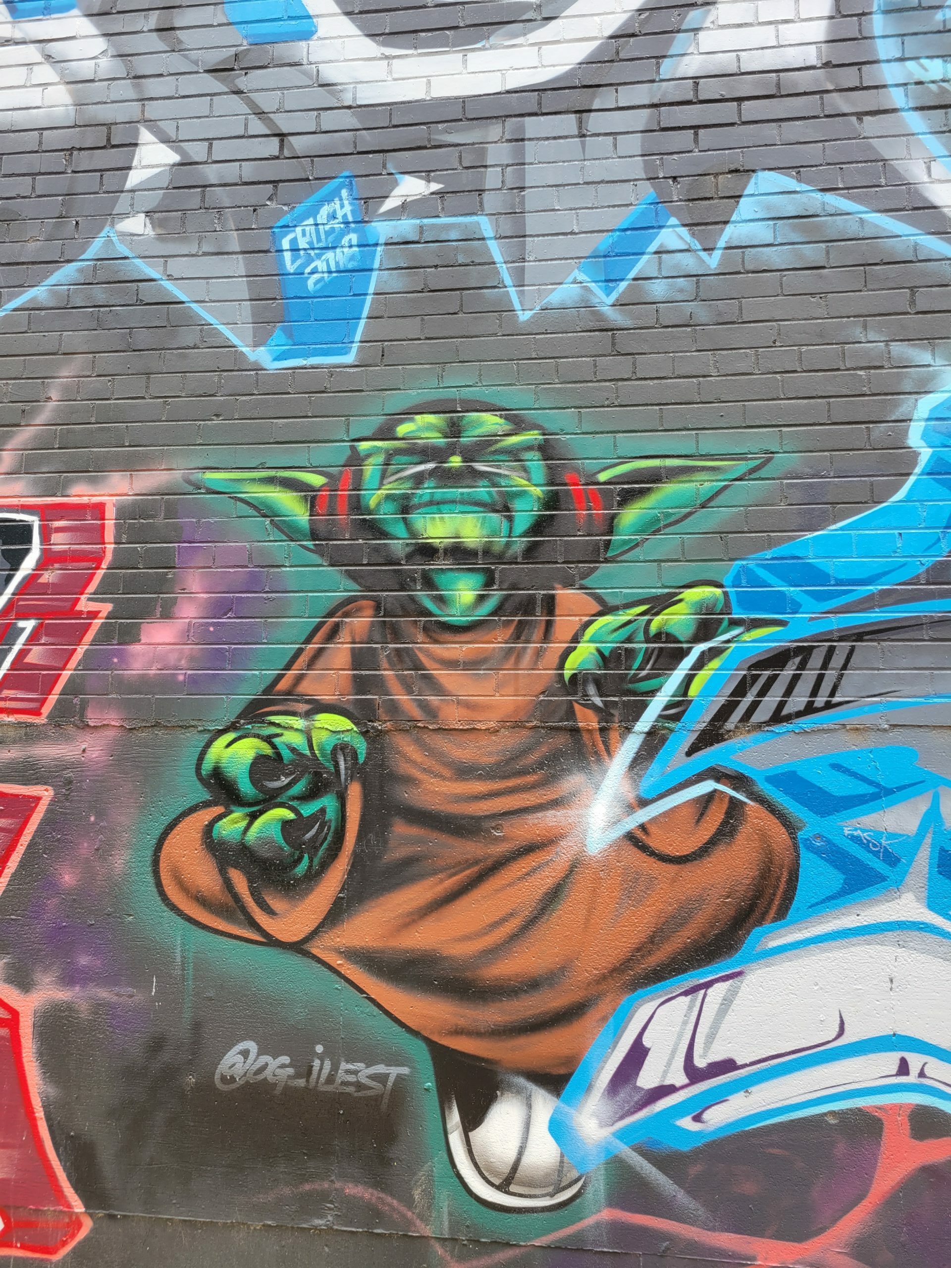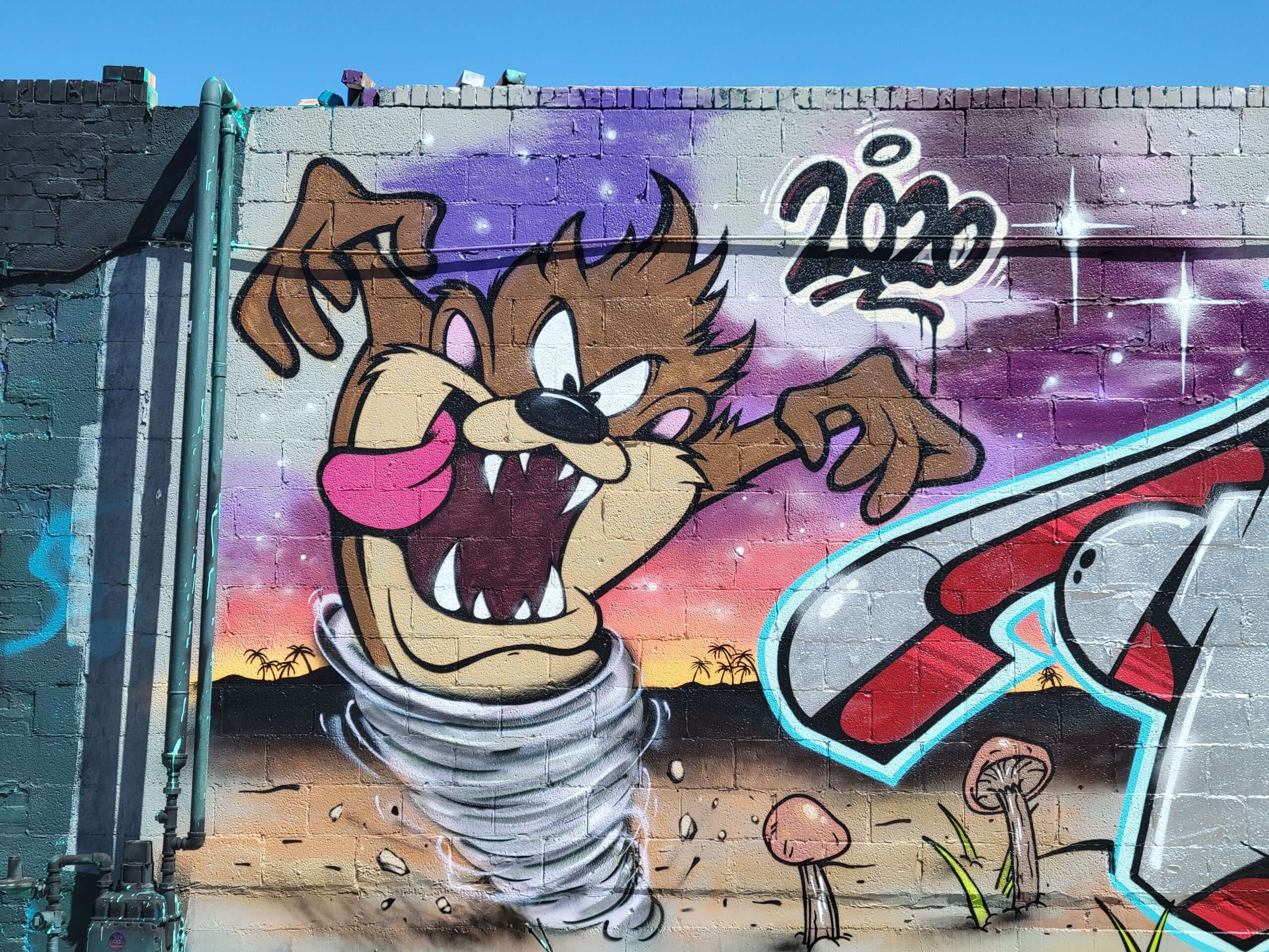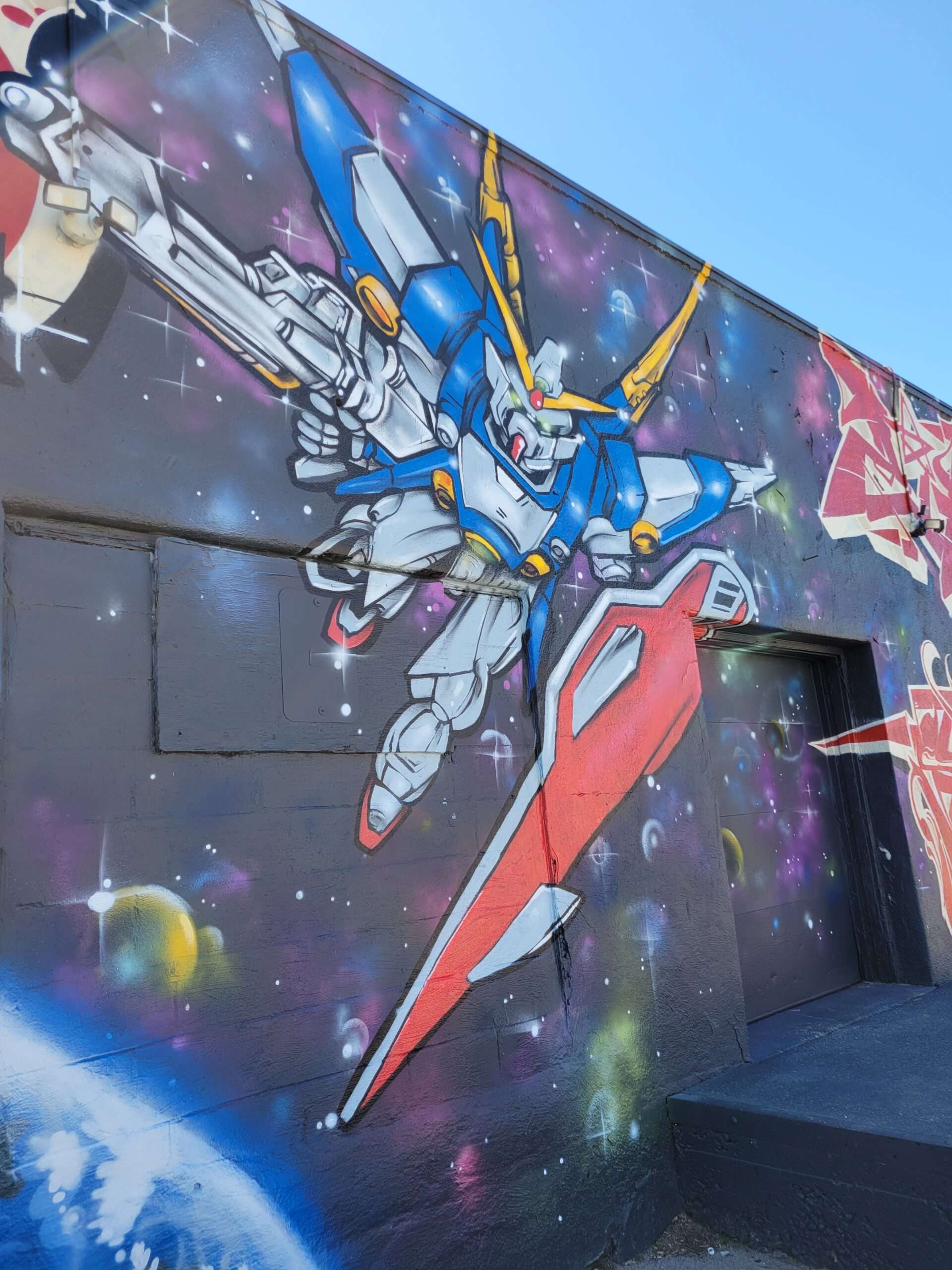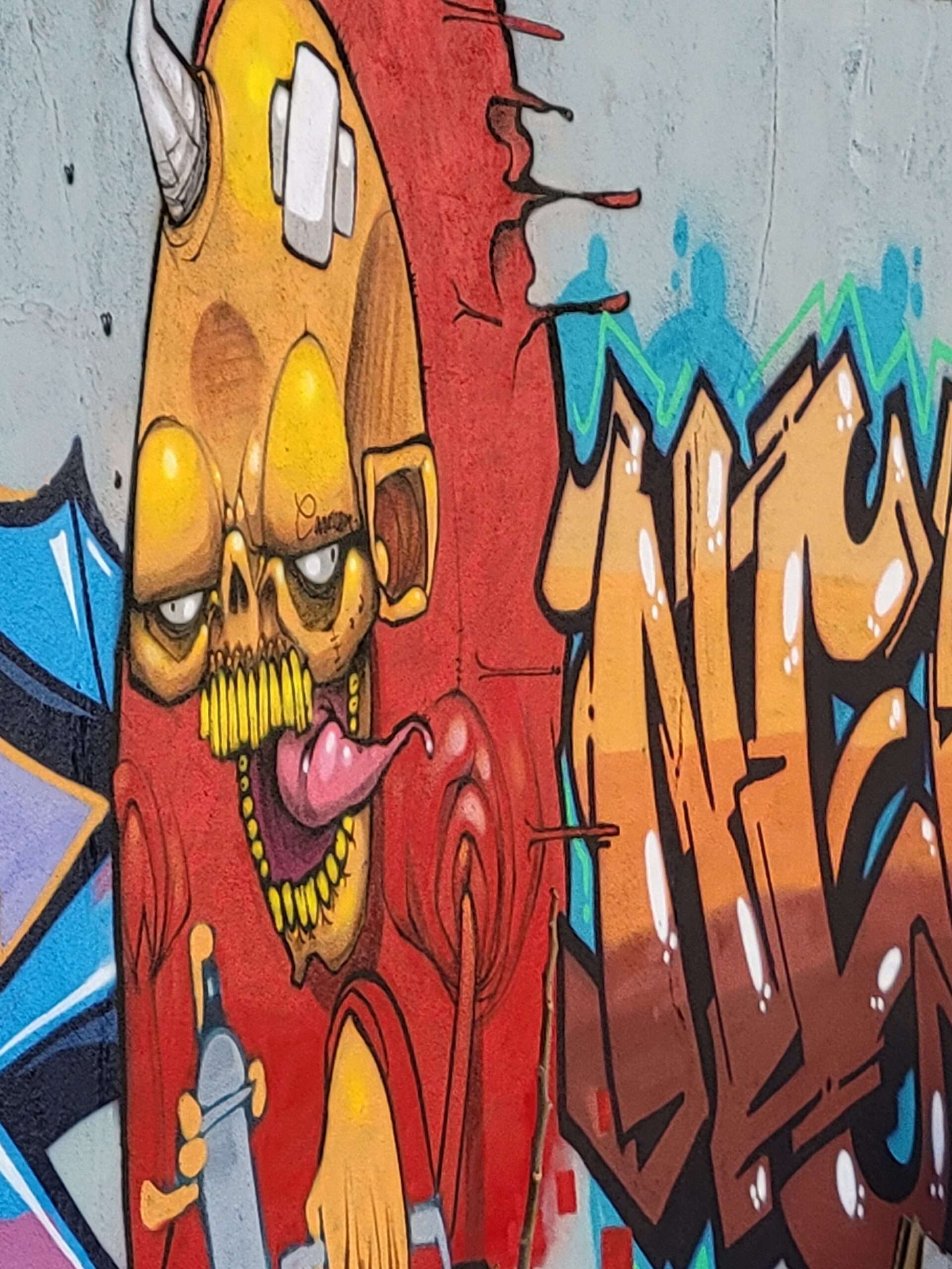 Painted along a concrete underpass wall, this vibrant piece of Denver street art pays homage to the classic anime series Dragon Ball Z. The mural features crisp, cartoon-accurate illustrations of Master Roshi in his signature orange shirt and sunglasses, standing next to a meditating Piccolo in his white cape and turban. Set against a backdrop of large, looping purple graffiti letters and situated beneath a bridge ledge tagged with bold orange text, this artwork highlights the playful intersection of global pop culture and the local urban canvas.