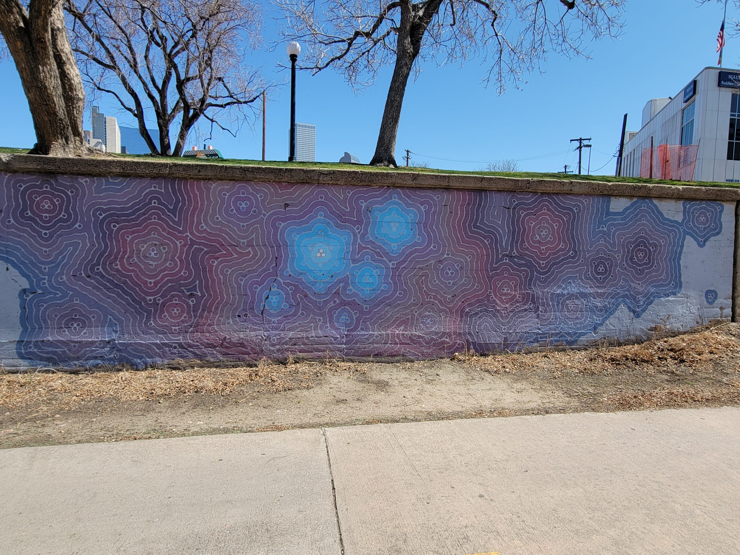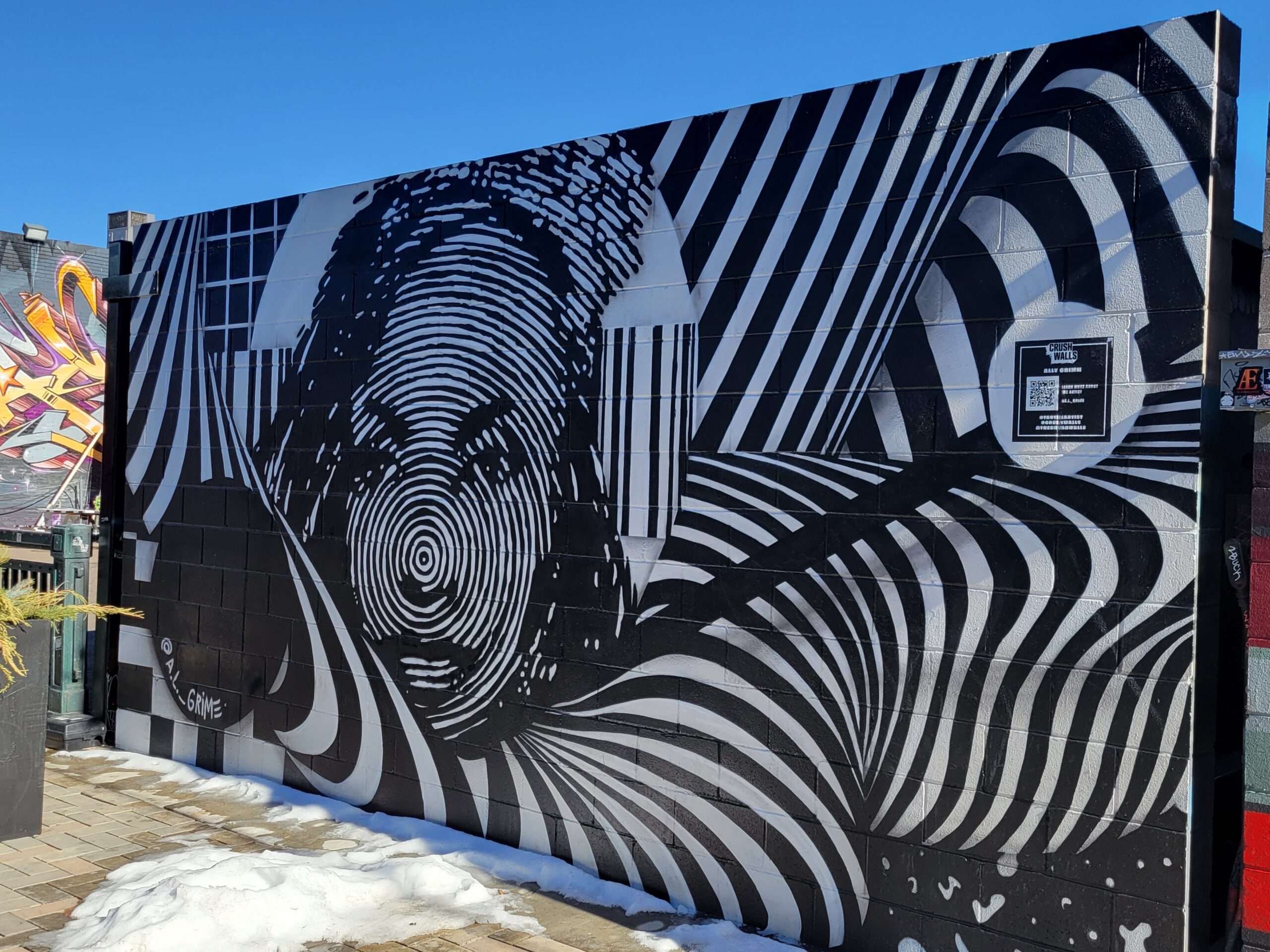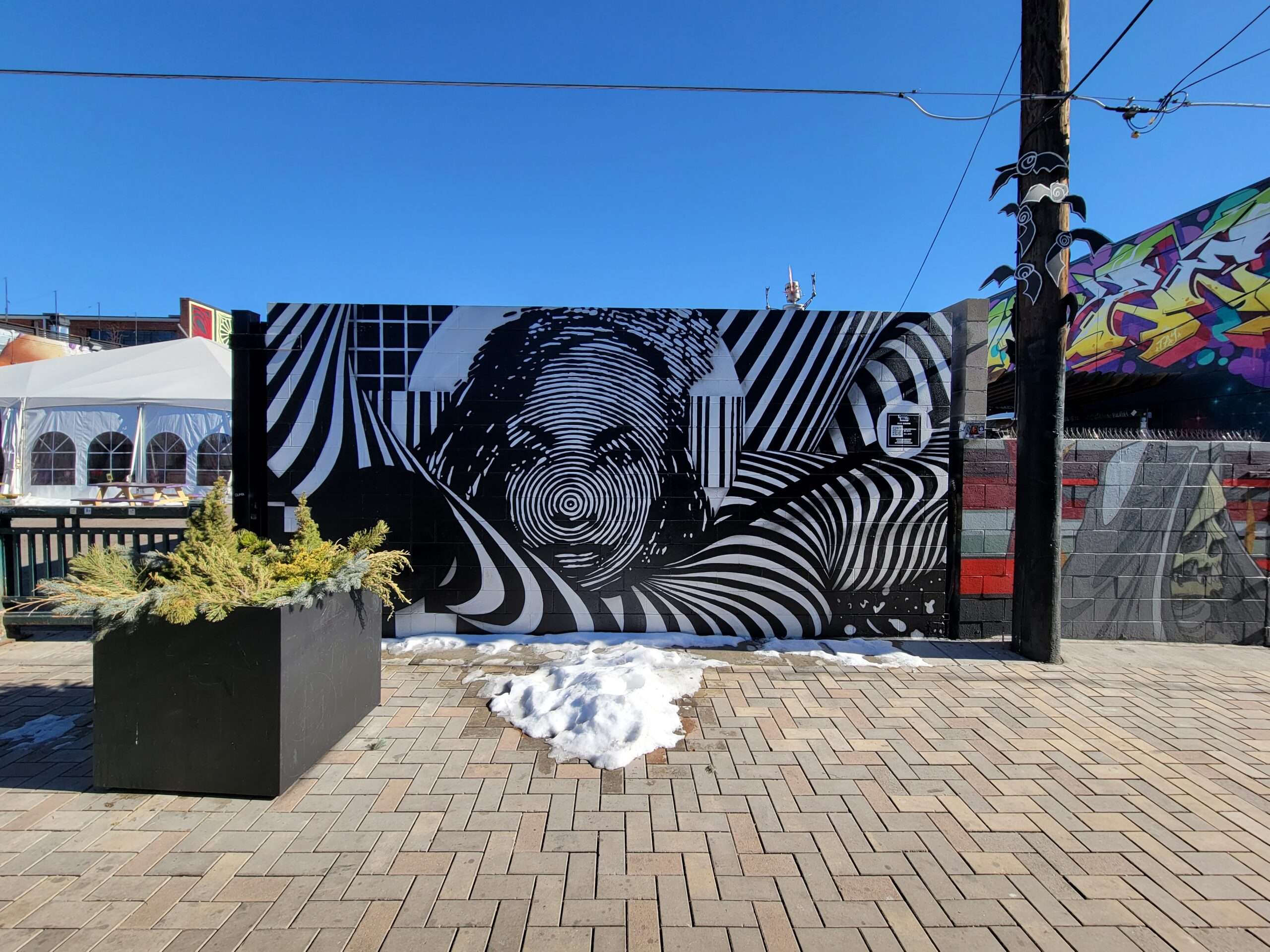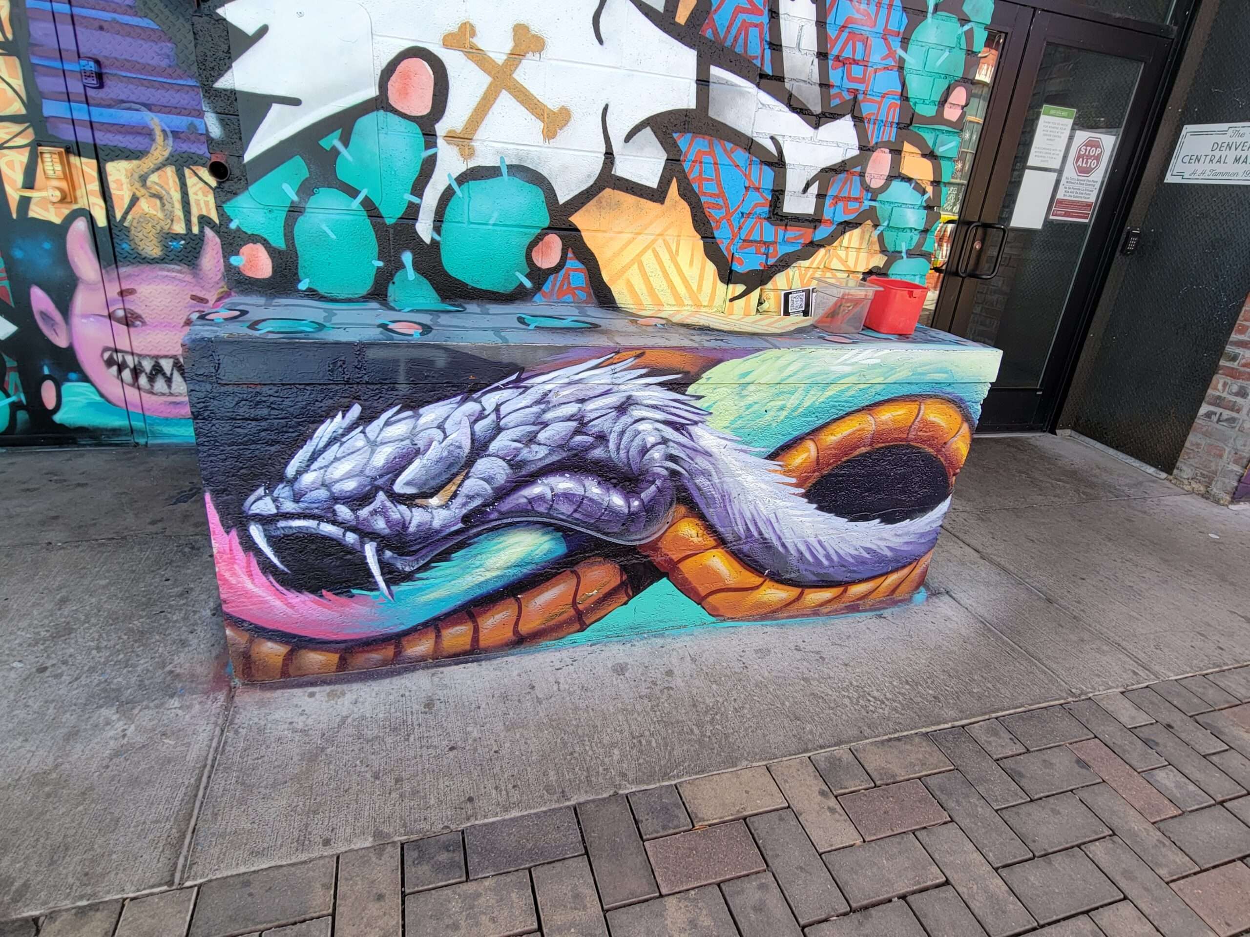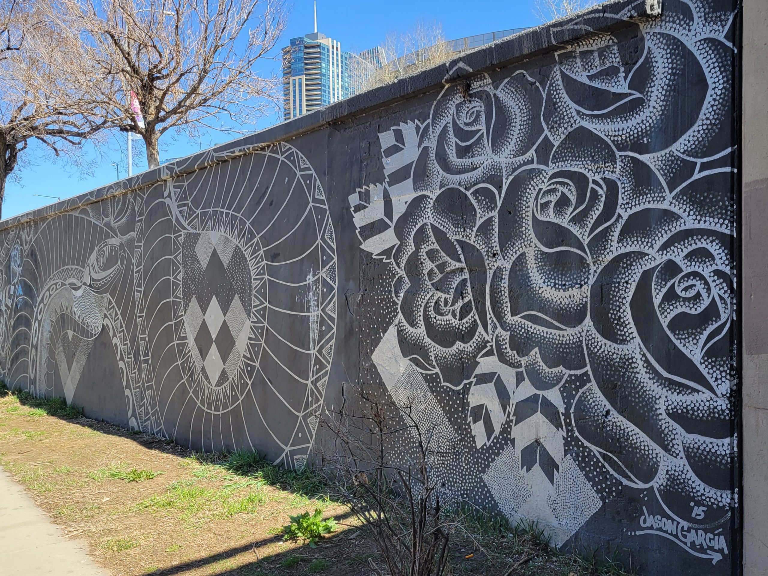 Created by artist Jason Garcia in 2015, this striking piece of Denver street art features an intricate, stippled design of a winding snake and oversized roses. The sprawling monochromatic mural decorates a long concrete retaining wall beside a sunlit sidewalk, with the downtown city skyline peeking out in the background. It serves as a beautiful example of the diverse artistic techniques and large-scale installations that elevate the city's outdoor pedestrian spaces.