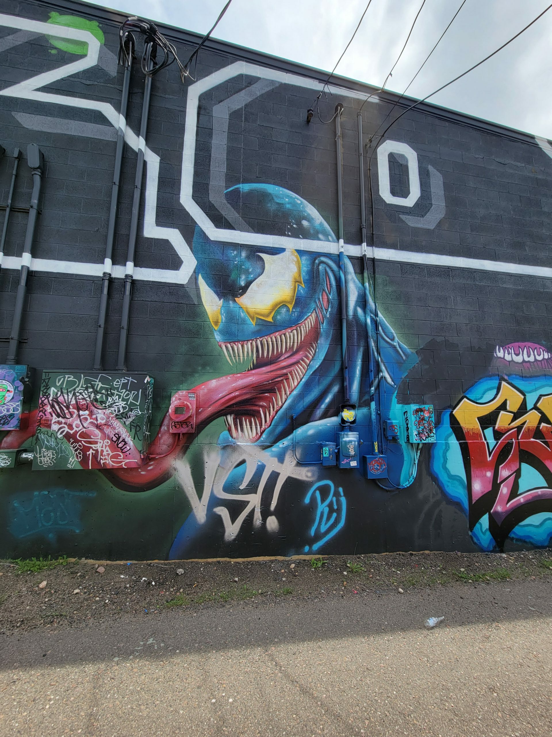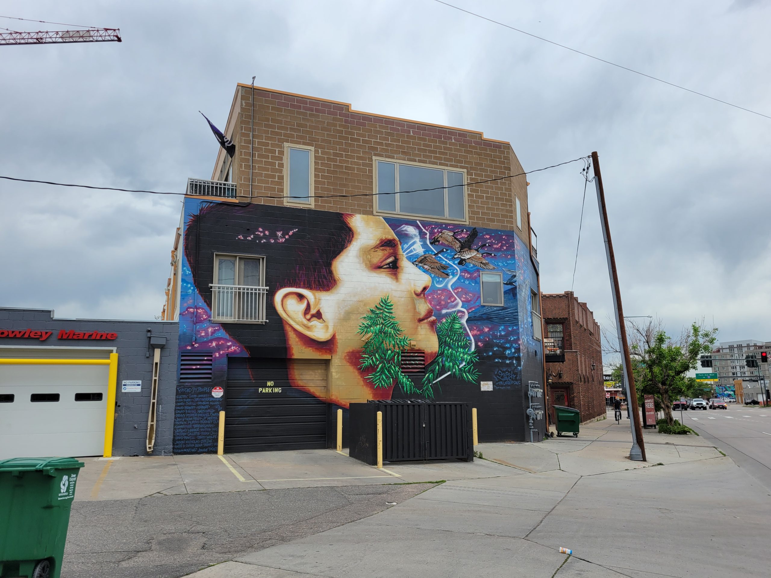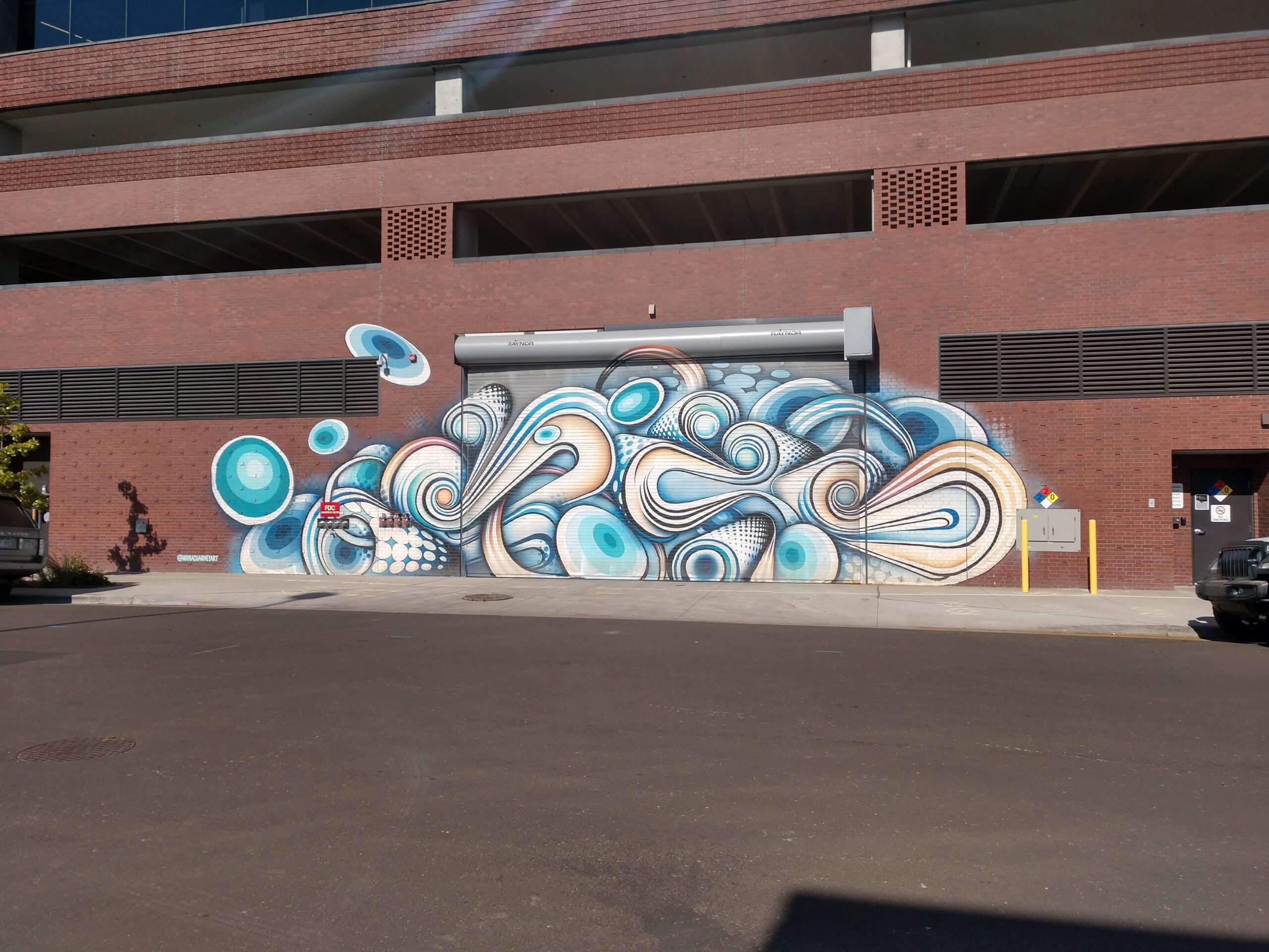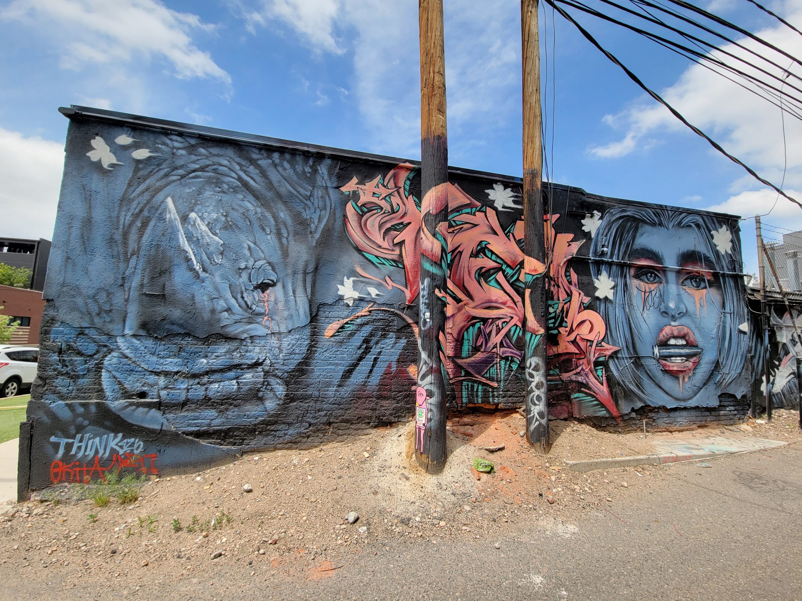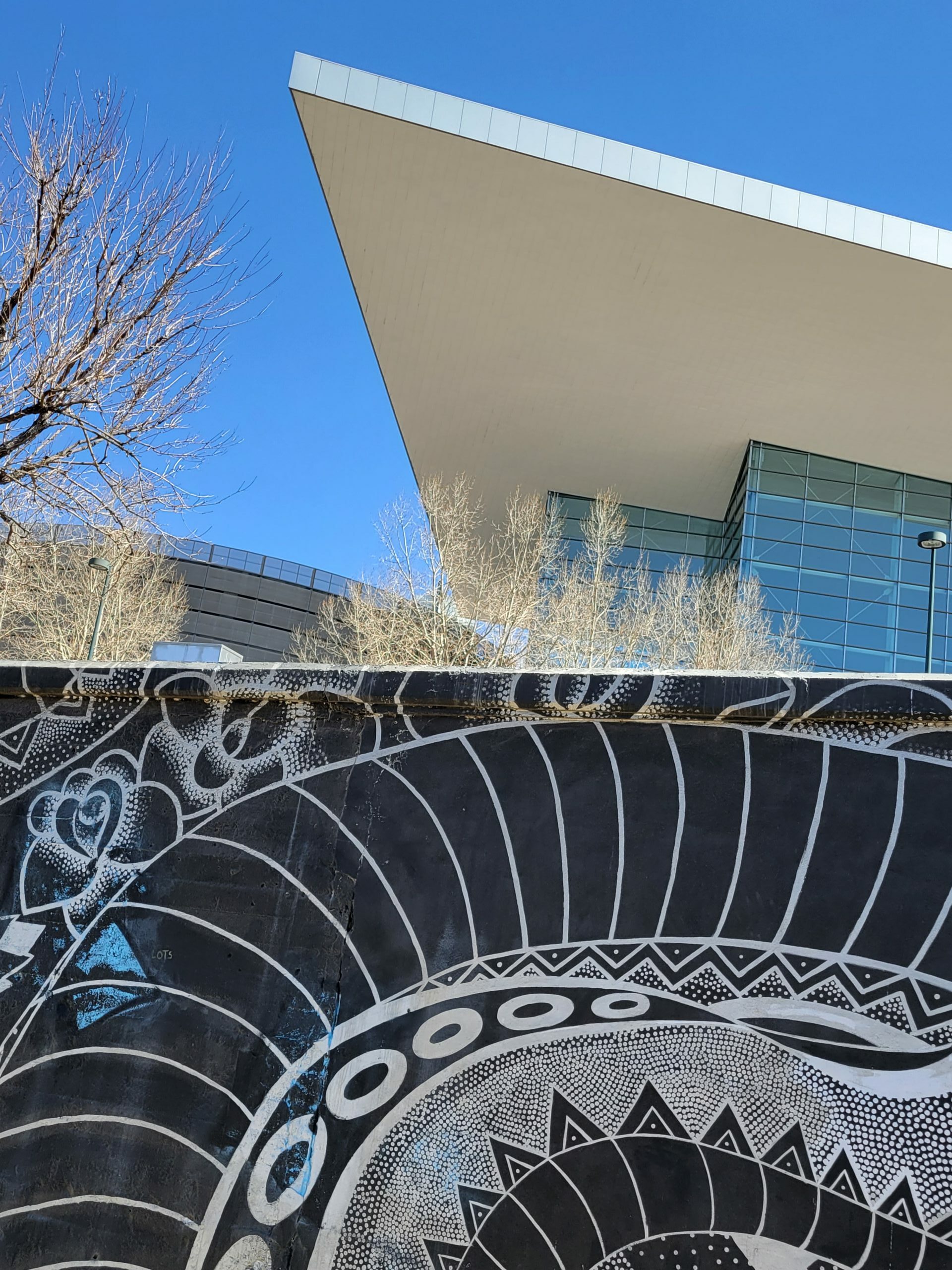 Created by artist Jason Garcia in 2015, this striking piece of Denver street art features an intricate, stippled design of a winding snake and oversized roses. The sprawling monochromatic mural decorates a long concrete retaining wall beside a sunlit sidewalk, with the downtown city skyline peeking out in the background. It serves as a beautiful example of the diverse artistic techniques and large-scale installations that elevate the city's outdoor pedestrian spaces.