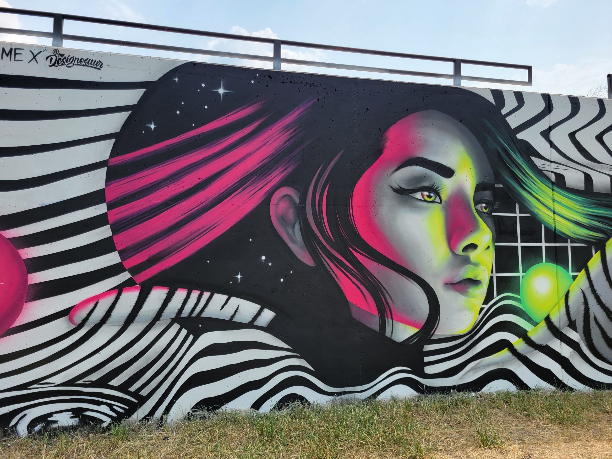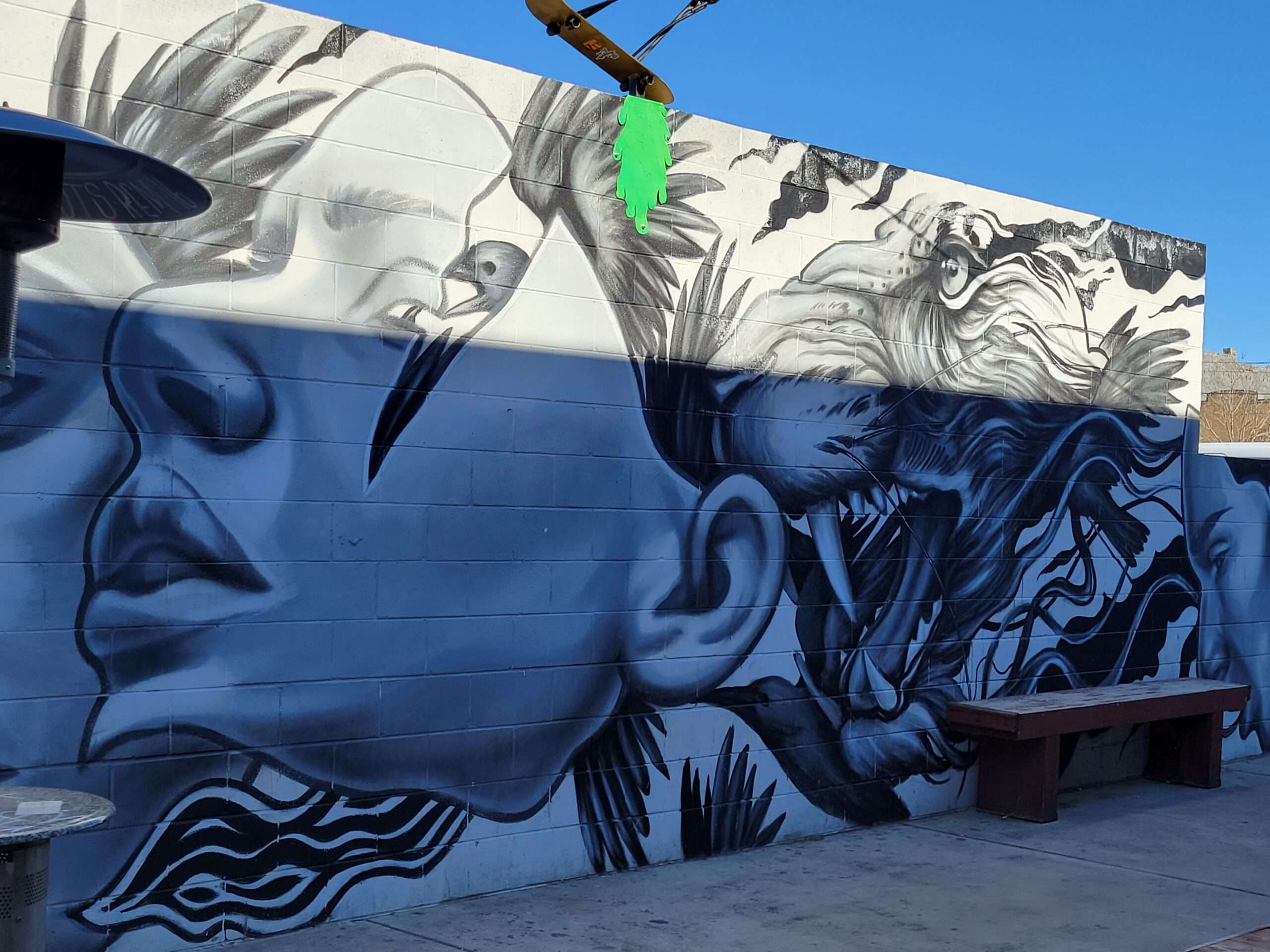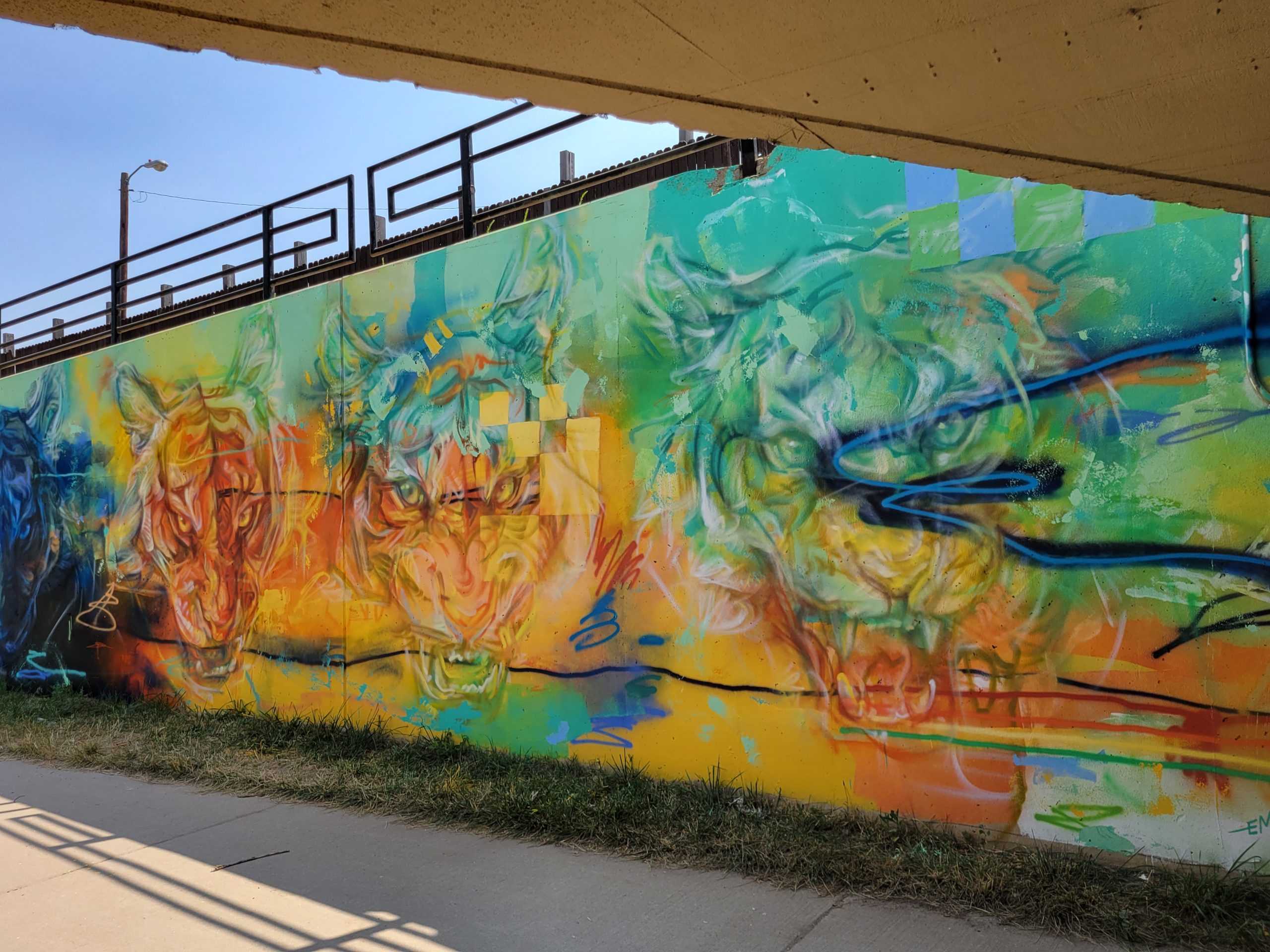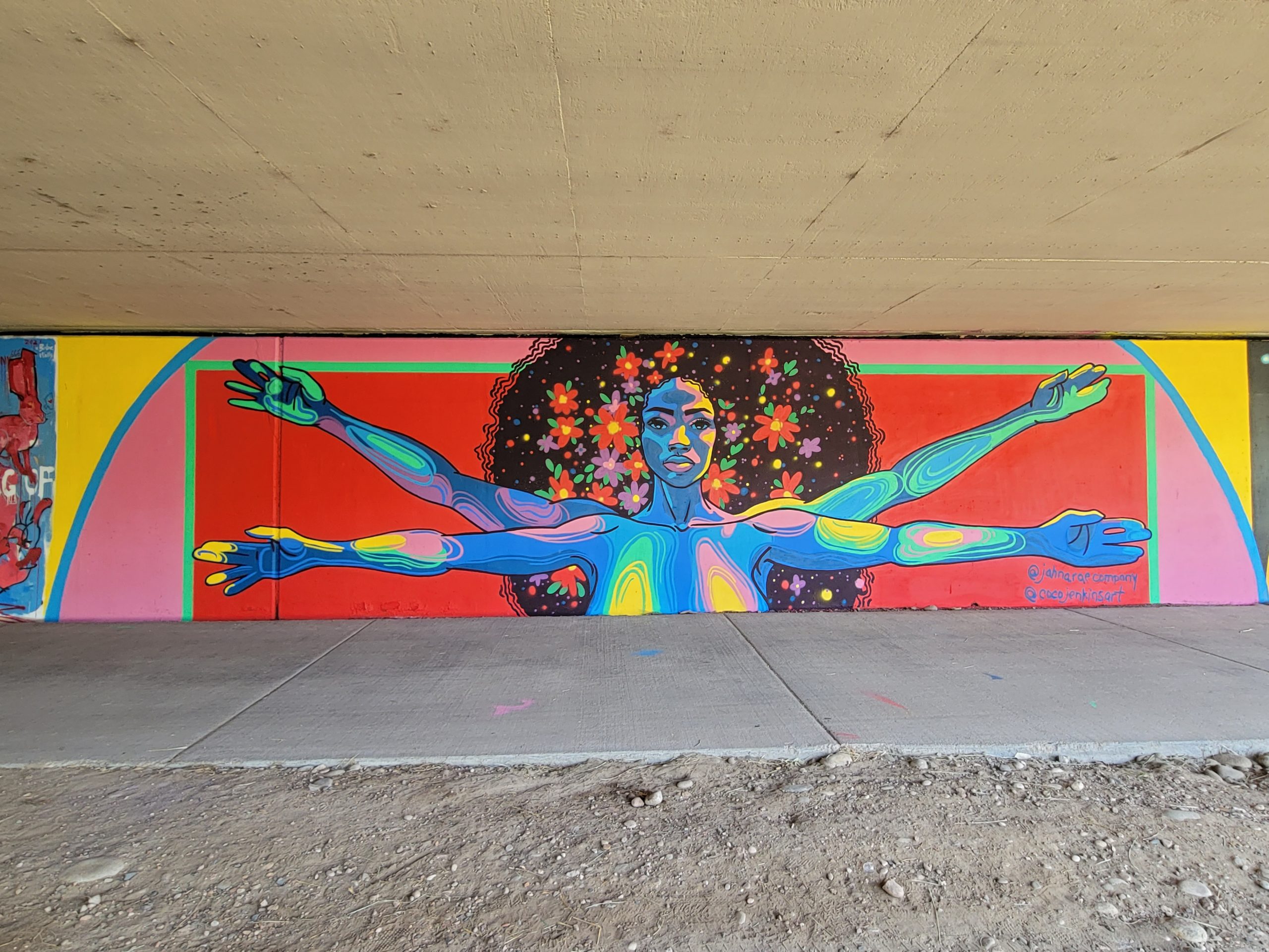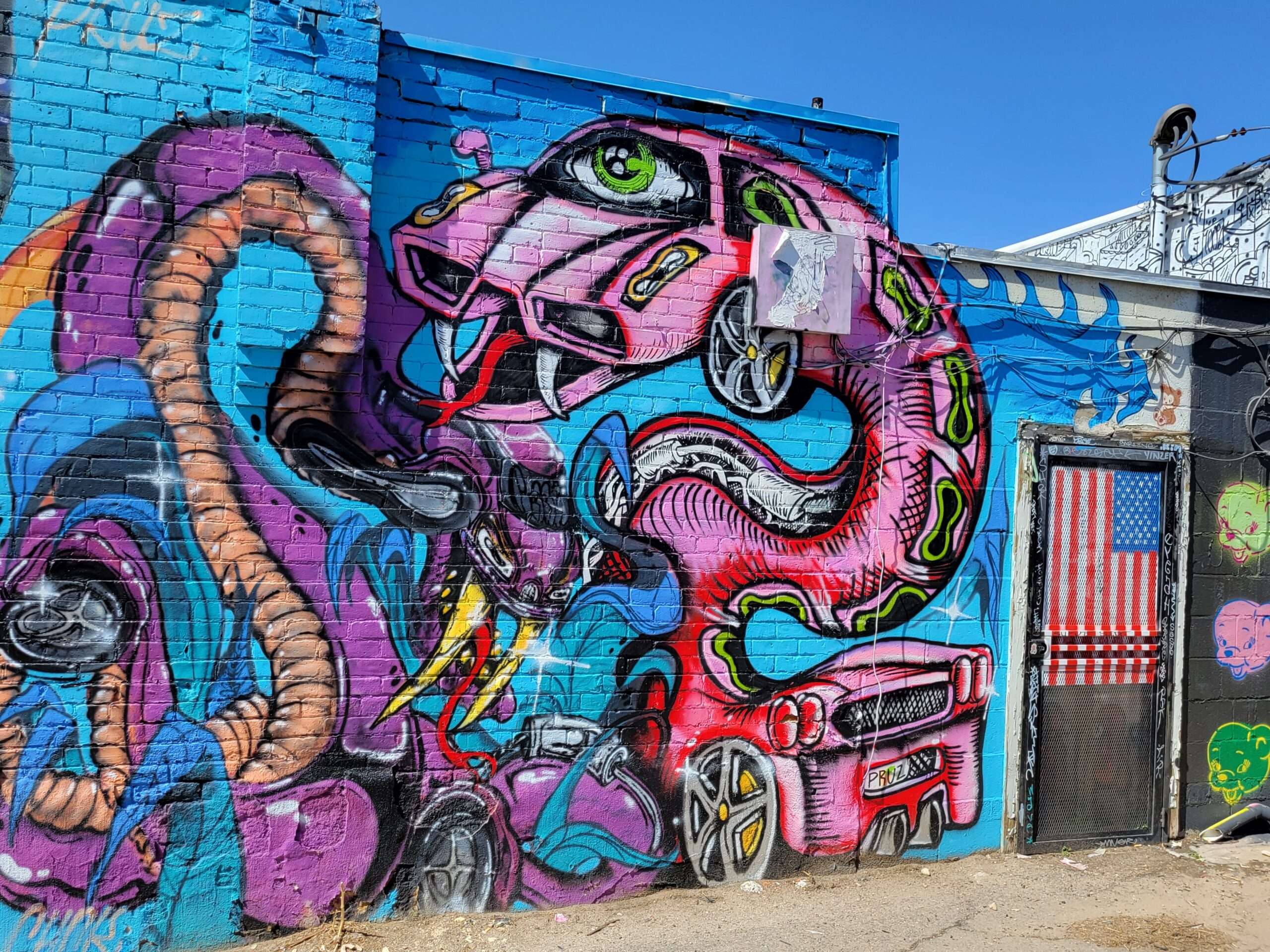 Created by artist Jason Garcia in 2015, this striking piece of Denver street art features an intricate, stippled design of a winding snake and oversized roses. The sprawling monochromatic mural decorates a long concrete retaining wall beside a sunlit sidewalk, with the downtown city skyline peeking out in the background. It serves as a beautiful example of the diverse artistic techniques and large-scale installations that elevate the city's outdoor pedestrian spaces.