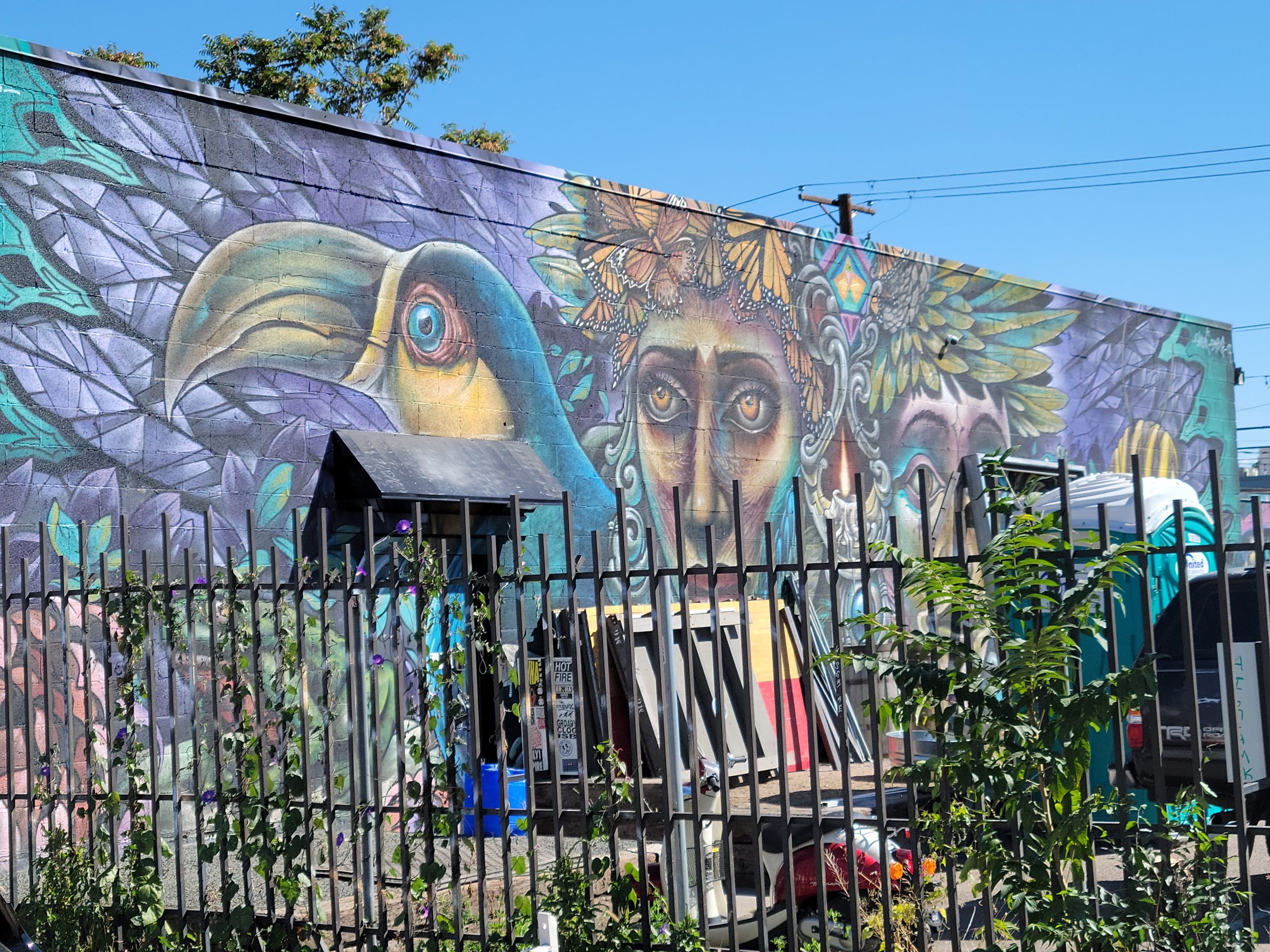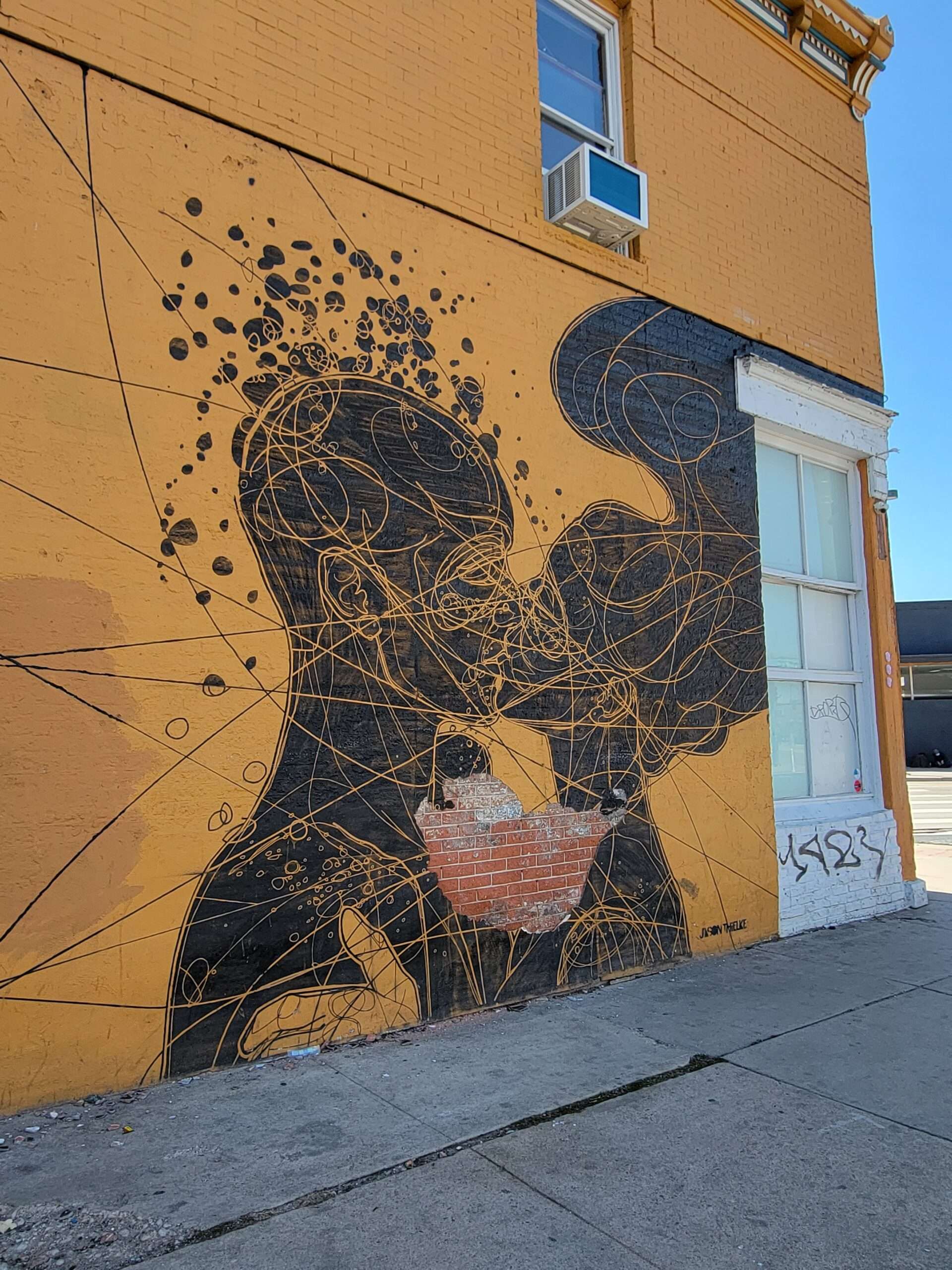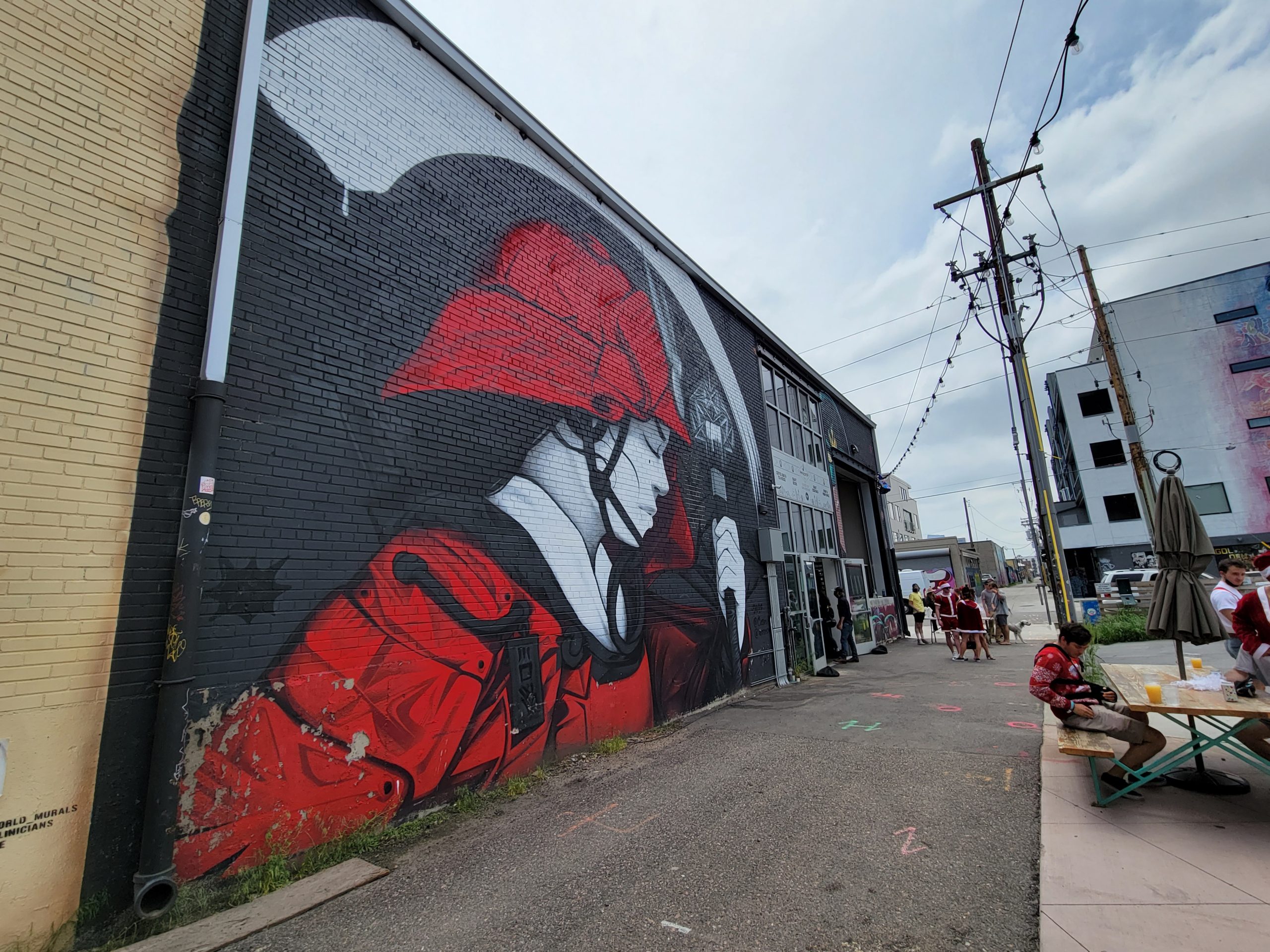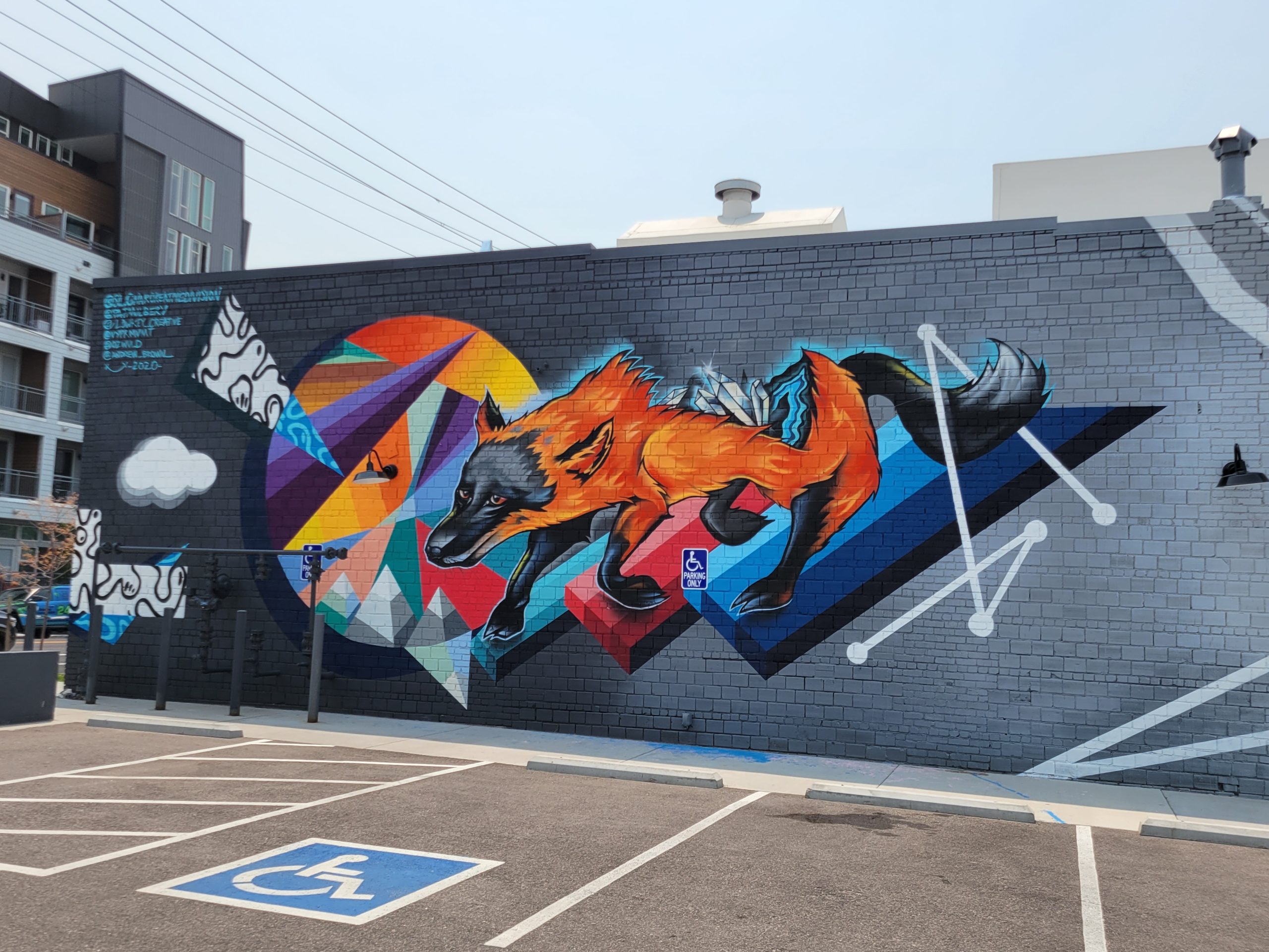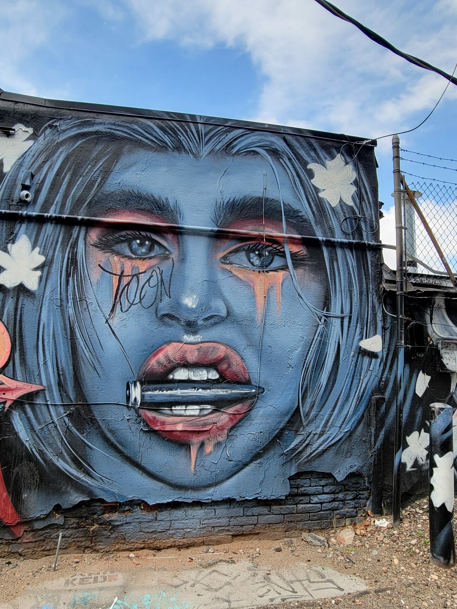 Created by artist Jason Garcia in 2015, this striking piece of Denver street art features an intricate, stippled design of a winding snake and oversized roses. The sprawling monochromatic mural decorates a long concrete retaining wall beside a sunlit sidewalk, with the downtown city skyline peeking out in the background. It serves as a beautiful example of the diverse artistic techniques and large-scale installations that elevate the city's outdoor pedestrian spaces.