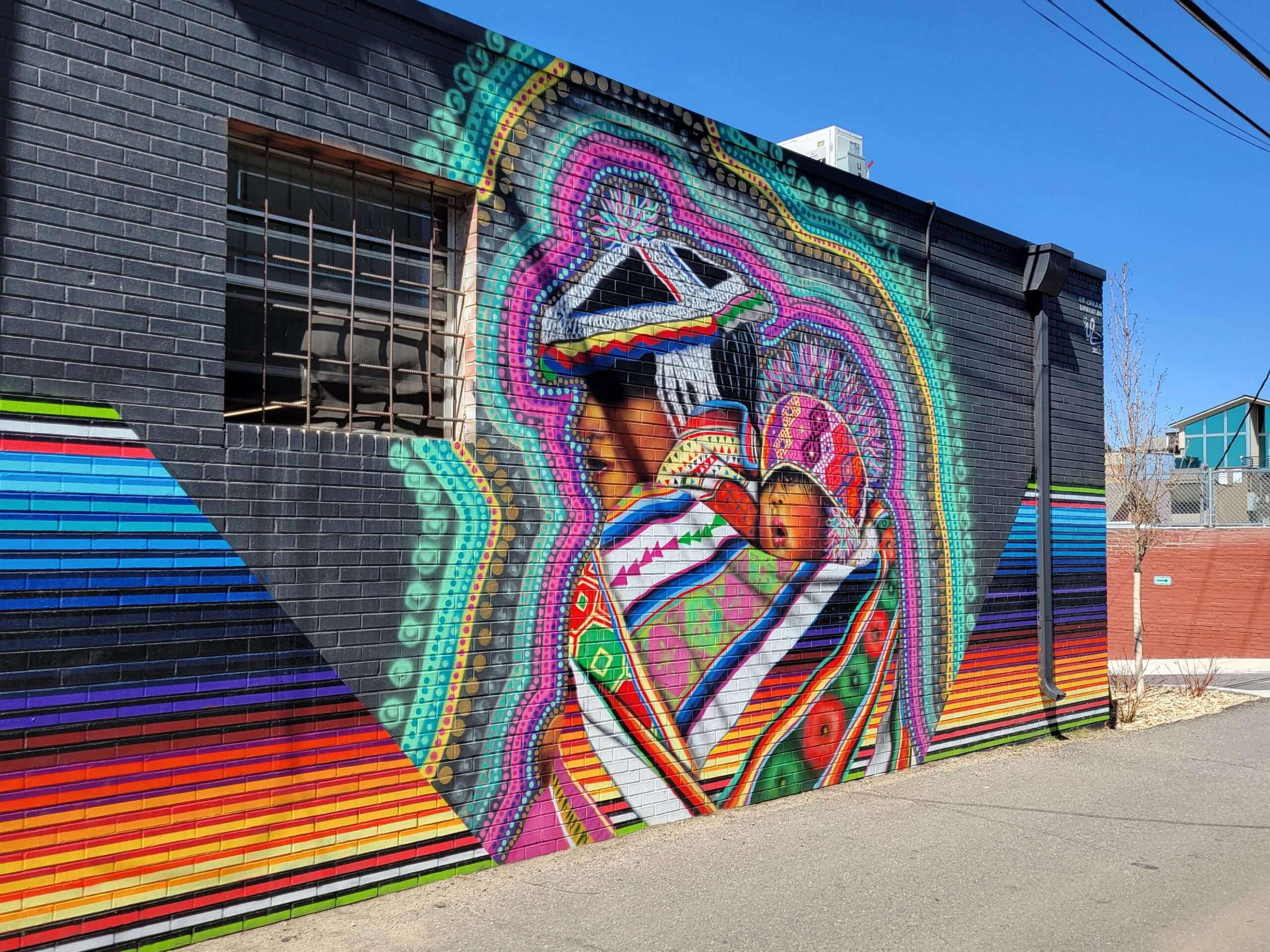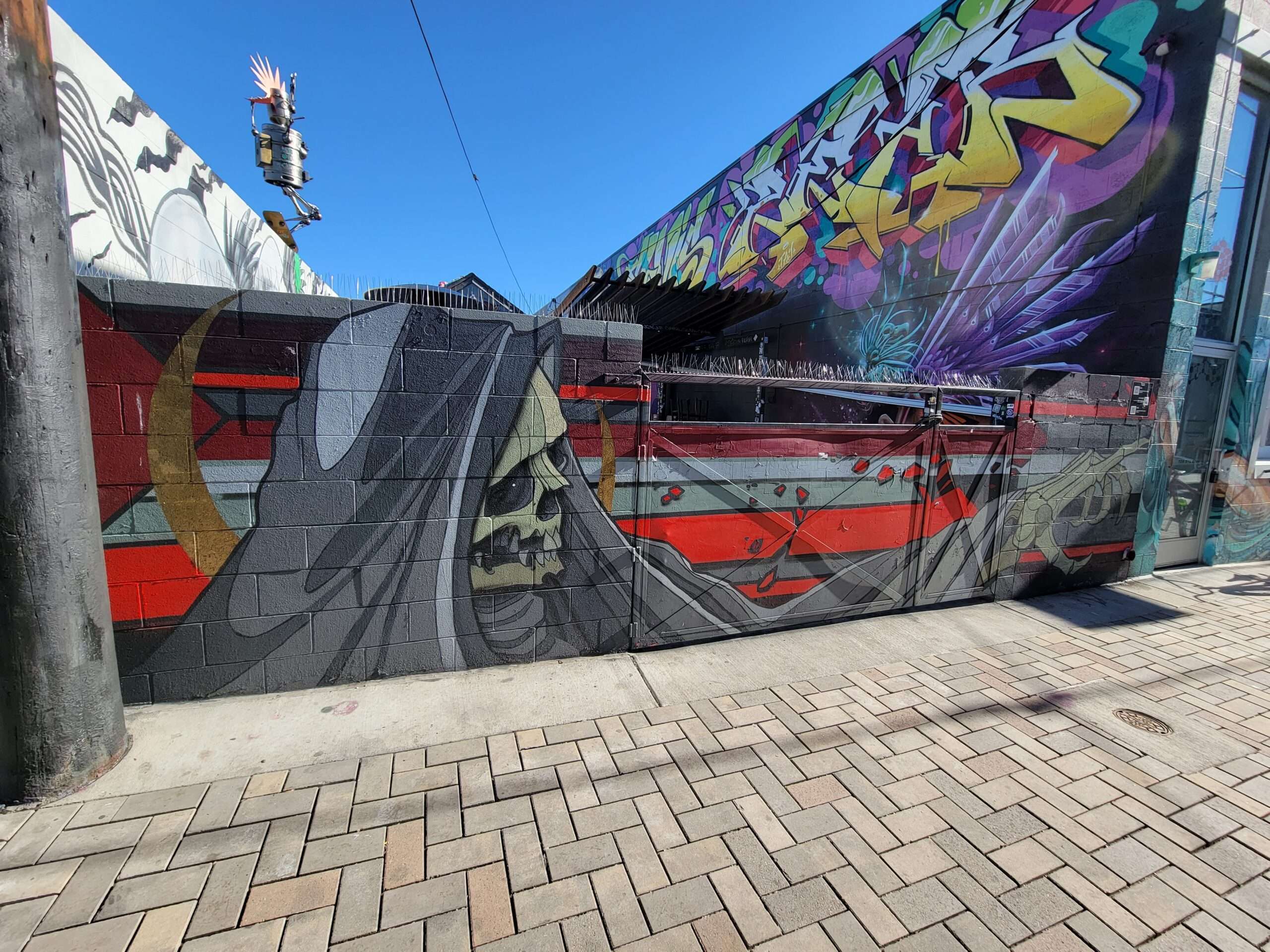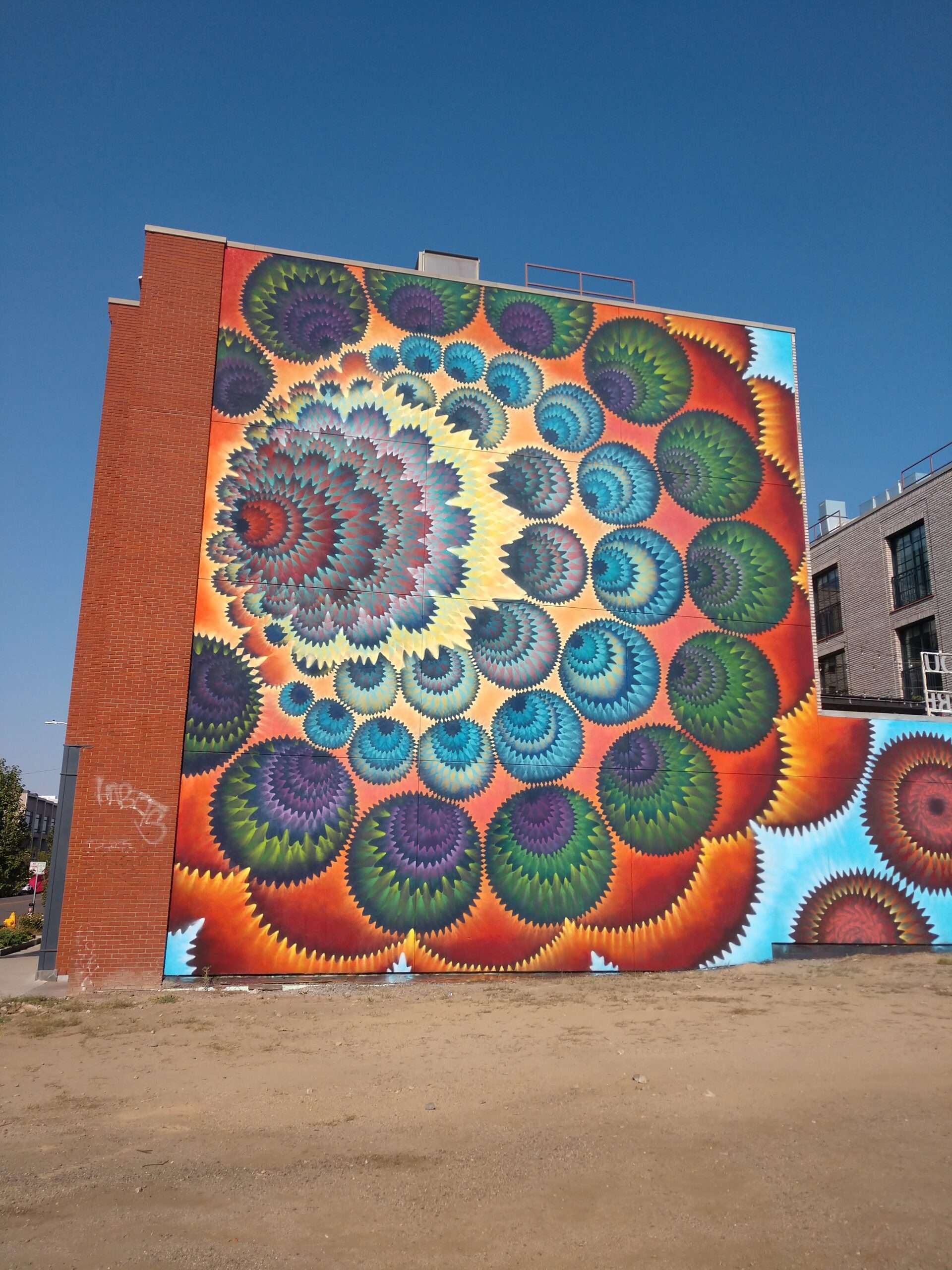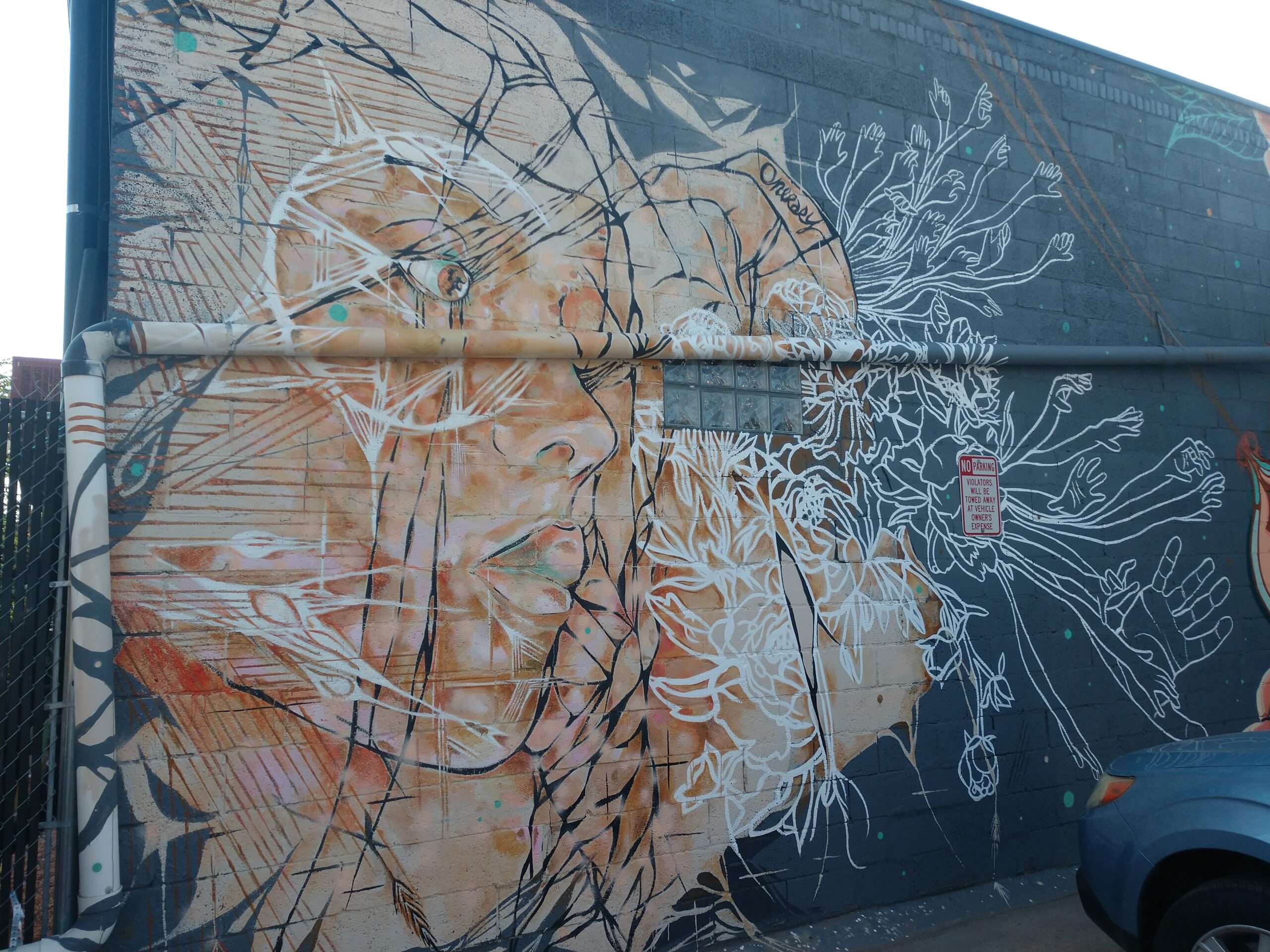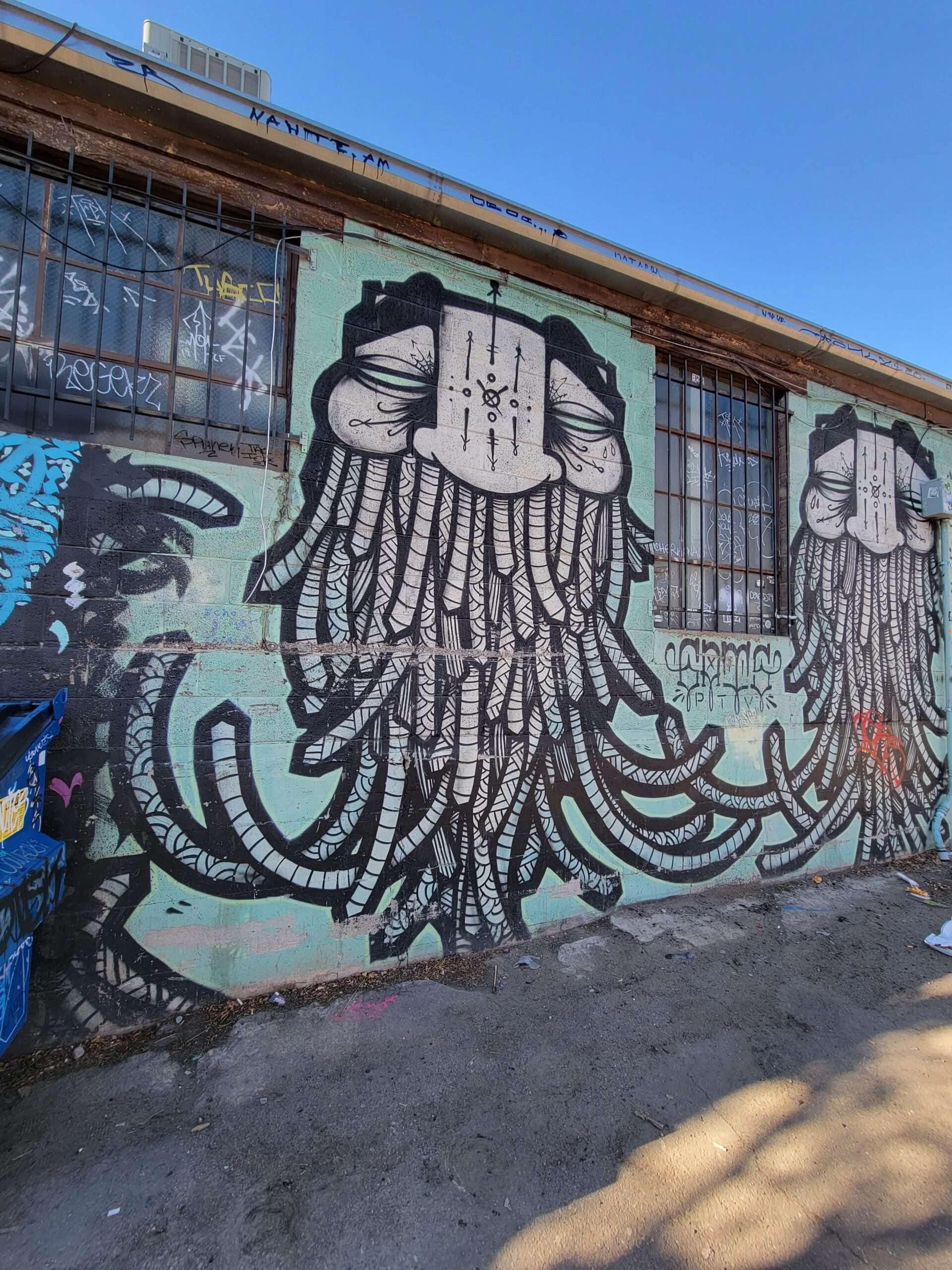 Created by artist Jason Garcia in 2015, this striking piece of Denver street art features an intricate, stippled design of a winding snake and oversized roses. The sprawling monochromatic mural decorates a long concrete retaining wall beside a sunlit sidewalk, with the downtown city skyline peeking out in the background. It serves as a beautiful example of the diverse artistic techniques and large-scale installations that elevate the city's outdoor pedestrian spaces.