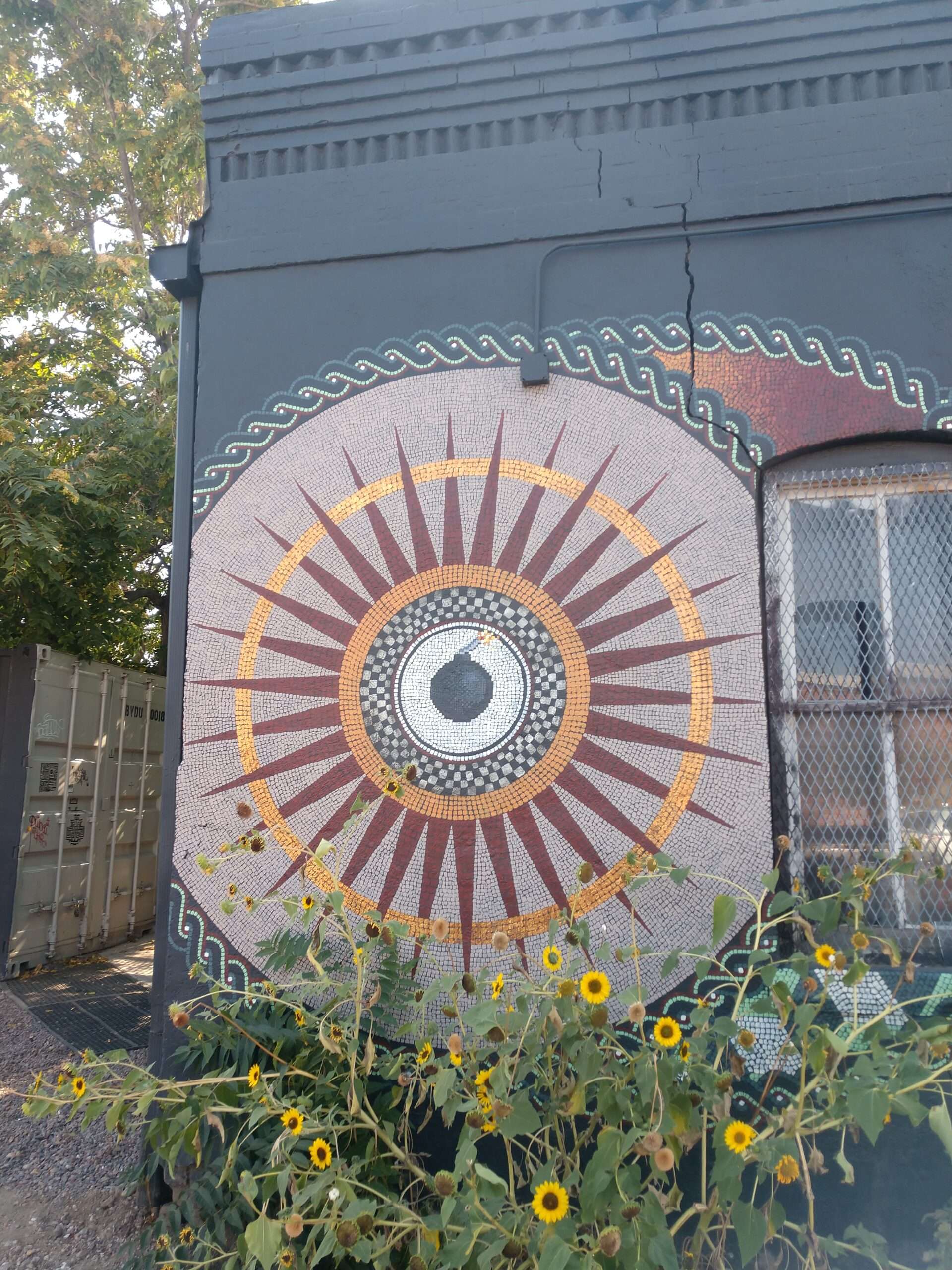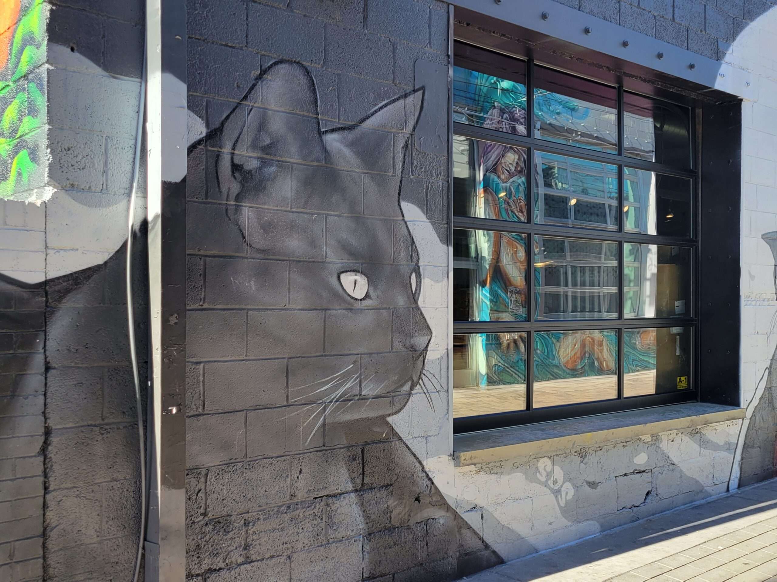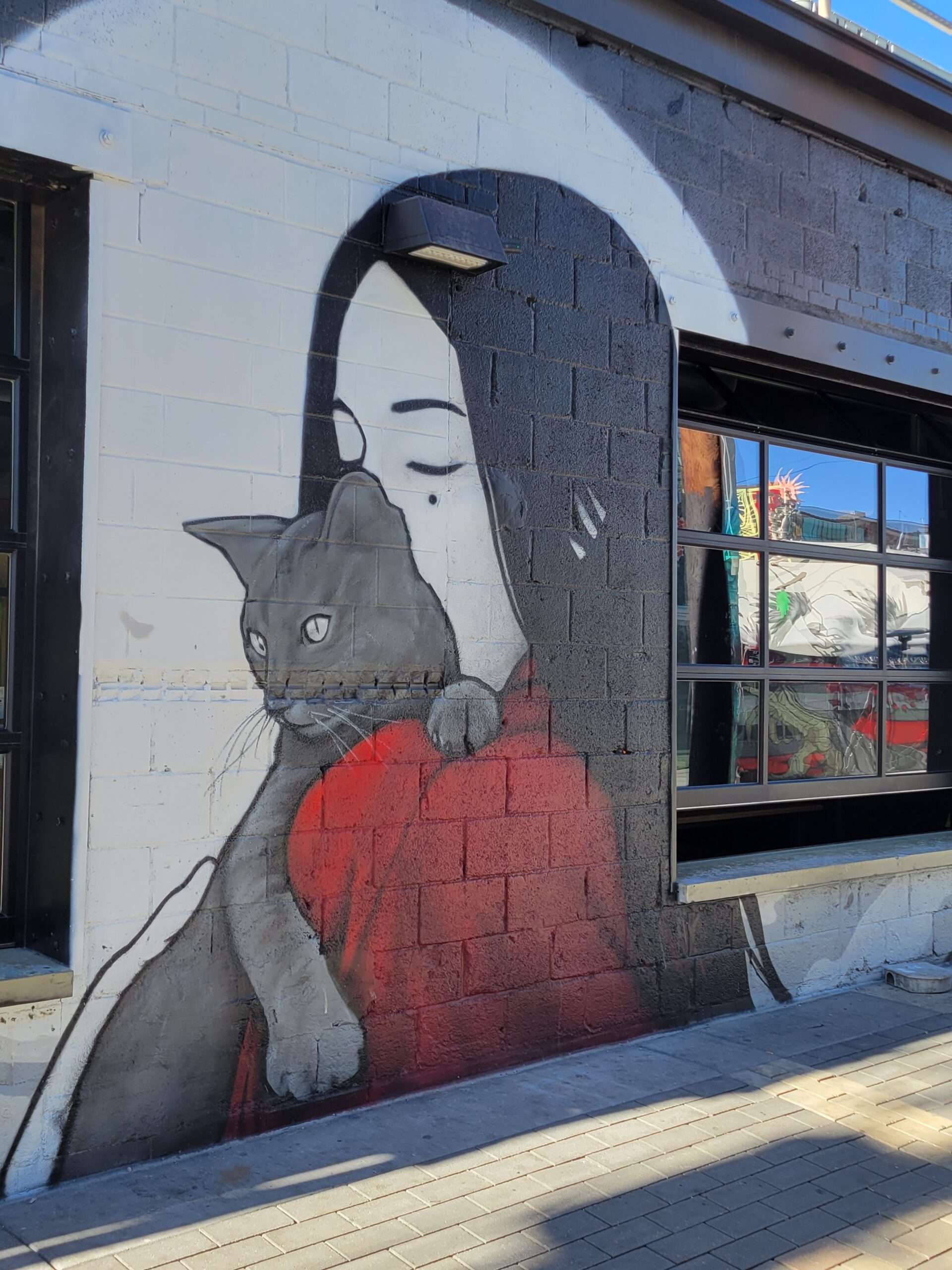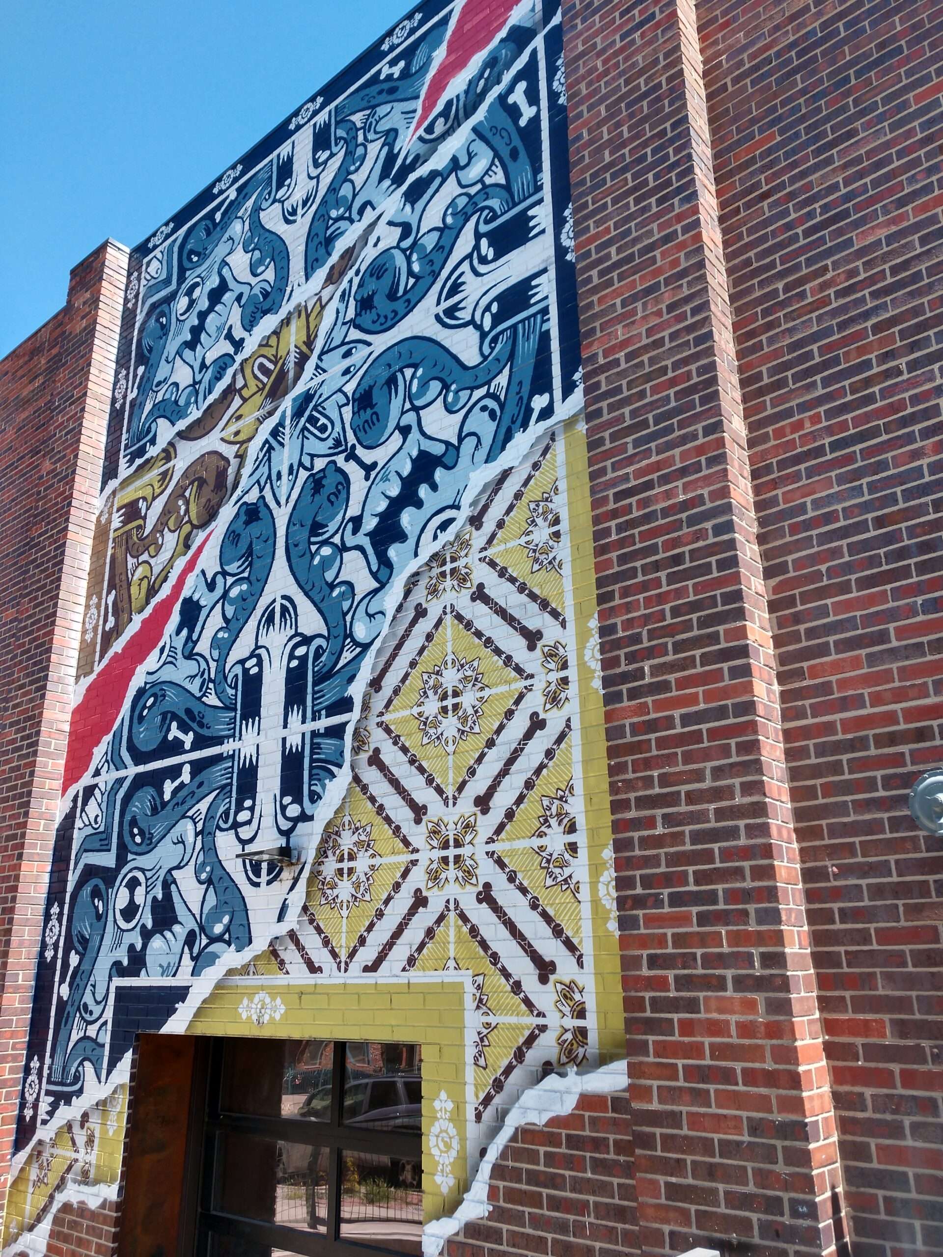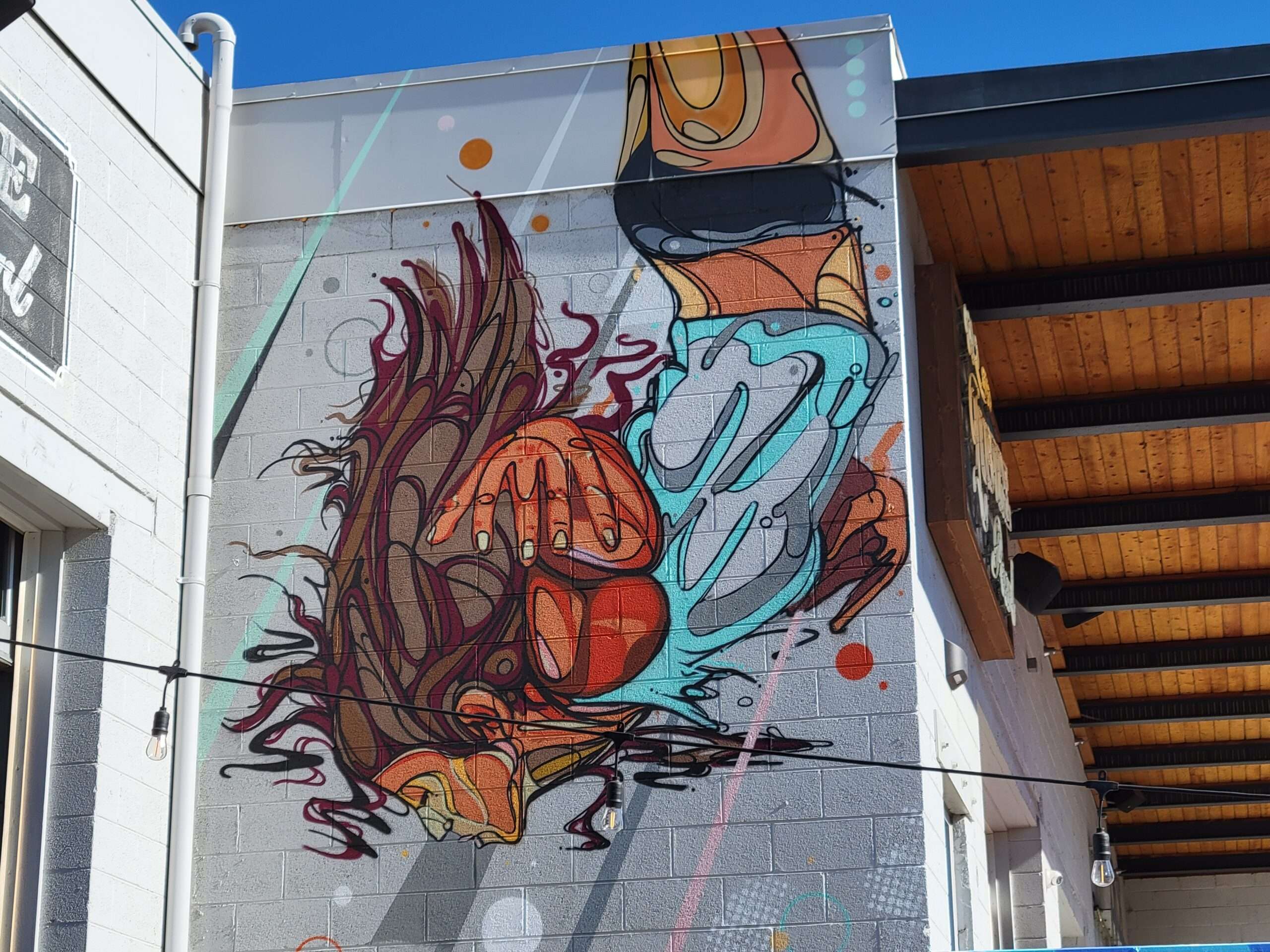 Created by artist Jason Garcia in 2015, this striking piece of Denver street art features an intricate, stippled design of a winding snake and oversized roses. The sprawling monochromatic mural decorates a long concrete retaining wall beside a sunlit sidewalk, with the downtown city skyline peeking out in the background. It serves as a beautiful example of the diverse artistic techniques and large-scale installations that elevate the city's outdoor pedestrian spaces.