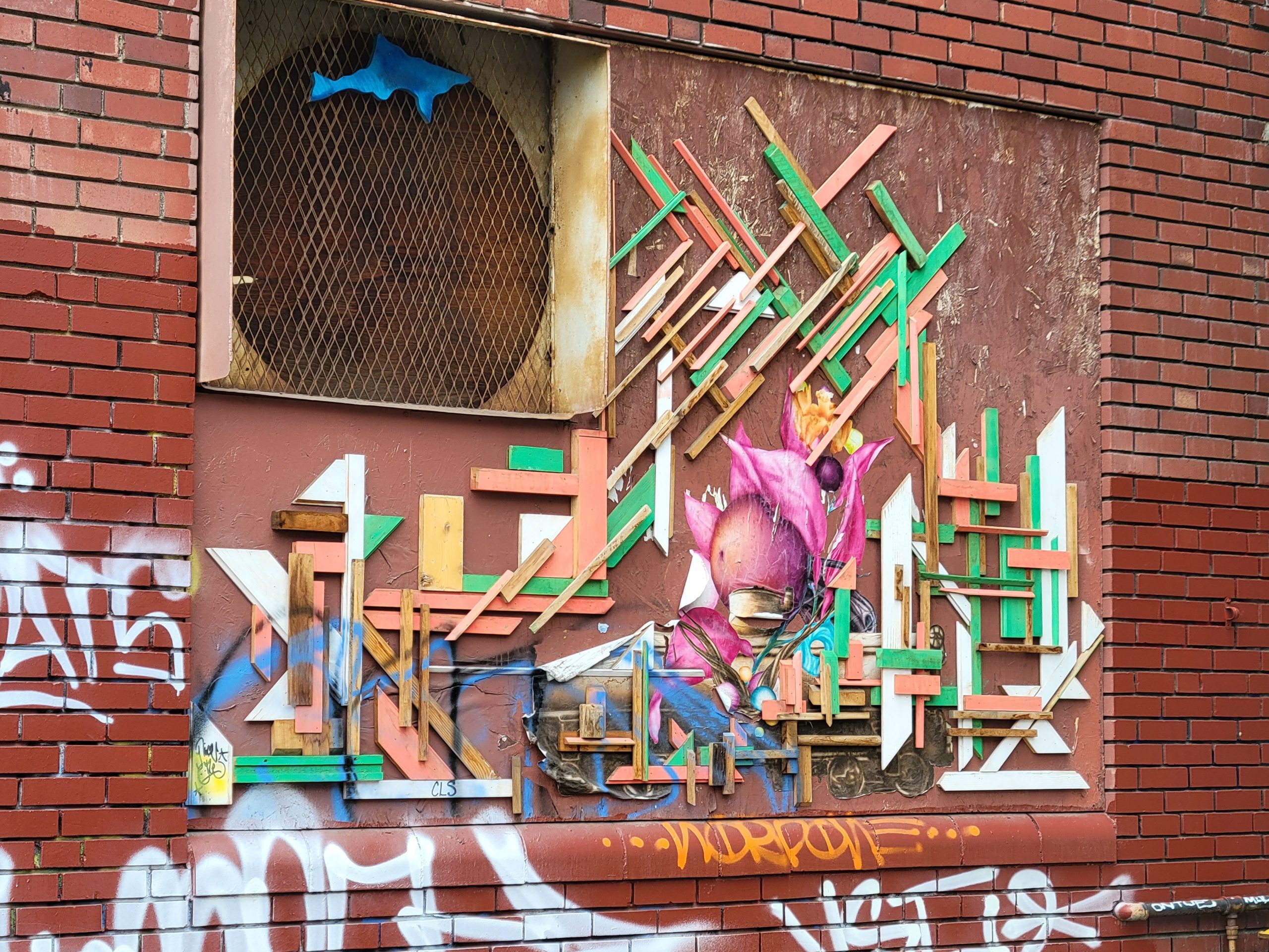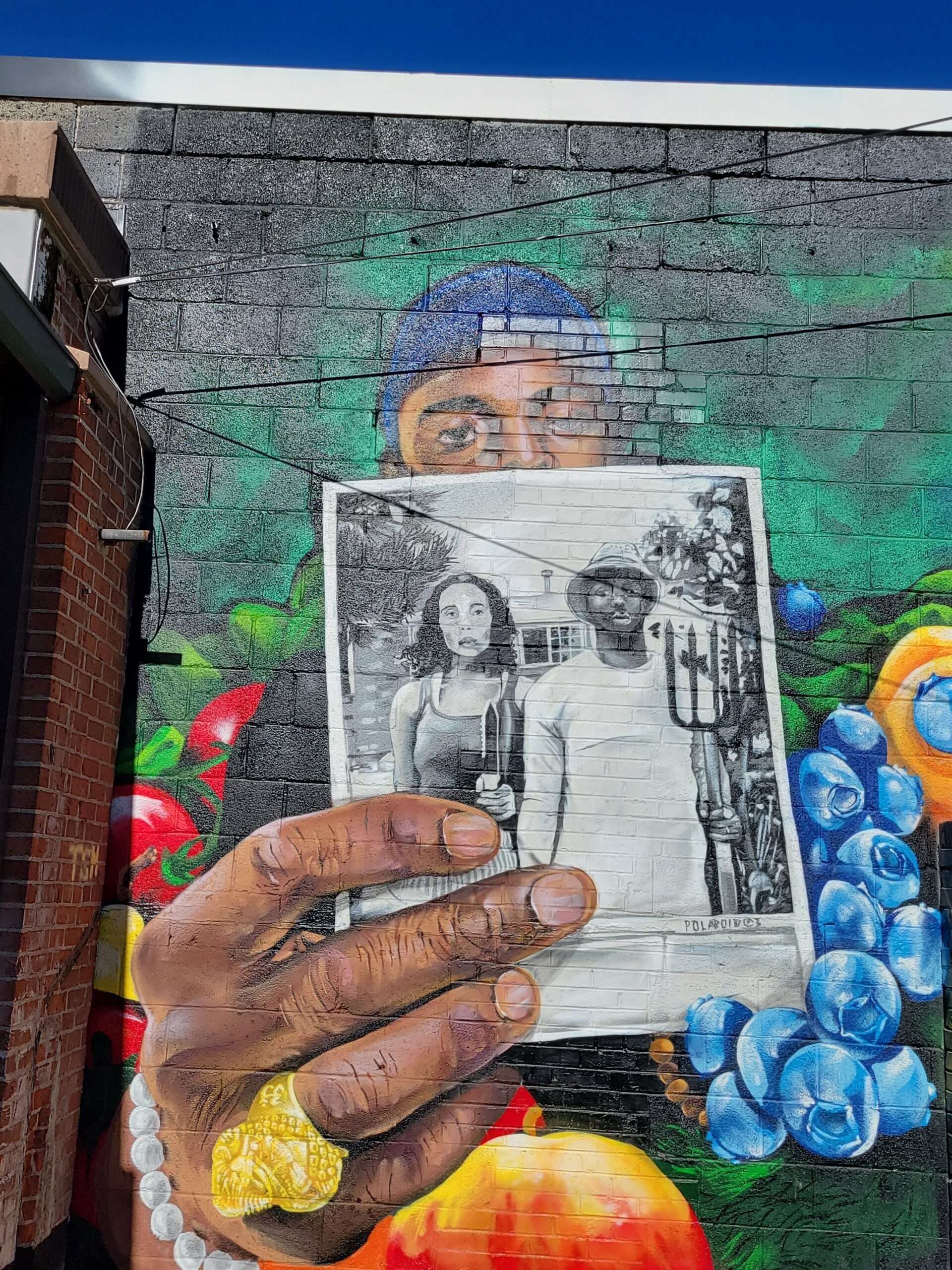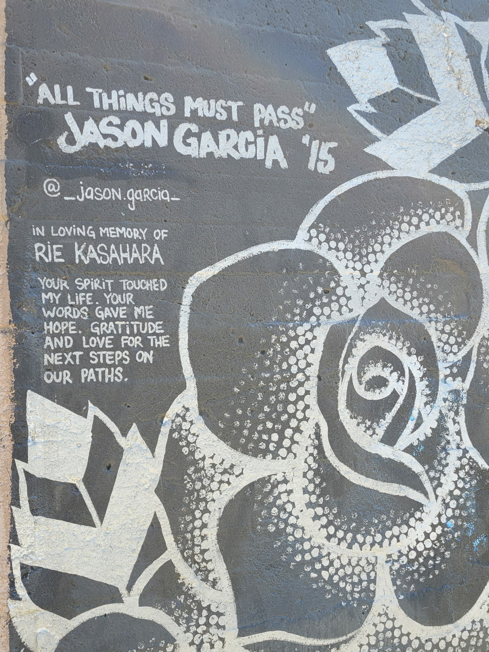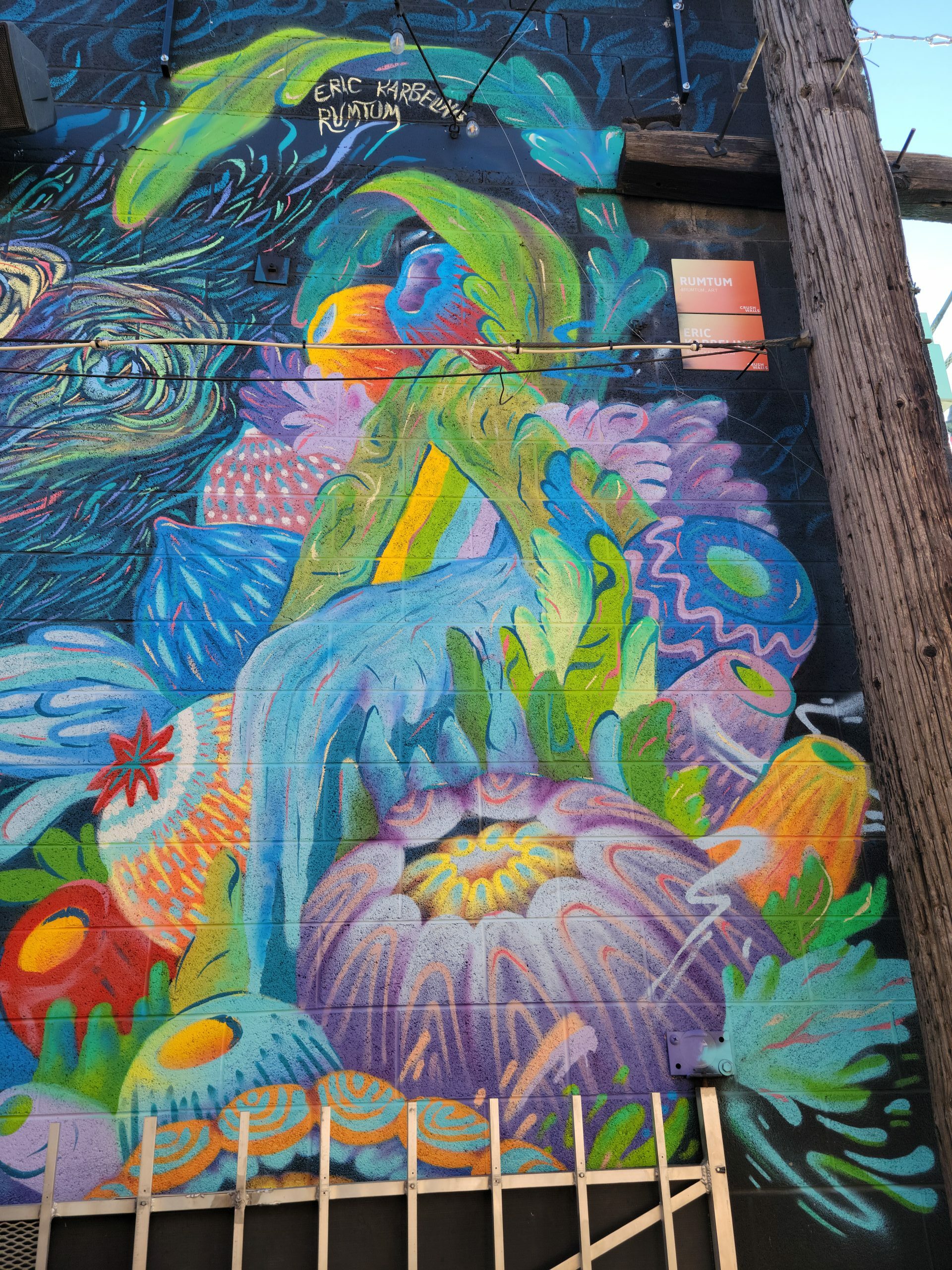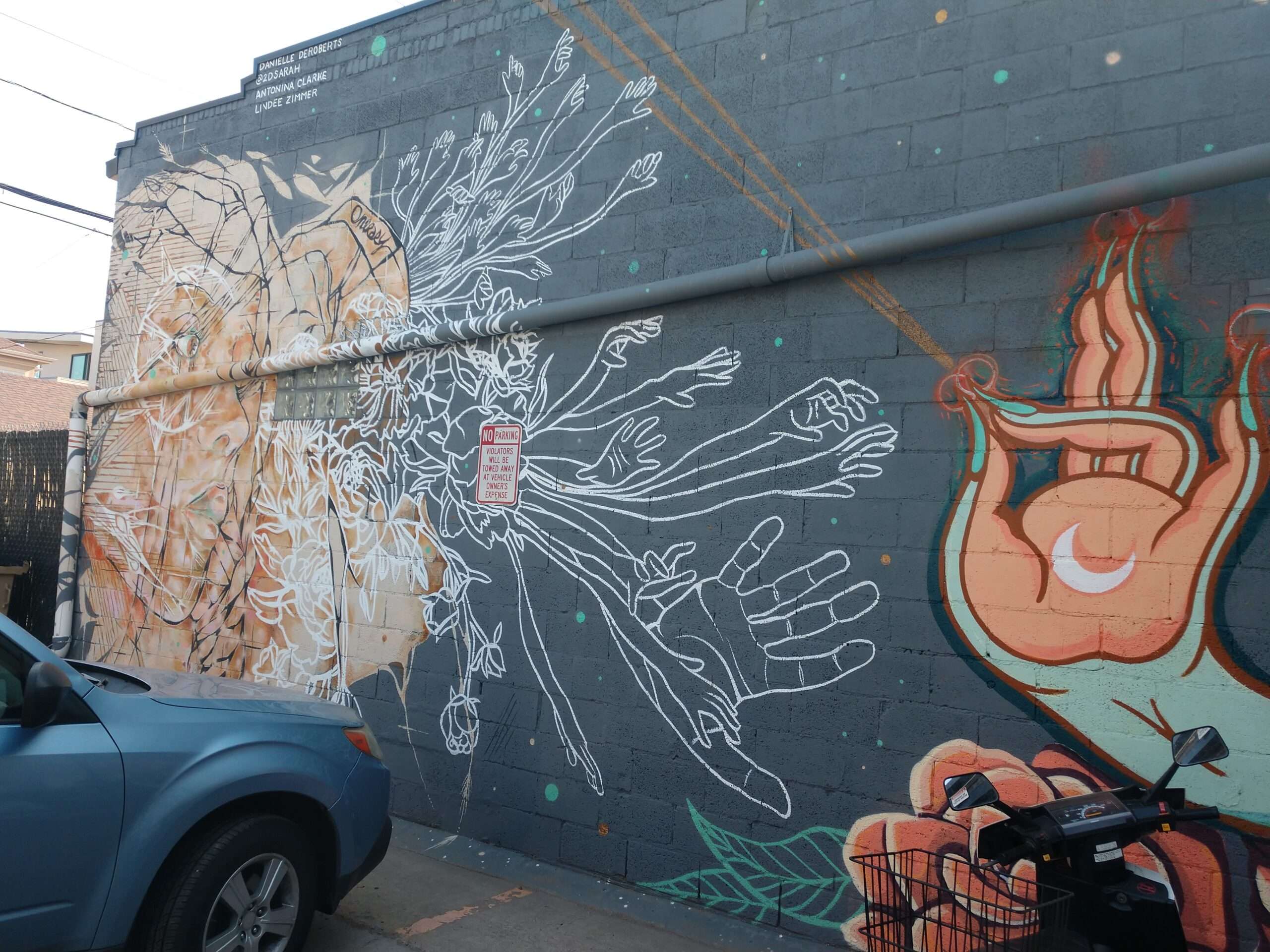 Created by artist Jason Garcia in 2015, this striking piece of Denver street art features an intricate, stippled design of a winding snake and oversized roses. The sprawling monochromatic mural decorates a long concrete retaining wall beside a sunlit sidewalk, with the downtown city skyline peeking out in the background. It serves as a beautiful example of the diverse artistic techniques and large-scale installations that elevate the city's outdoor pedestrian spaces.