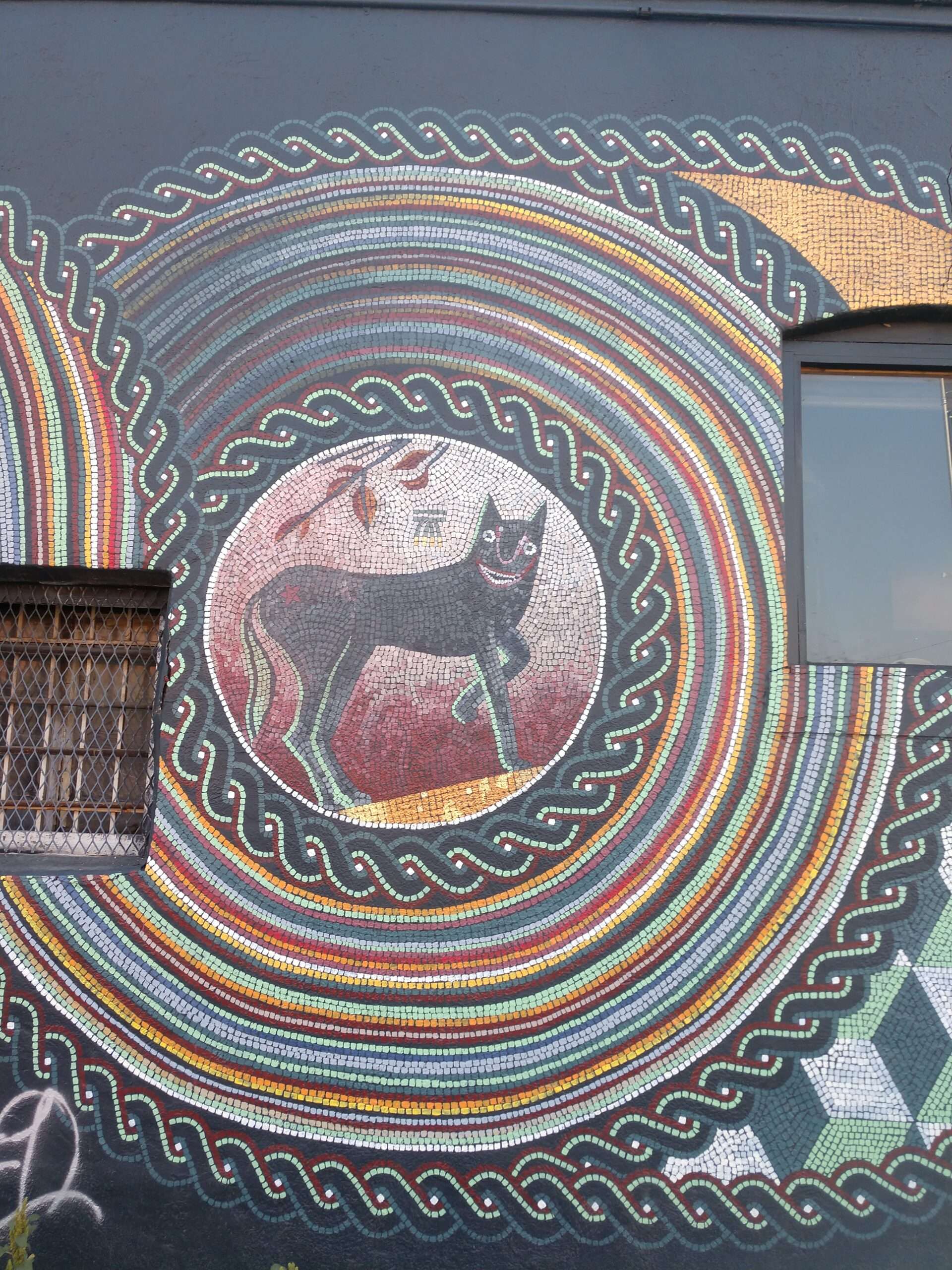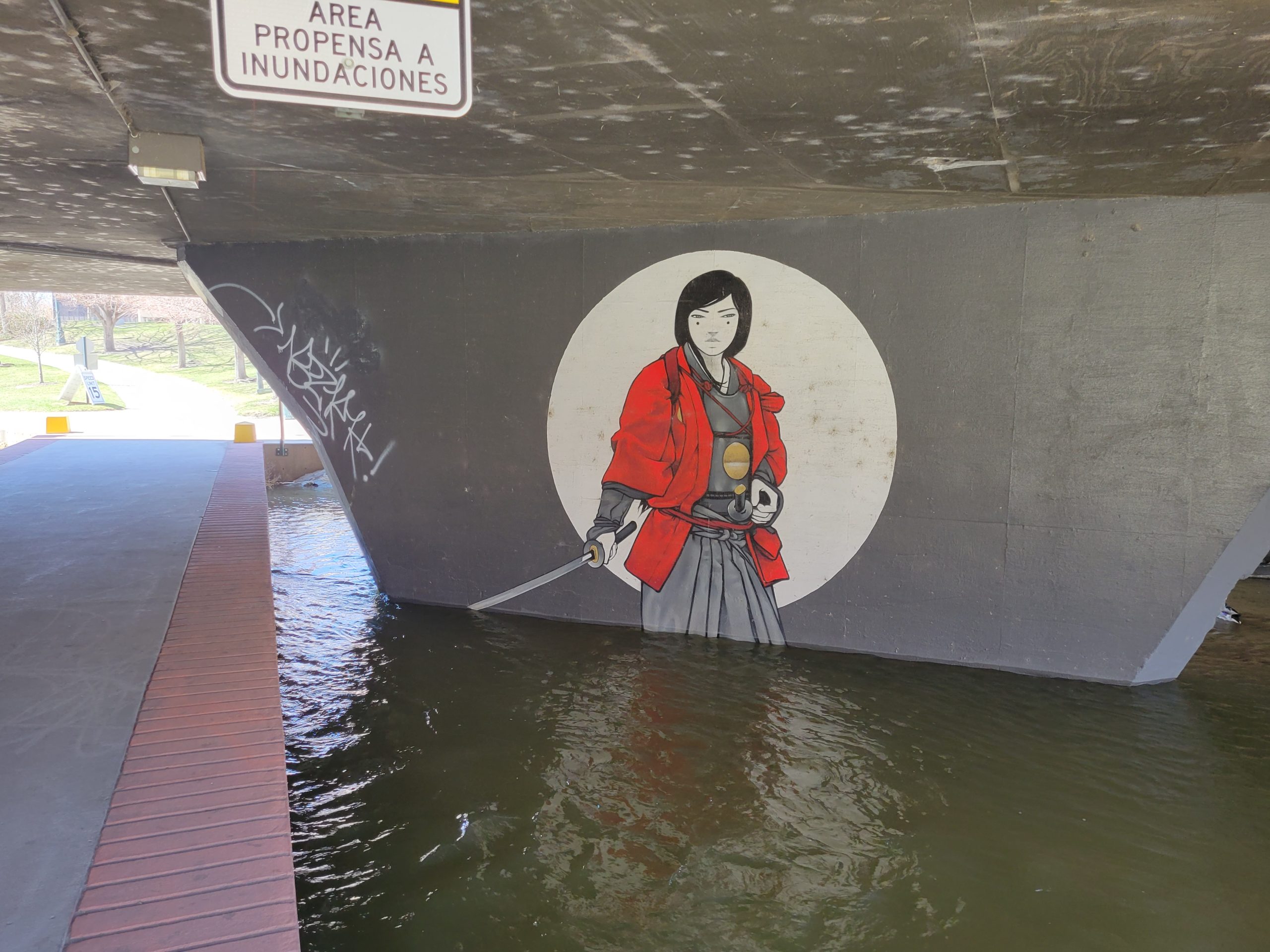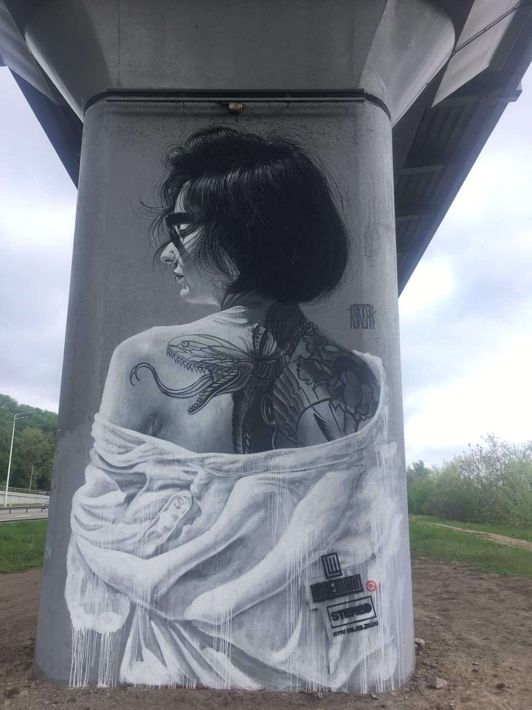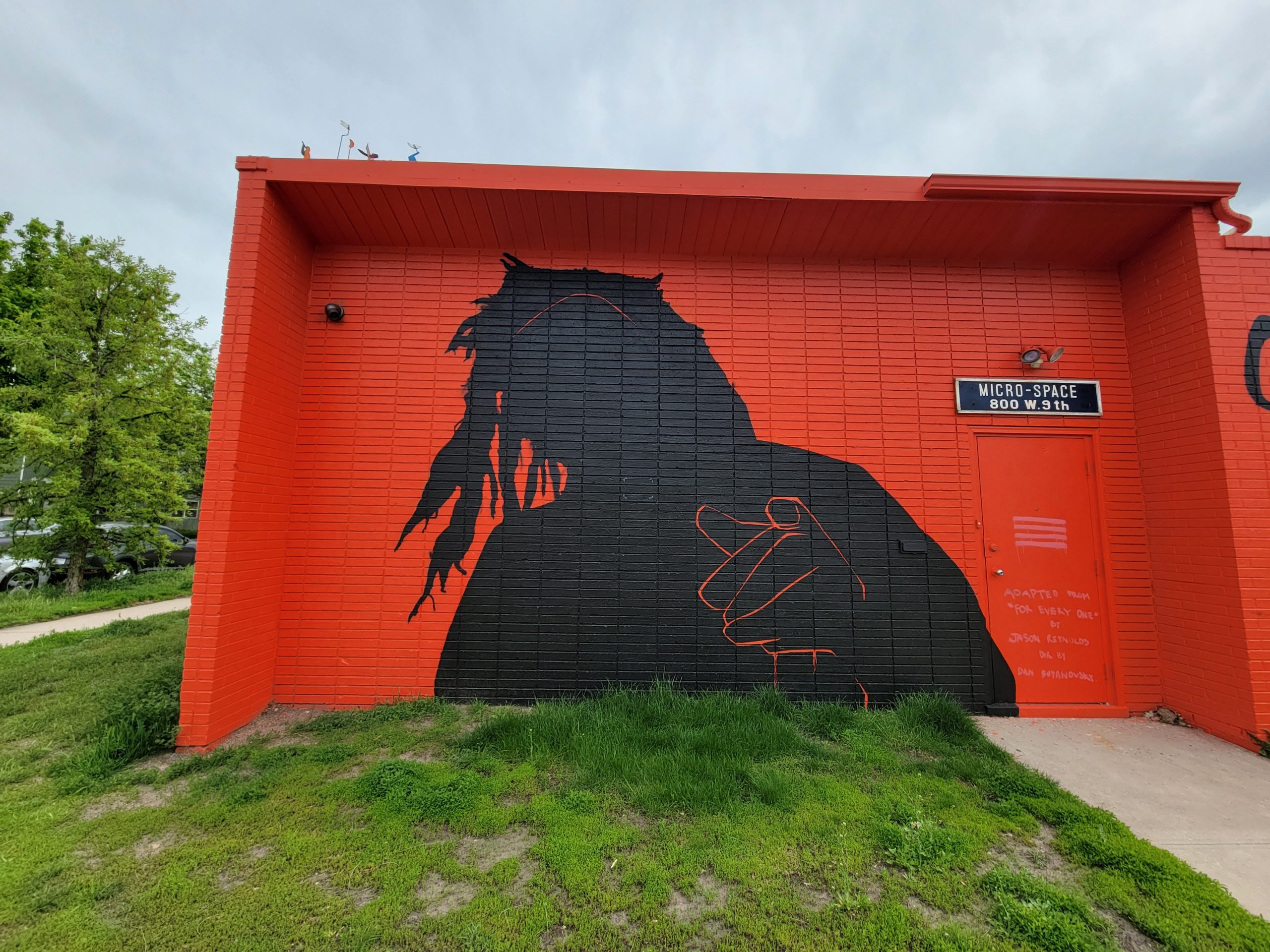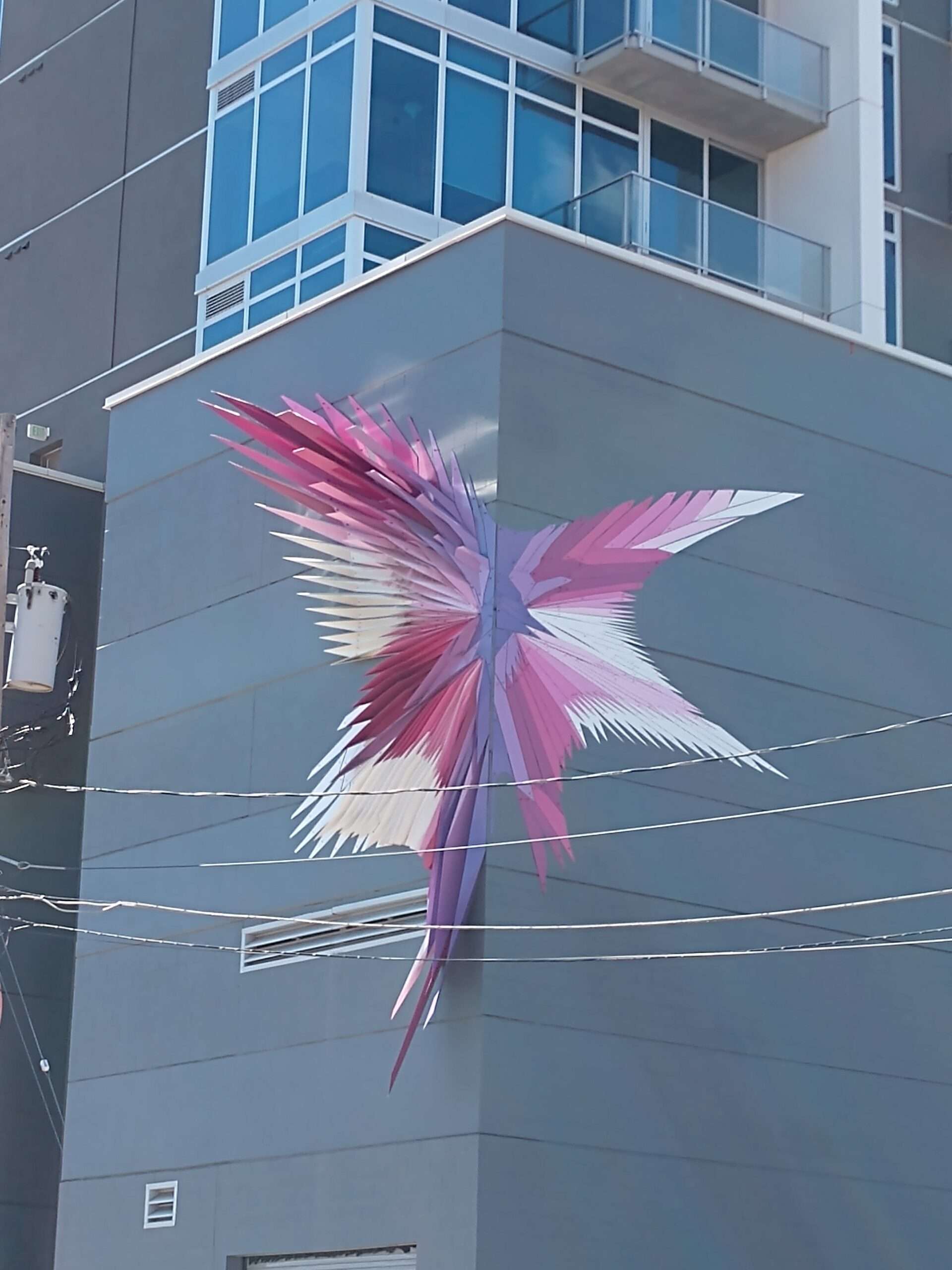 Created by artist Jason Garcia in 2015, this striking piece of Denver street art features an intricate, stippled design of a winding snake and oversized roses. The sprawling monochromatic mural decorates a long concrete retaining wall beside a sunlit sidewalk, with the downtown city skyline peeking out in the background. It serves as a beautiful example of the diverse artistic techniques and large-scale installations that elevate the city's outdoor pedestrian spaces.