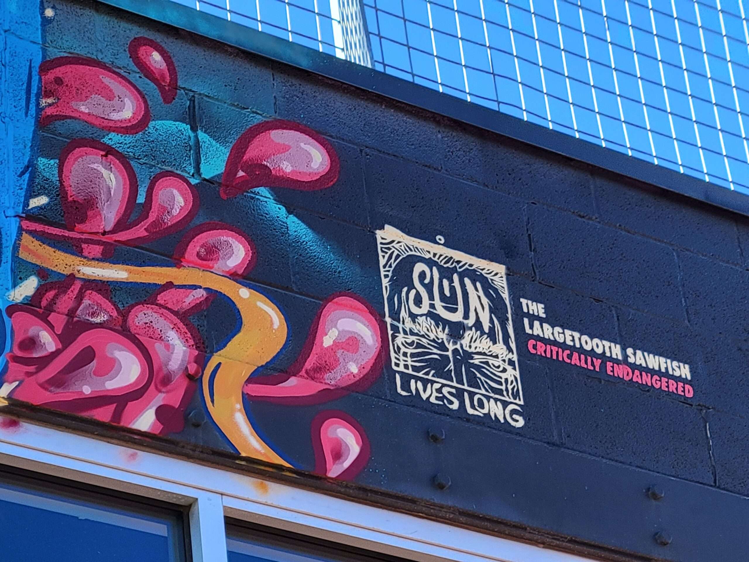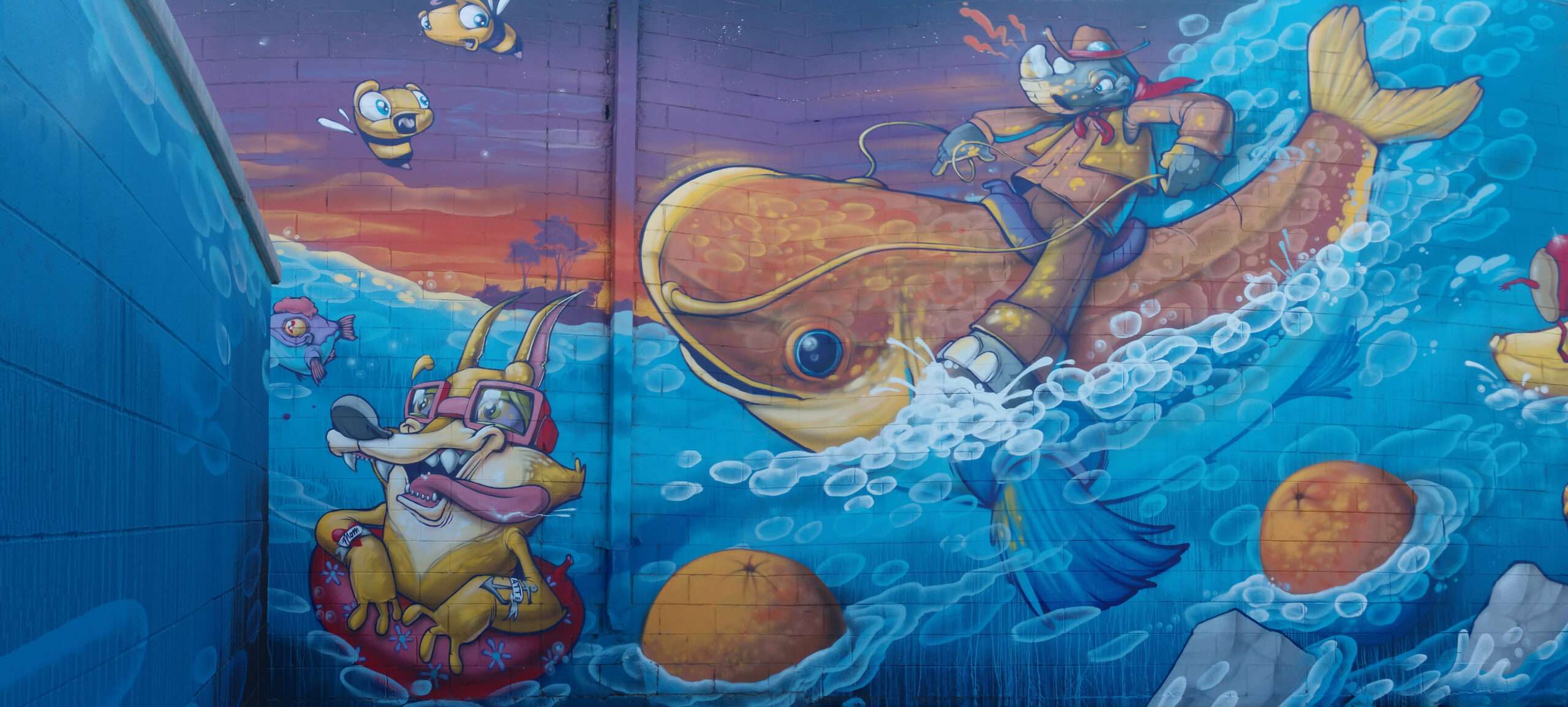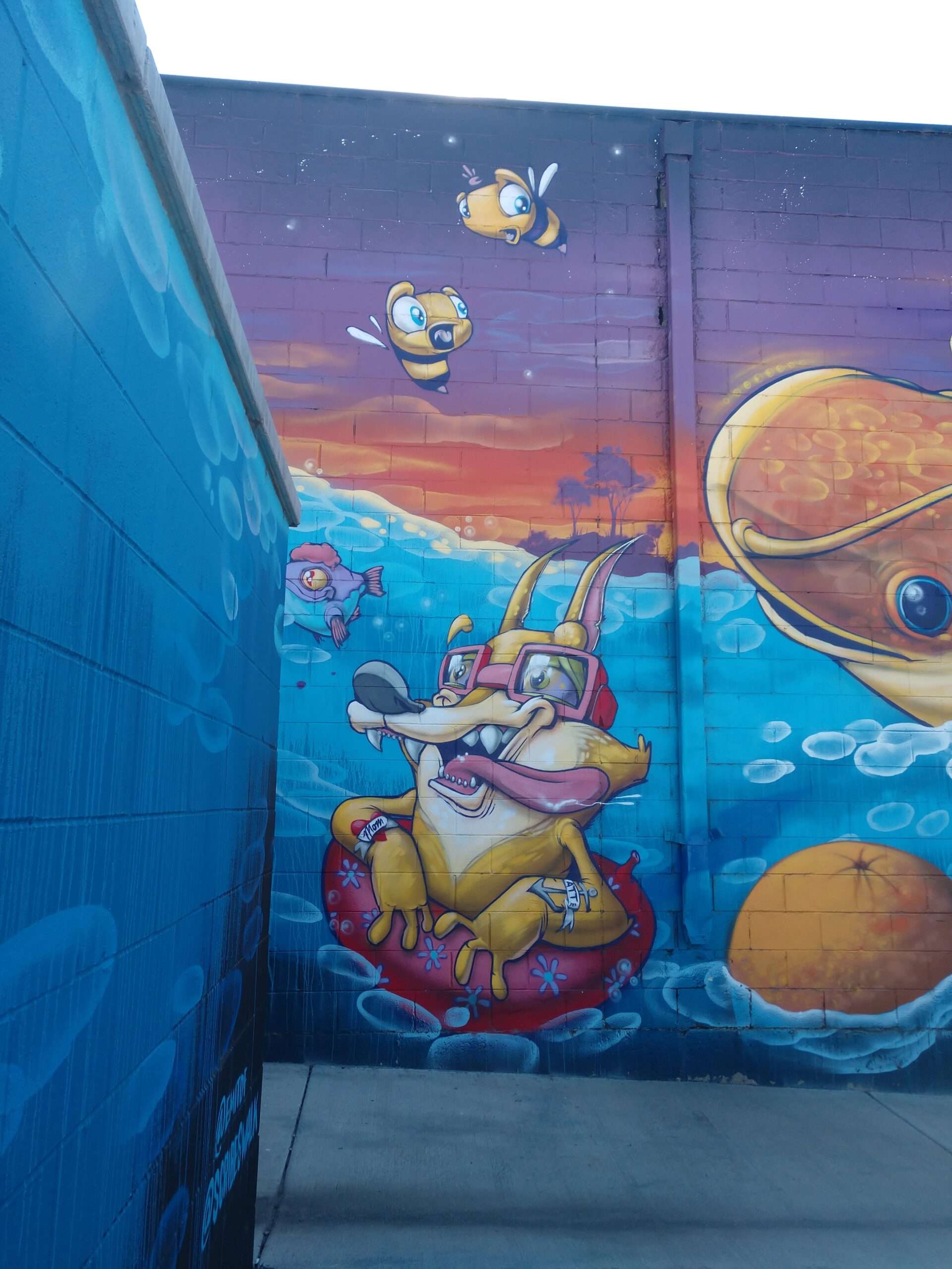 This photograph captures a massive, multi-character mural painted on a blue cinder block facade. The central figure is a grey rhinoceros wearing a brown cowboy hat and a red bandana, "riding" a large, stylized orange fish that is leaping through white, frothy bubbles. In the lower-left foreground, a yellow wolf-like character wears pink-rimmed goggles and a red inner tube, looking up with a wide, toothy grin. The background is filled with swirling blue and purple gradients, featuring floating orange slices and small, round-eyed bees flying above the water's surface. The artwork uses bold, cartoonish outlines and smooth airbrushed gradients to create a sense of depth and motion.