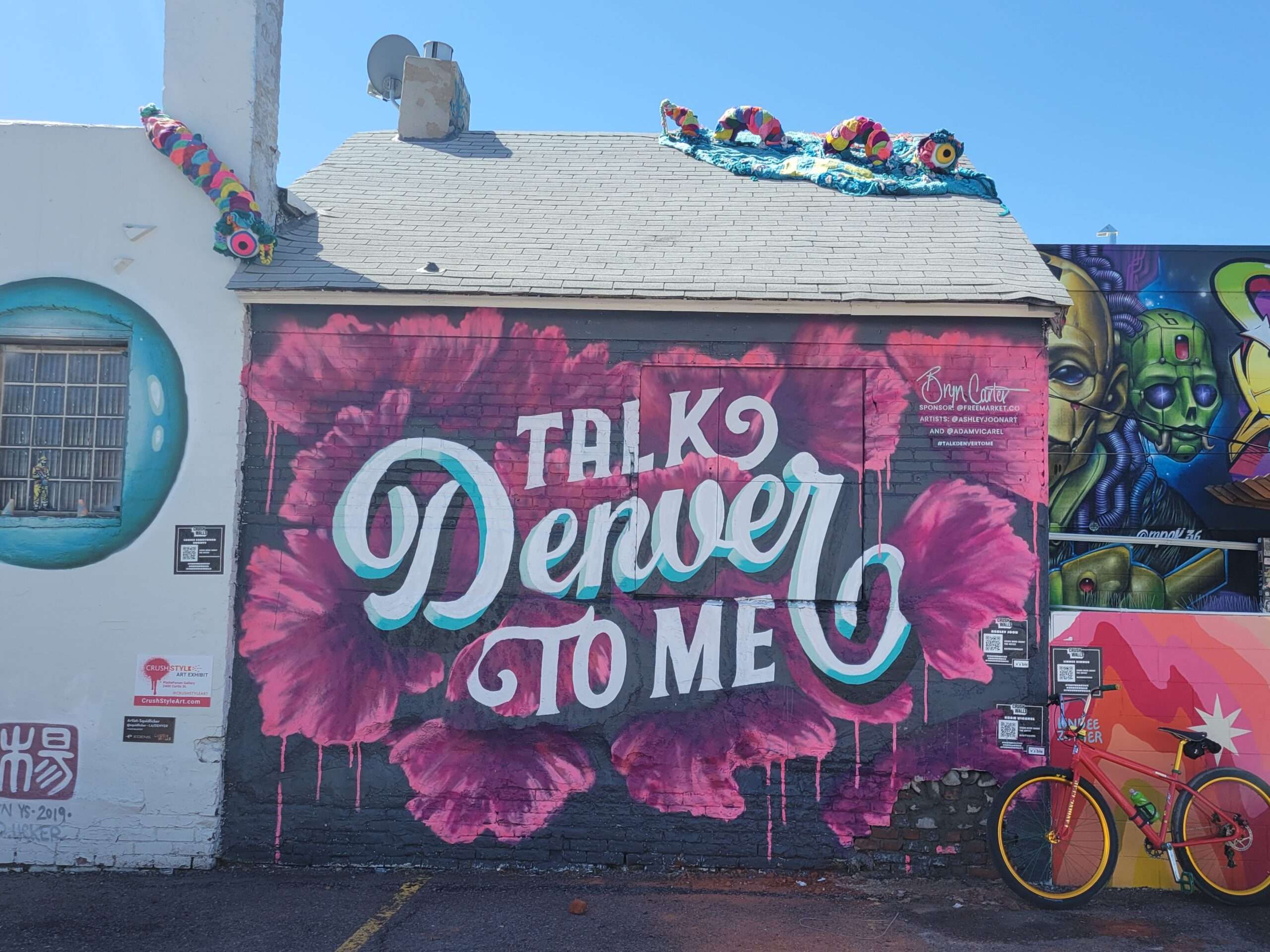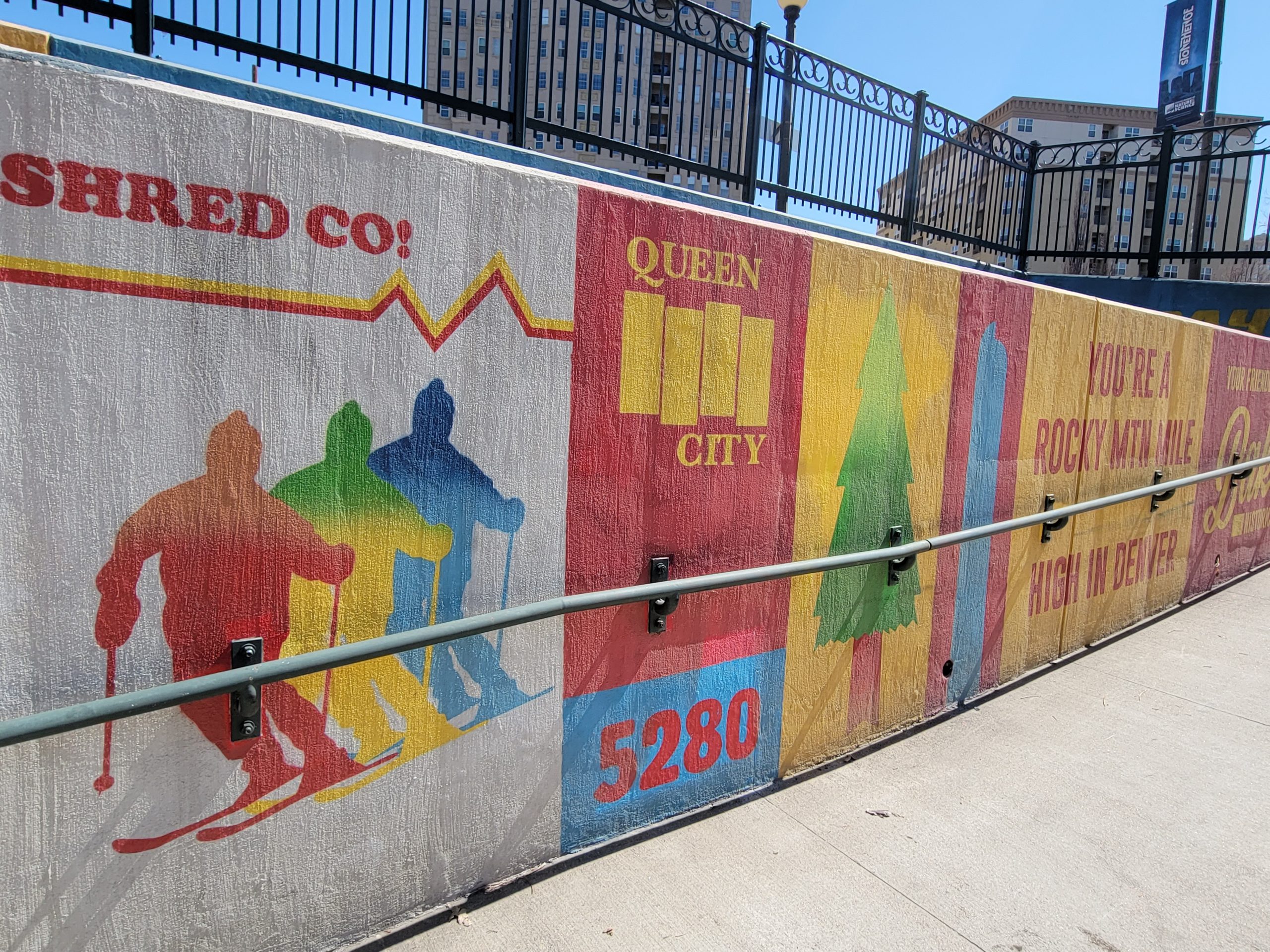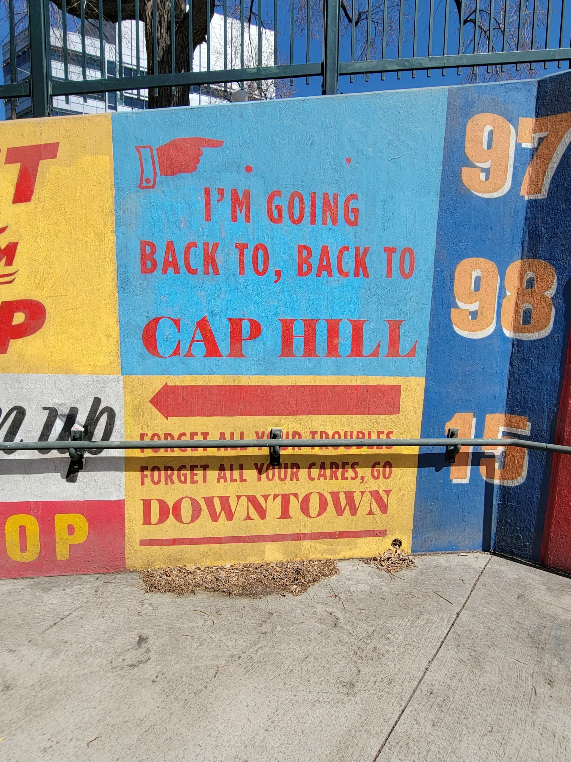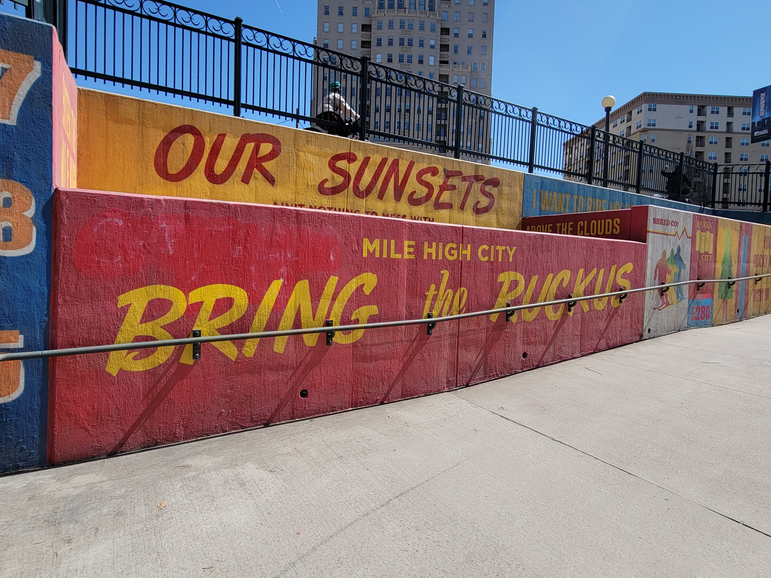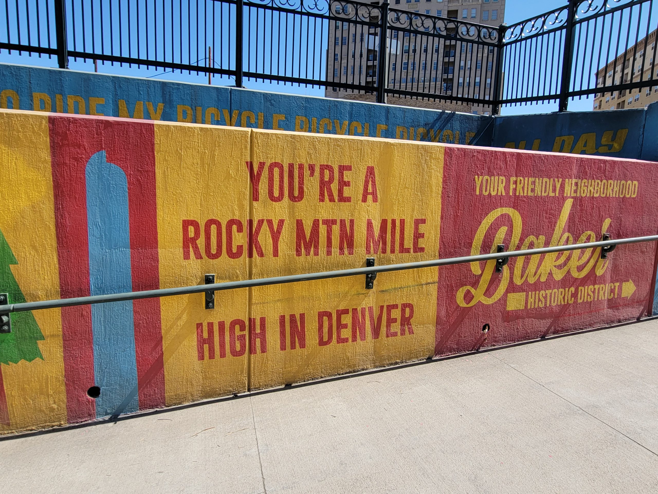 This cheerful typographical street mural adds a playful, navigational touch to a concrete pedestrian and cycling ramp in Denver. Featuring vibrant blue, yellow, and red color blocks, the retro-style lettering points the way to local neighborhoods with fun phrases like "I'm Going Back To, Back To Cap Hill" and "Forget All Your Cares, Go Downtown."