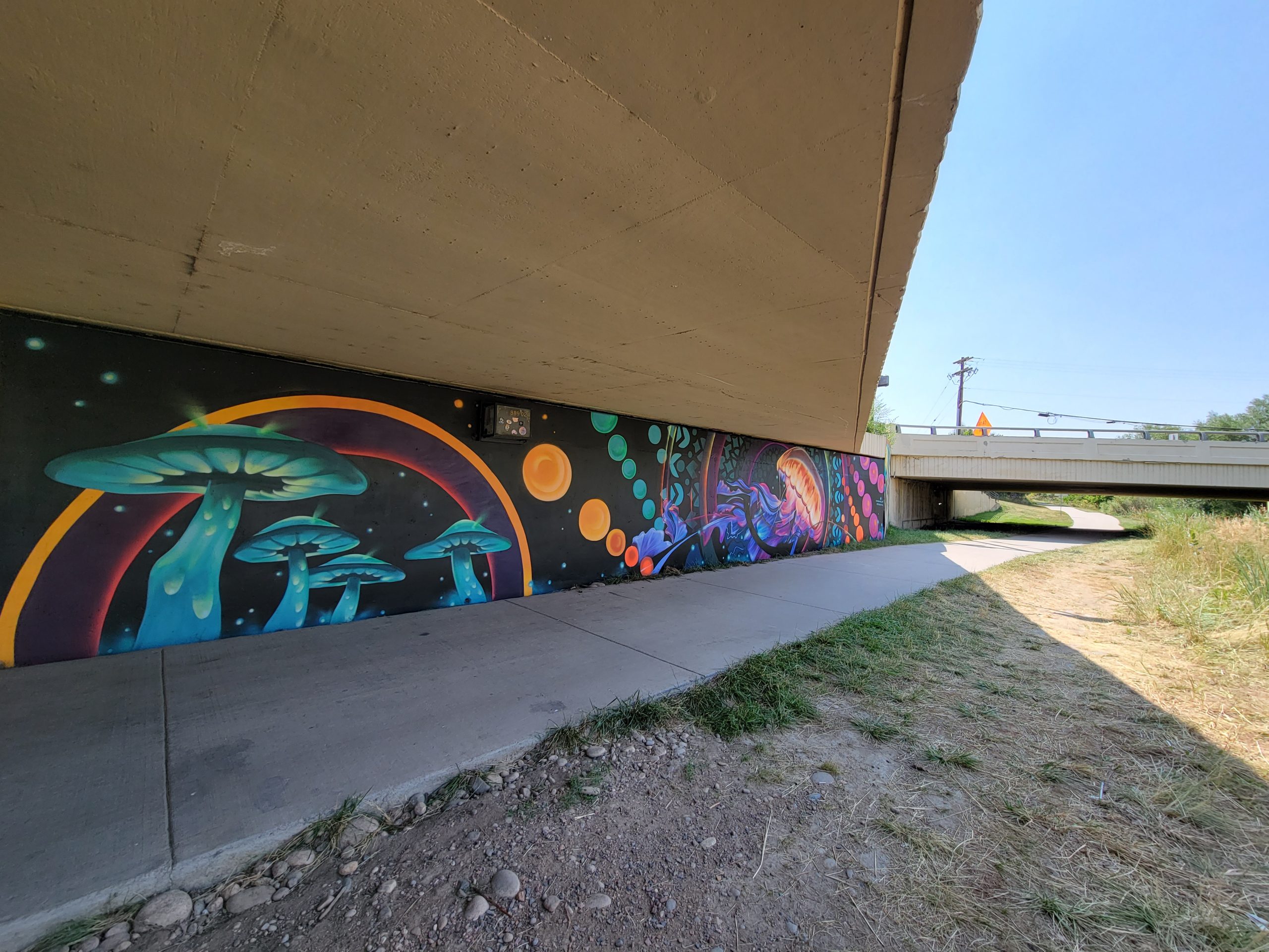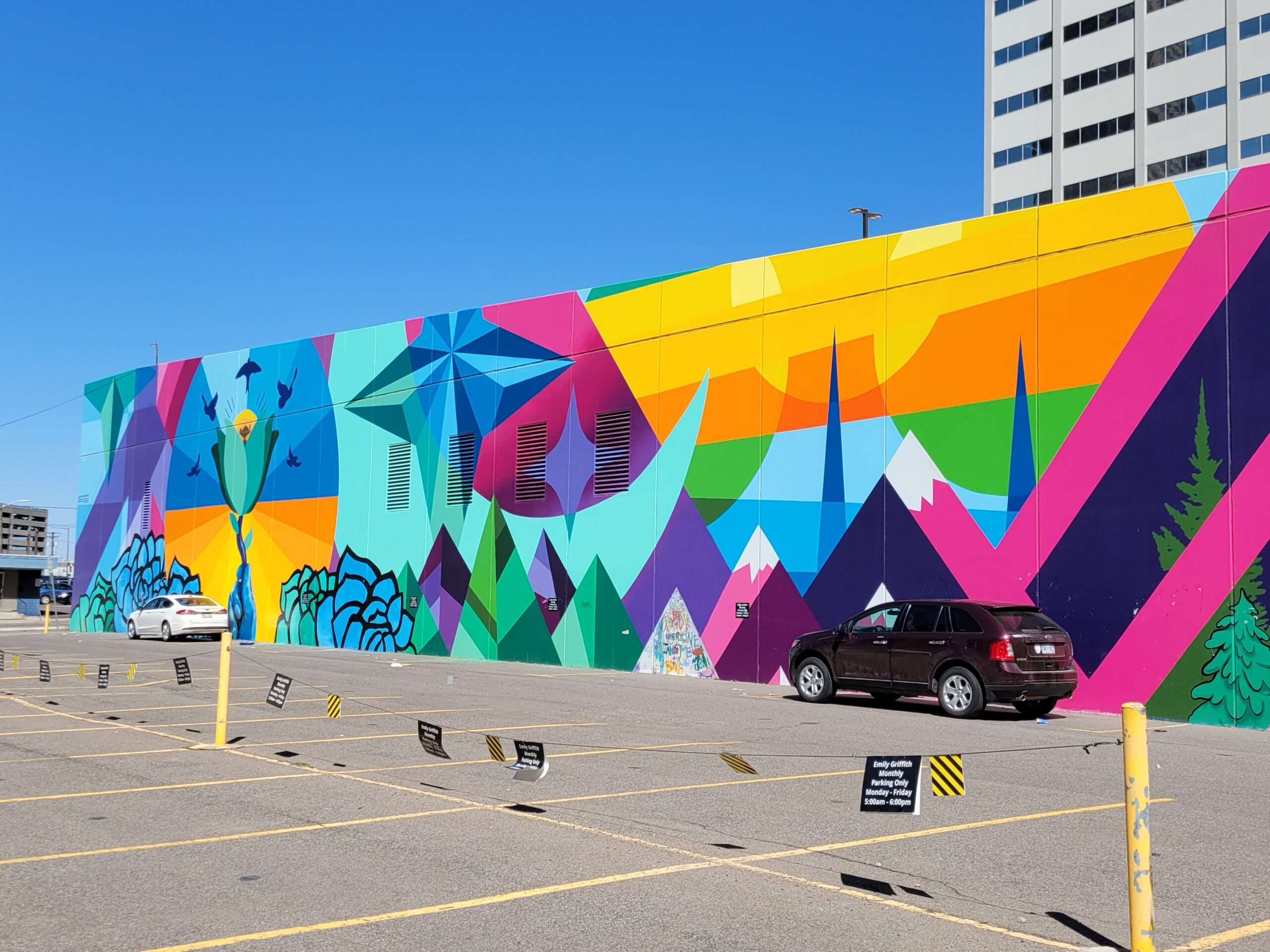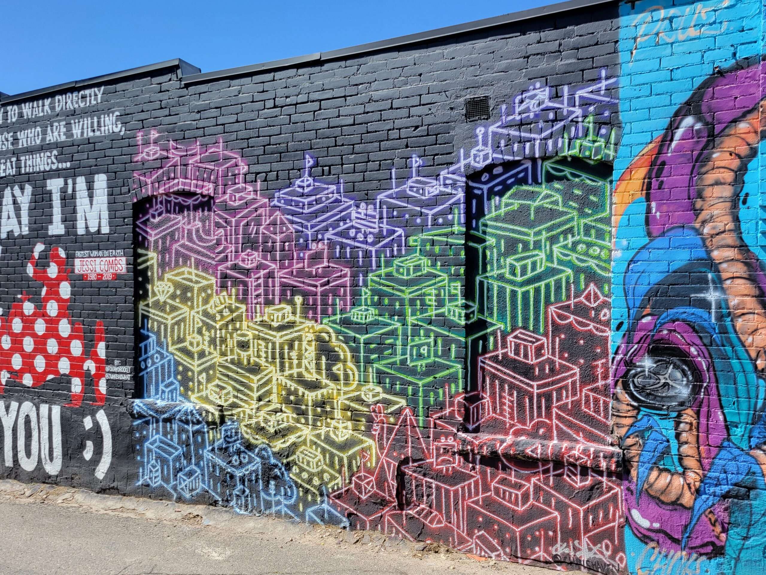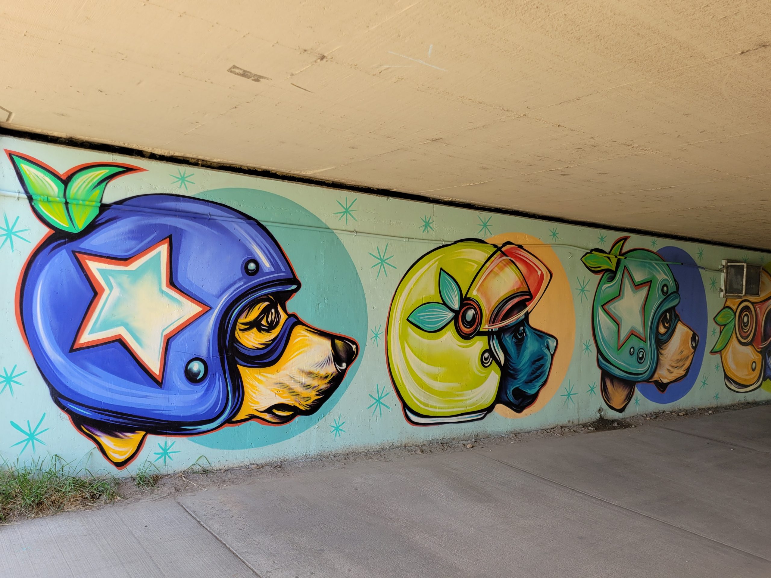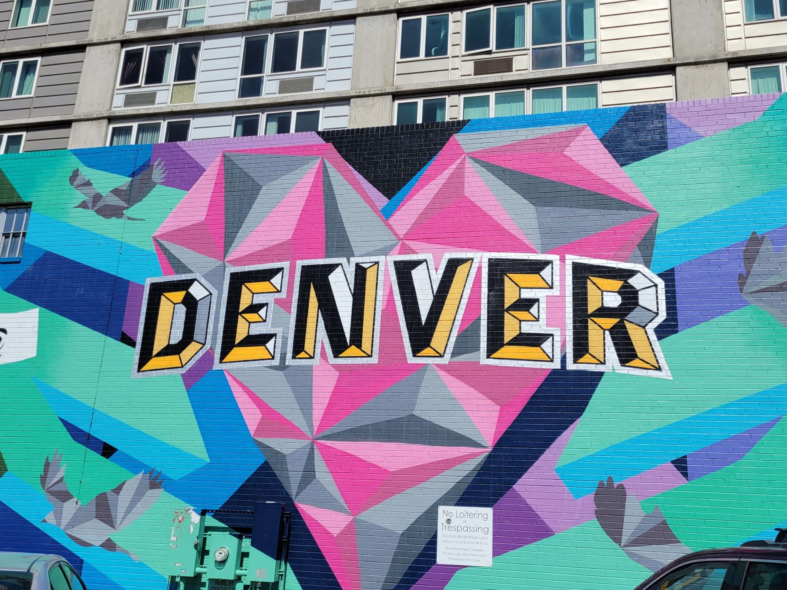 This cheerful typographical street mural adds a playful, navigational touch to a concrete pedestrian and cycling ramp in Denver. Featuring vibrant blue, yellow, and red color blocks, the retro-style lettering points the way to local neighborhoods with fun phrases like "I'm Going Back To, Back To Cap Hill" and "Forget All Your Cares, Go Downtown."