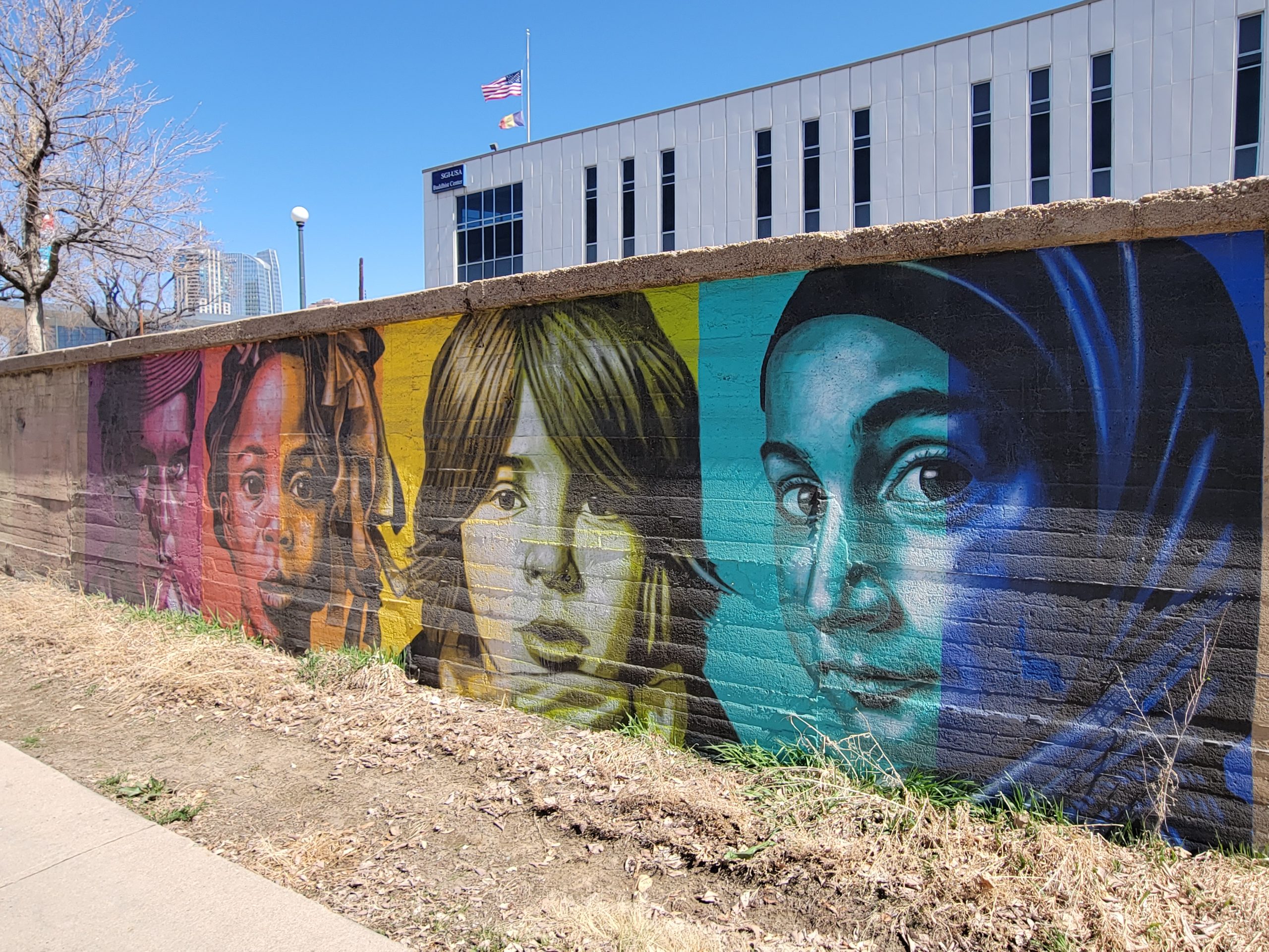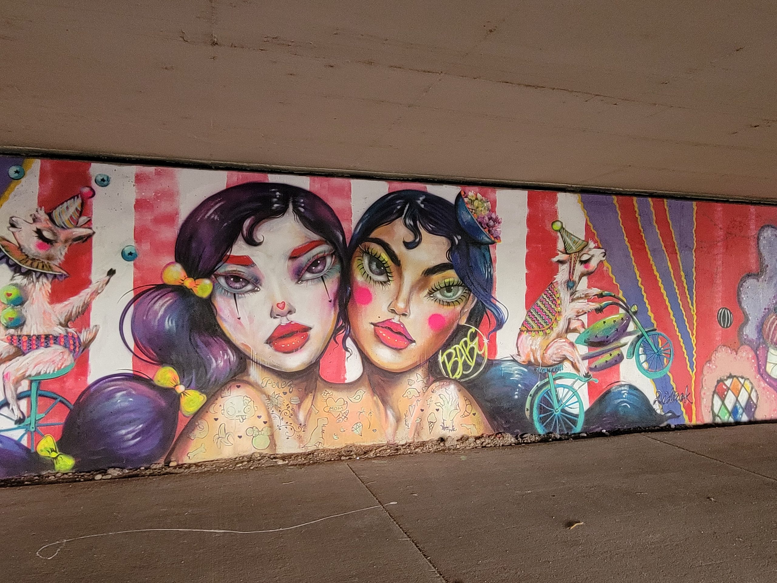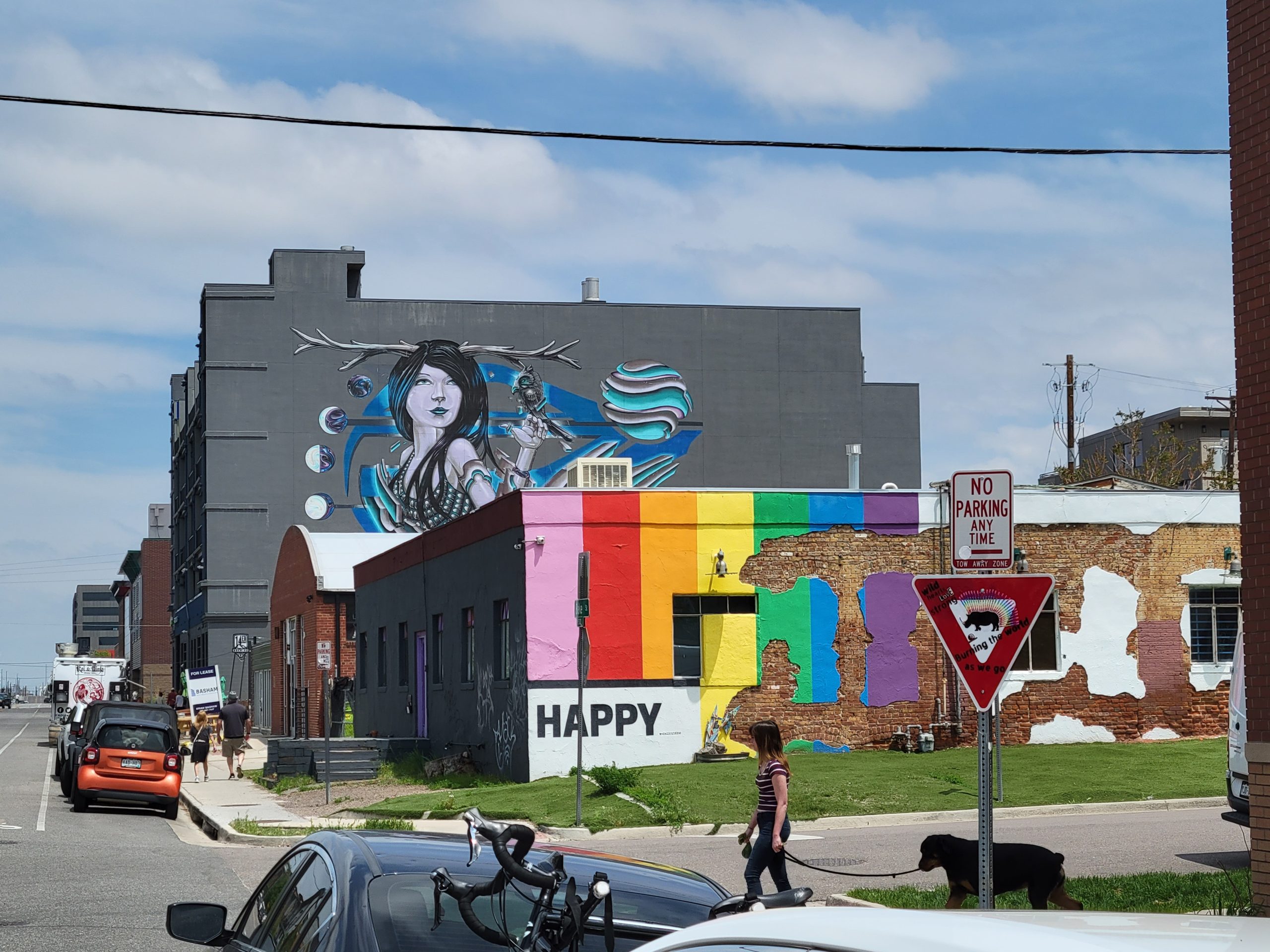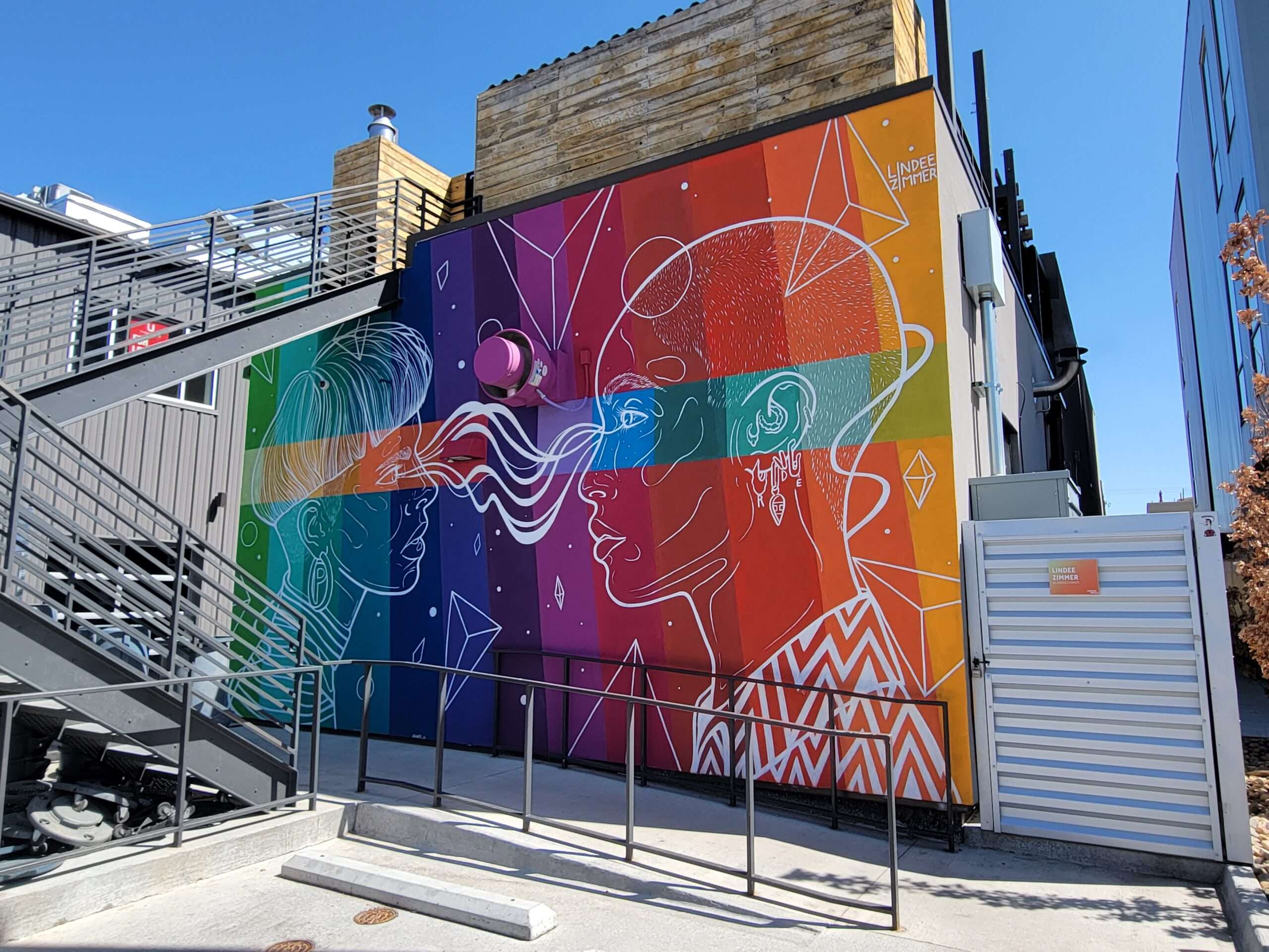 This cheerful typographical street mural adds a playful, navigational touch to a concrete pedestrian and cycling ramp in Denver. Featuring vibrant blue, yellow, and red color blocks, the retro-style lettering points the way to local neighborhoods with fun phrases like "I'm Going Back To, Back To Cap Hill" and "Forget All Your Cares, Go Downtown."
