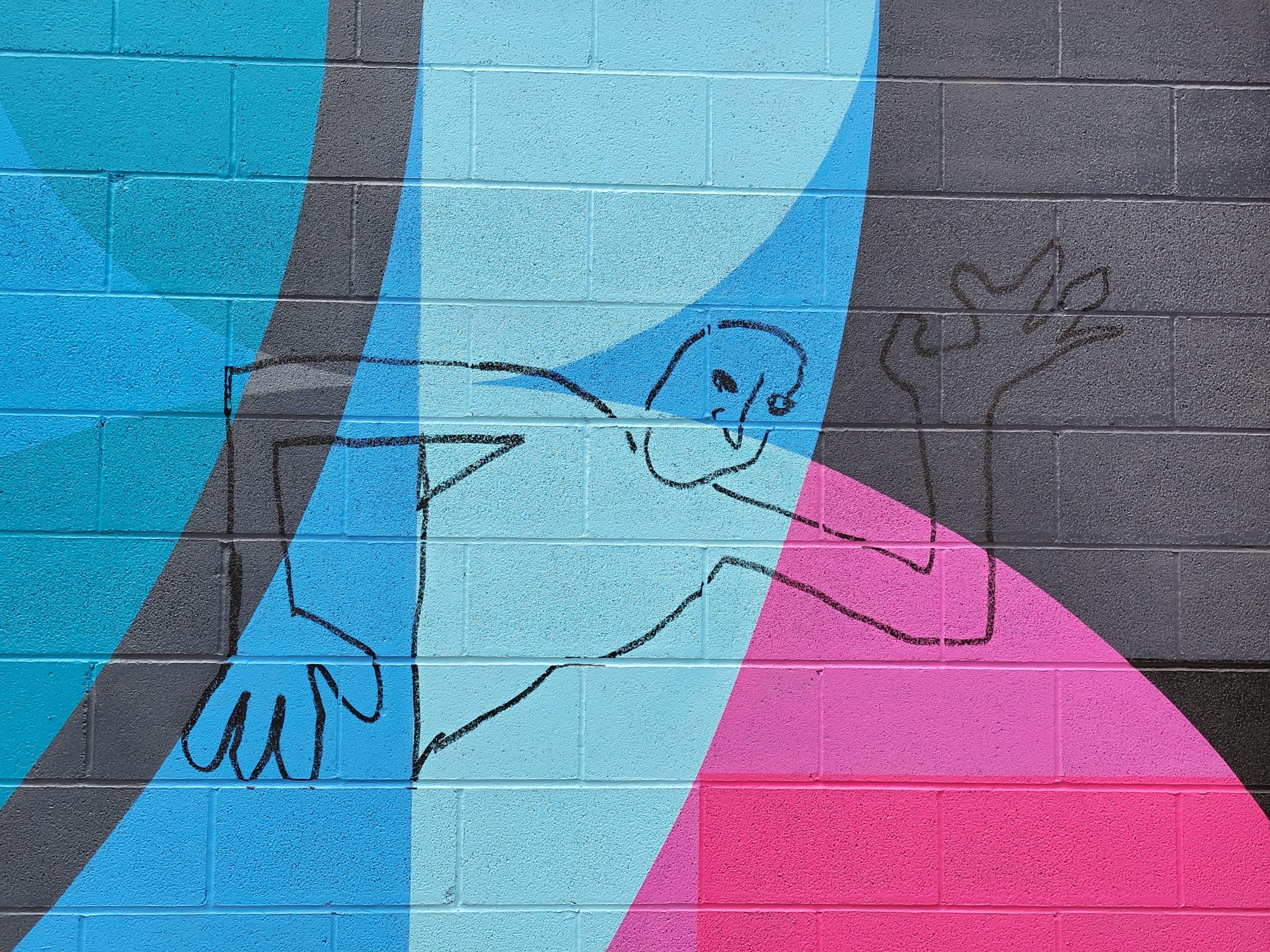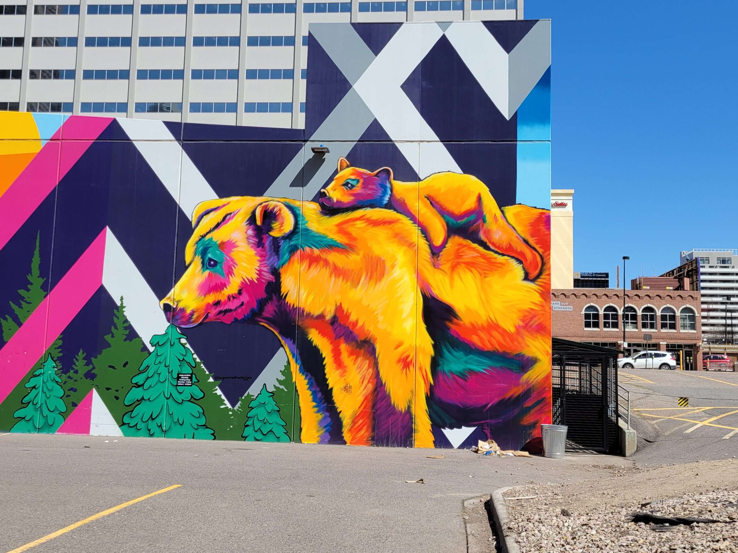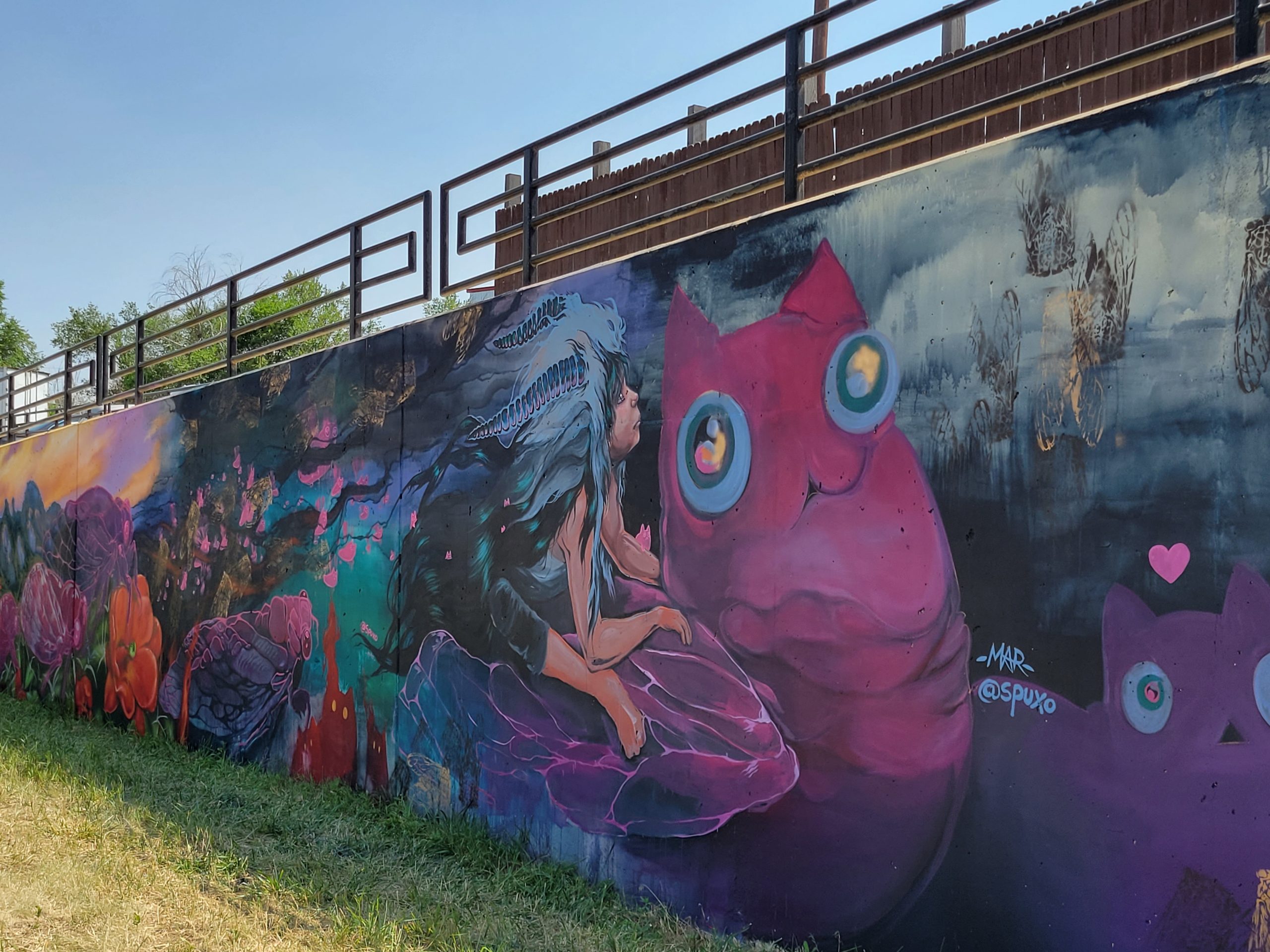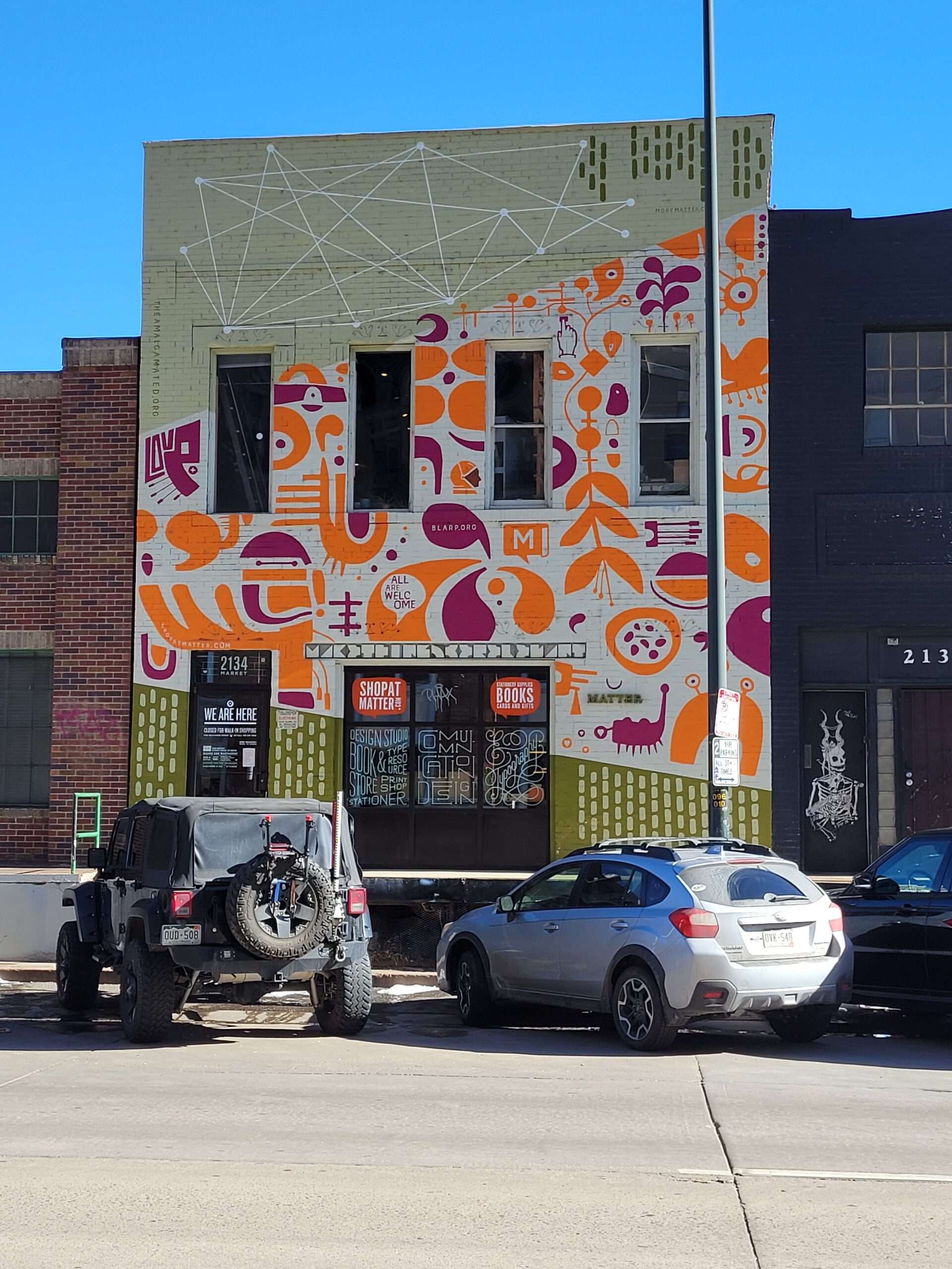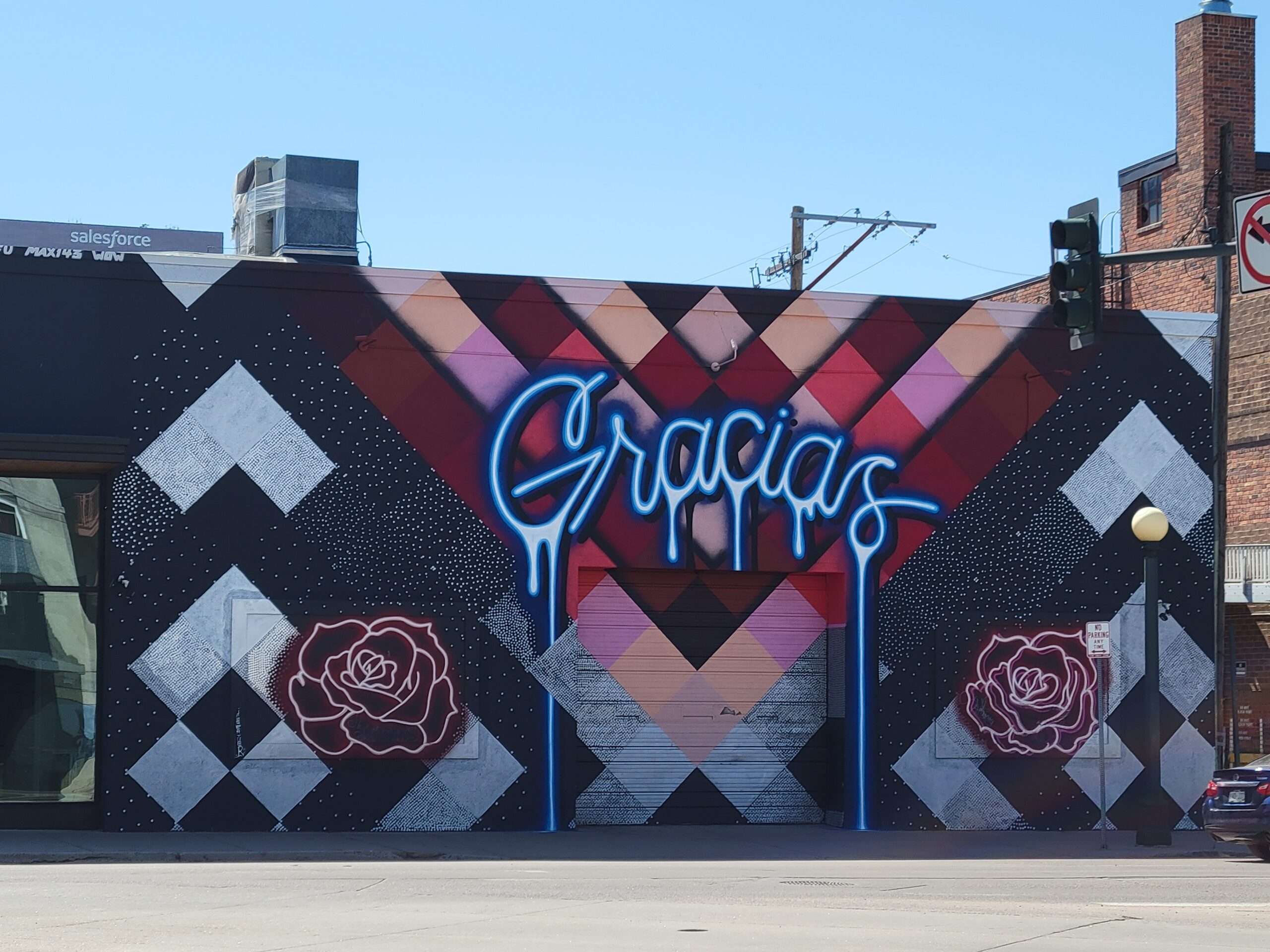 This cheerful typographical street mural adds a playful, navigational touch to a concrete pedestrian and cycling ramp in Denver. Featuring vibrant blue, yellow, and red color blocks, the retro-style lettering points the way to local neighborhoods with fun phrases like "I'm Going Back To, Back To Cap Hill" and "Forget All Your Cares, Go Downtown."