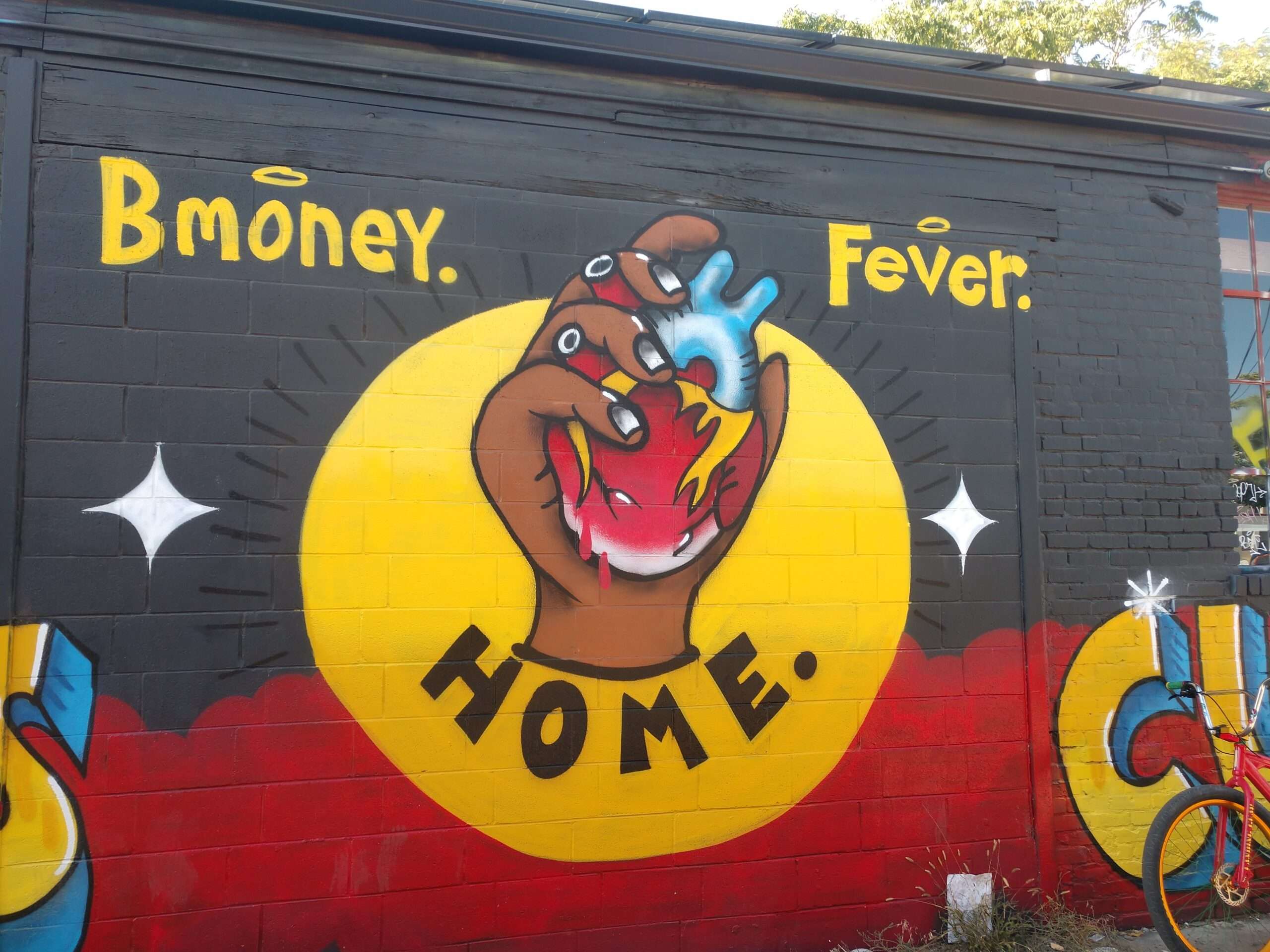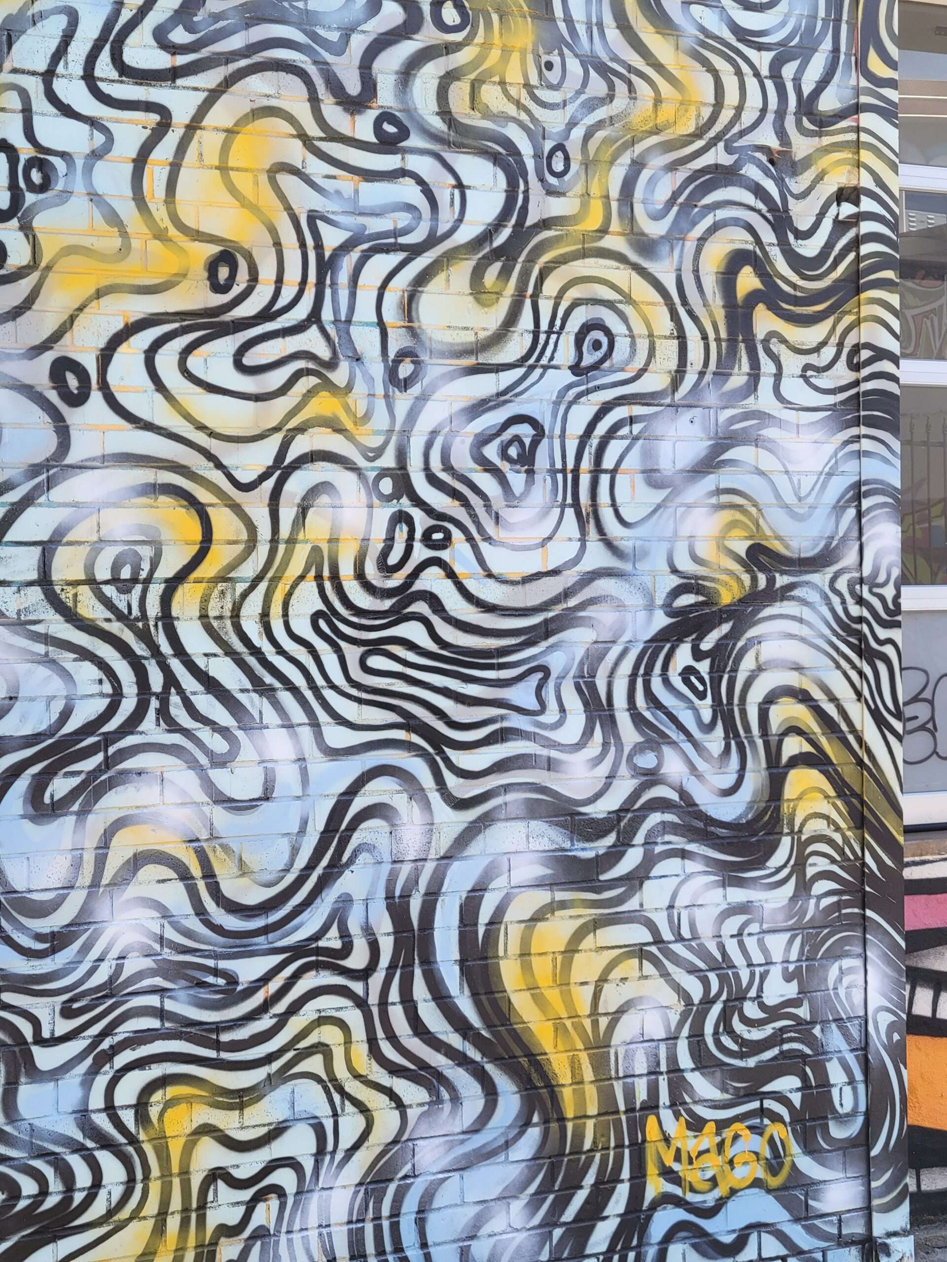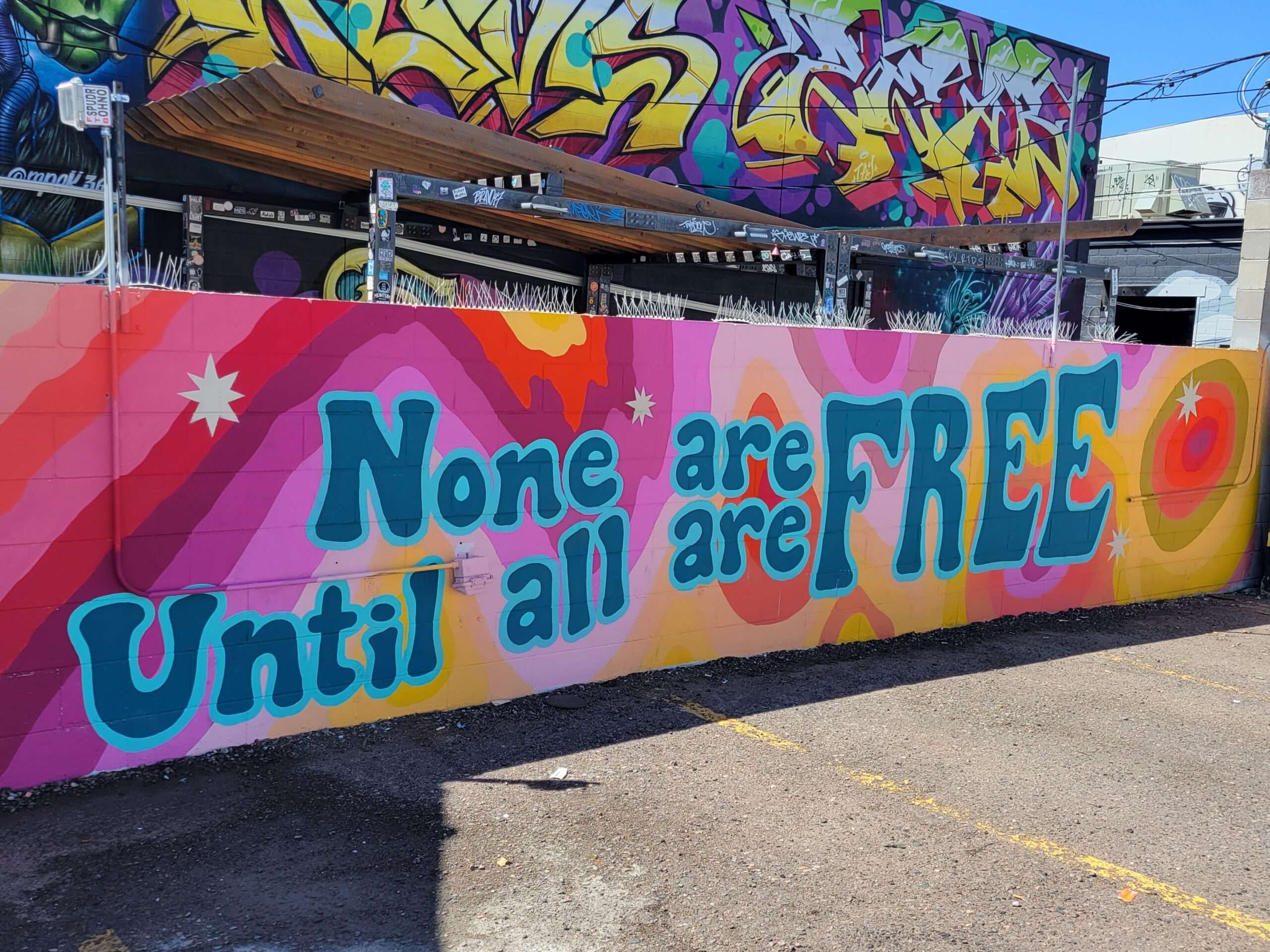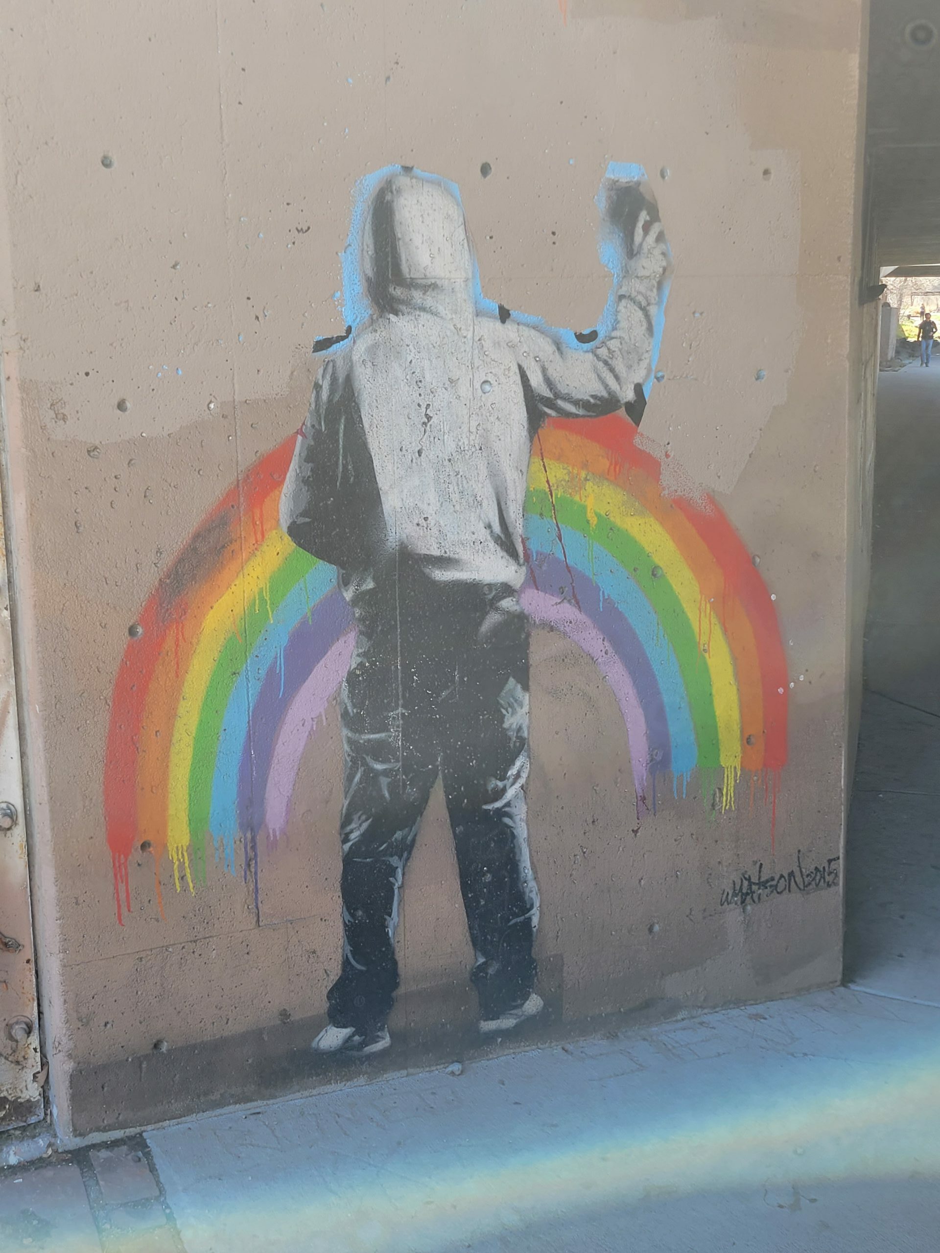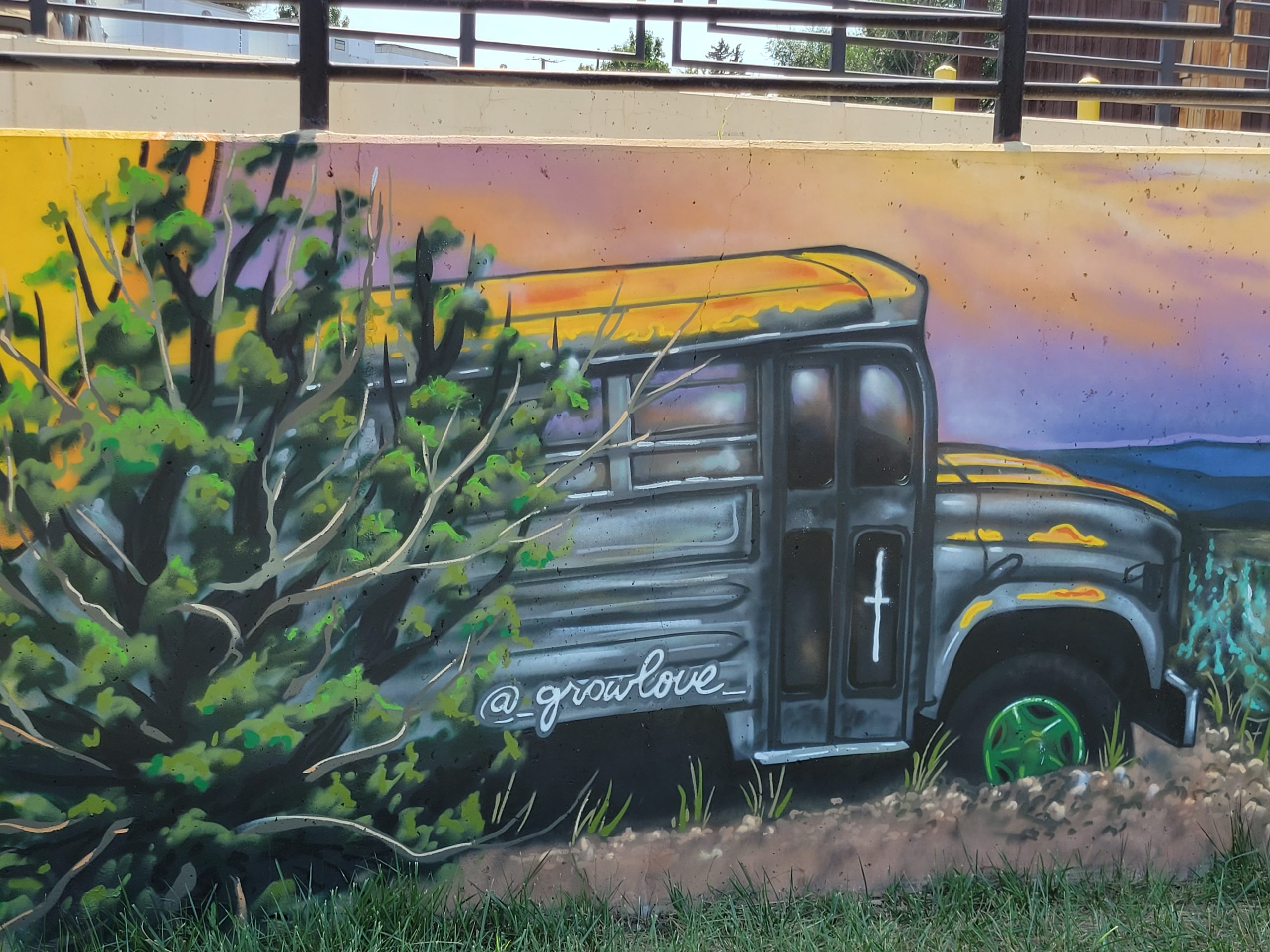 This cheerful typographical street mural adds a playful, navigational touch to a concrete pedestrian and cycling ramp in Denver. Featuring vibrant blue, yellow, and red color blocks, the retro-style lettering points the way to local neighborhoods with fun phrases like "I'm Going Back To, Back To Cap Hill" and "Forget All Your Cares, Go Downtown."