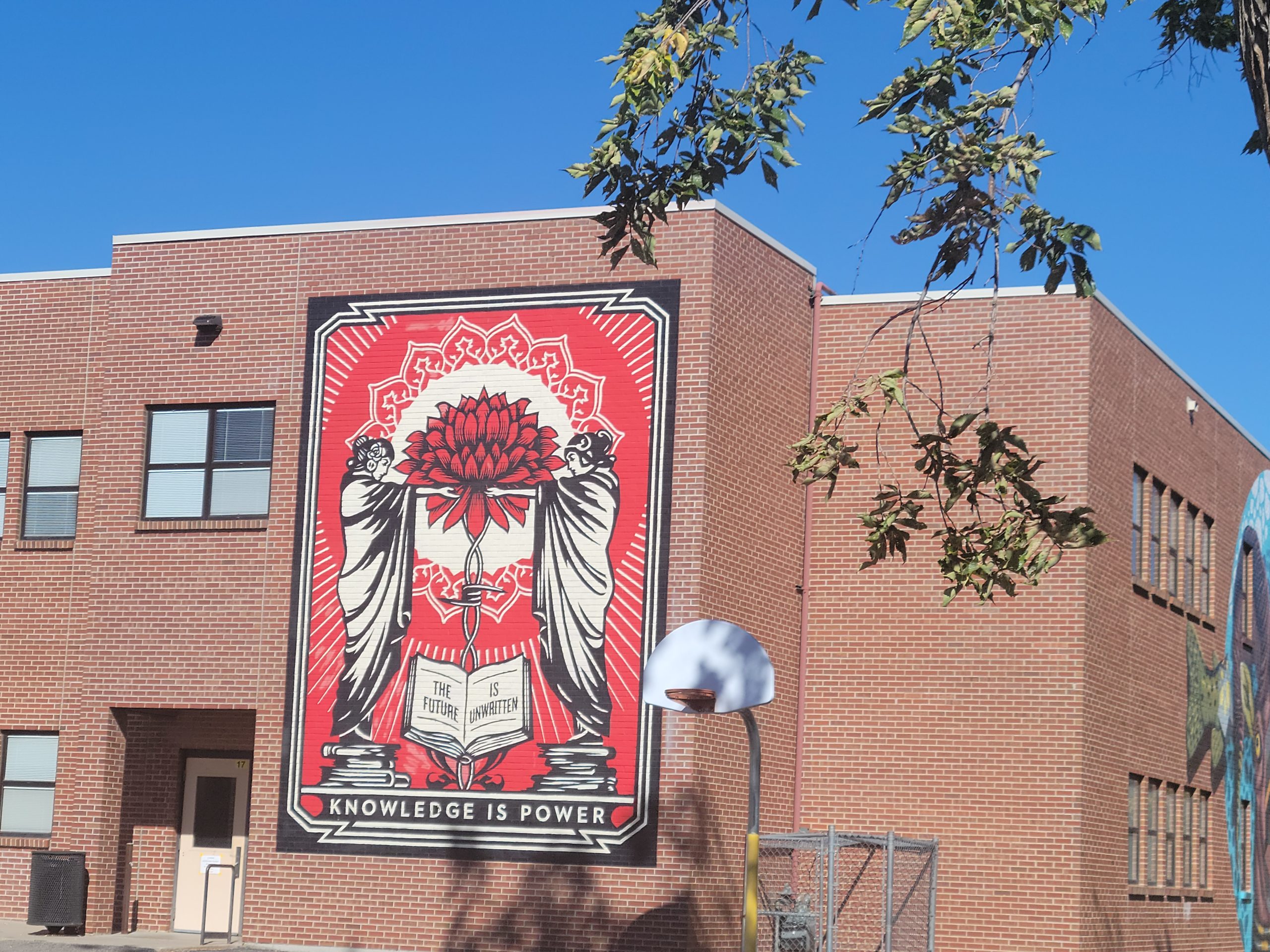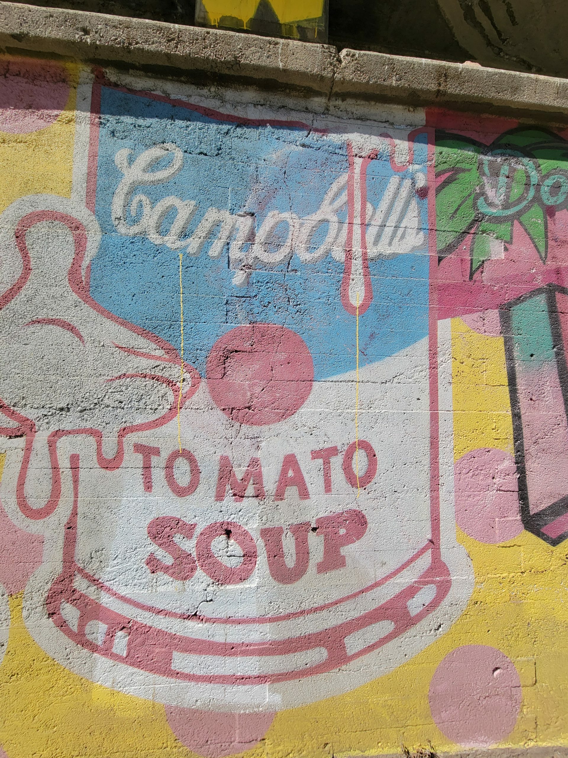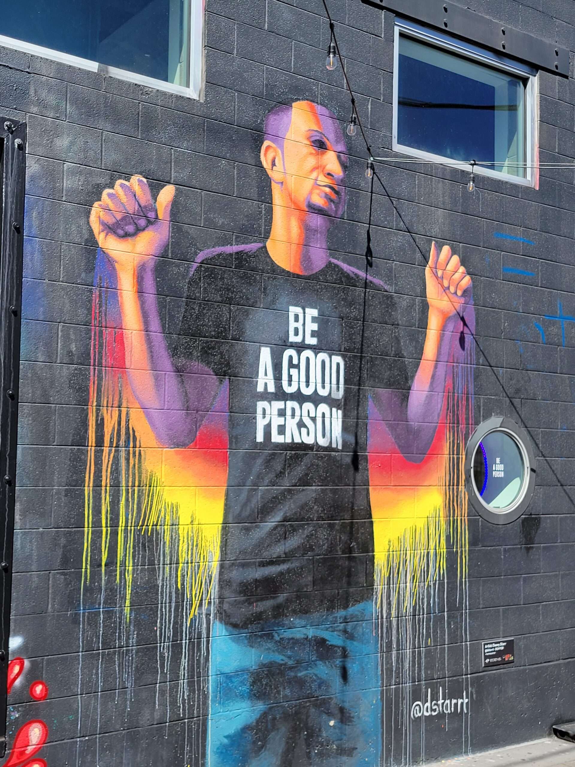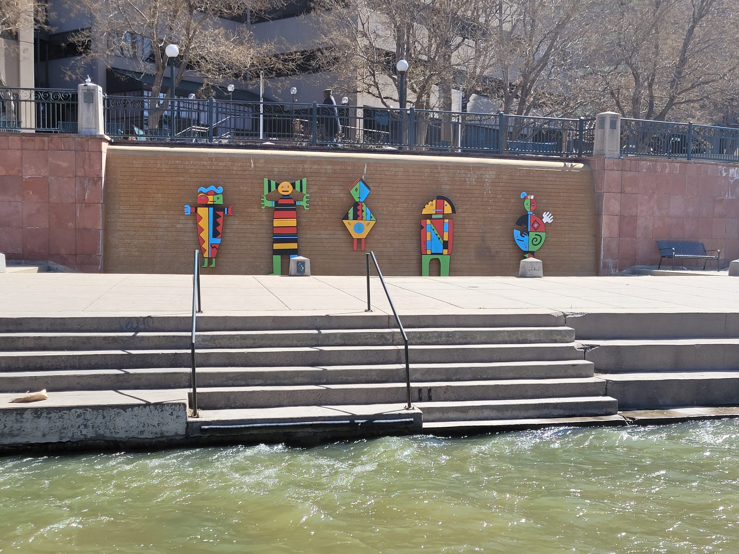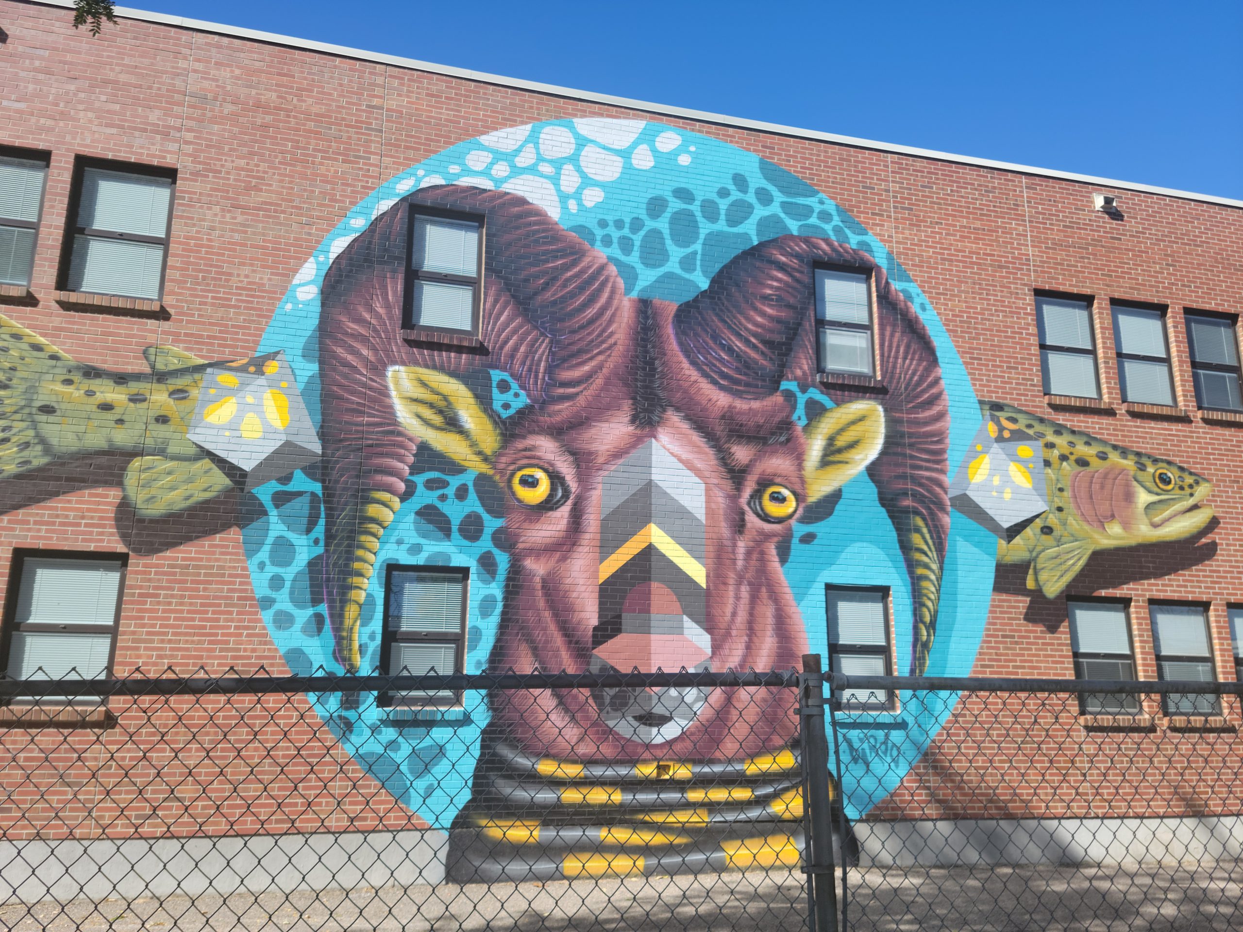 This cheerful typographical street mural adds a playful, navigational touch to a concrete pedestrian and cycling ramp in Denver. Featuring vibrant blue, yellow, and red color blocks, the retro-style lettering points the way to local neighborhoods with fun phrases like "I'm Going Back To, Back To Cap Hill" and "Forget All Your Cares, Go Downtown."