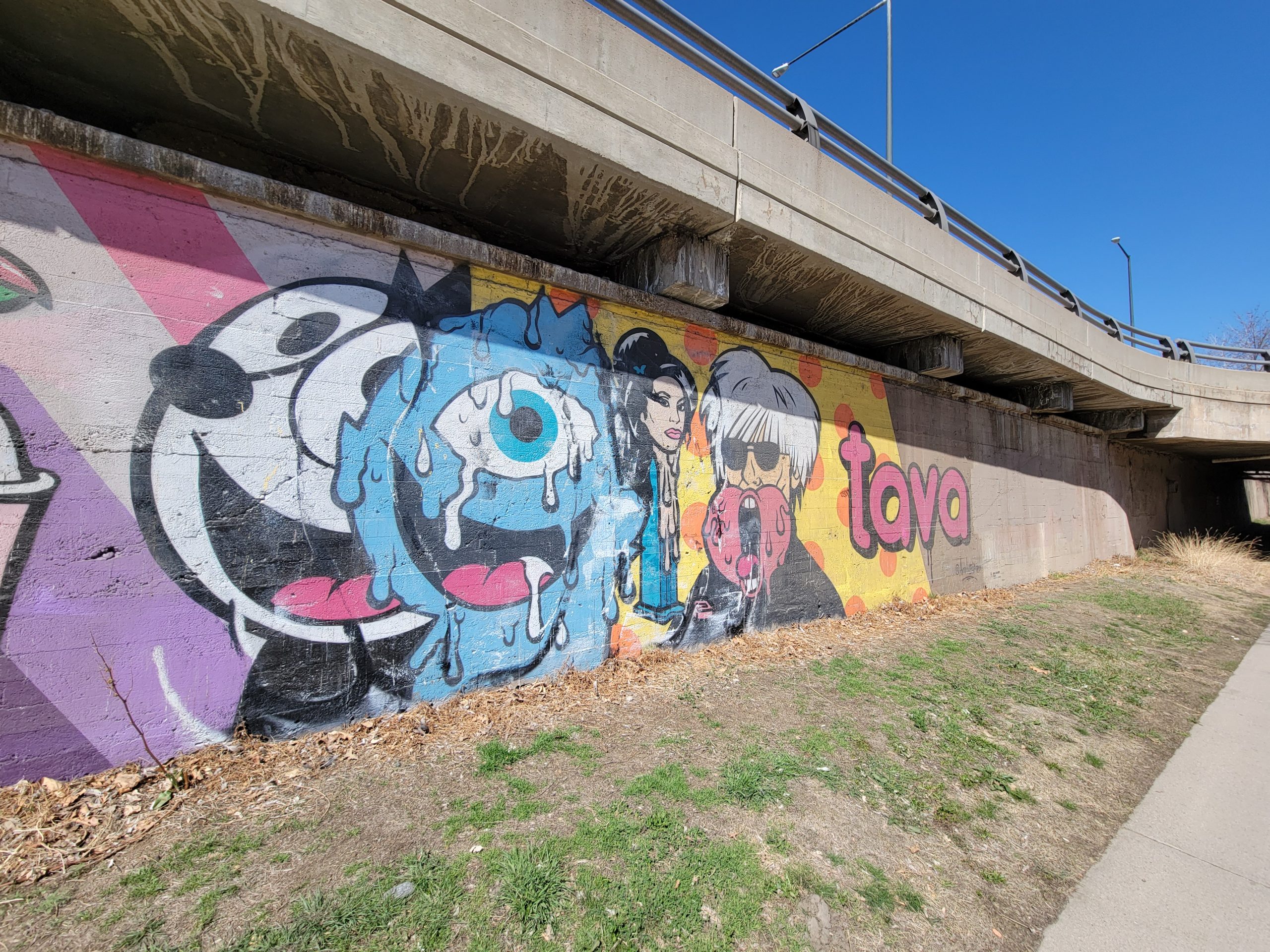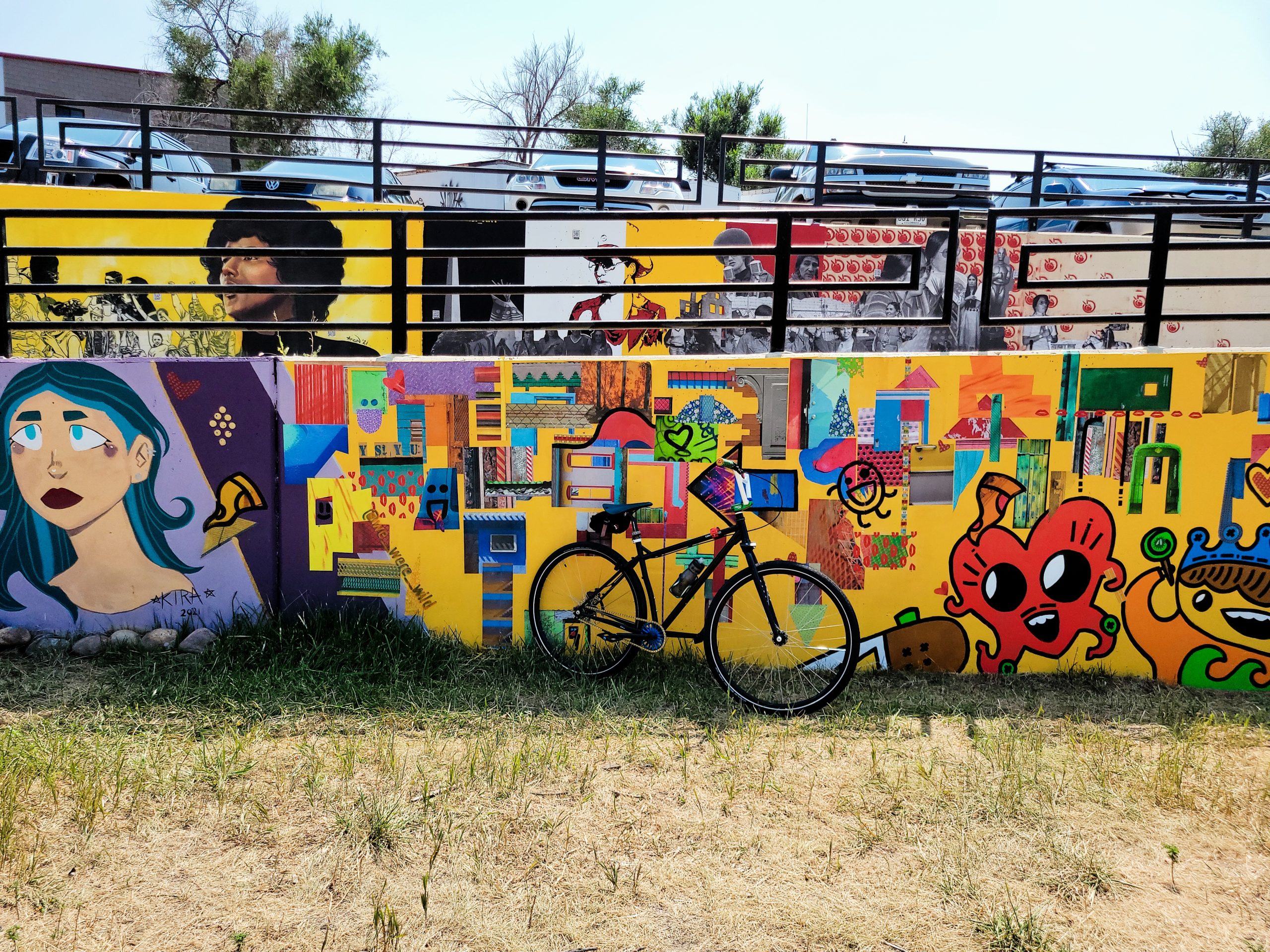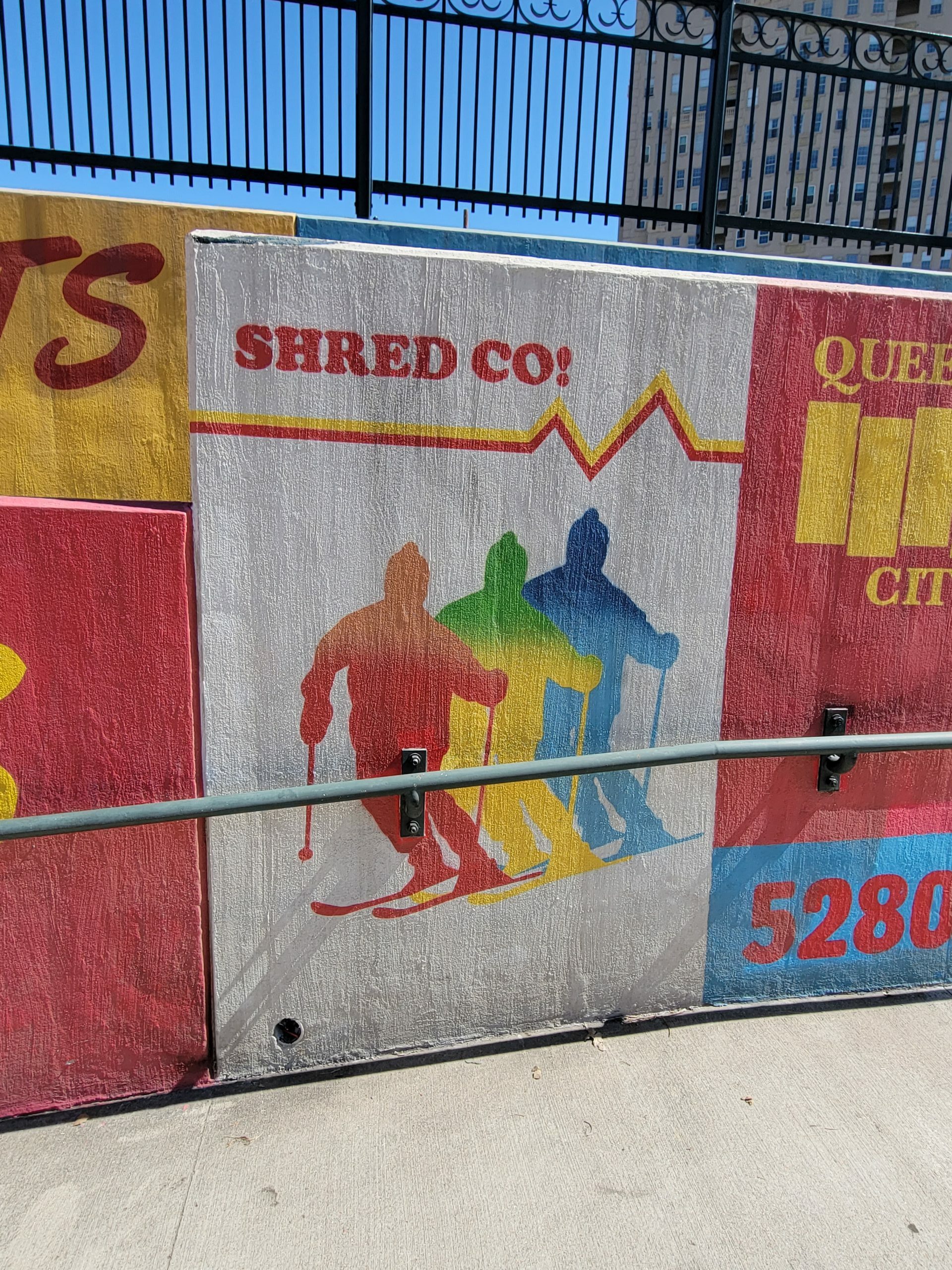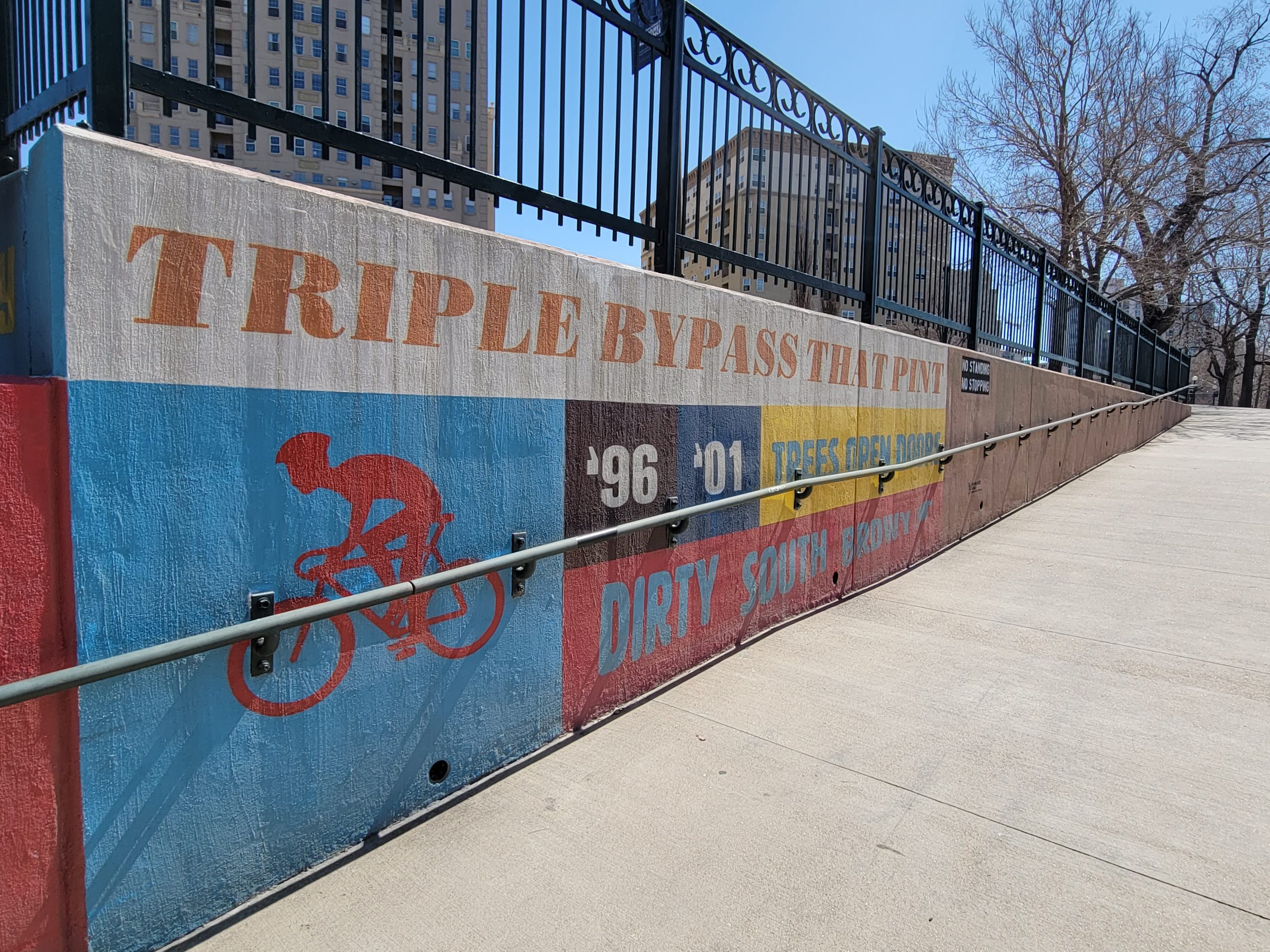 This colorful piece of Denver street art runs alongside a popular urban pedestrian ramp, featuring bold painted text and the red silhouette of a bicyclist. The mural playfully references the famous "Triple Bypass" Colorado cycling event while utilizing bright color-blocking in blue, red, and yellow on the concrete retaining wall. It serves as an engaging visual landmark for locals and tourists navigating the city's extensive downtown trail system.
