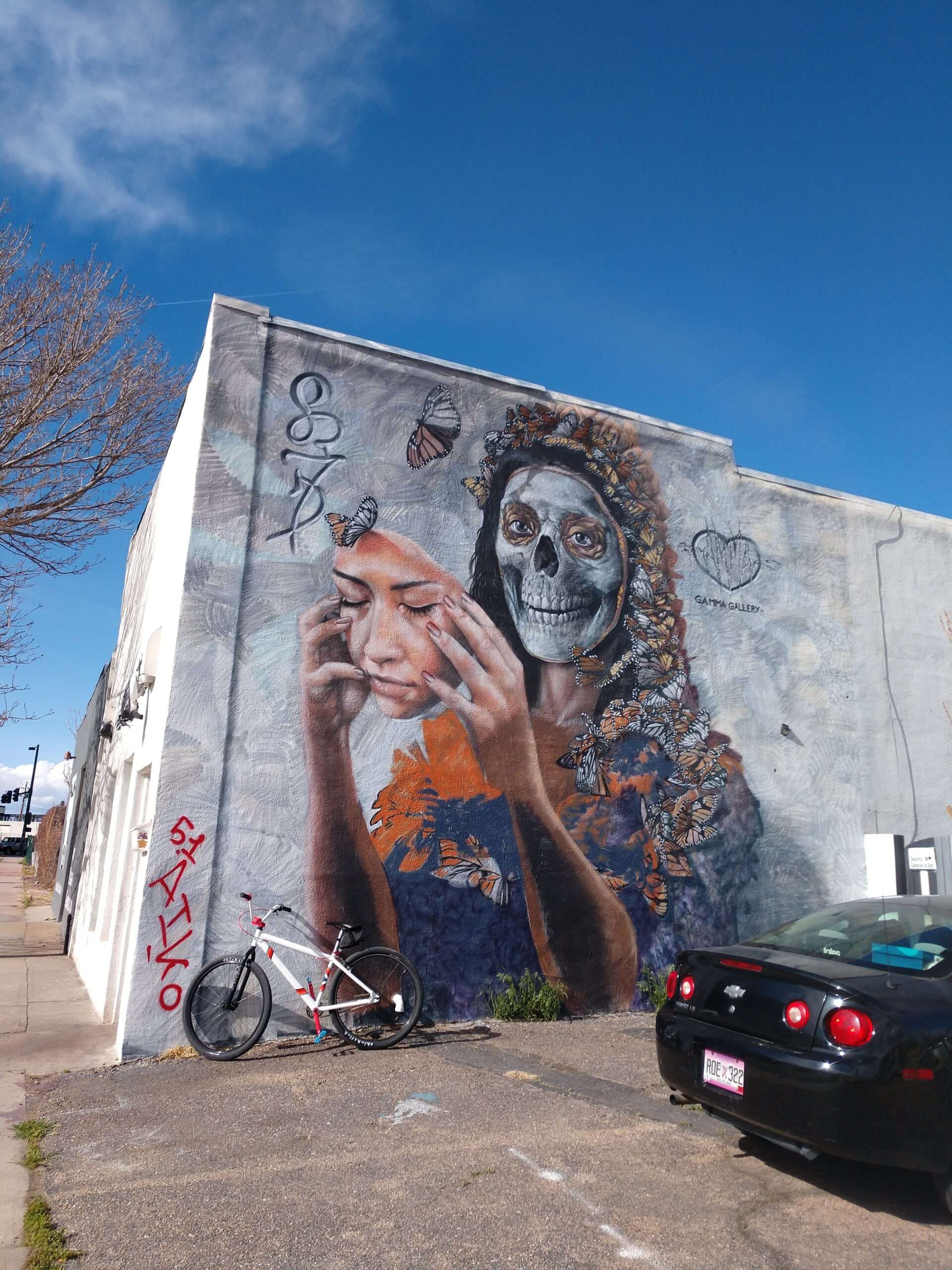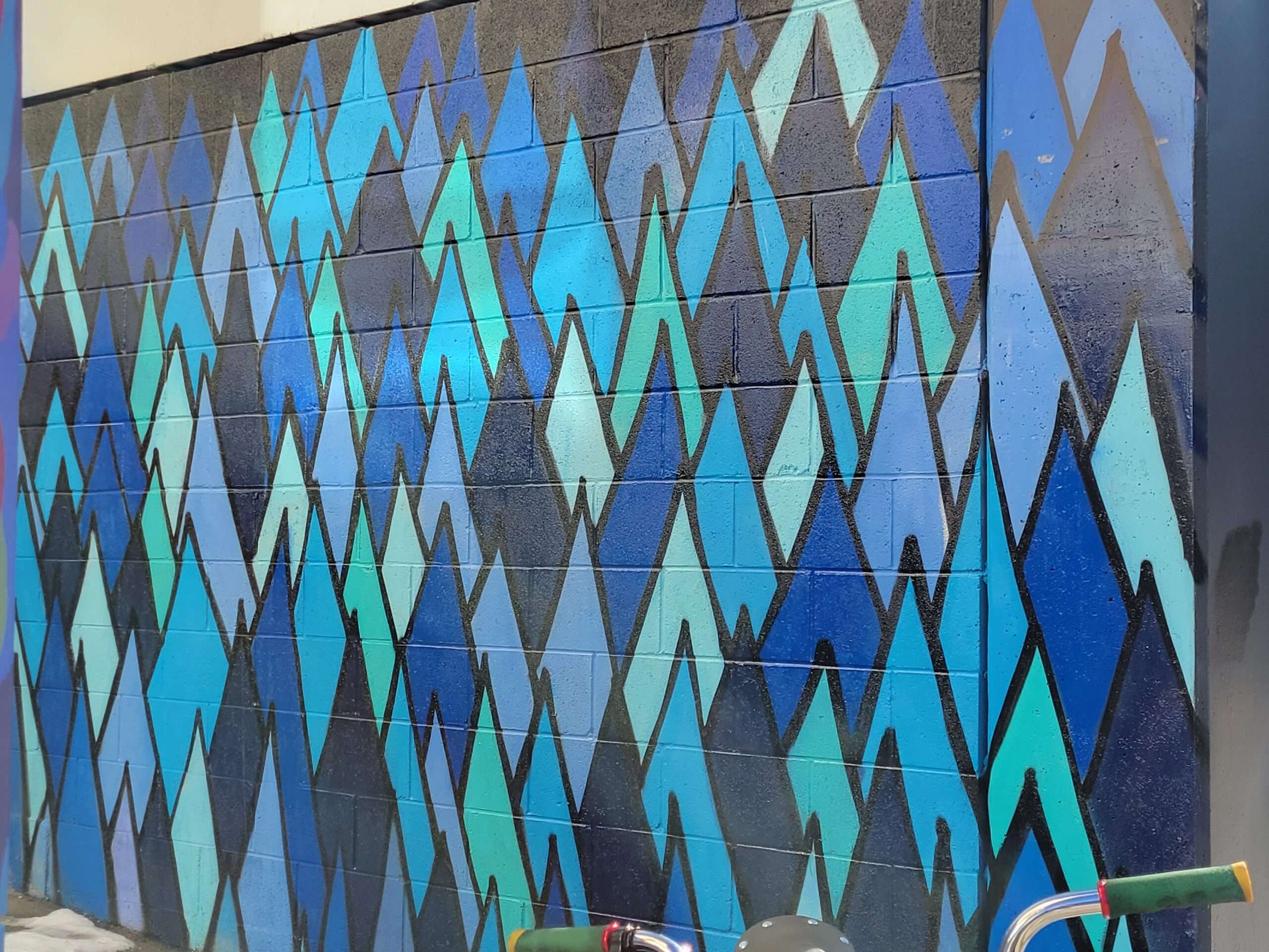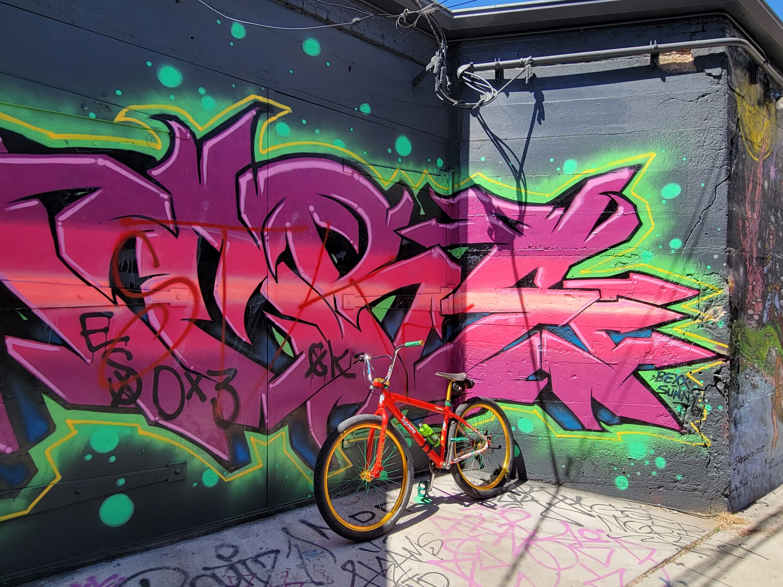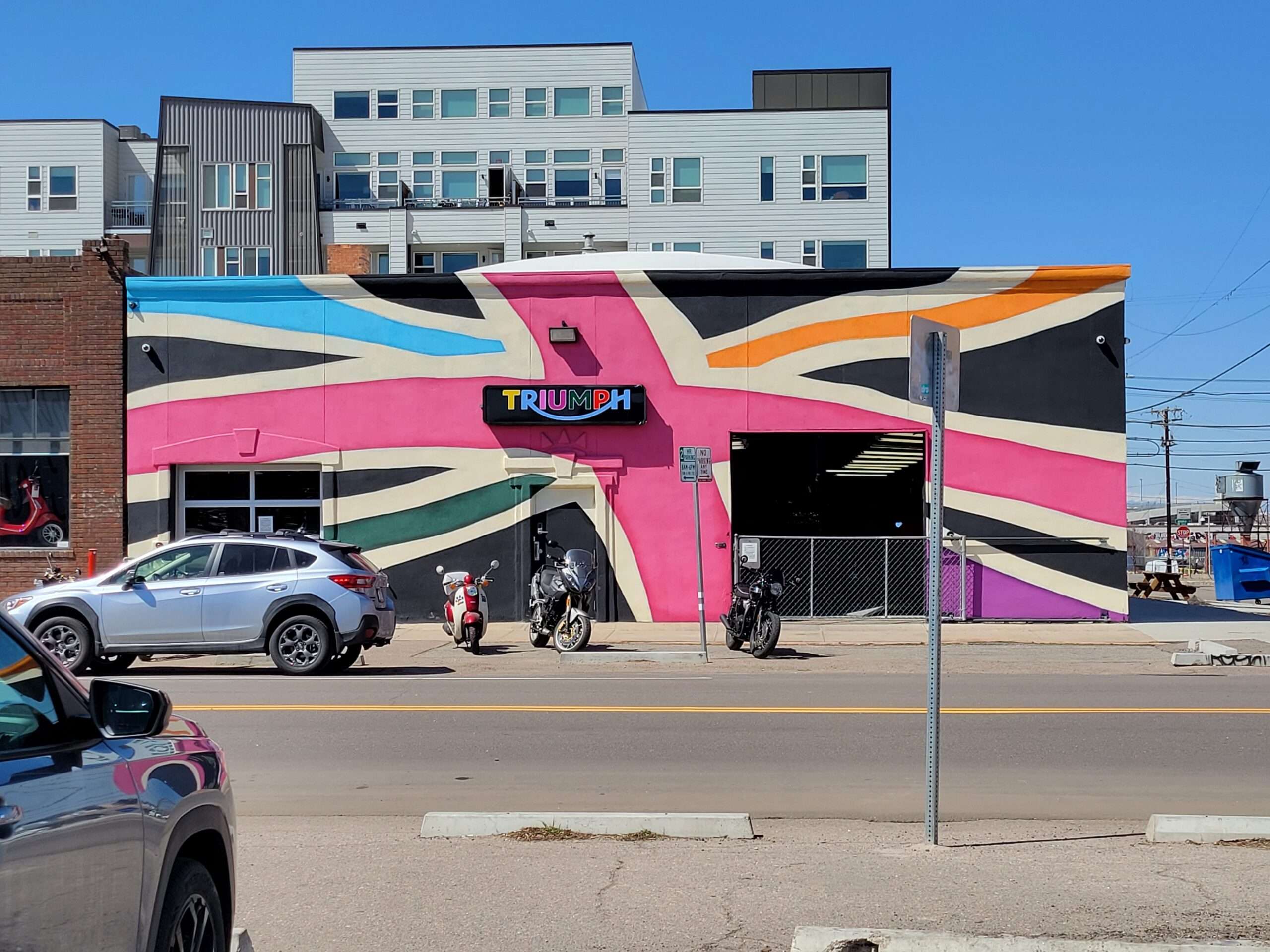 This colorful piece of Denver street art runs alongside a popular urban pedestrian ramp, featuring bold painted text and the red silhouette of a bicyclist. The mural playfully references the famous "Triple Bypass" Colorado cycling event while utilizing bright color-blocking in blue, red, and yellow on the concrete retaining wall. It serves as an engaging visual landmark for locals and tourists navigating the city's extensive downtown trail system.