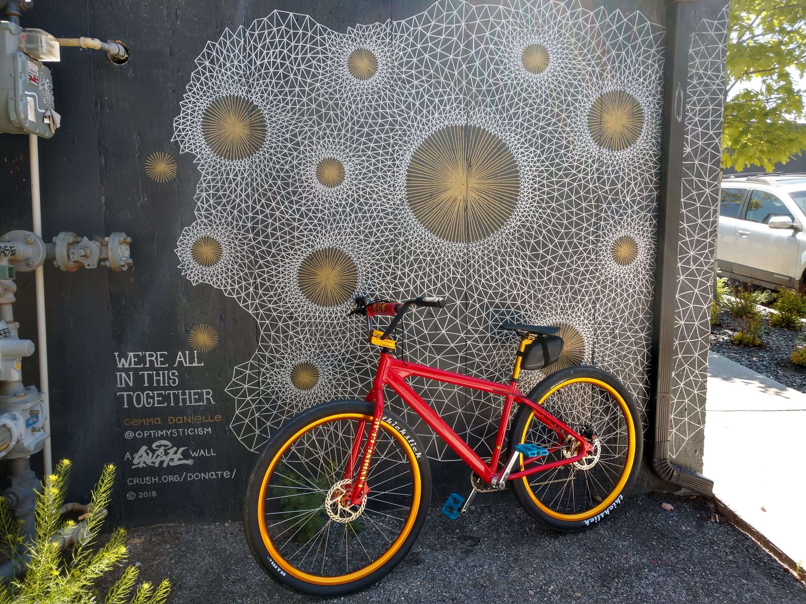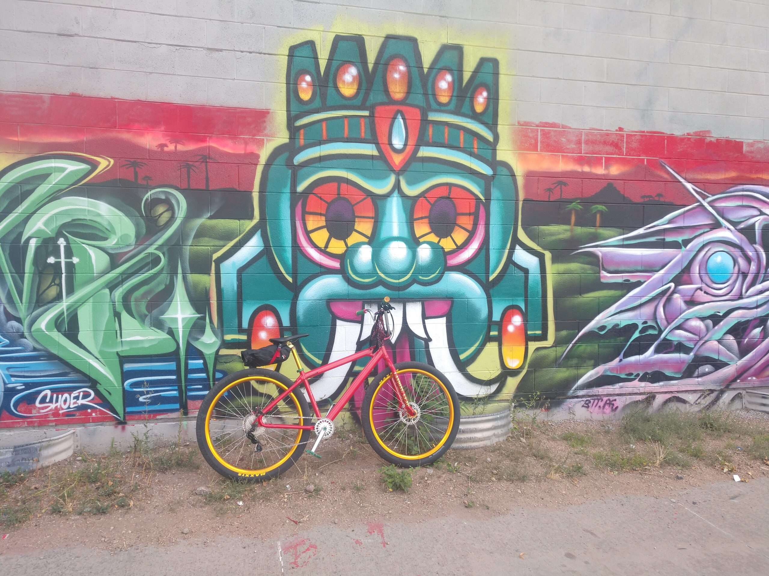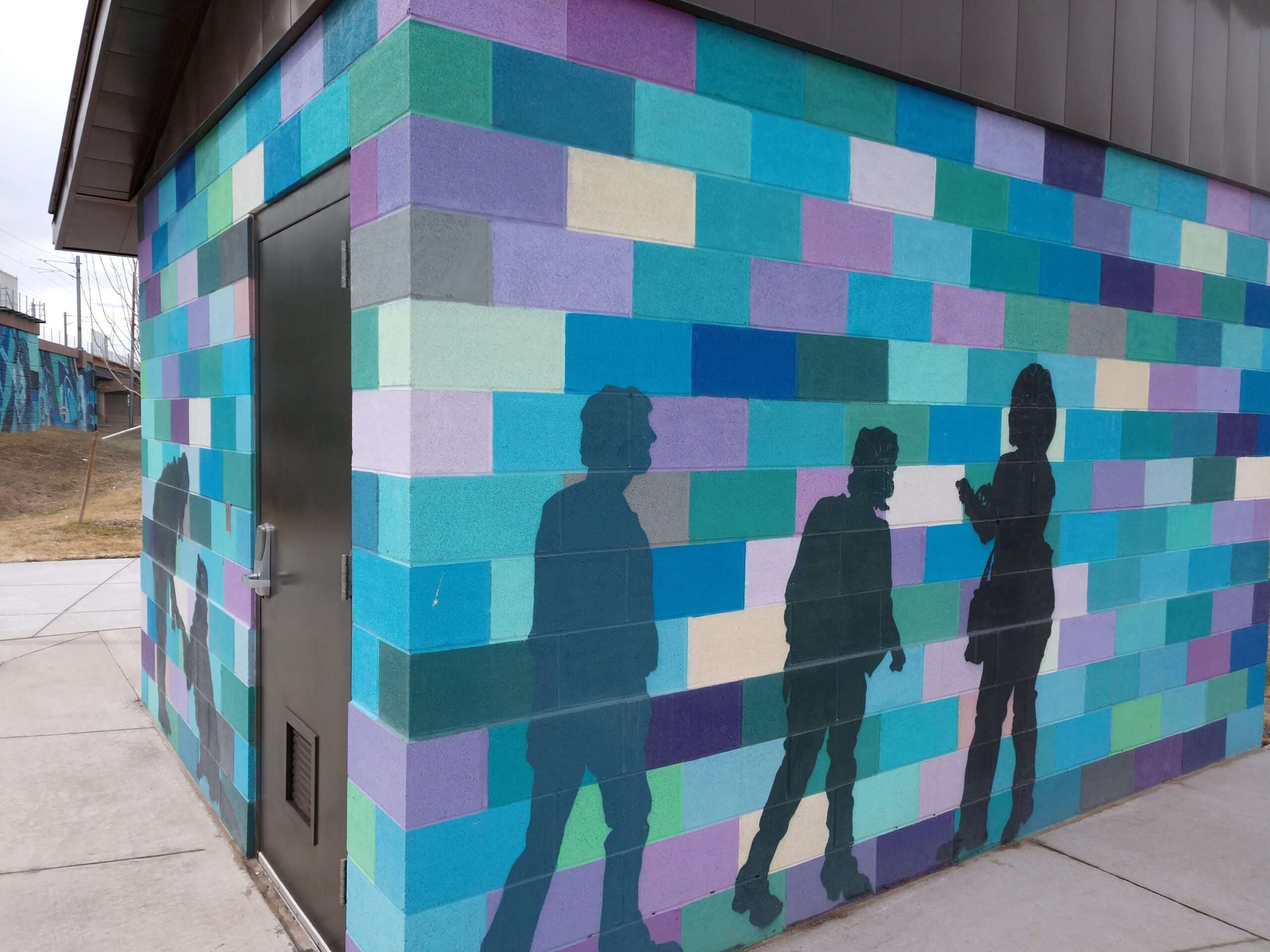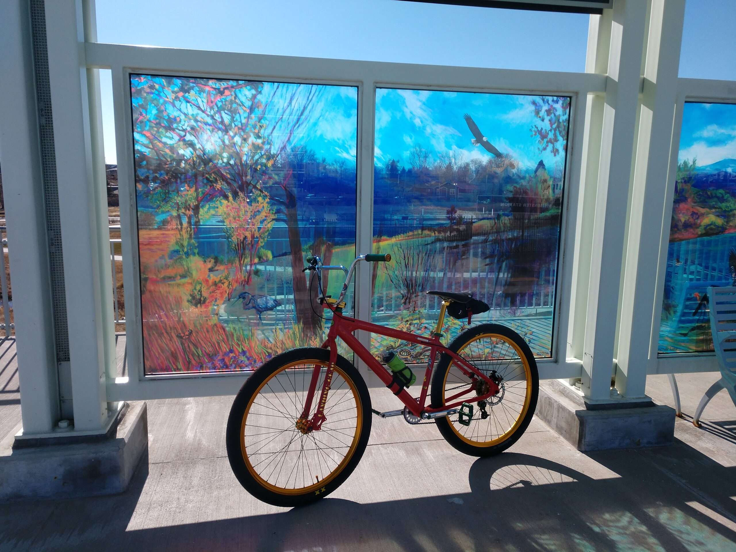 This colorful piece of Denver street art runs alongside a popular urban pedestrian ramp, featuring bold painted text and the red silhouette of a bicyclist. The mural playfully references the famous "Triple Bypass" Colorado cycling event while utilizing bright color-blocking in blue, red, and yellow on the concrete retaining wall. It serves as an engaging visual landmark for locals and tourists navigating the city's extensive downtown trail system.