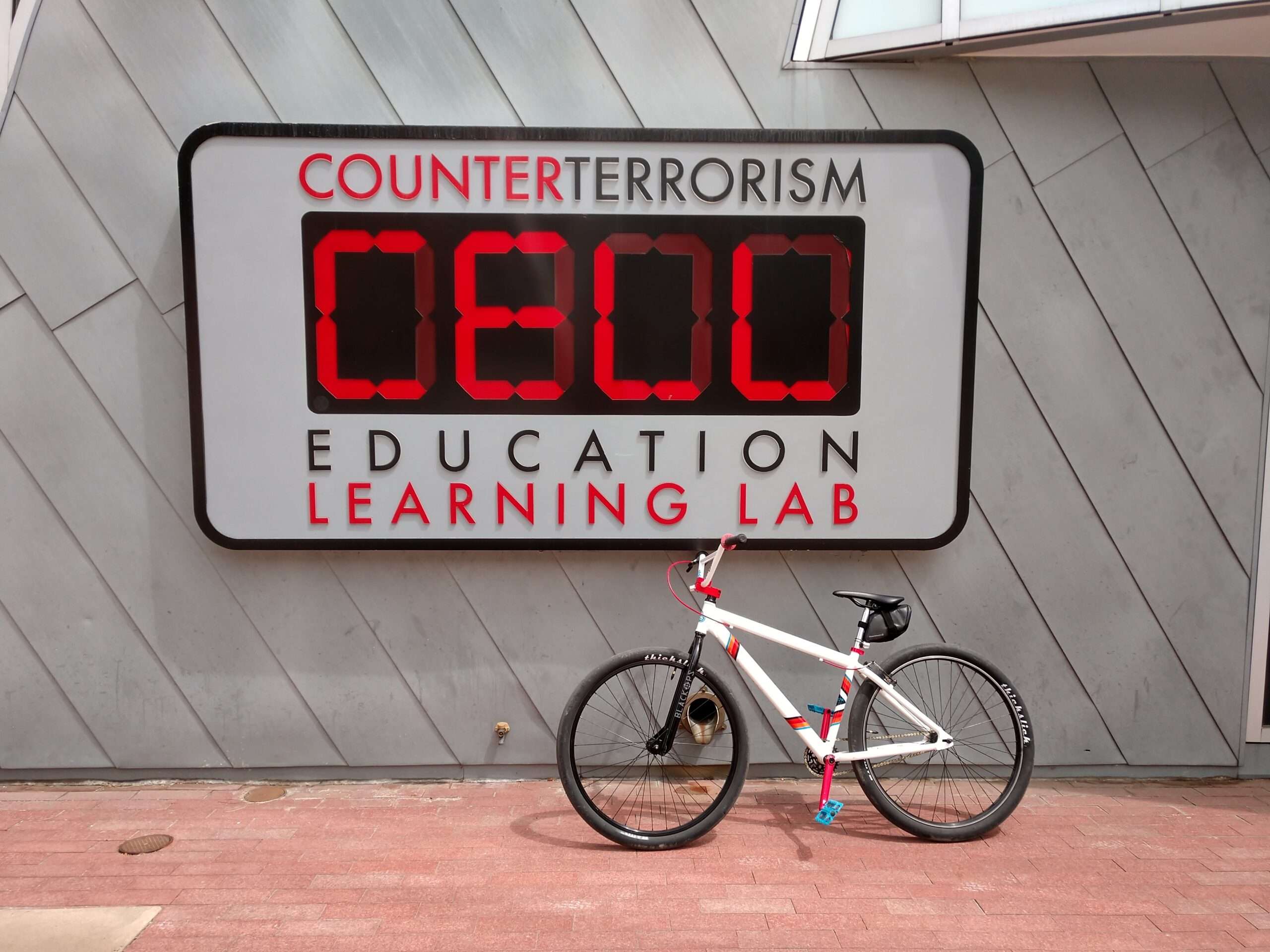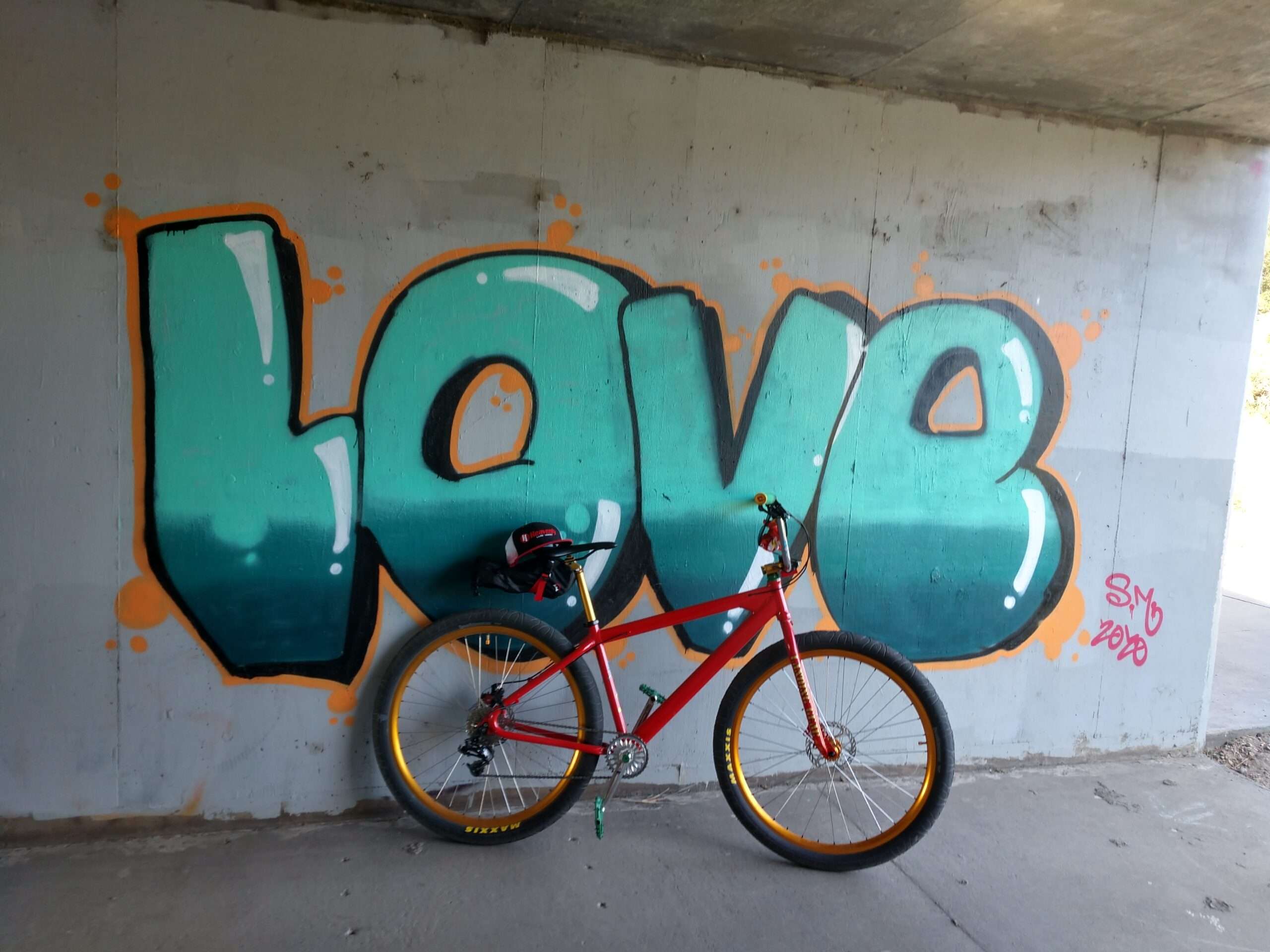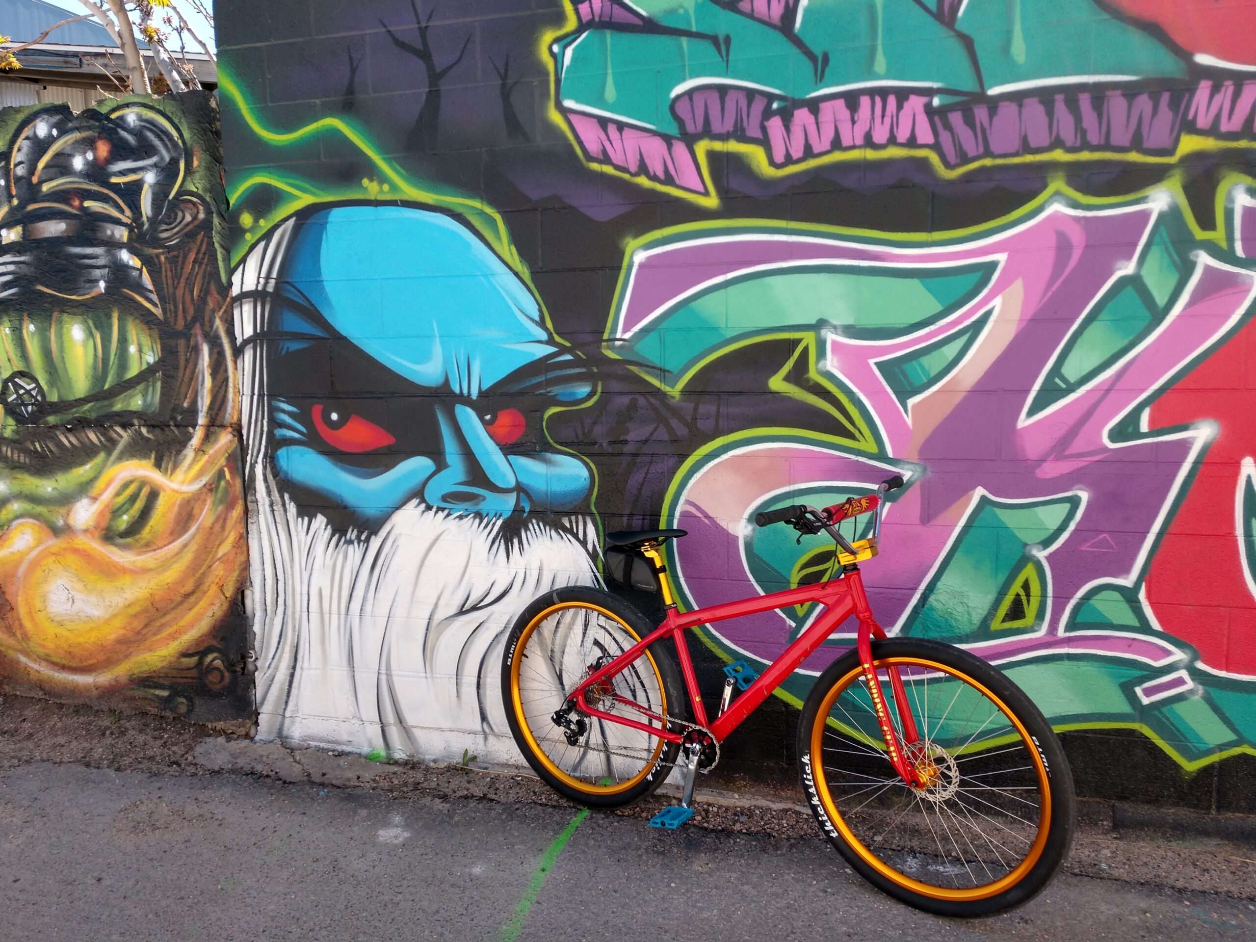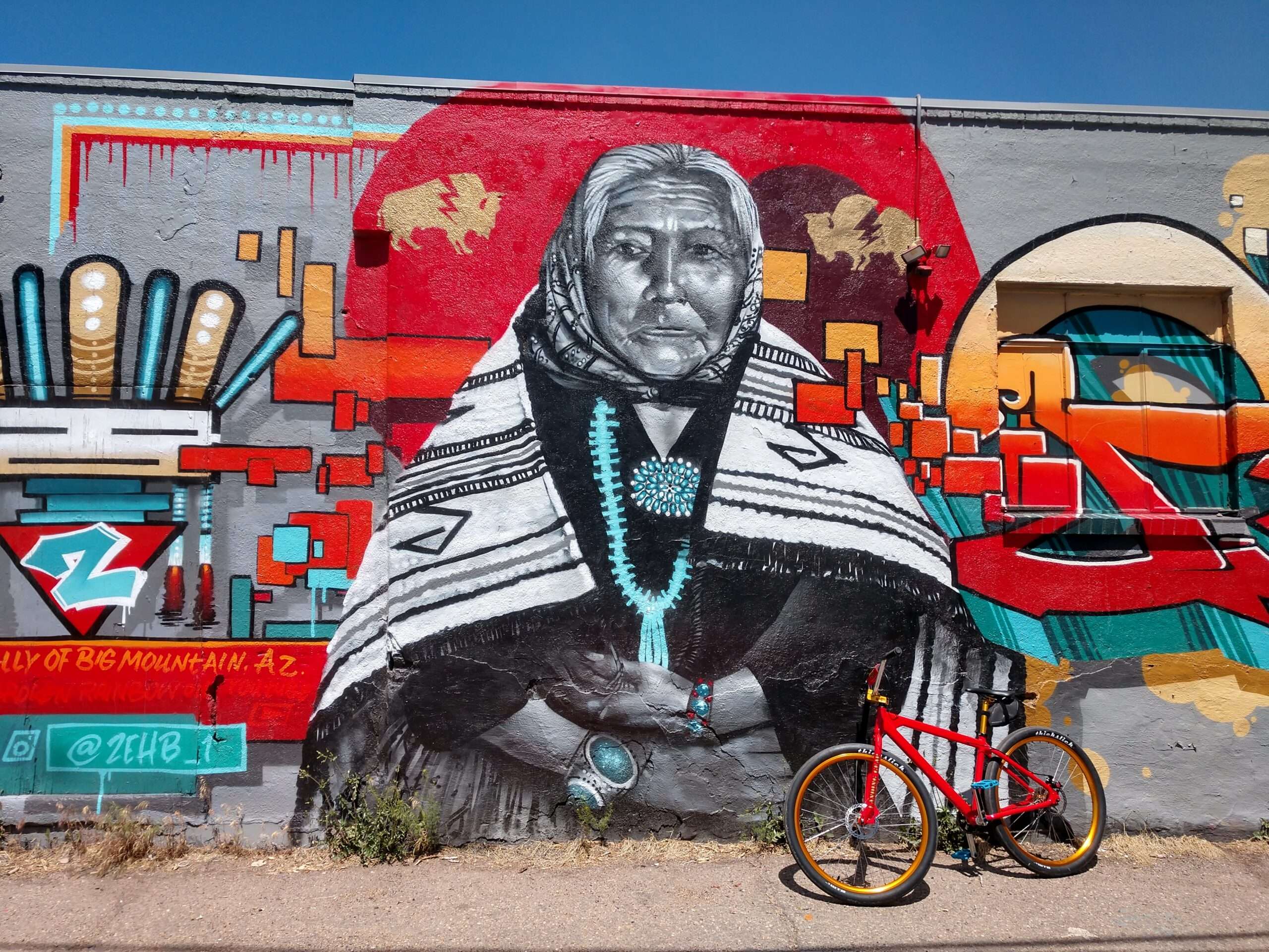 This colorful piece of Denver street art runs alongside a popular urban pedestrian ramp, featuring bold painted text and the red silhouette of a bicyclist. The mural playfully references the famous "Triple Bypass" Colorado cycling event while utilizing bright color-blocking in blue, red, and yellow on the concrete retaining wall. It serves as an engaging visual landmark for locals and tourists navigating the city's extensive downtown trail system.