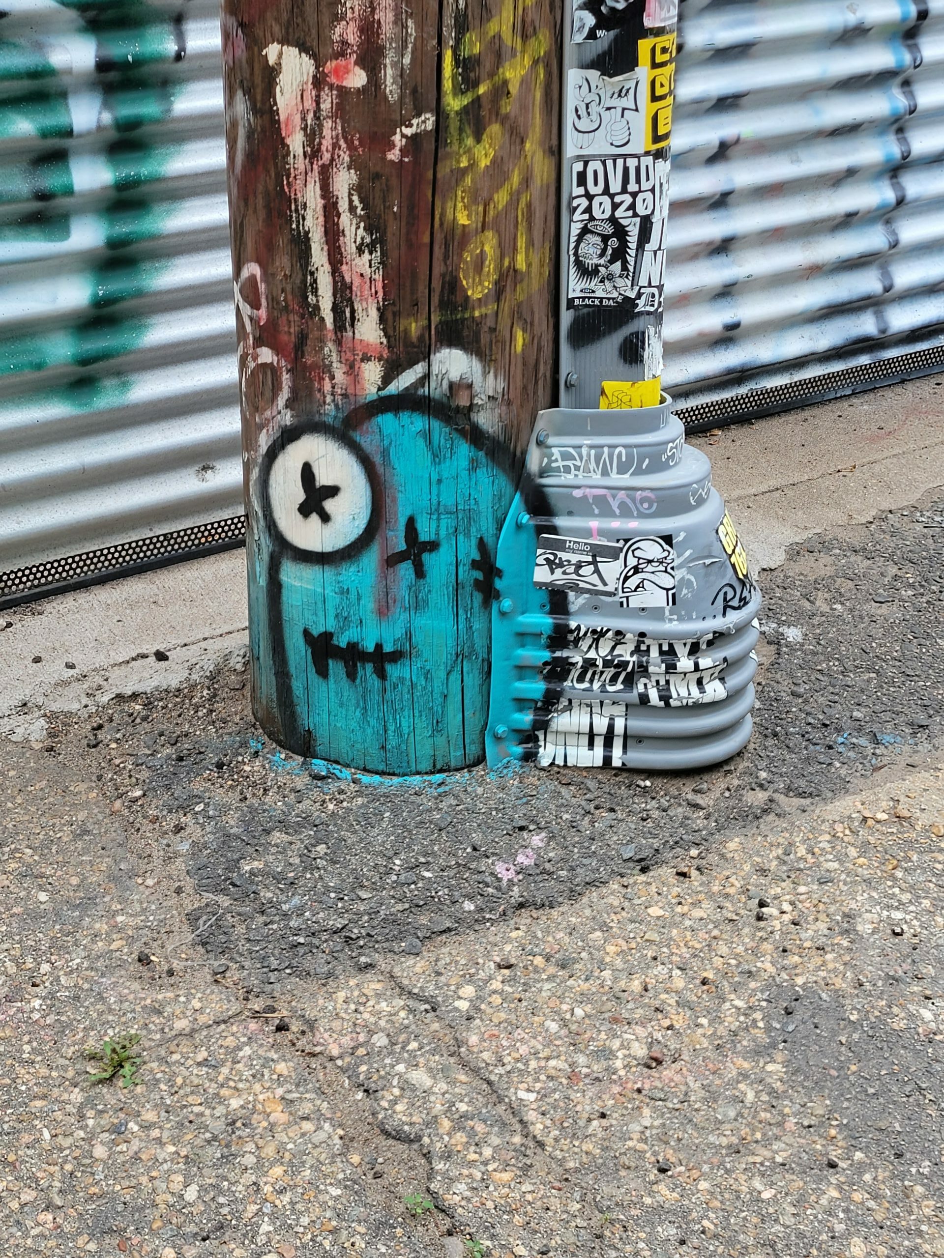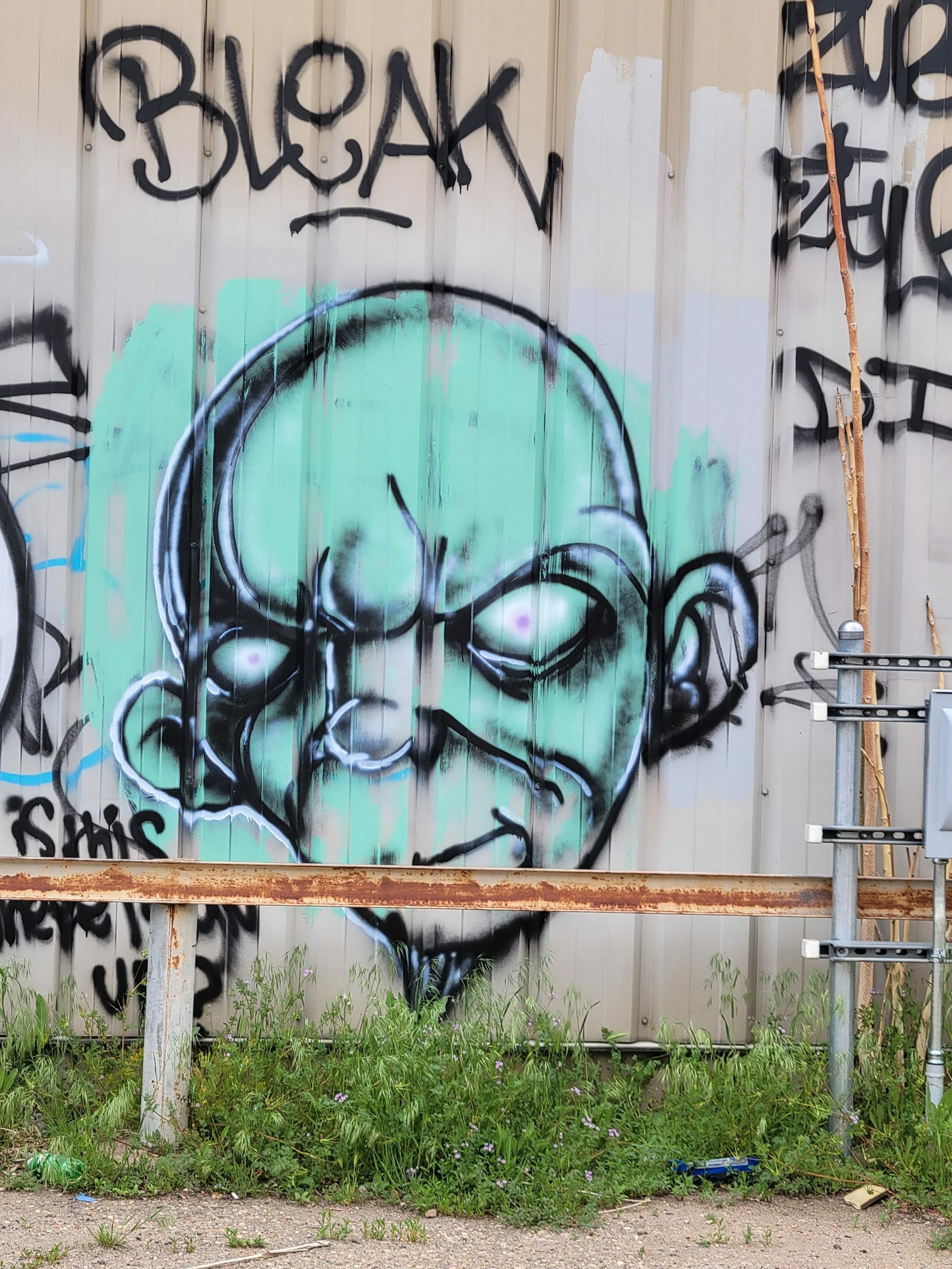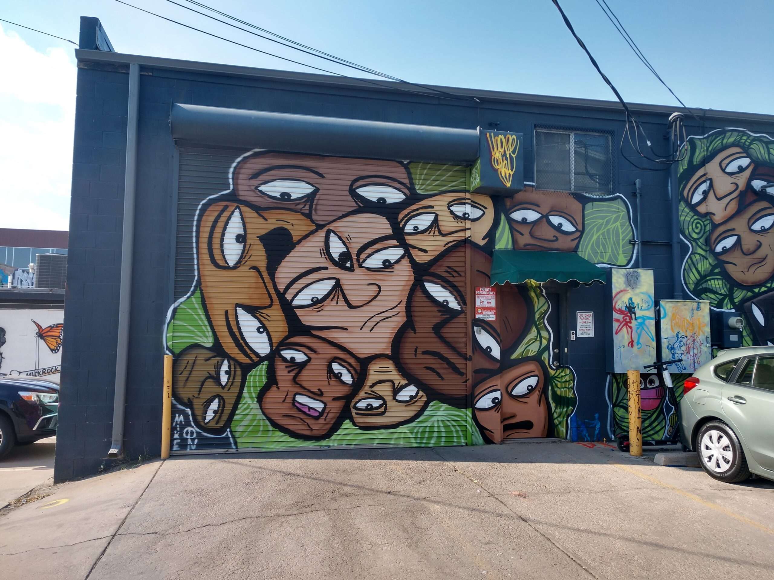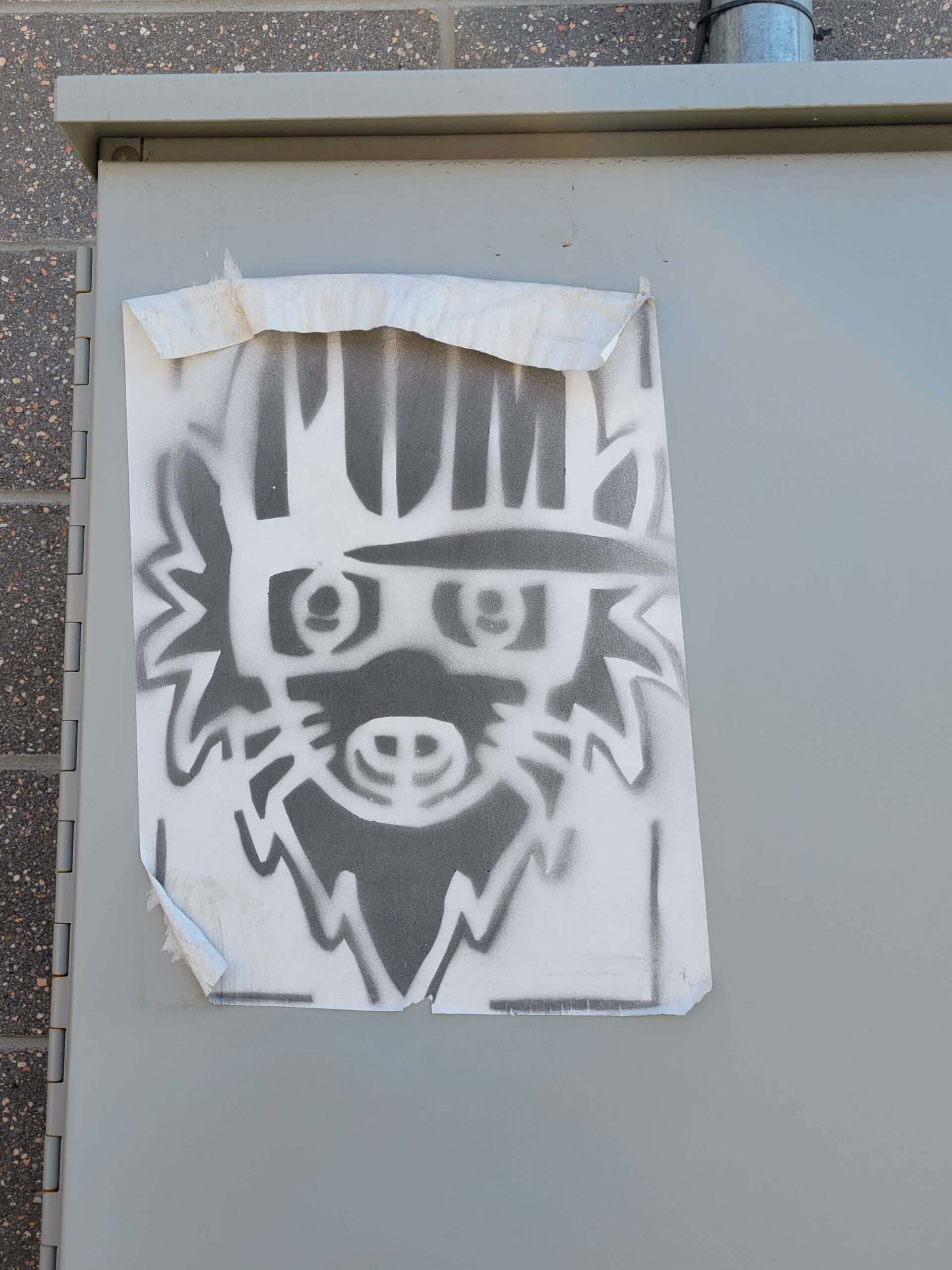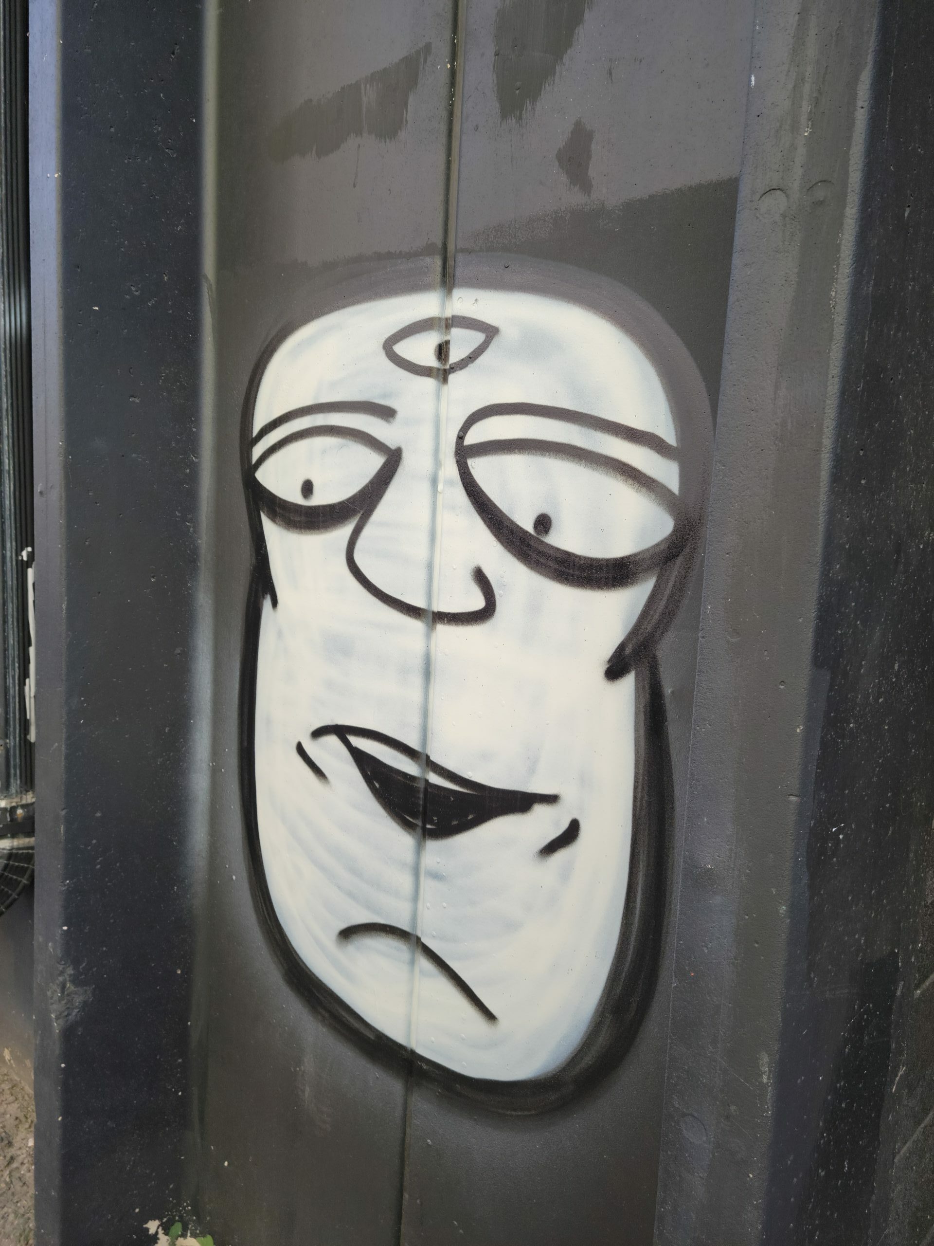 This simplistic but striking piece of street art features a white, abstract face with three eyes painted directly onto a dark grey metal surface in Denver. Rendered with bold black outlines and a subtle, knowing smirk, the enigmatic character transforms an ordinary piece of city infrastructure into a canvas for underground artistic flair.