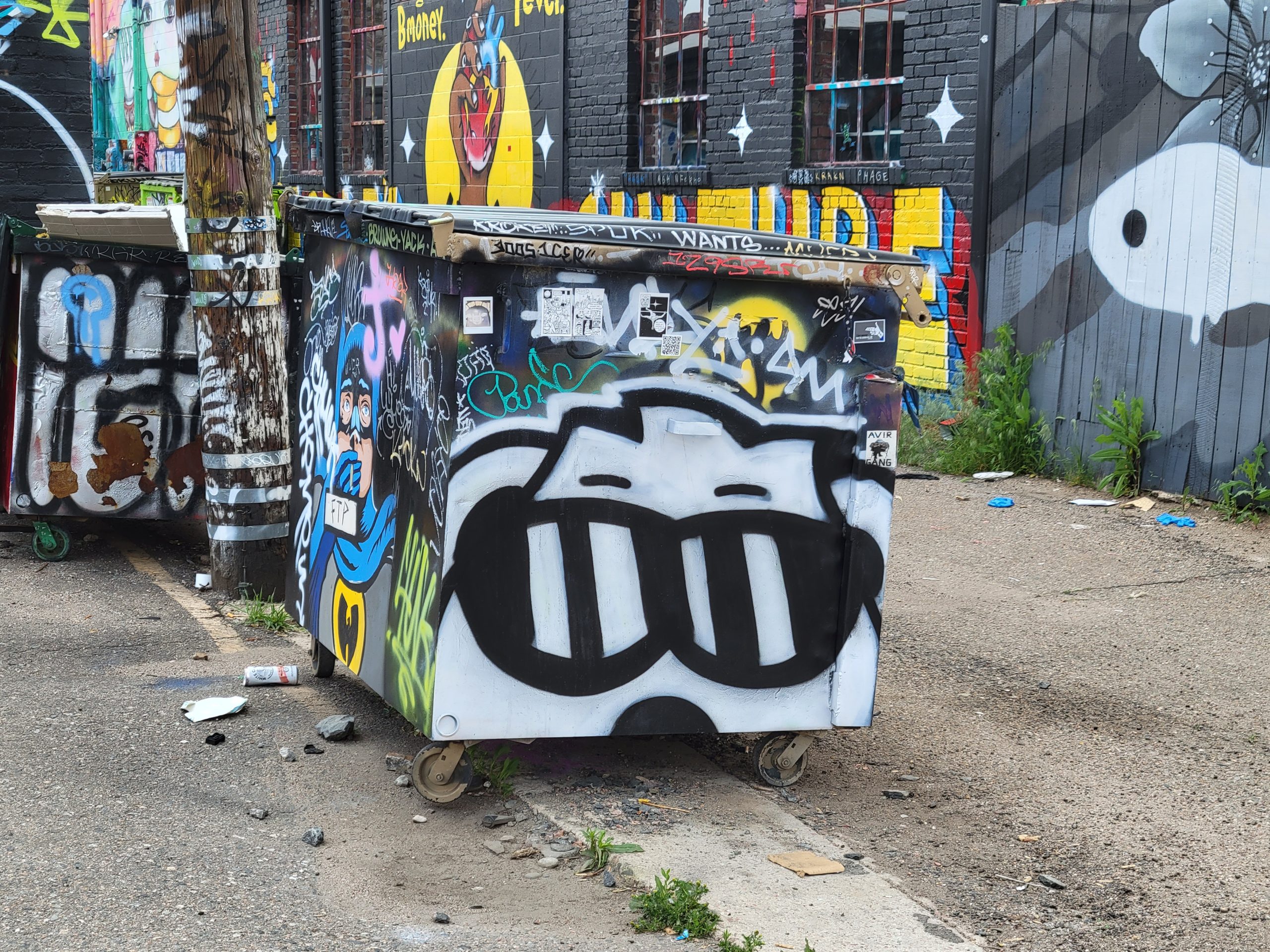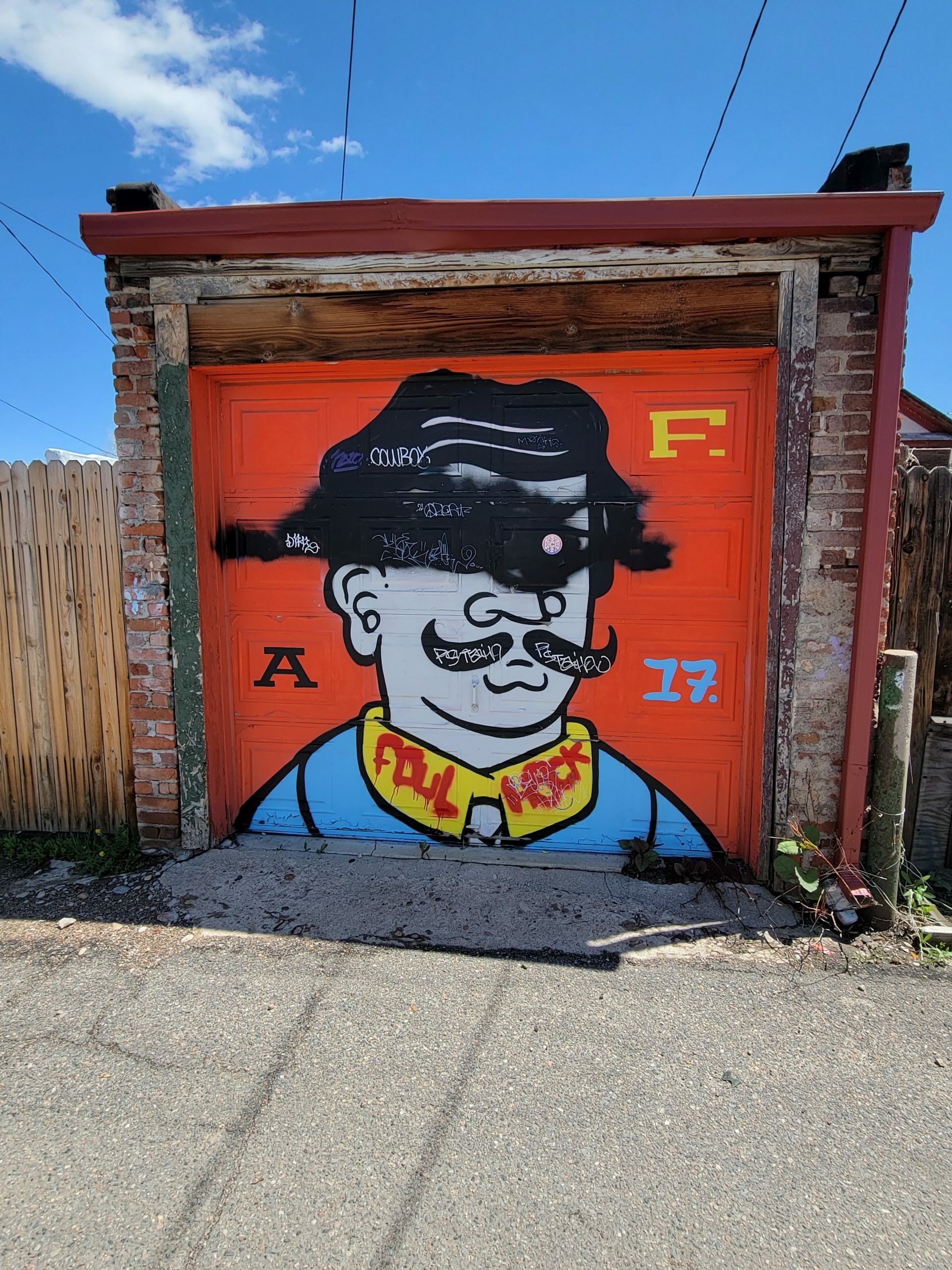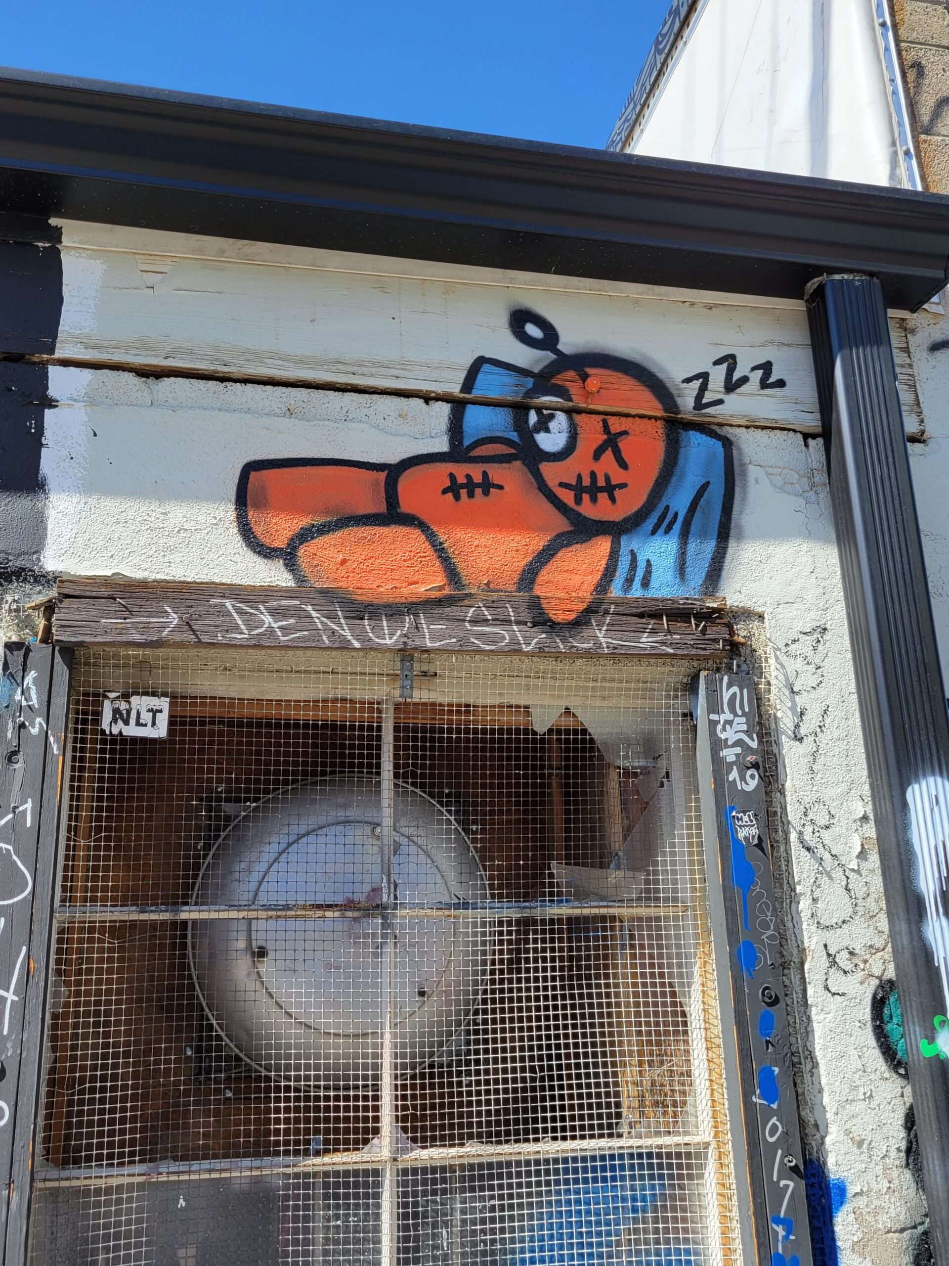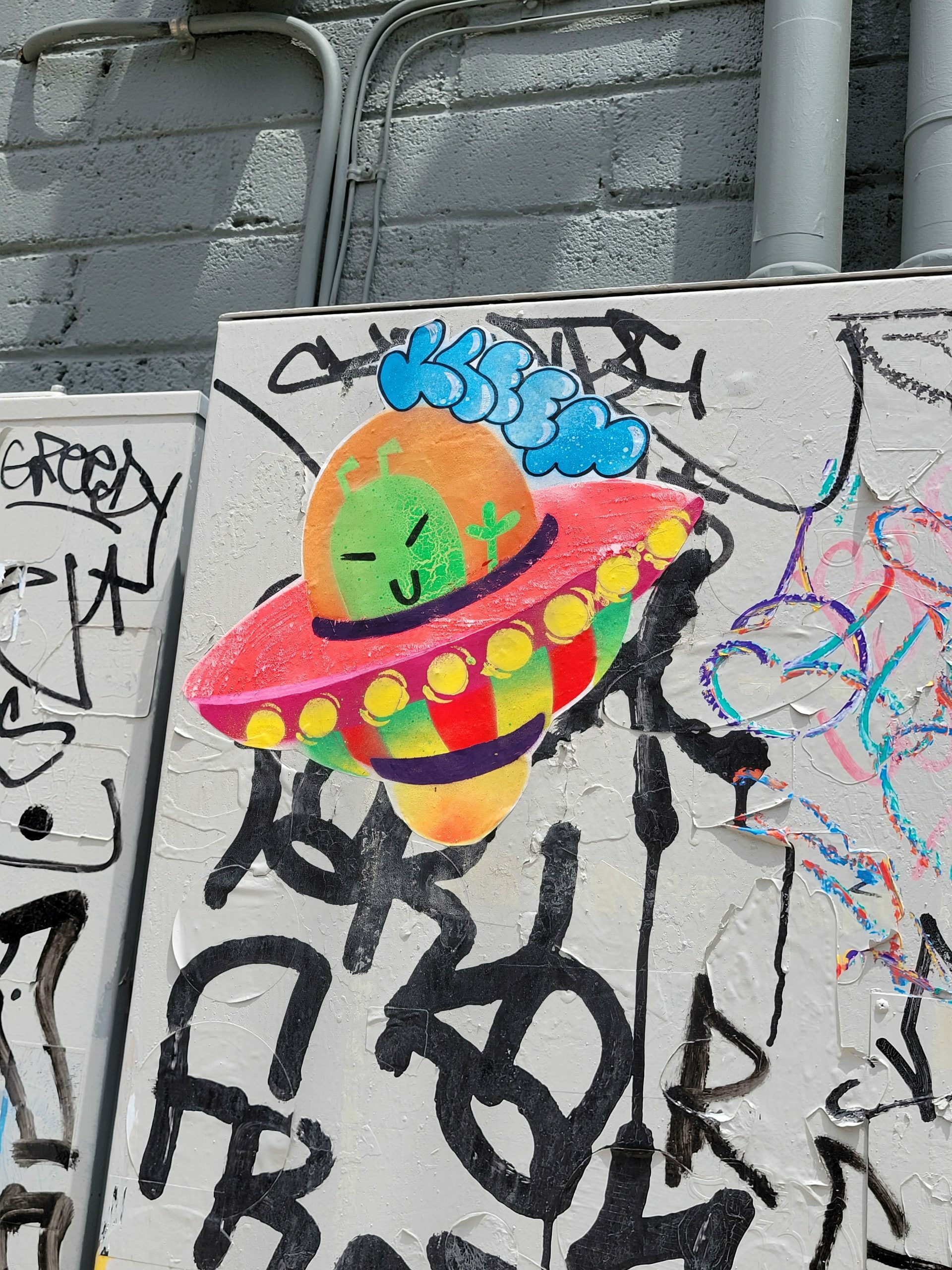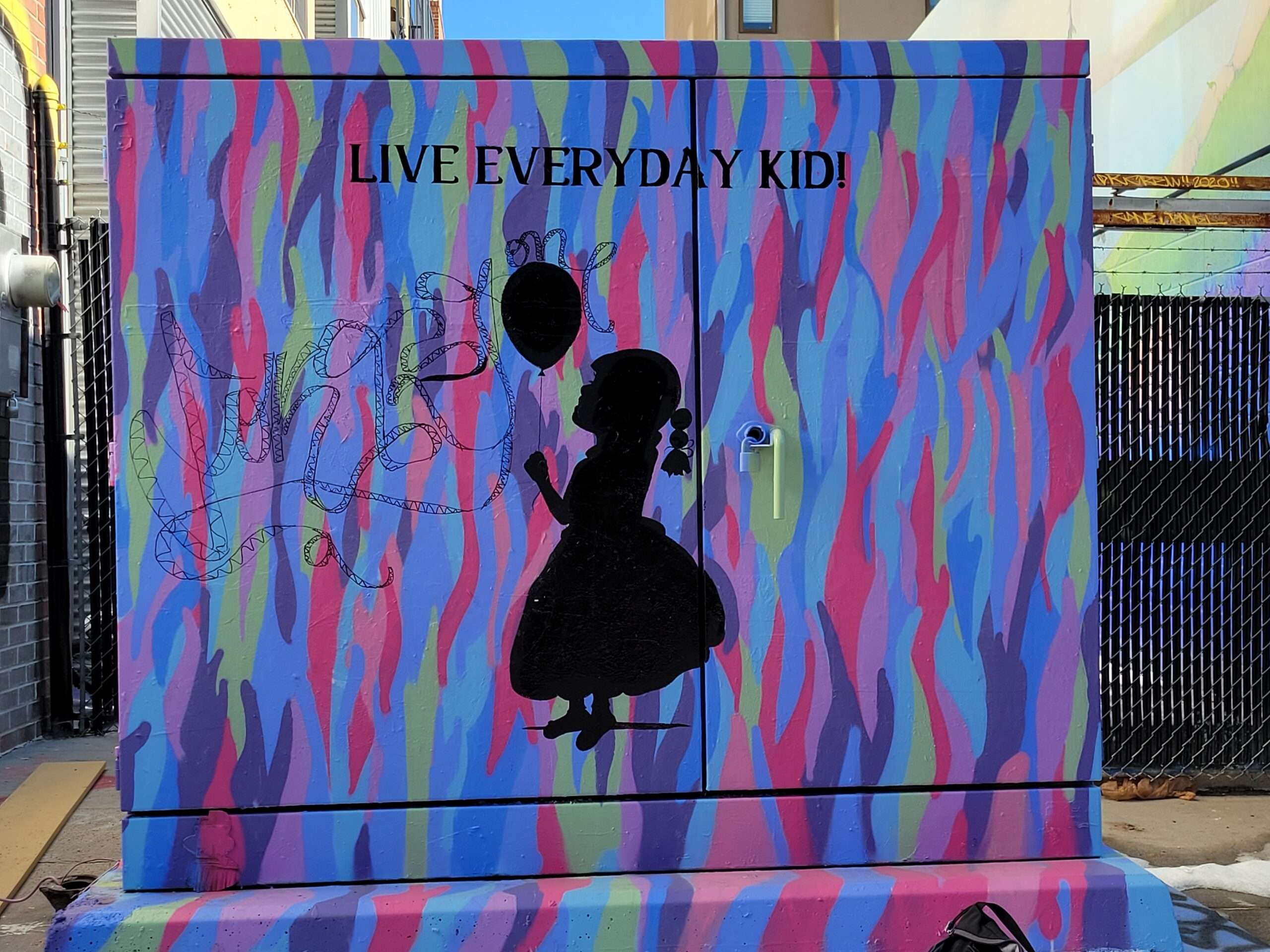This simplistic but striking piece of street art features a white, abstract face with three eyes painted directly onto a dark grey metal surface in Denver. Rendered with bold black outlines and a subtle, knowing smirk, the enigmatic character transforms an ordinary piece of city infrastructure into a canvas for underground artistic flair.