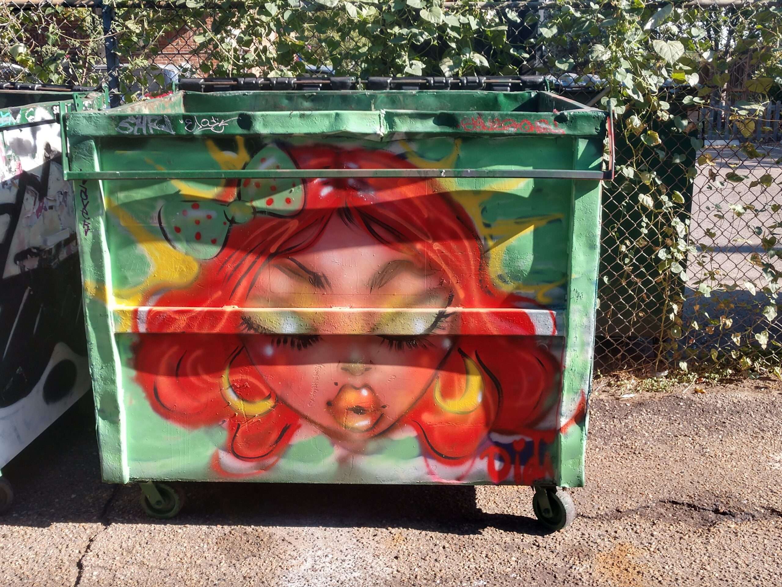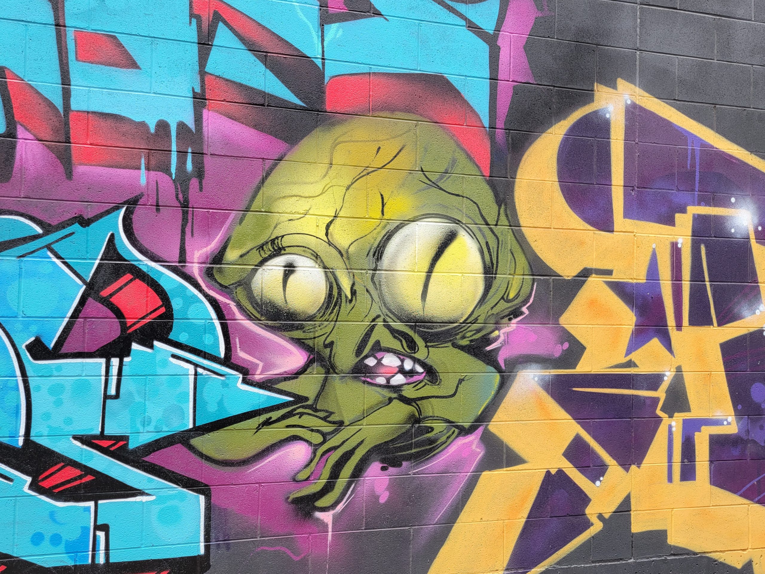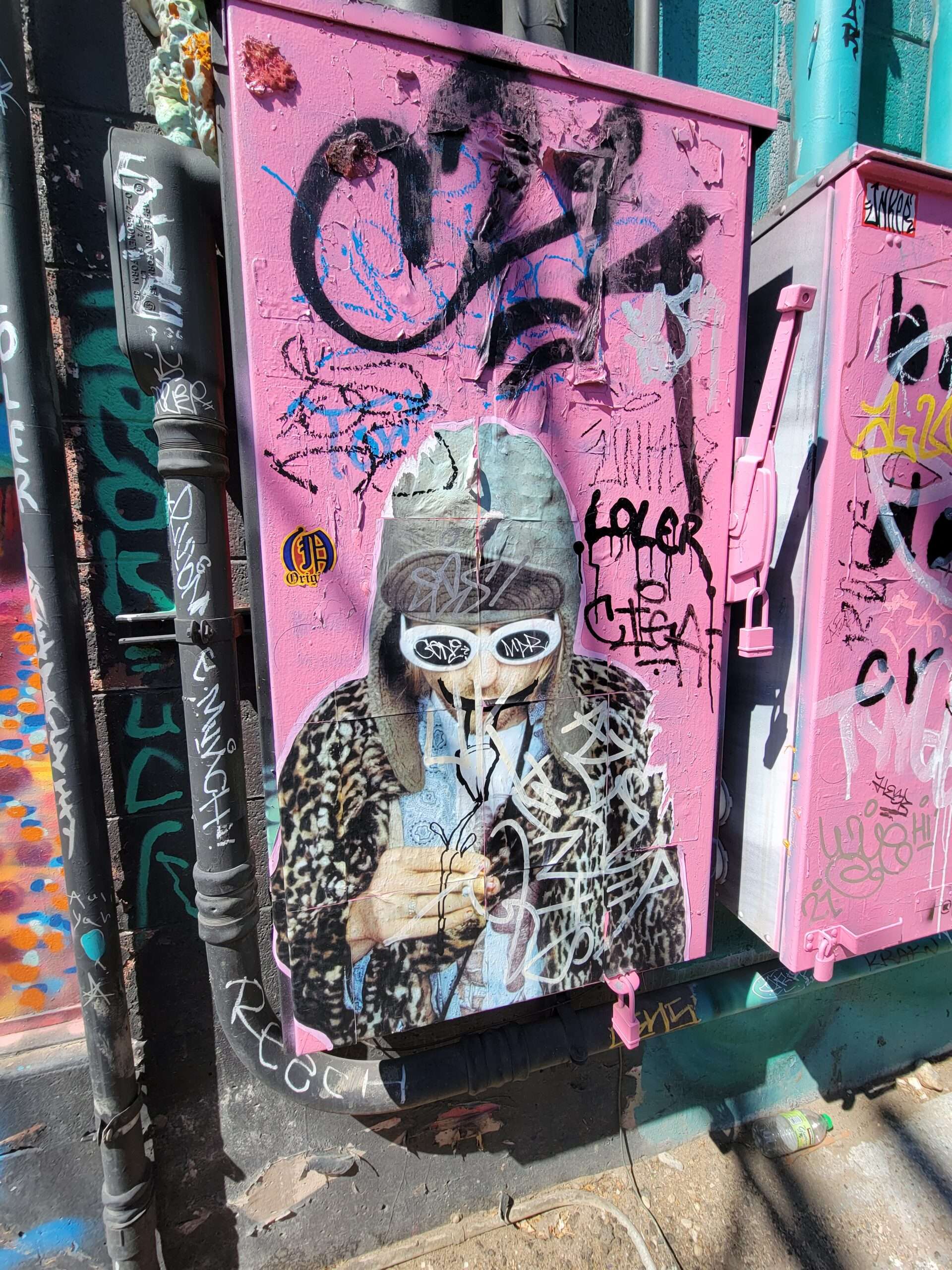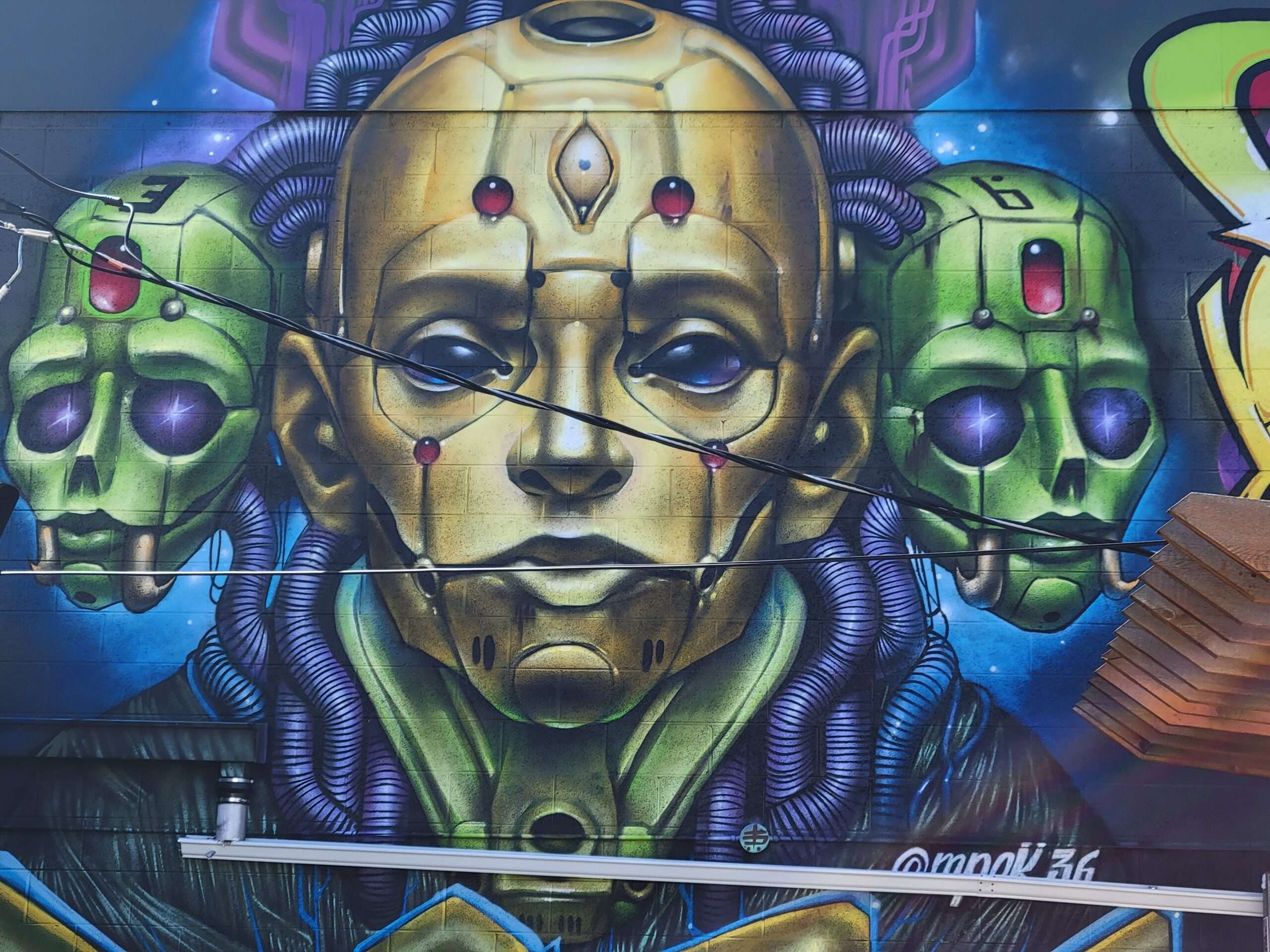 This simplistic but striking piece of street art features a white, abstract face with three eyes painted directly onto a dark grey metal surface in Denver. Rendered with bold black outlines and a subtle, knowing smirk, the enigmatic character transforms an ordinary piece of city infrastructure into a canvas for underground artistic flair.