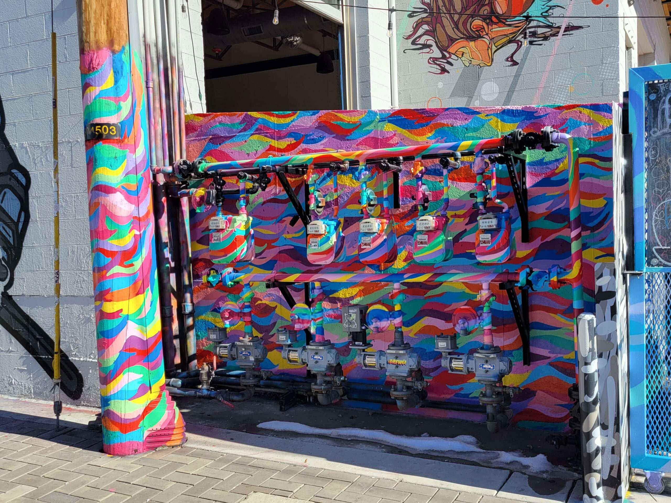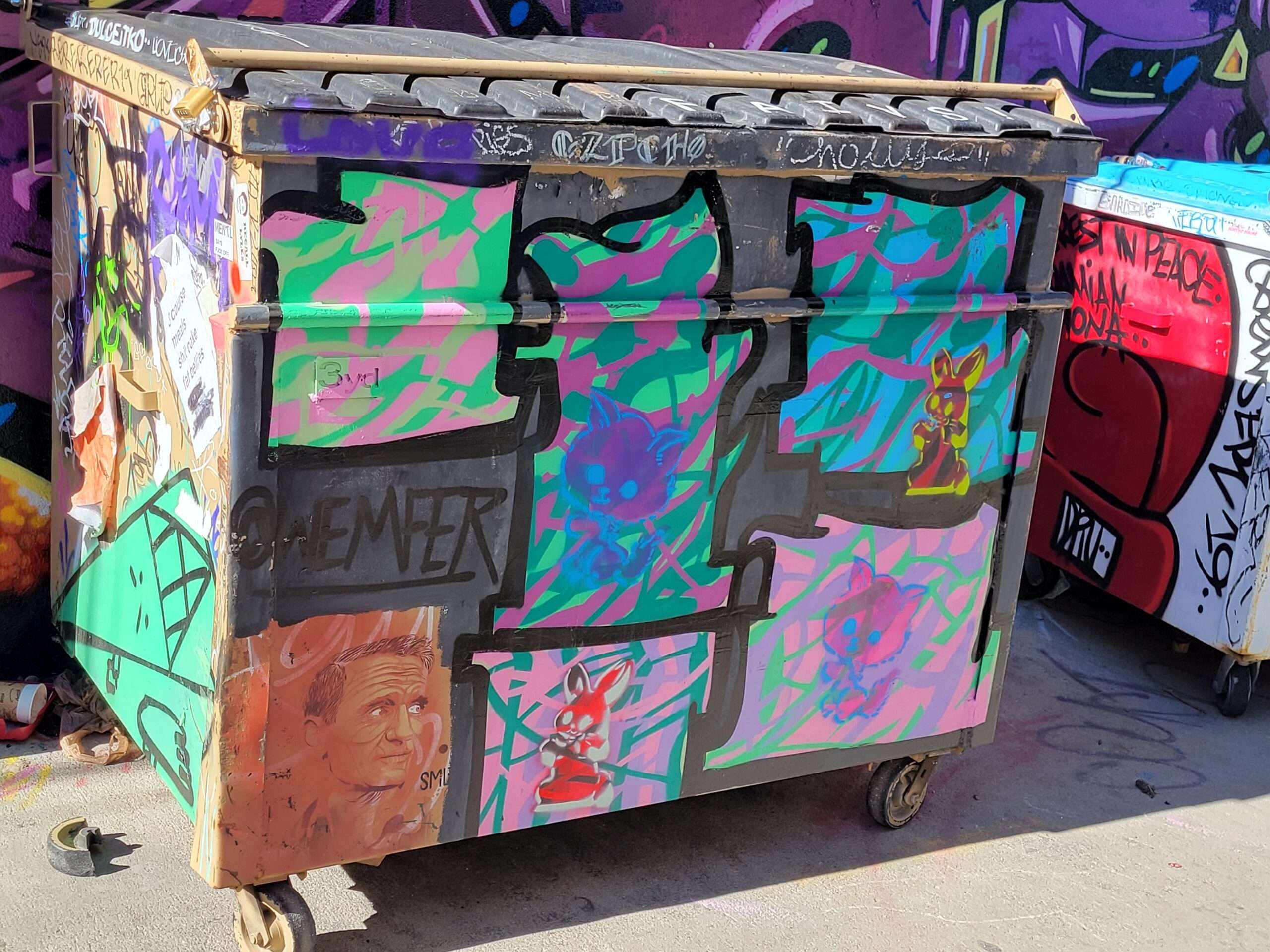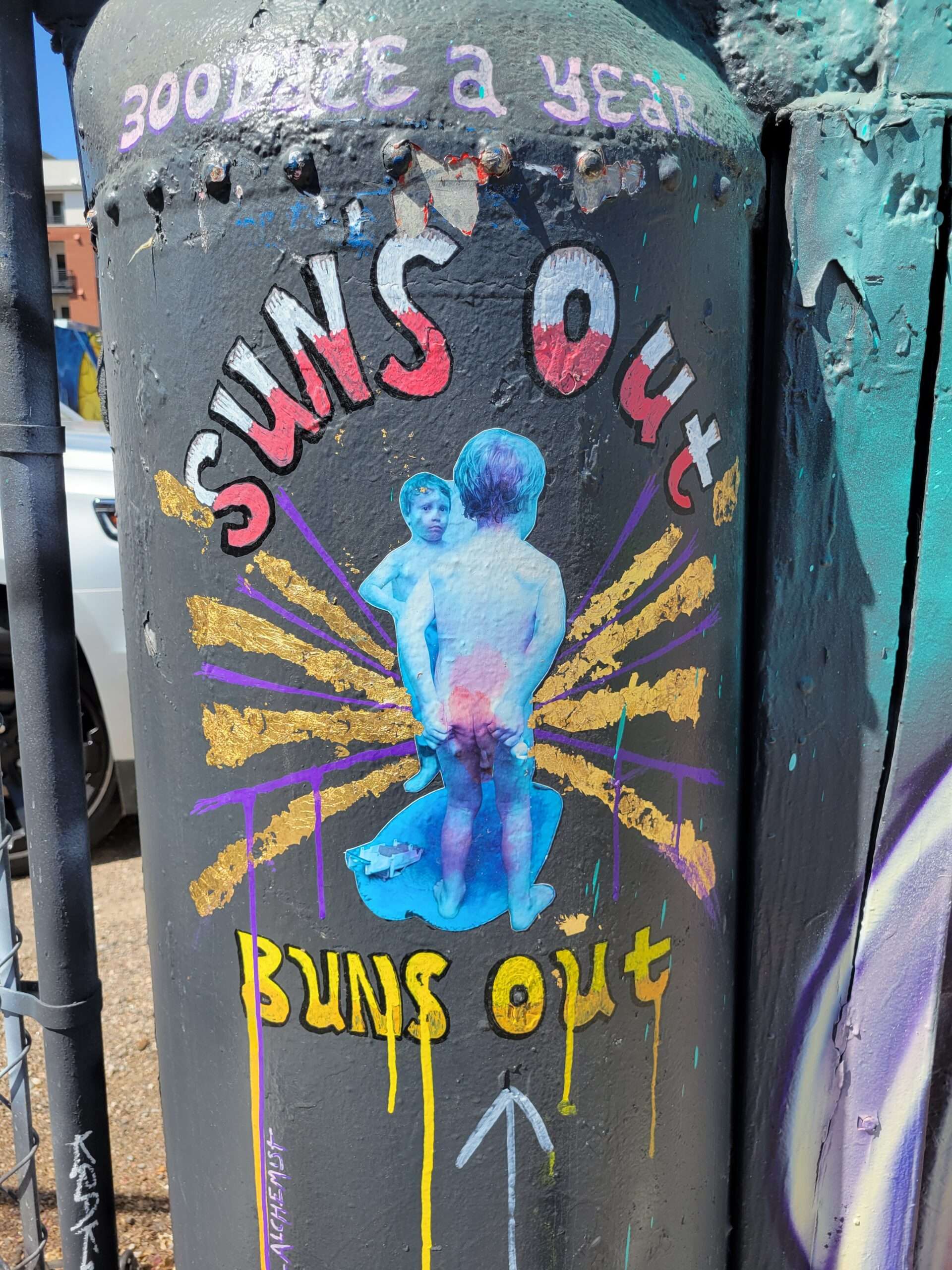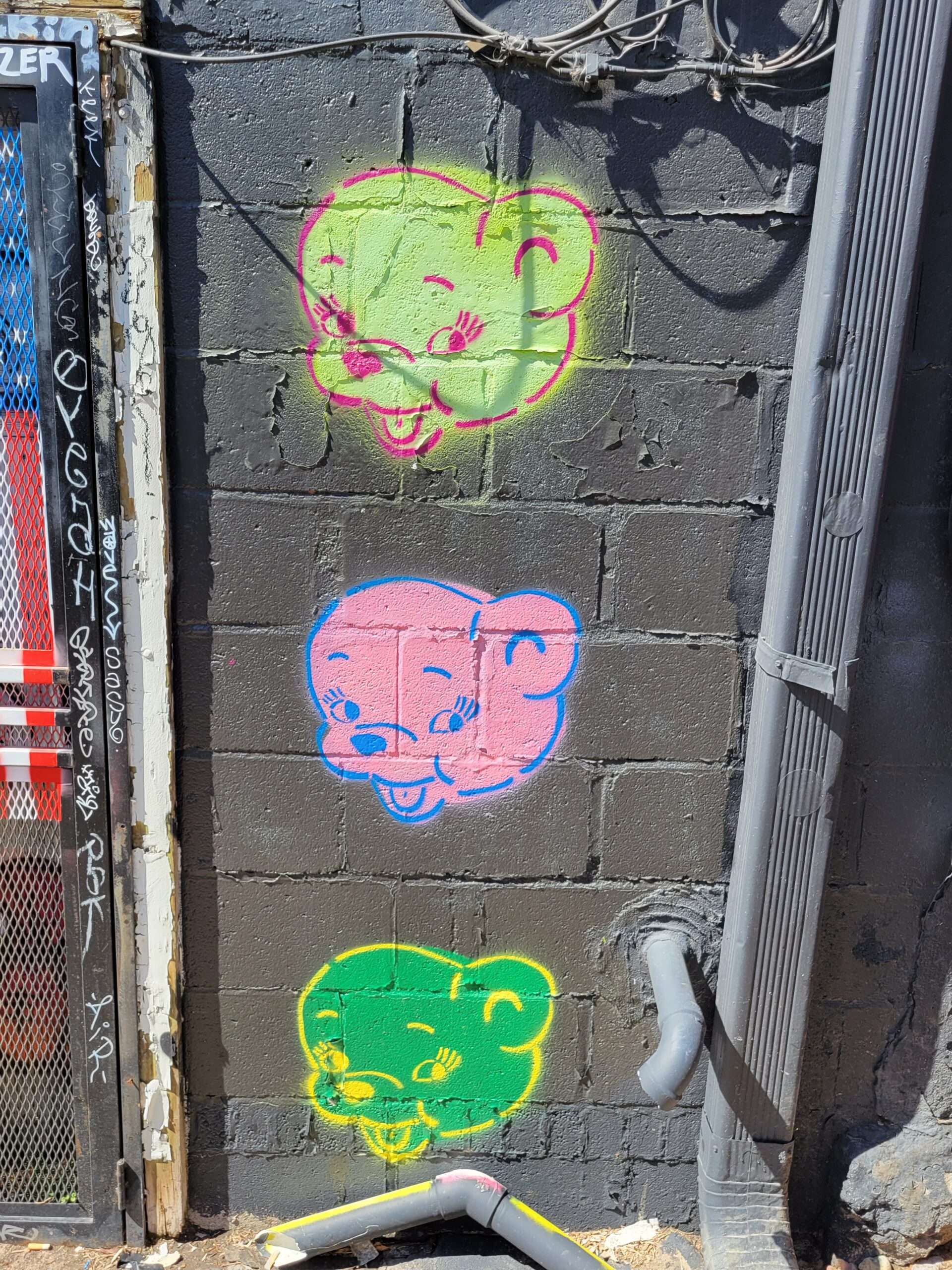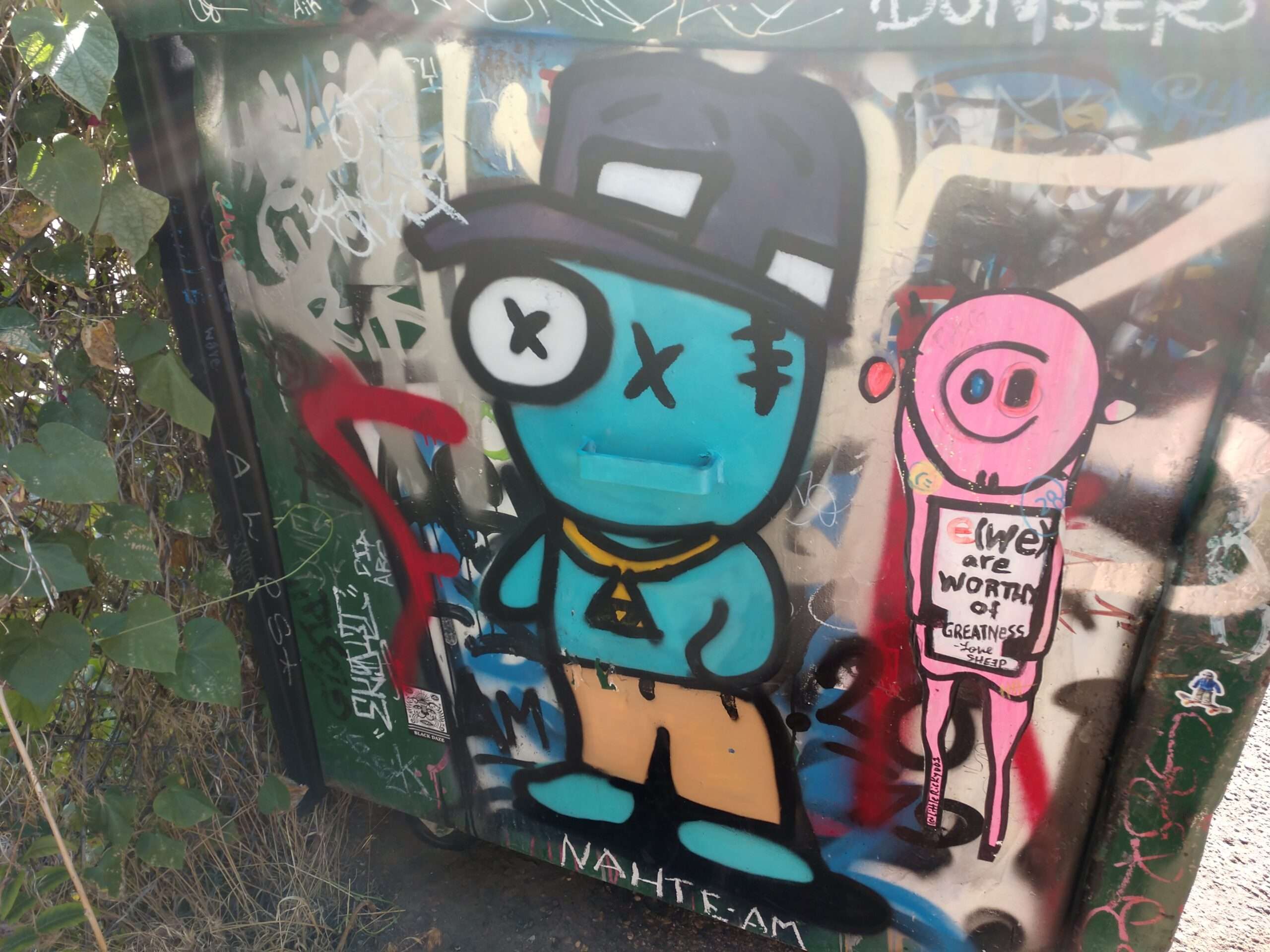 This simplistic but striking piece of street art features a white, abstract face with three eyes painted directly onto a dark grey metal surface in Denver. Rendered with bold black outlines and a subtle, knowing smirk, the enigmatic character transforms an ordinary piece of city infrastructure into a canvas for underground artistic flair.