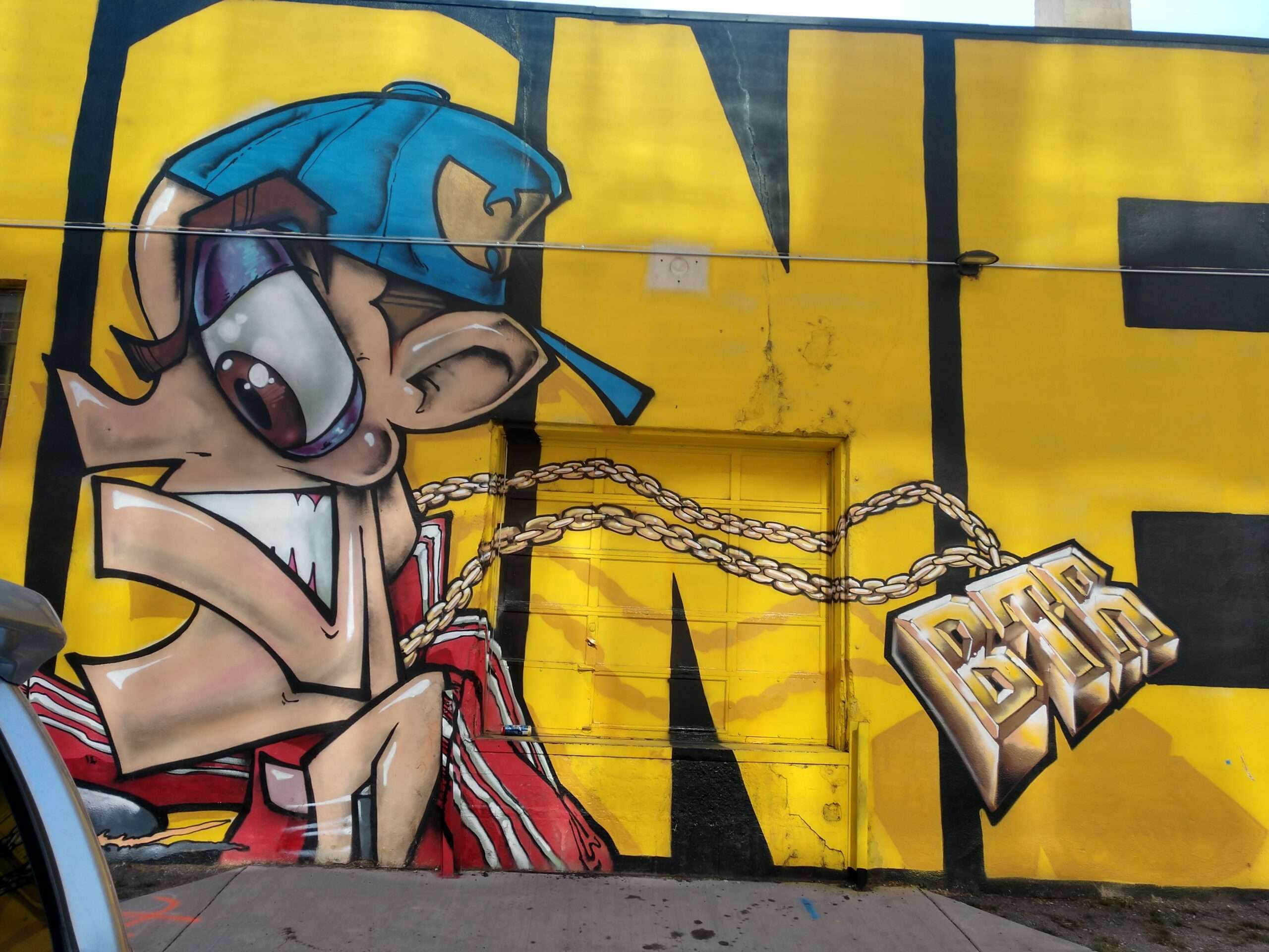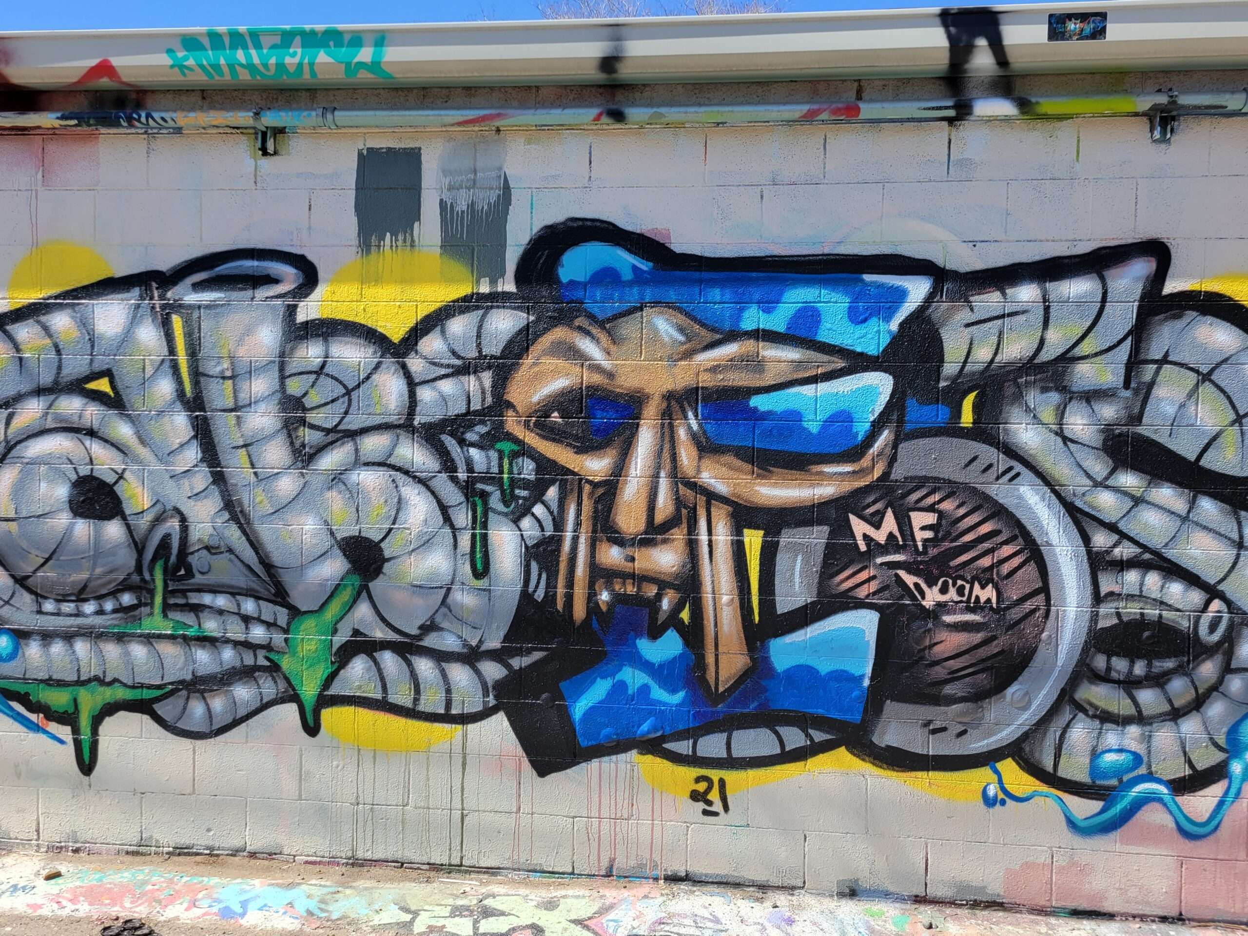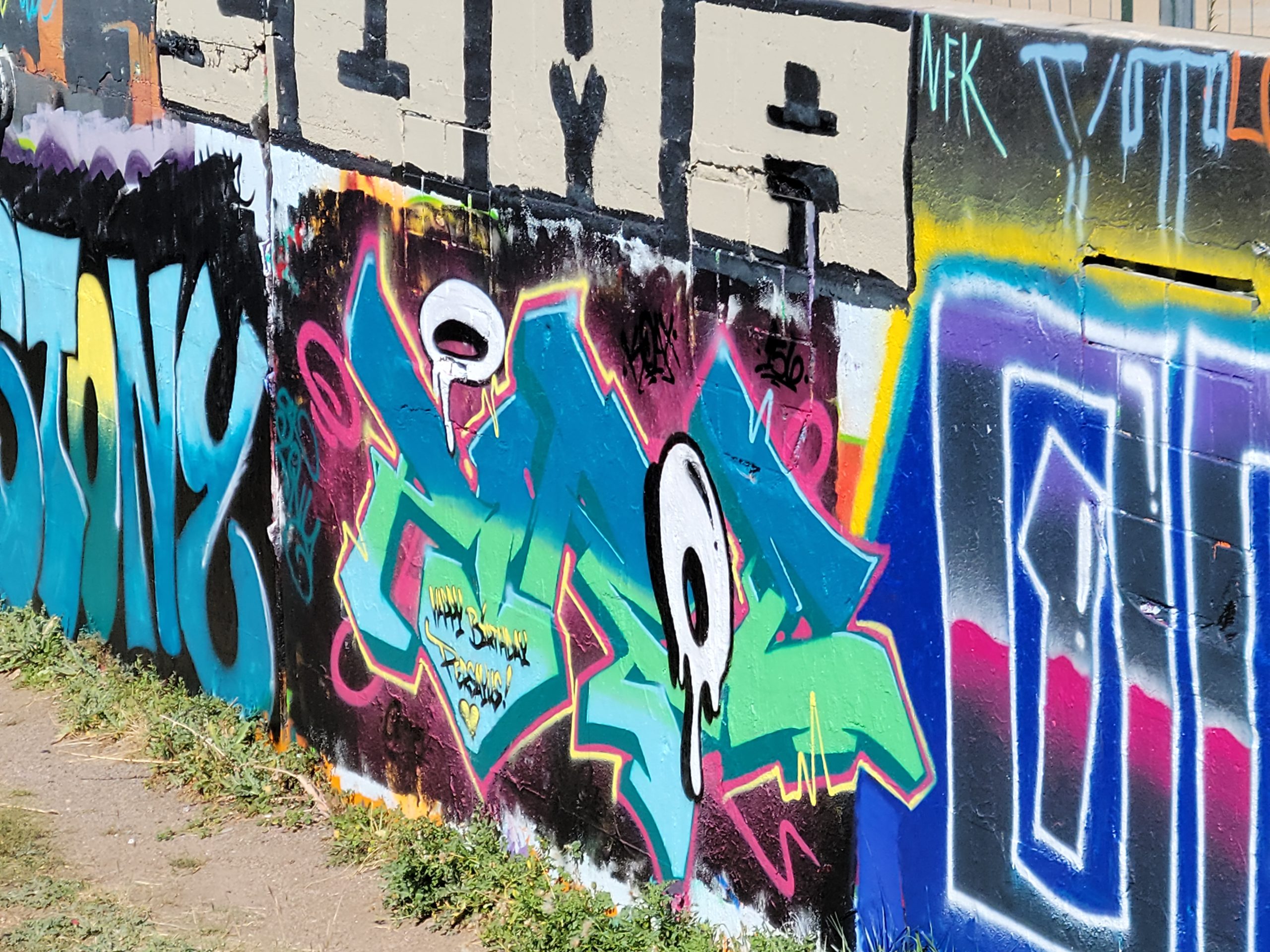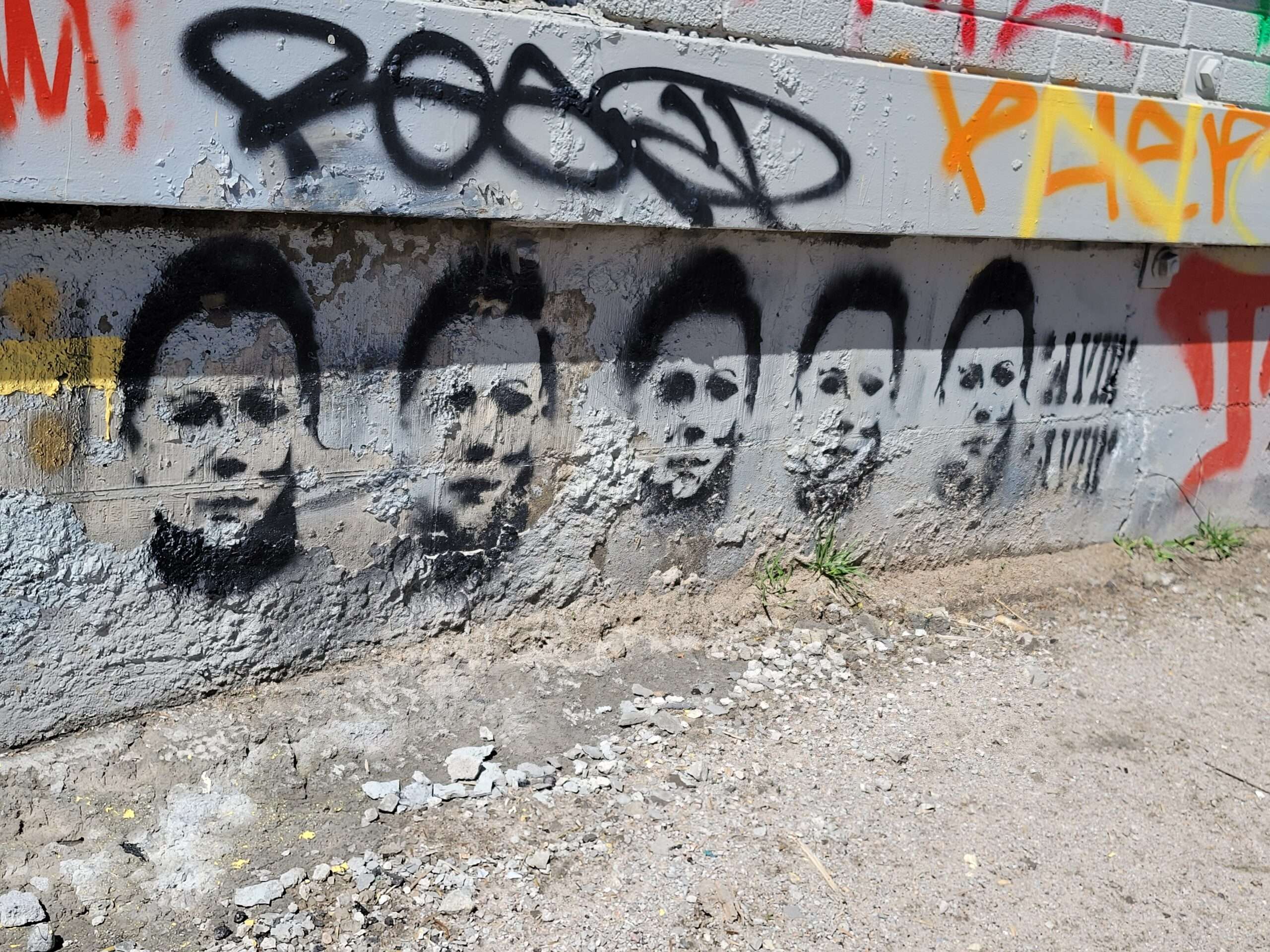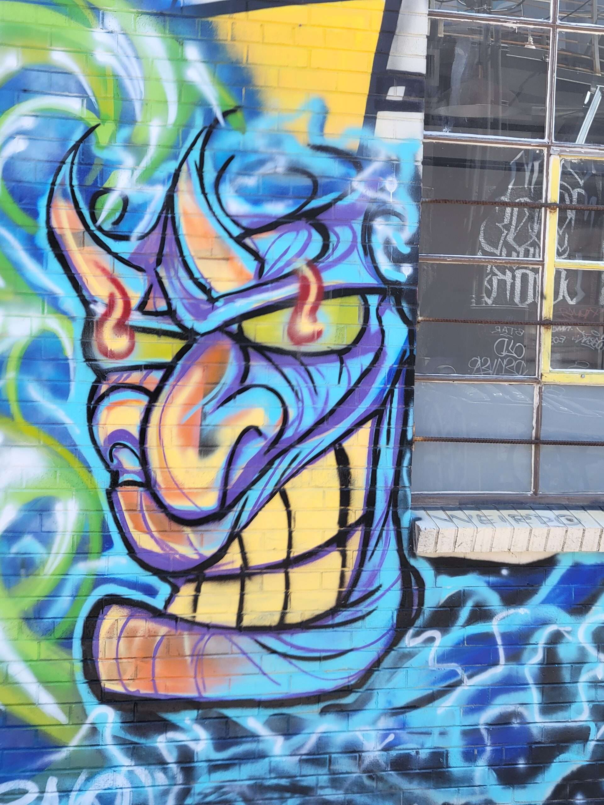 This simplistic but striking piece of street art features a white, abstract face with three eyes painted directly onto a dark grey metal surface in Denver. Rendered with bold black outlines and a subtle, knowing smirk, the enigmatic character transforms an ordinary piece of city infrastructure into a canvas for underground artistic flair.