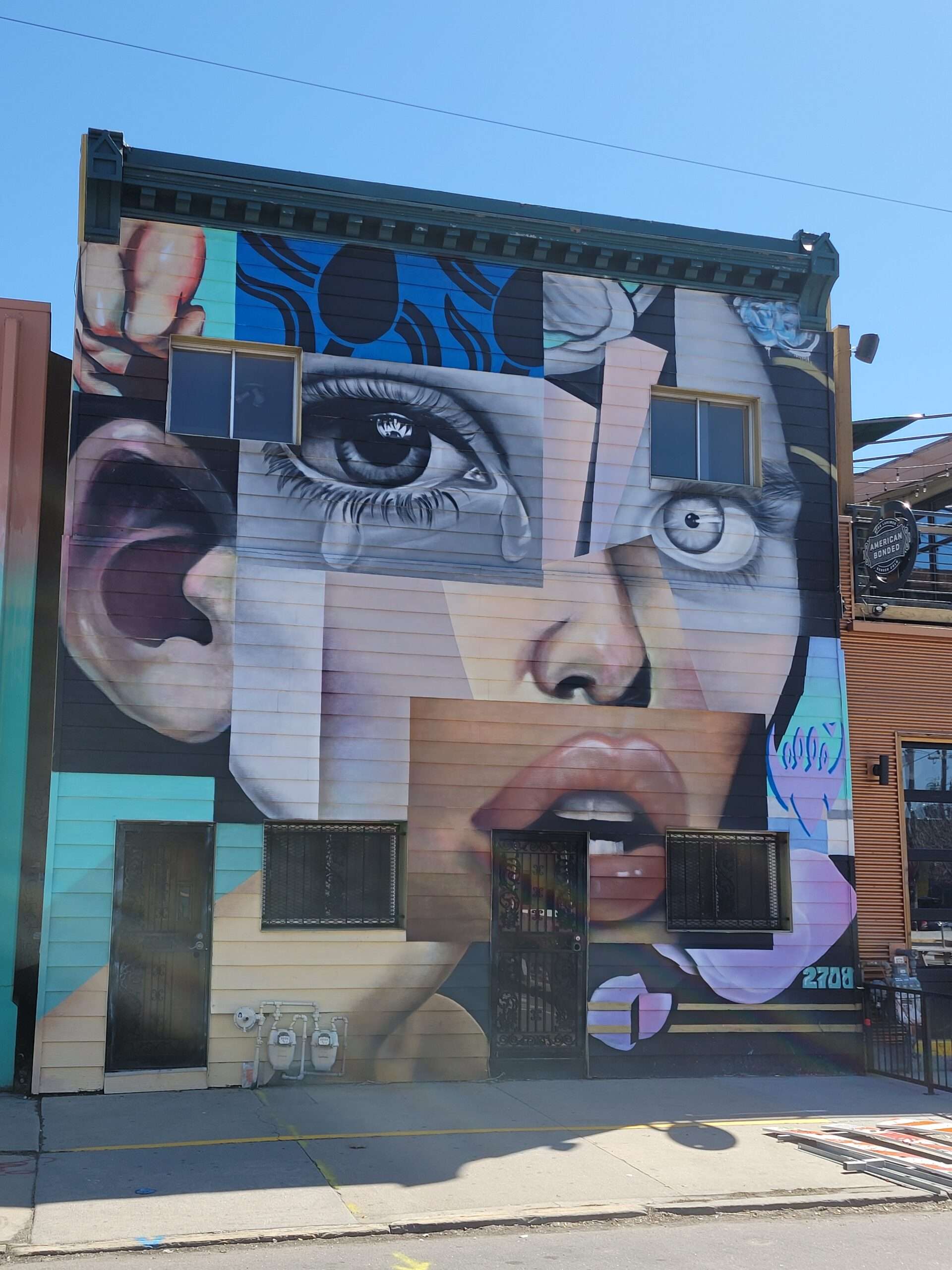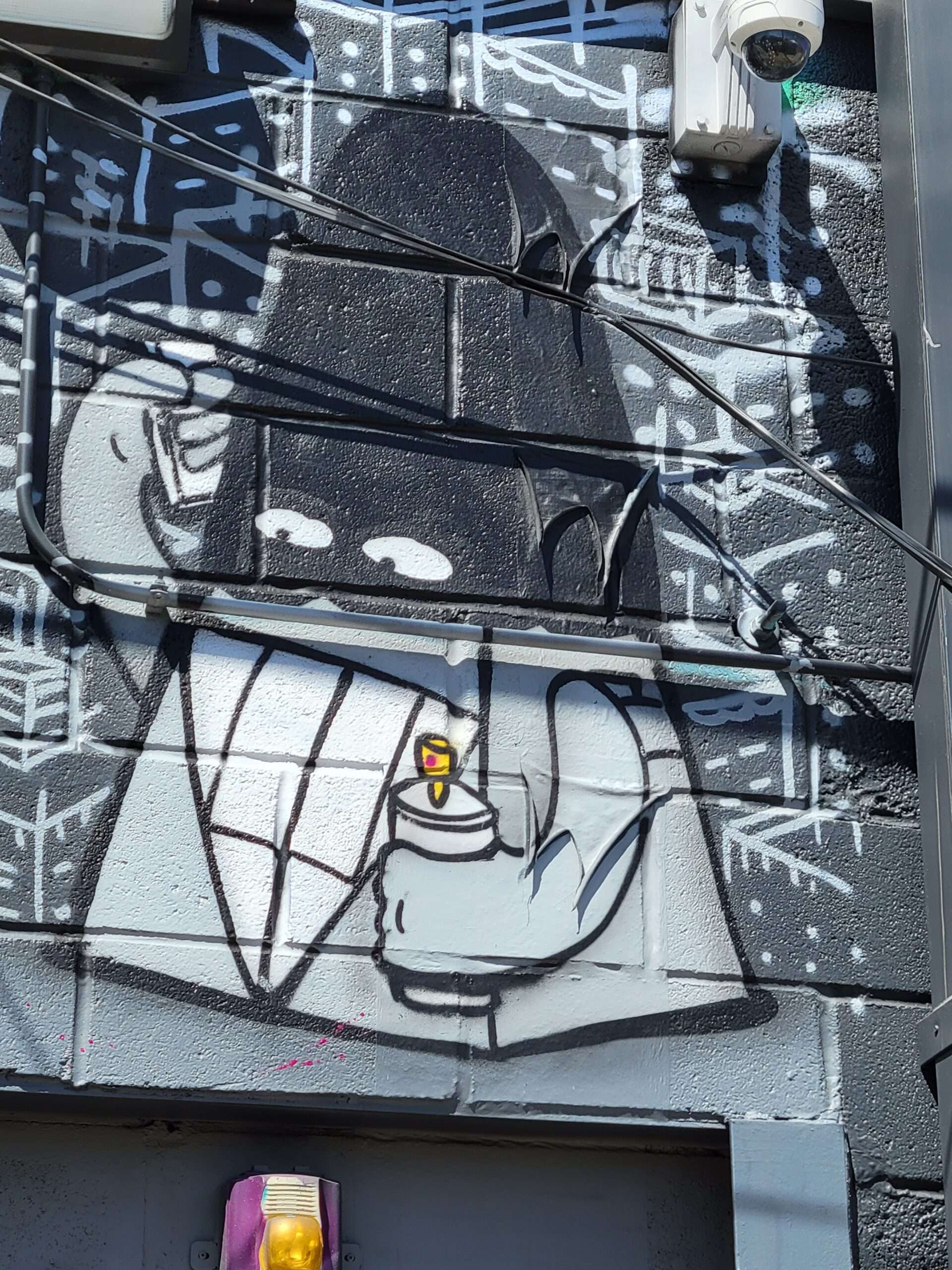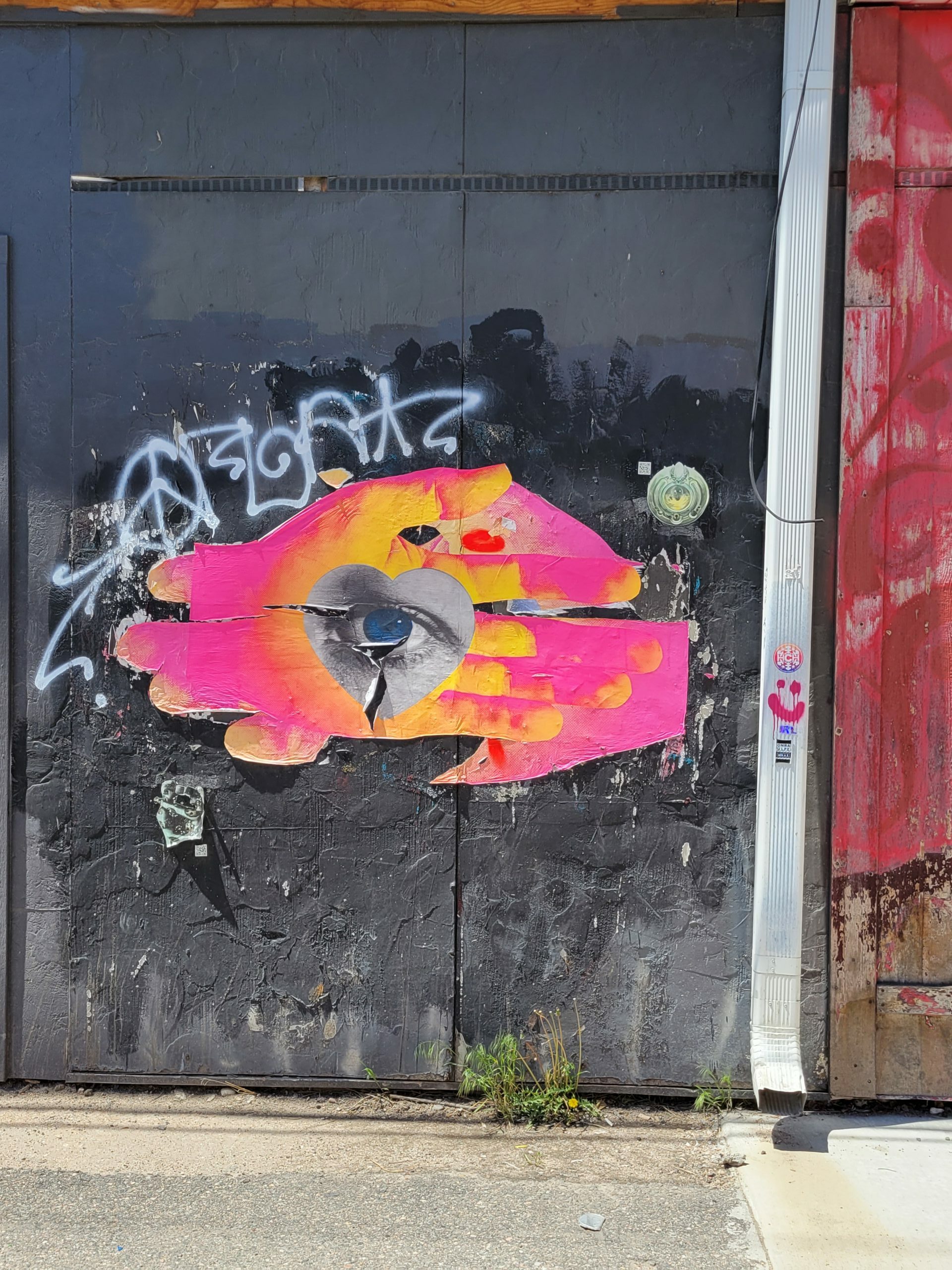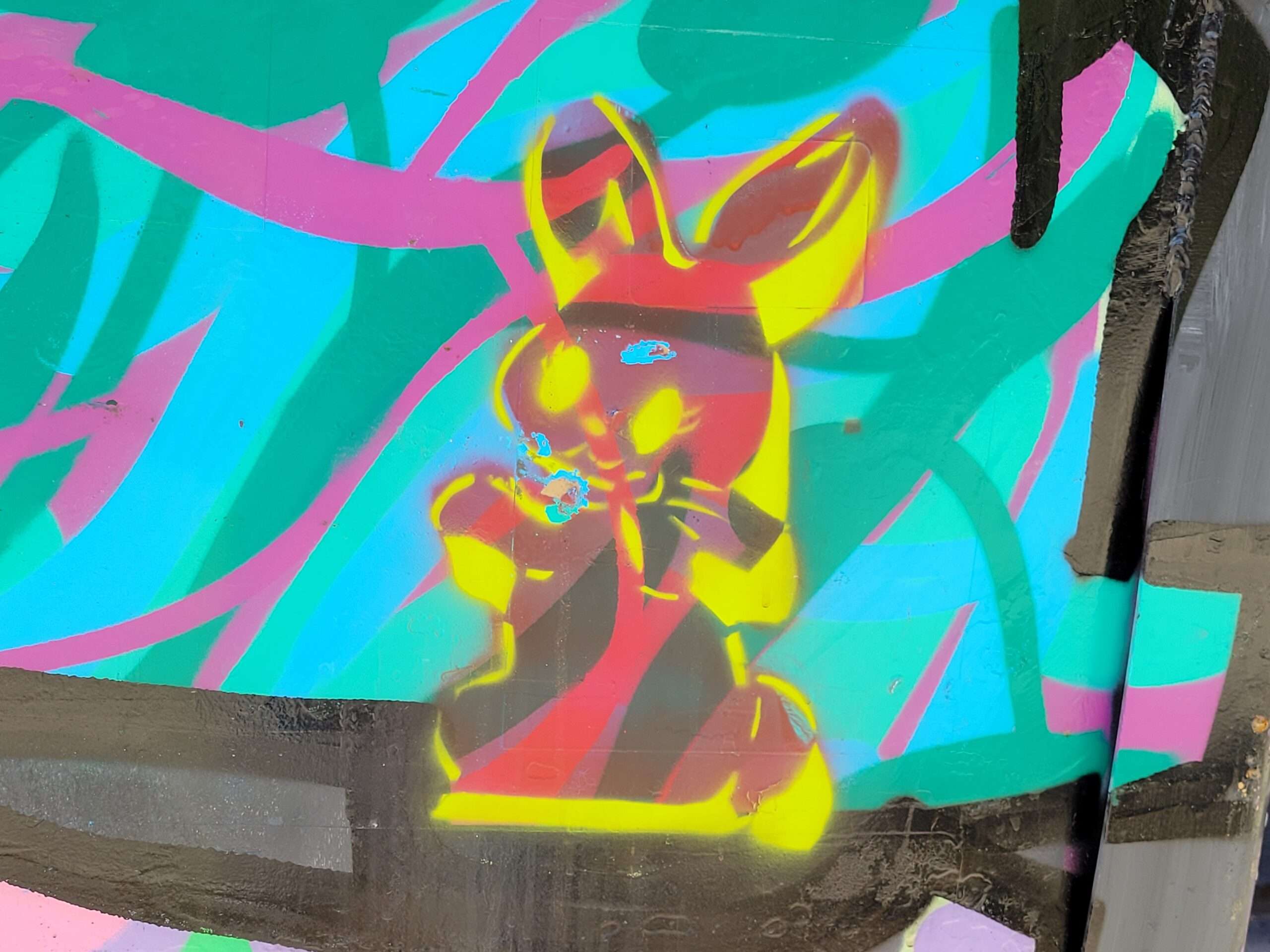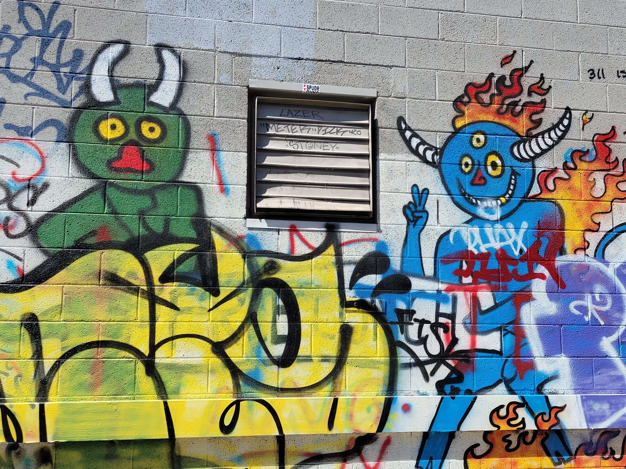 This simplistic but striking piece of street art features a white, abstract face with three eyes painted directly onto a dark grey metal surface in Denver. Rendered with bold black outlines and a subtle, knowing smirk, the enigmatic character transforms an ordinary piece of city infrastructure into a canvas for underground artistic flair.