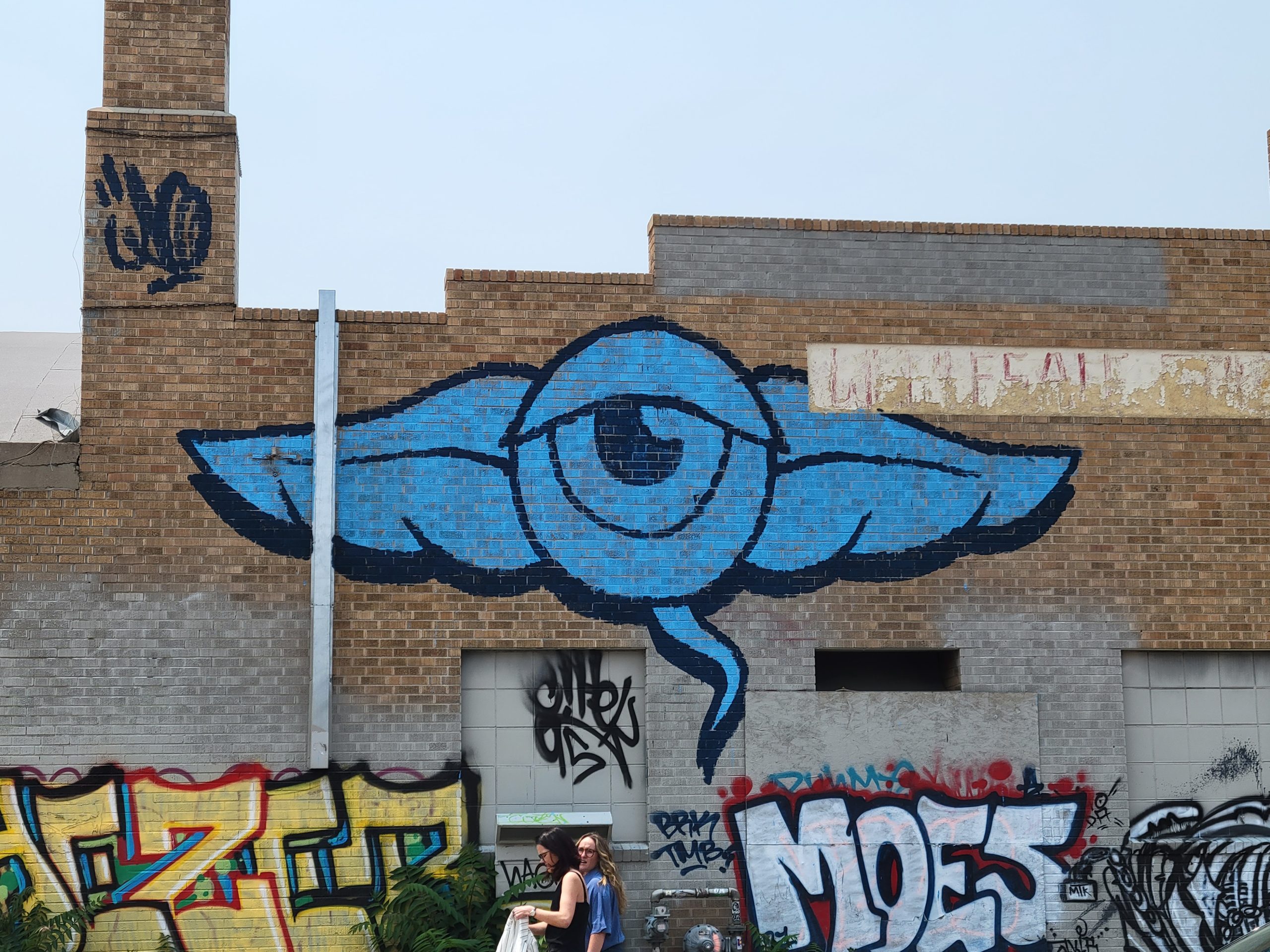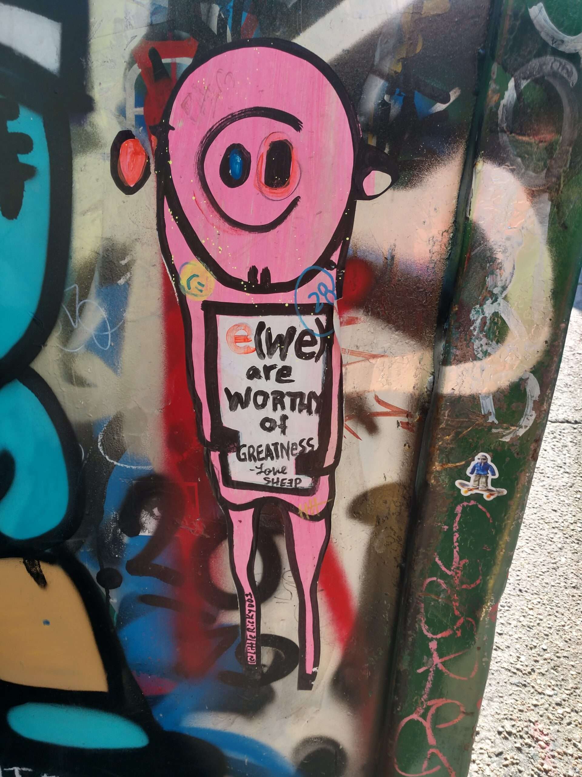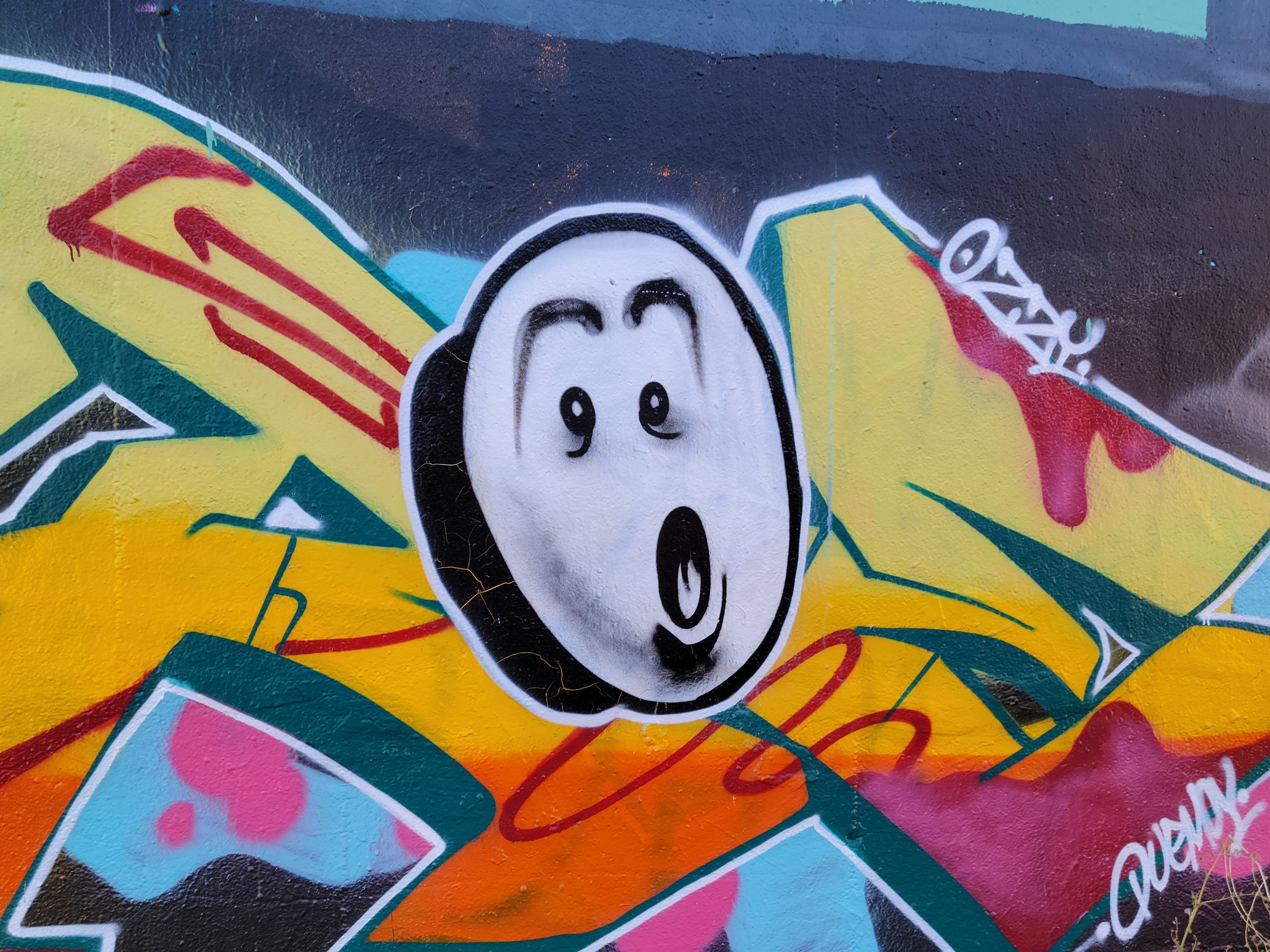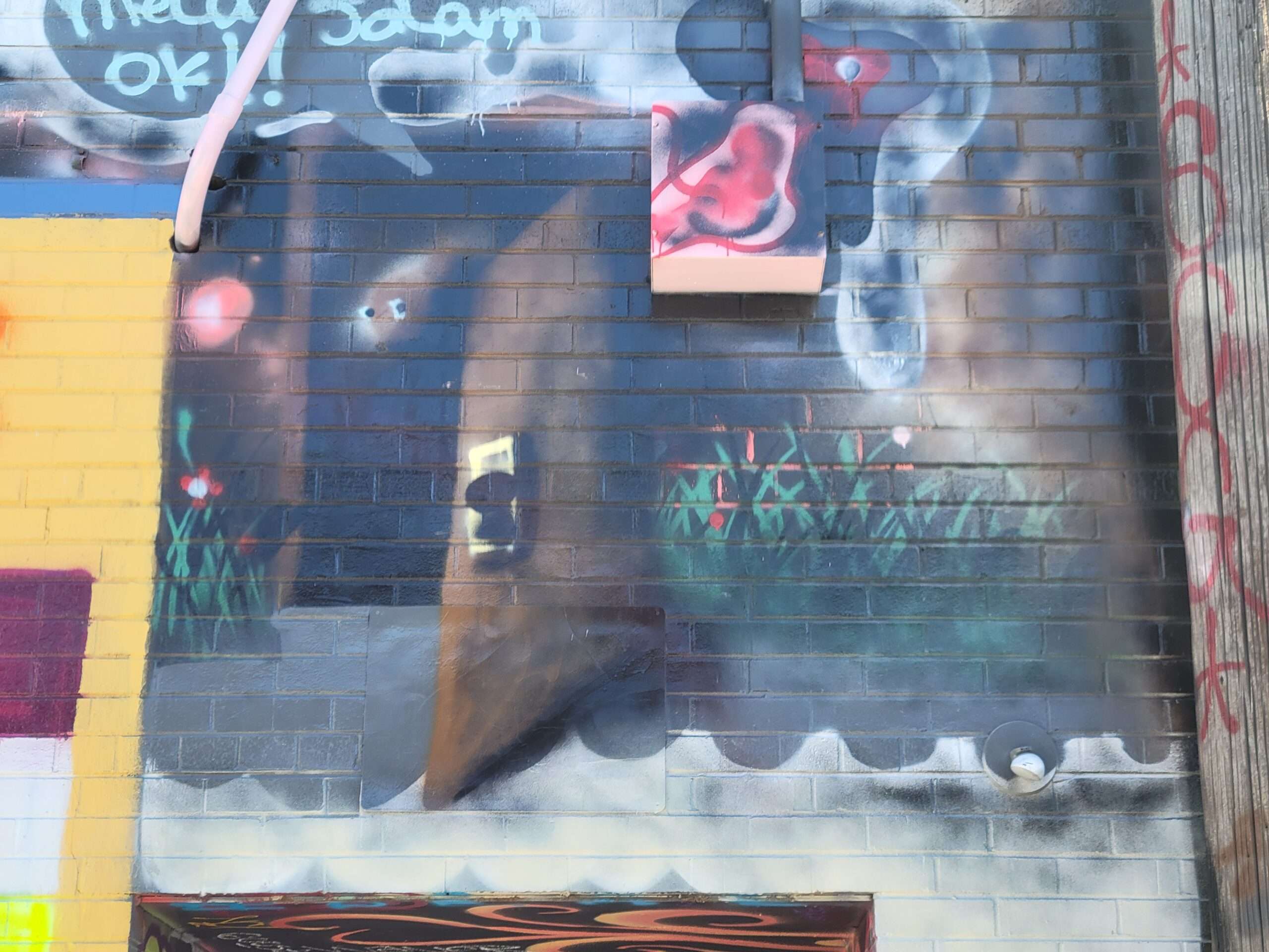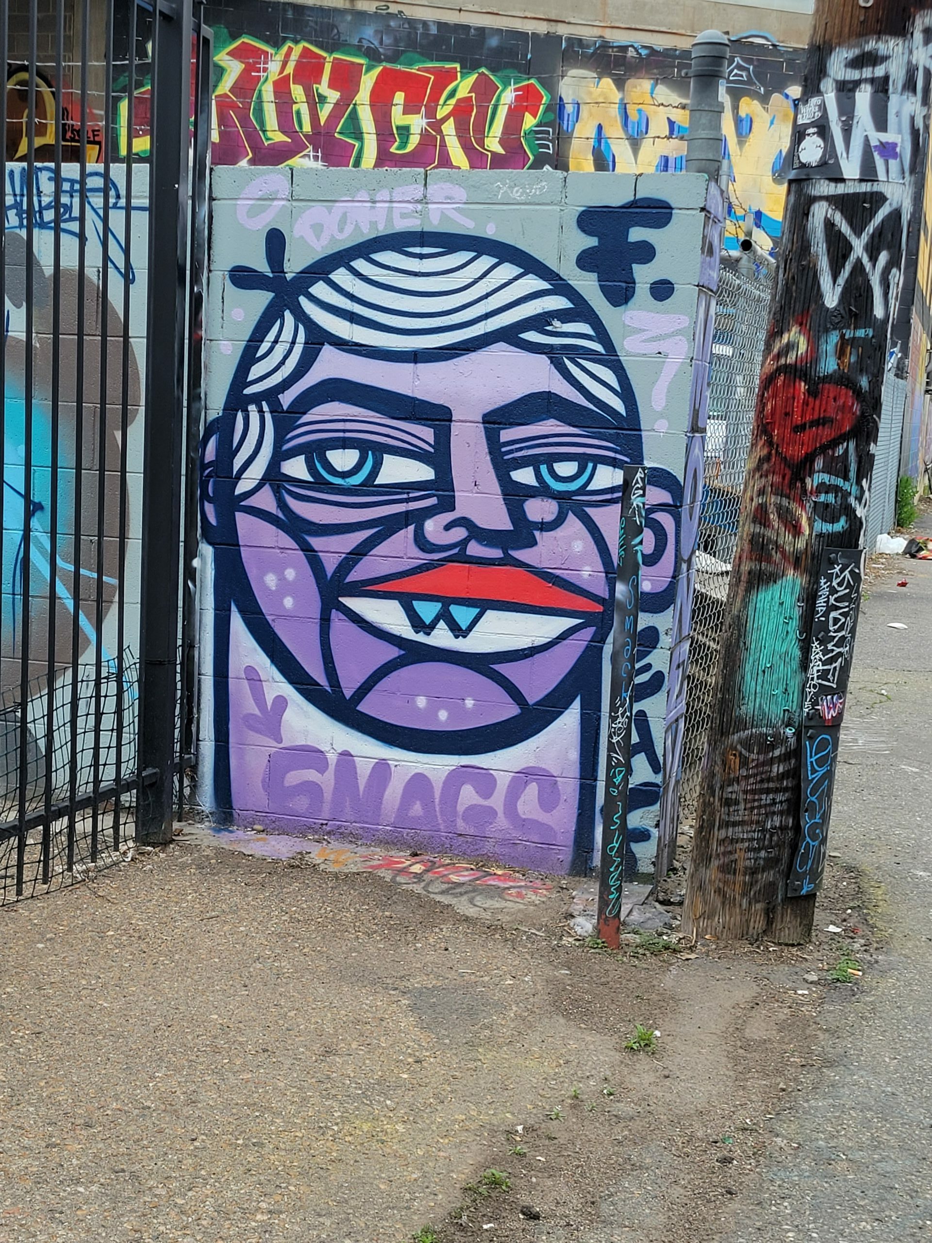 This simplistic but striking piece of street art features a white, abstract face with three eyes painted directly onto a dark grey metal surface in Denver. Rendered with bold black outlines and a subtle, knowing smirk, the enigmatic character transforms an ordinary piece of city infrastructure into a canvas for underground artistic flair.