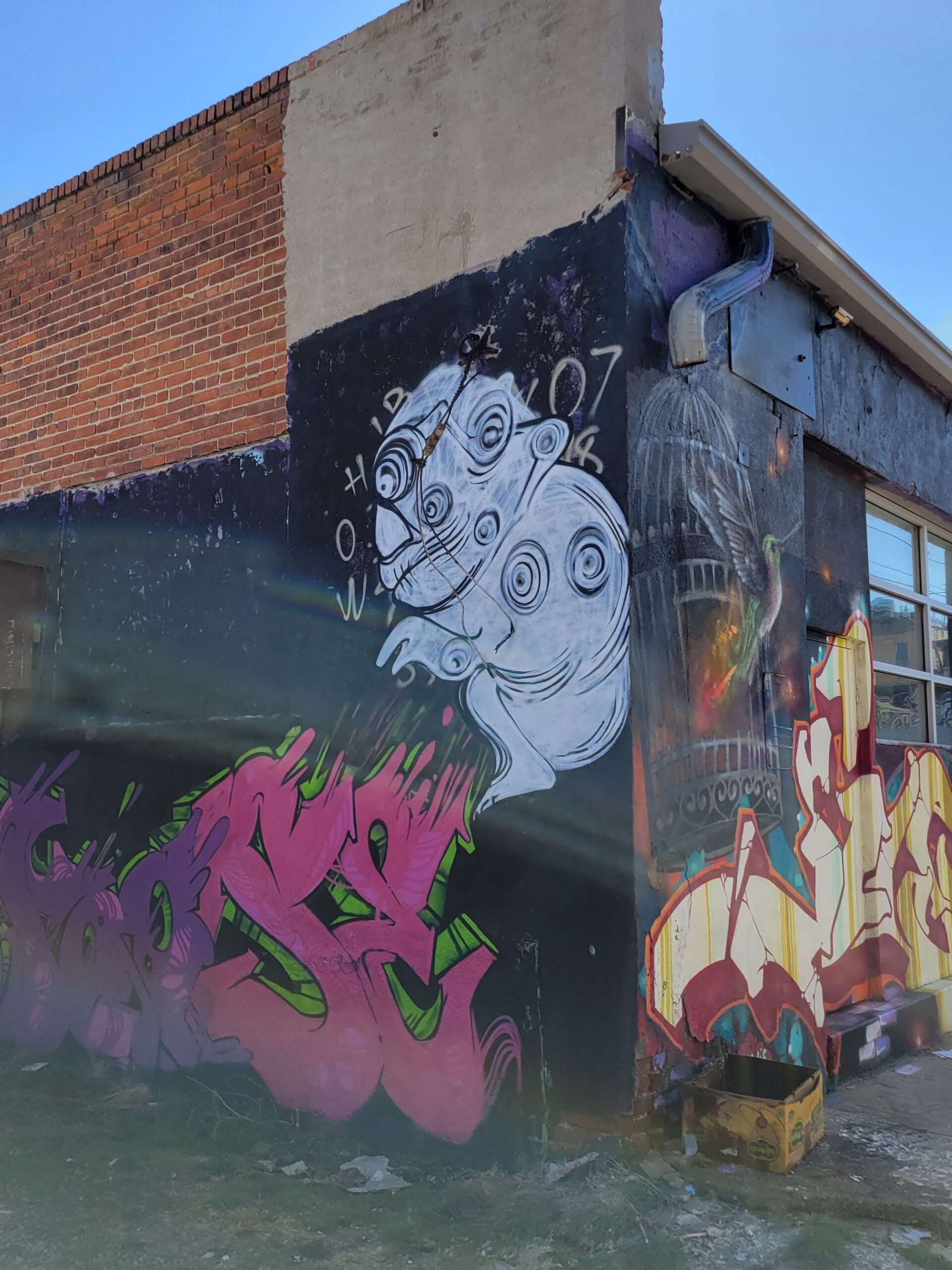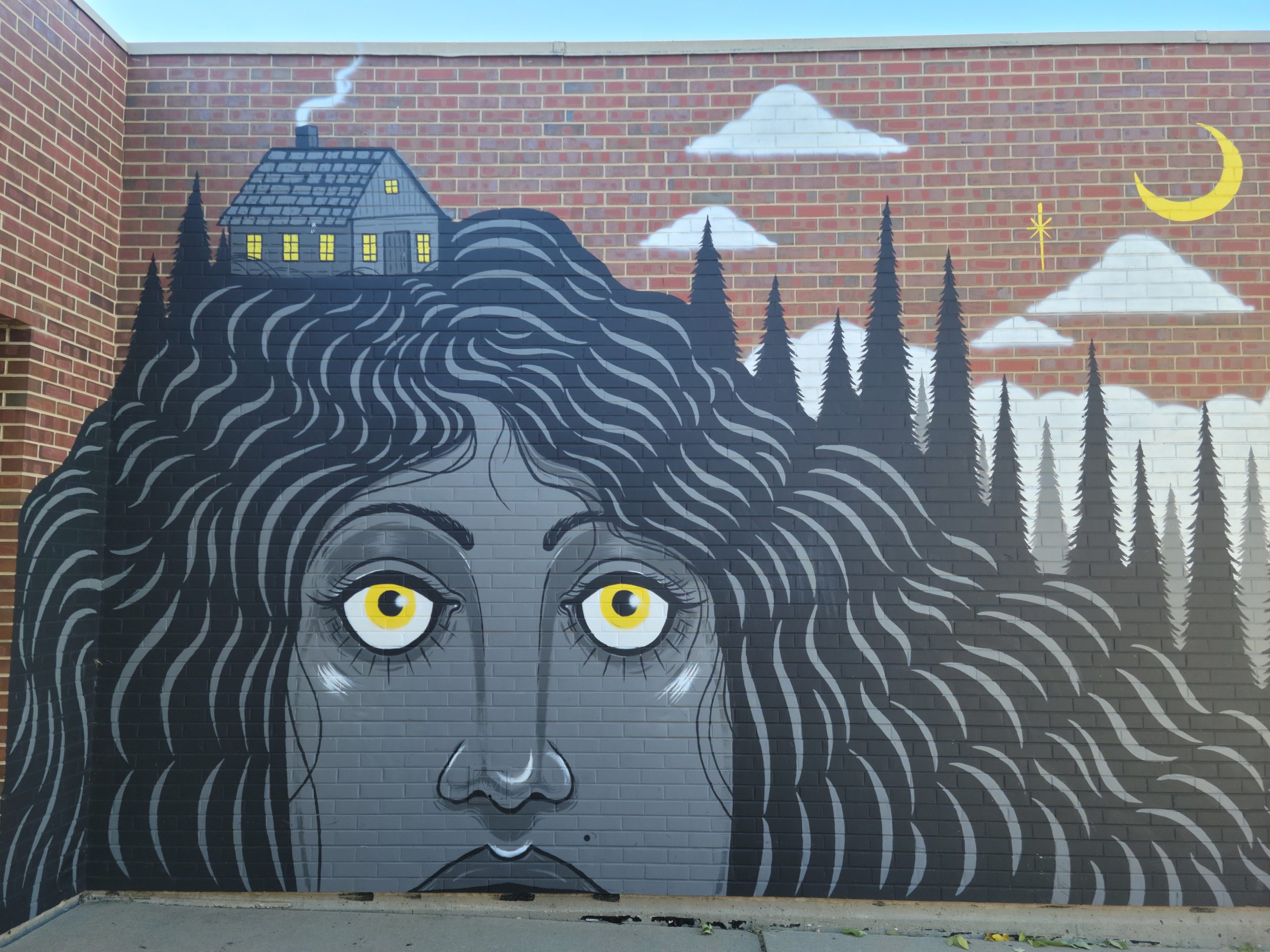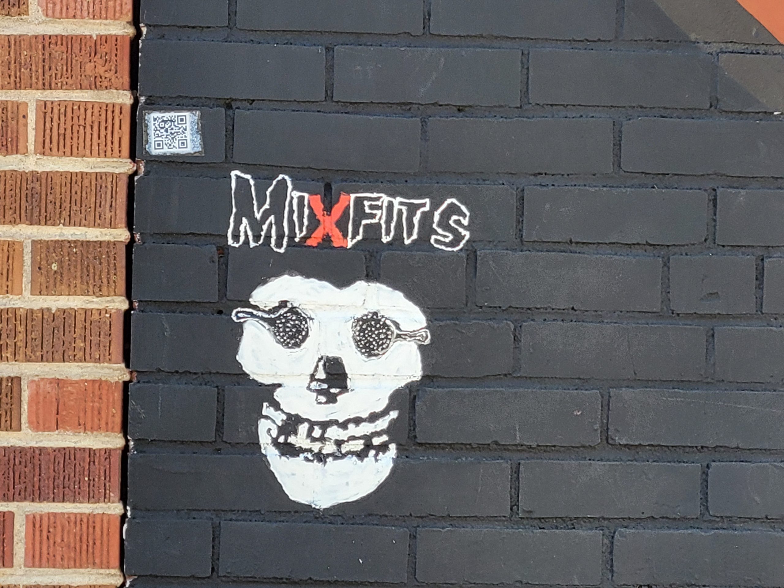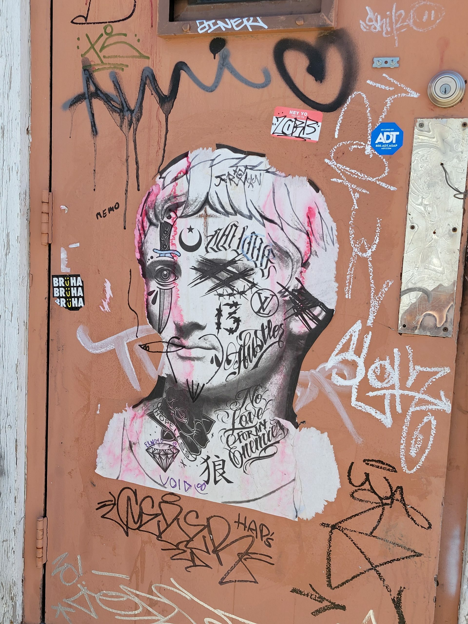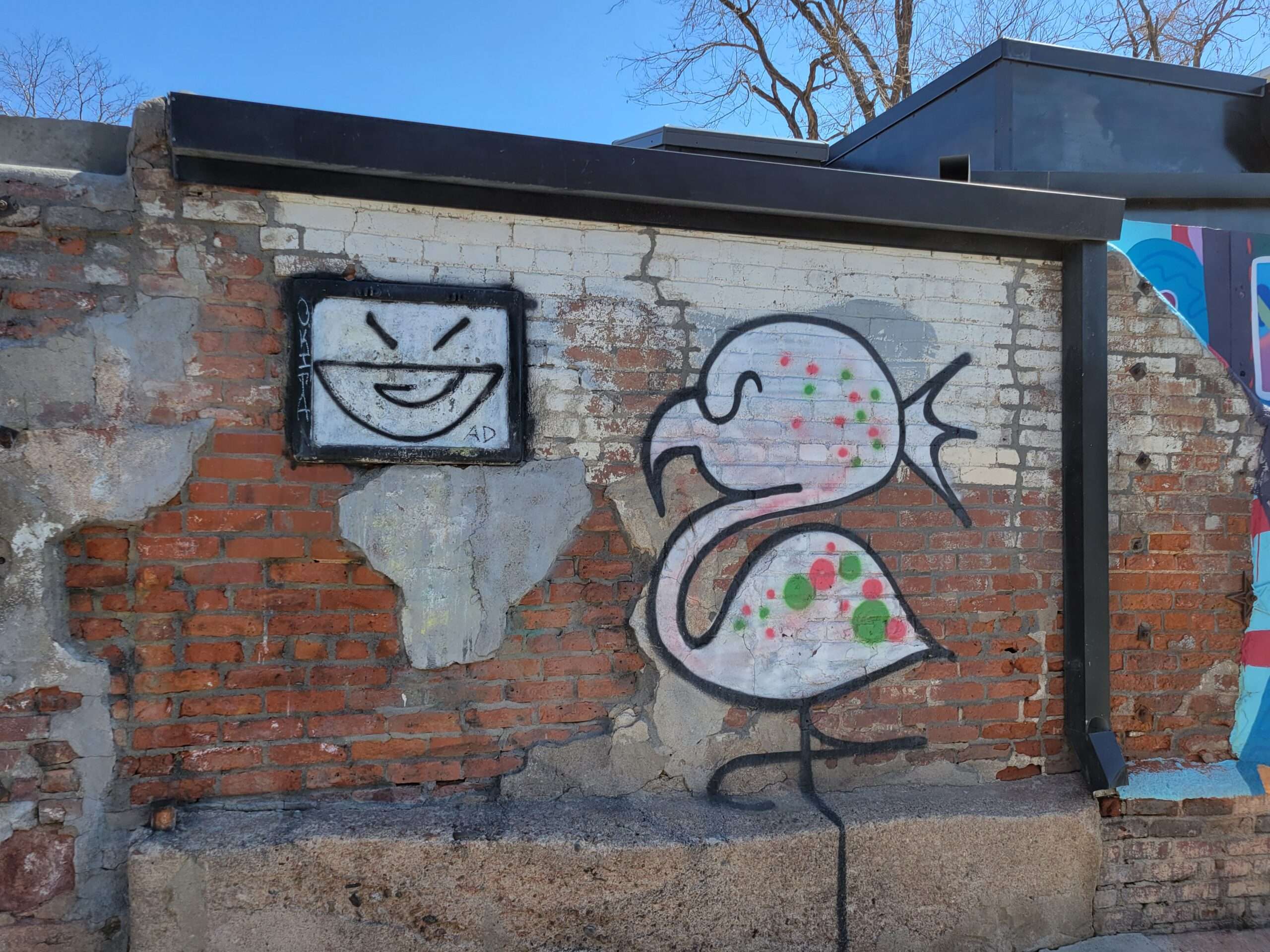 This simplistic but striking piece of street art features a white, abstract face with three eyes painted directly onto a dark grey metal surface in Denver. Rendered with bold black outlines and a subtle, knowing smirk, the enigmatic character transforms an ordinary piece of city infrastructure into a canvas for underground artistic flair.