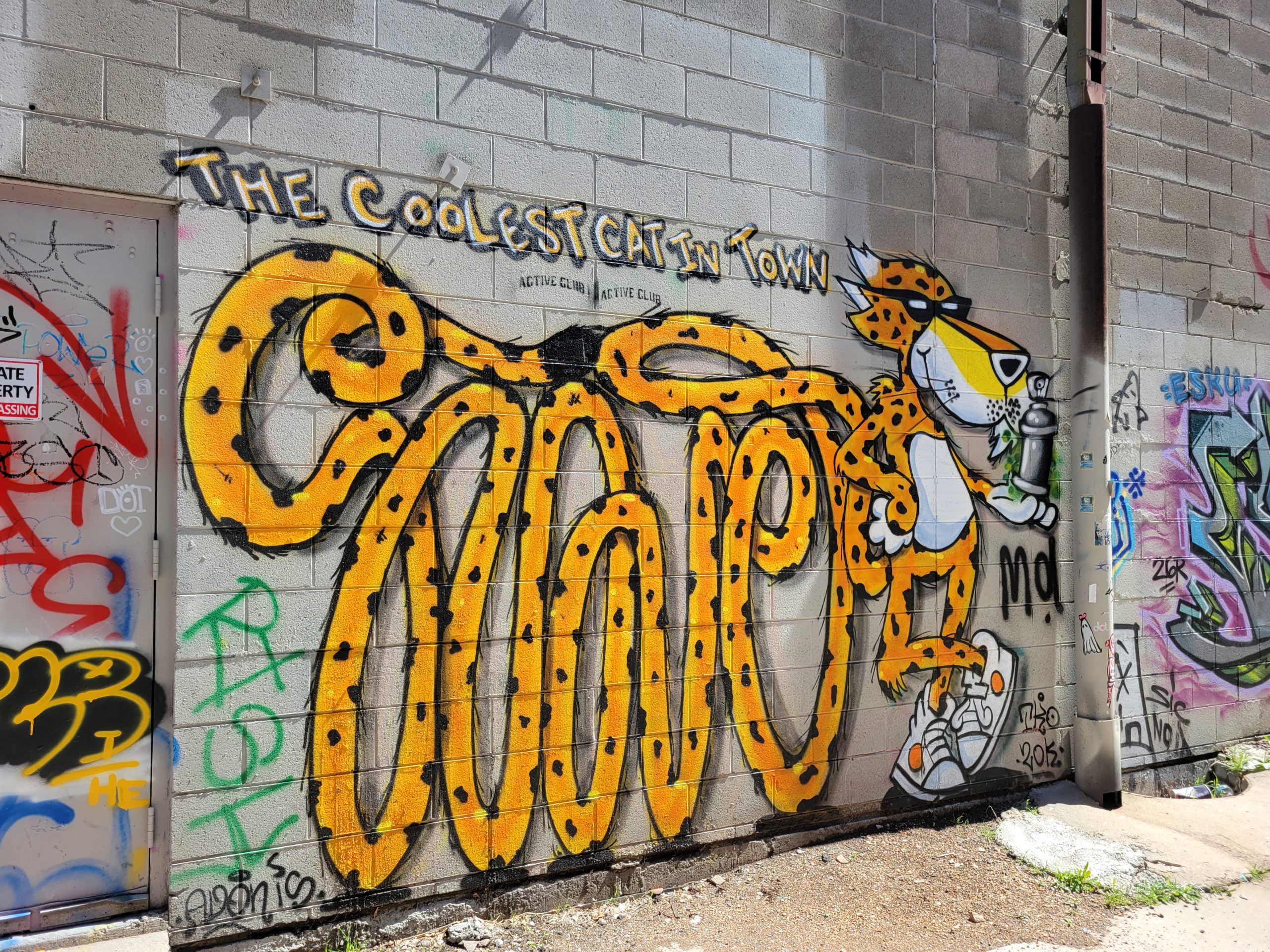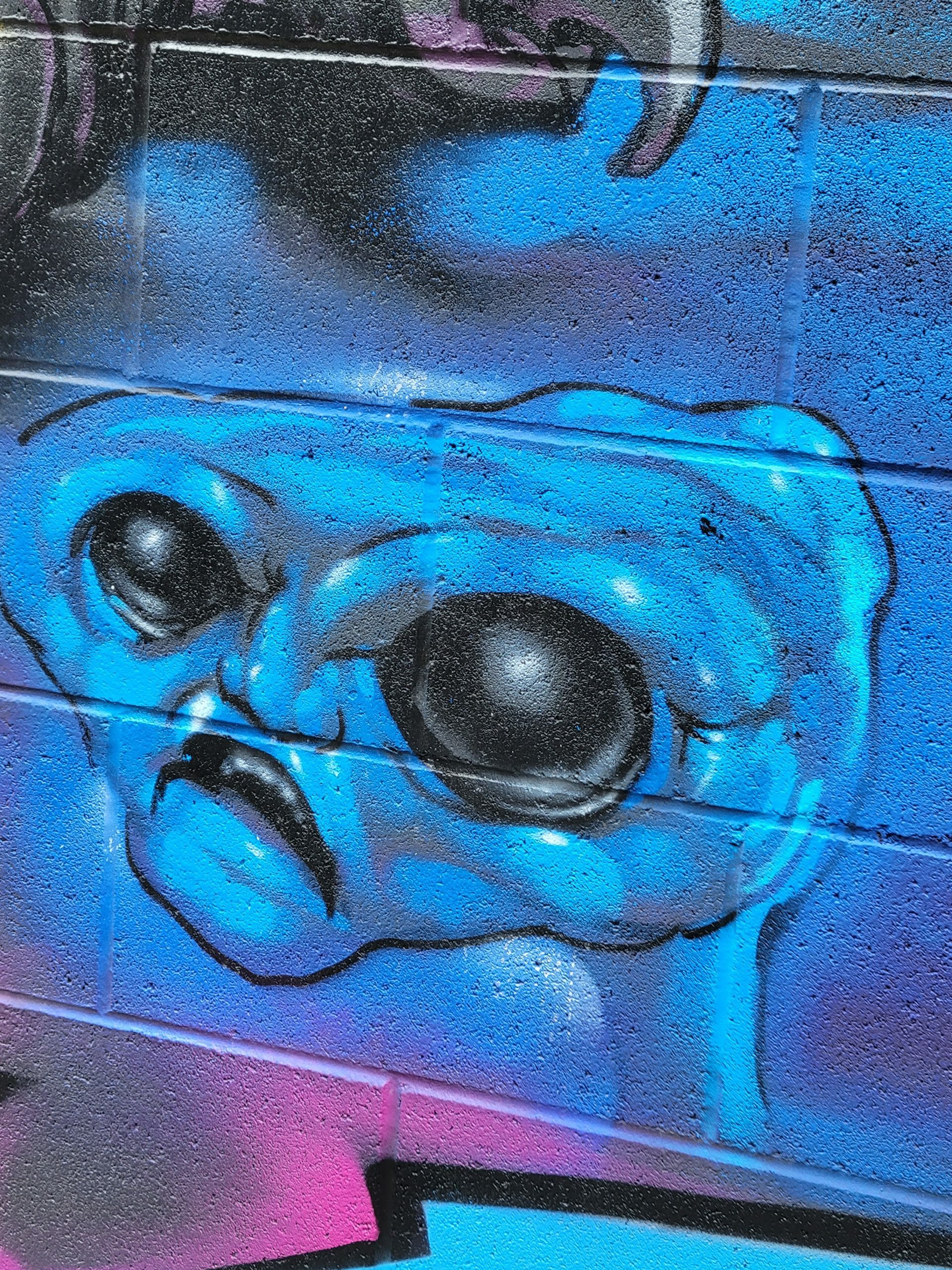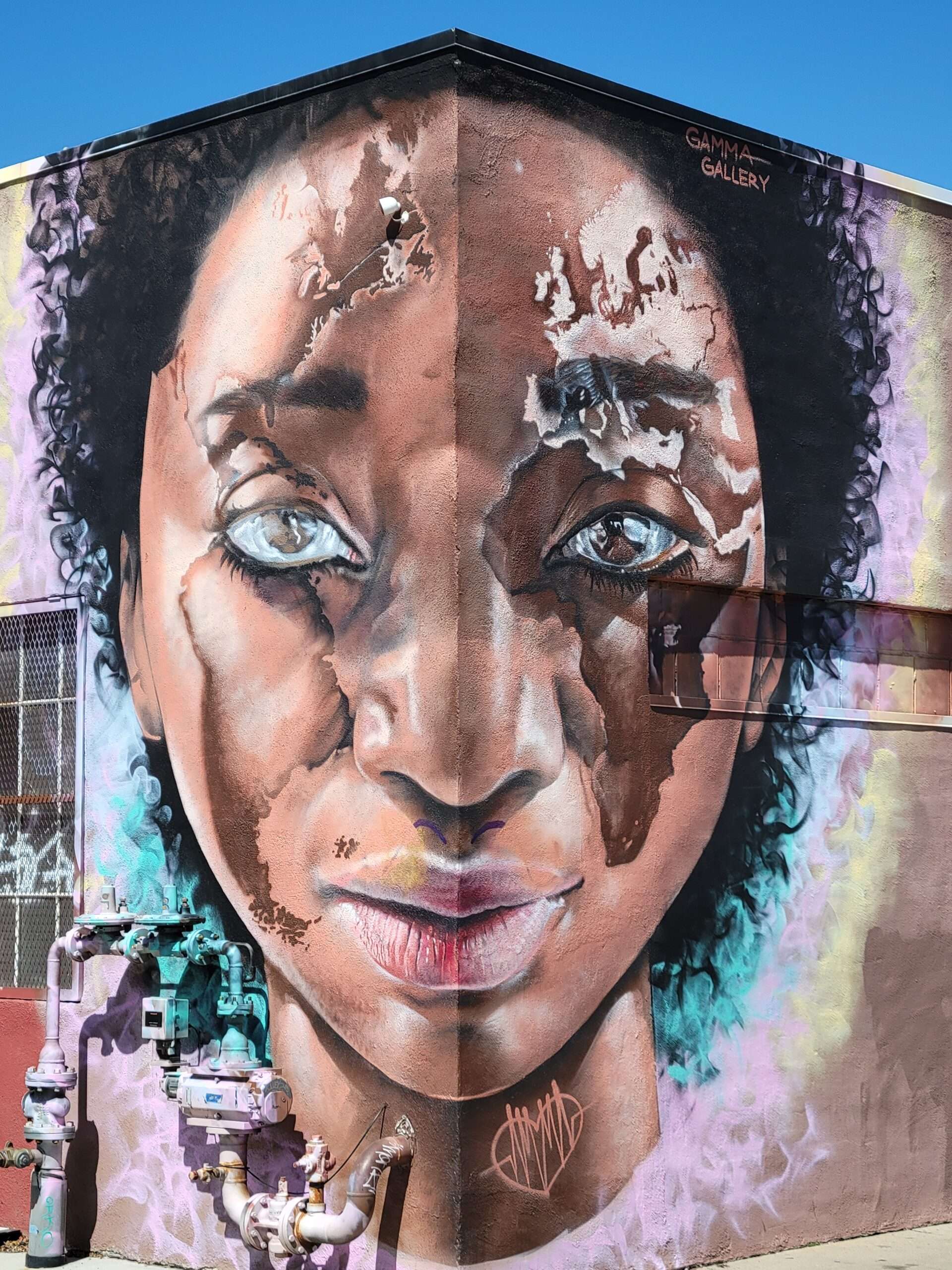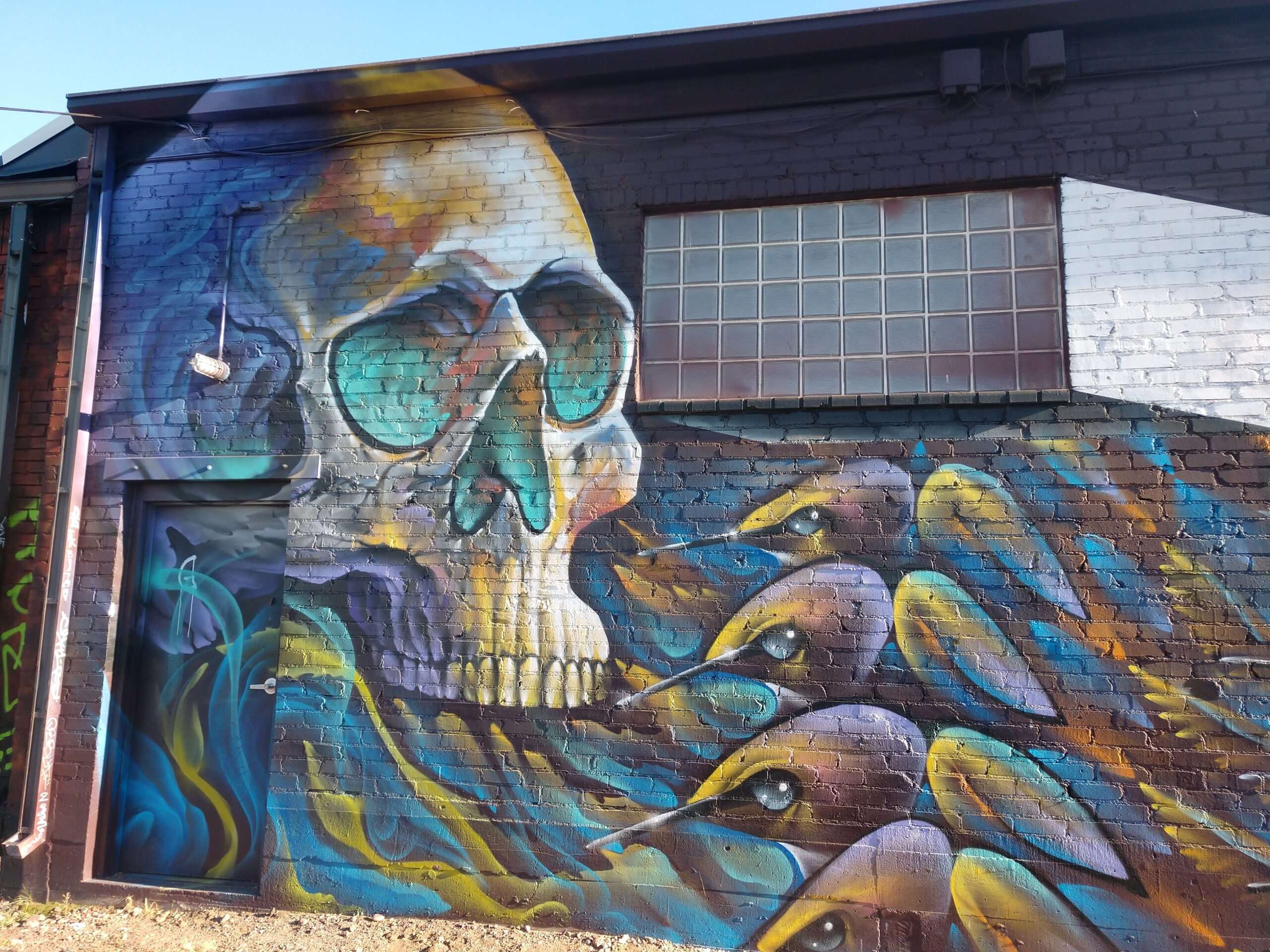 This simplistic but striking piece of street art features a white, abstract face with three eyes painted directly onto a dark grey metal surface in Denver. Rendered with bold black outlines and a subtle, knowing smirk, the enigmatic character transforms an ordinary piece of city infrastructure into a canvas for underground artistic flair.