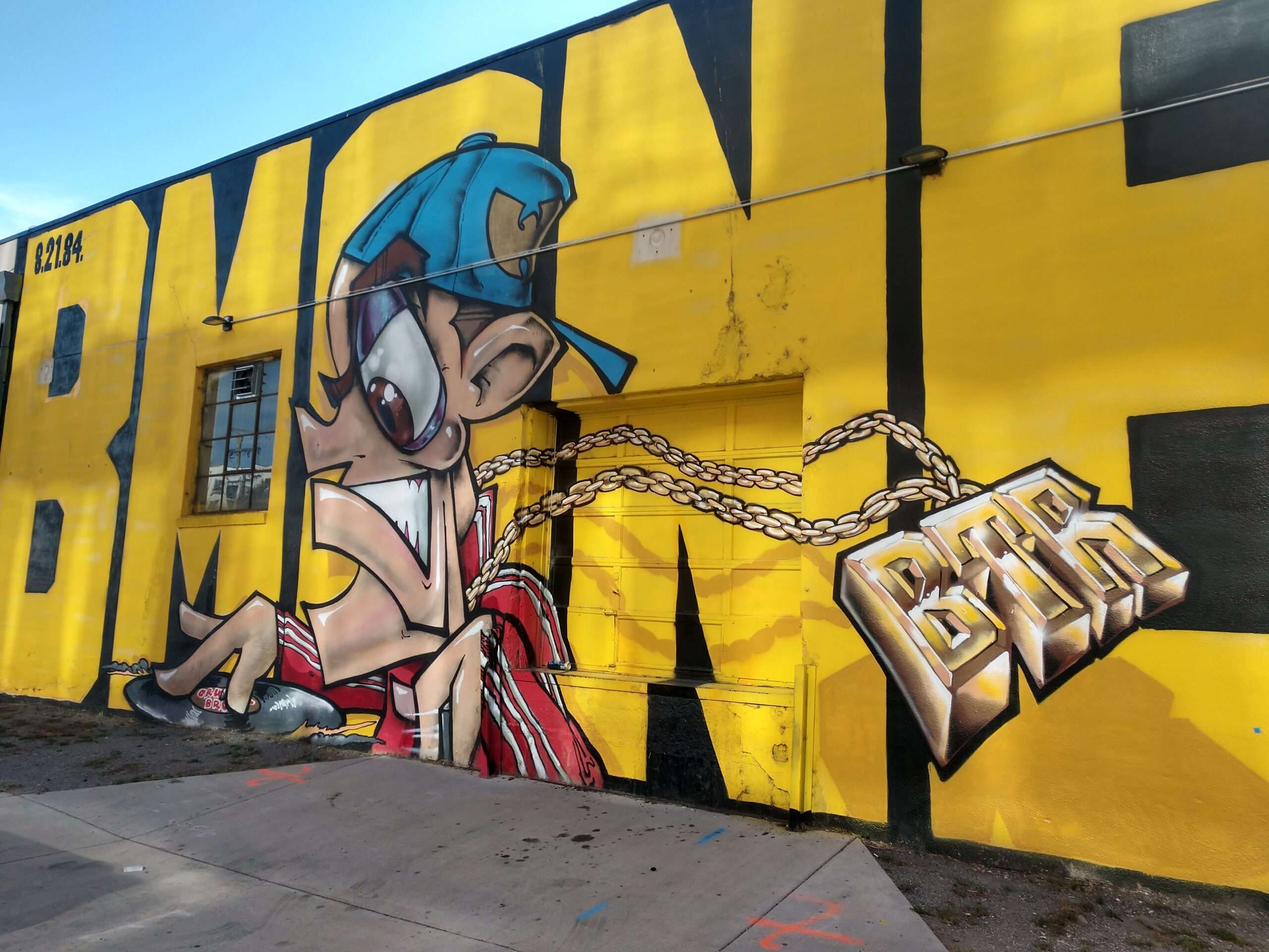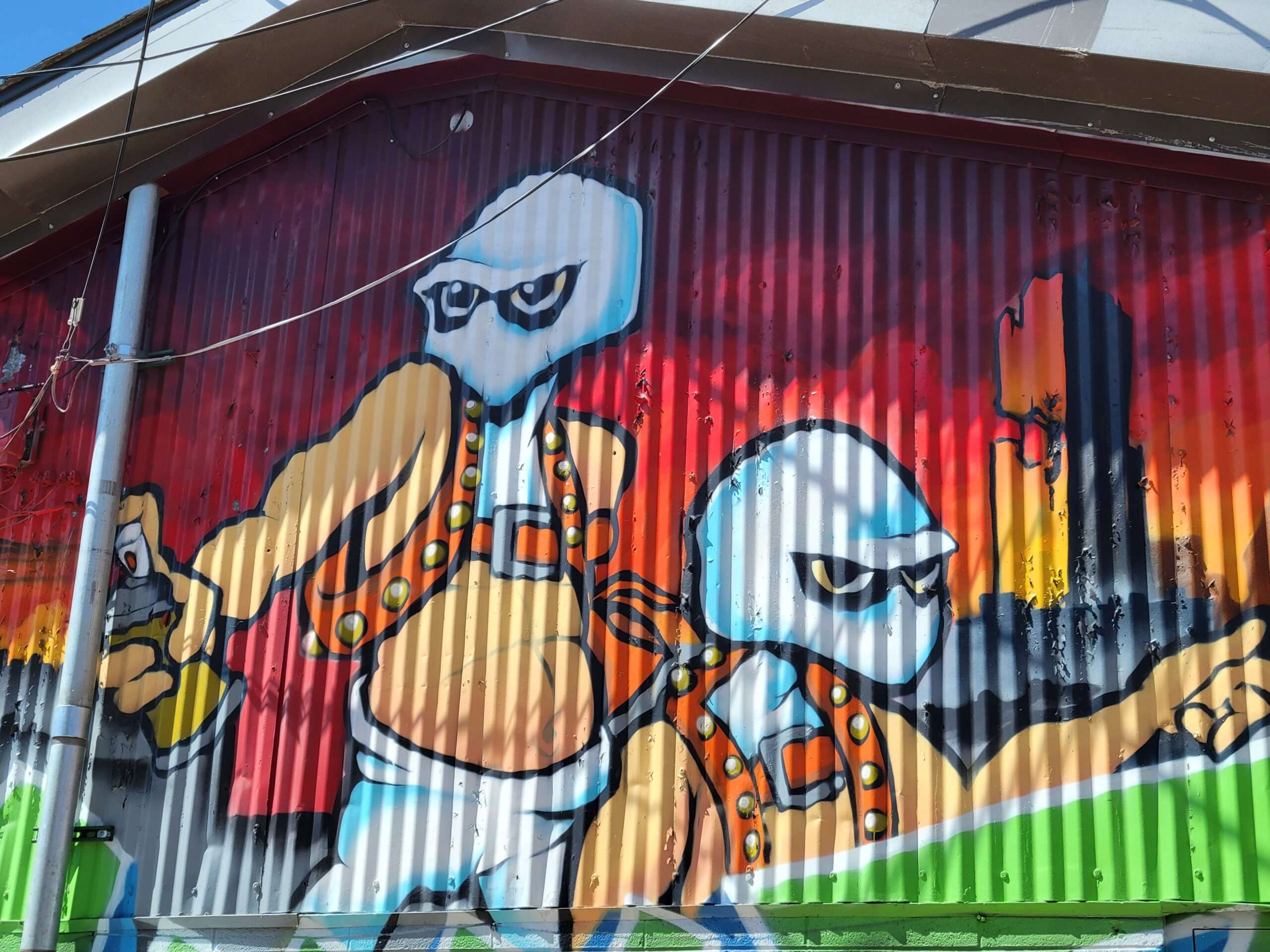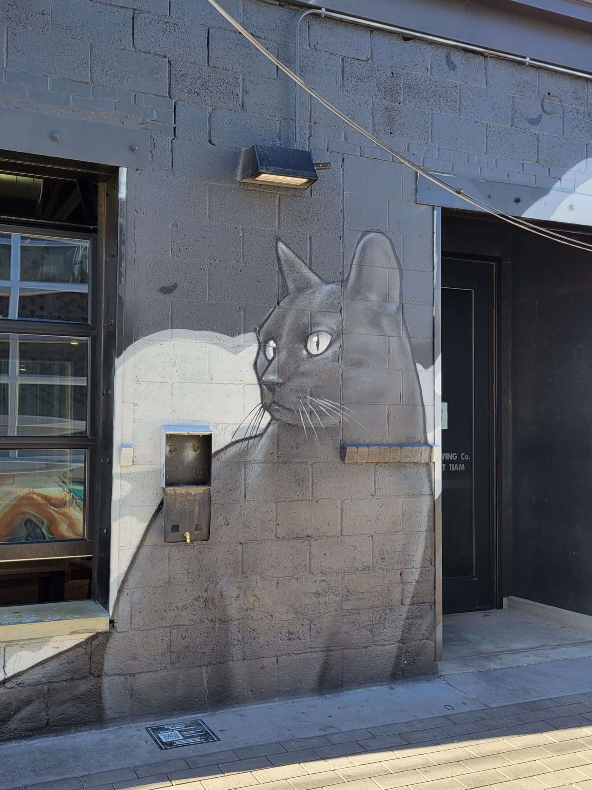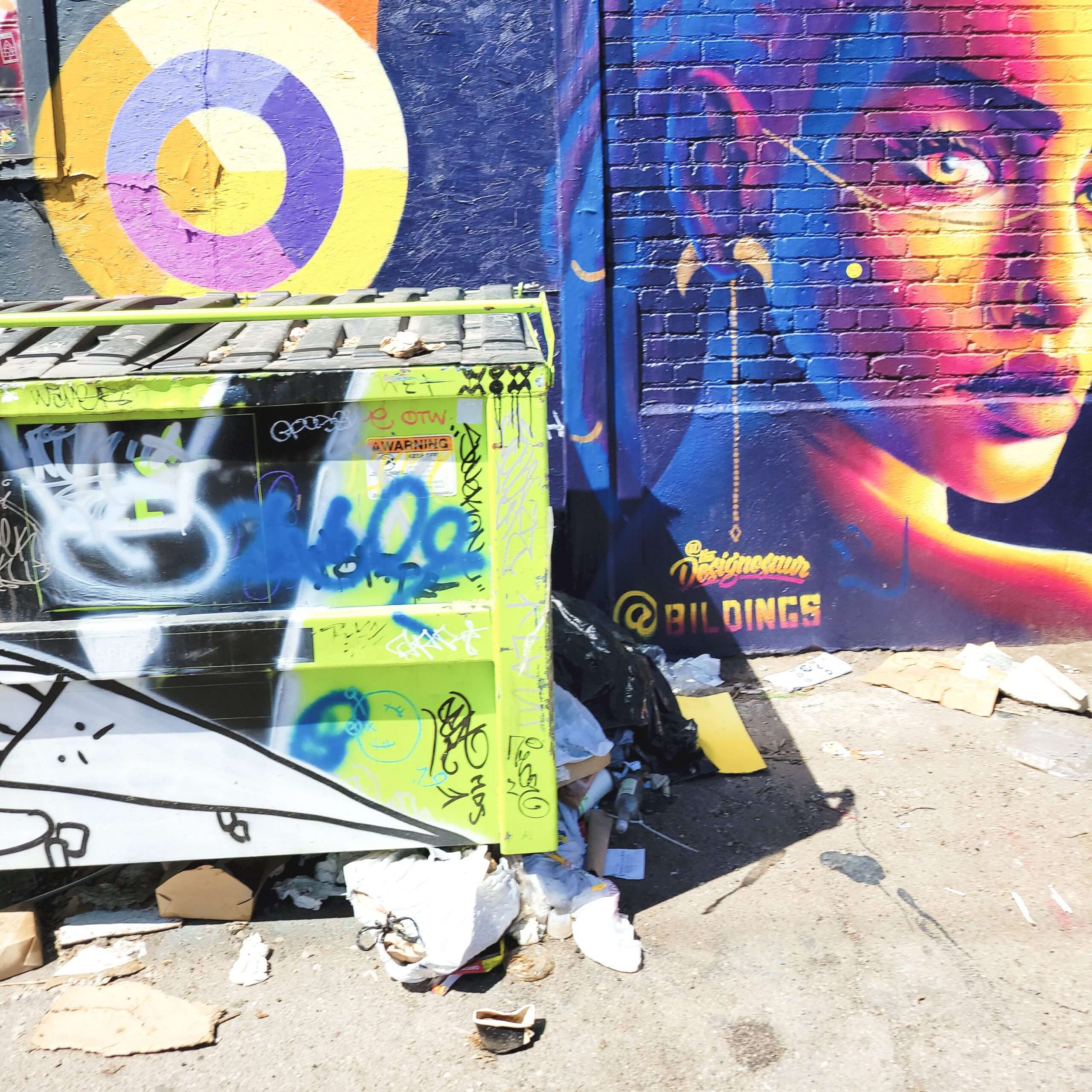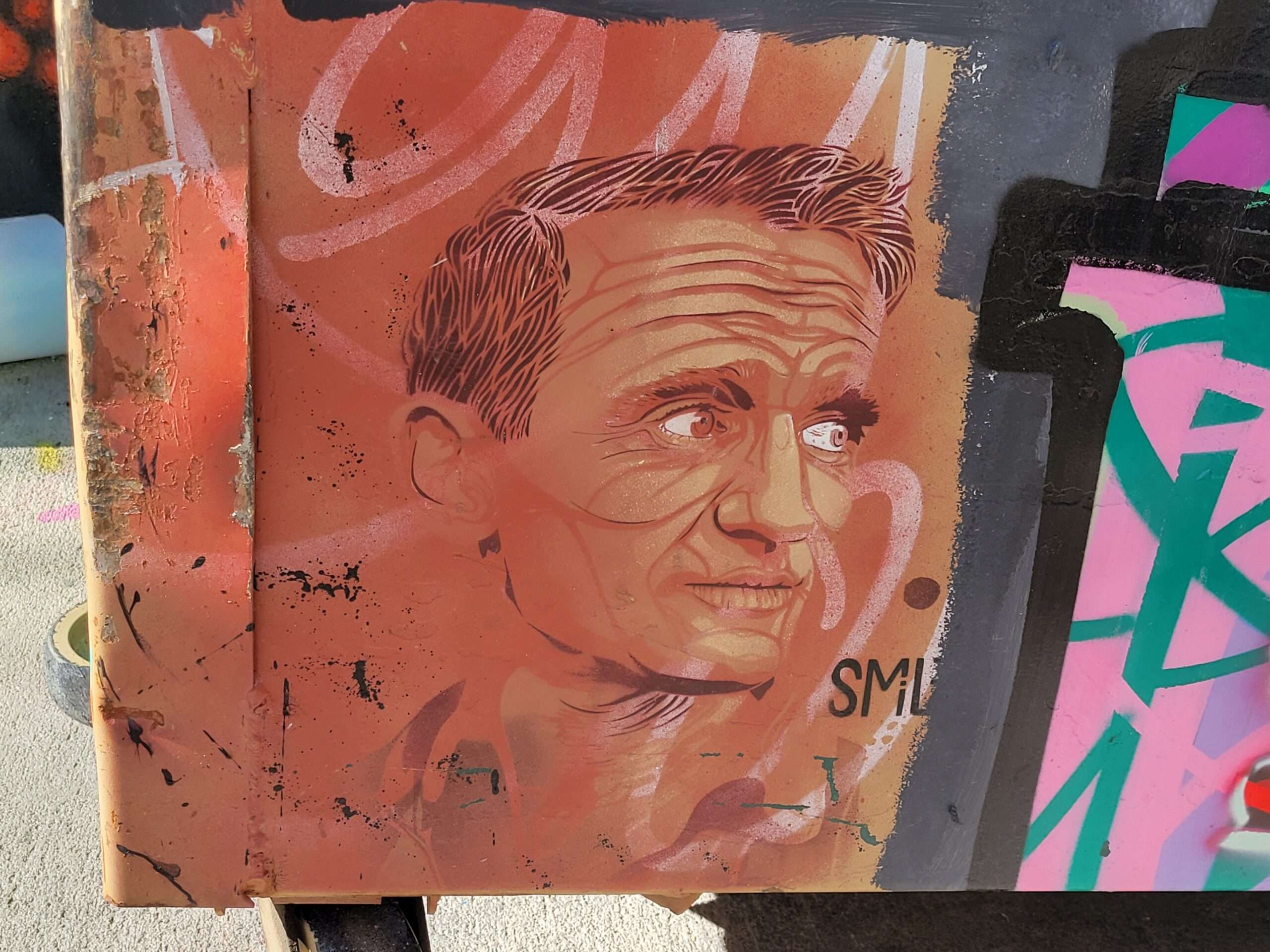 This simplistic but striking piece of street art features a white, abstract face with three eyes painted directly onto a dark grey metal surface in Denver. Rendered with bold black outlines and a subtle, knowing smirk, the enigmatic character transforms an ordinary piece of city infrastructure into a canvas for underground artistic flair.