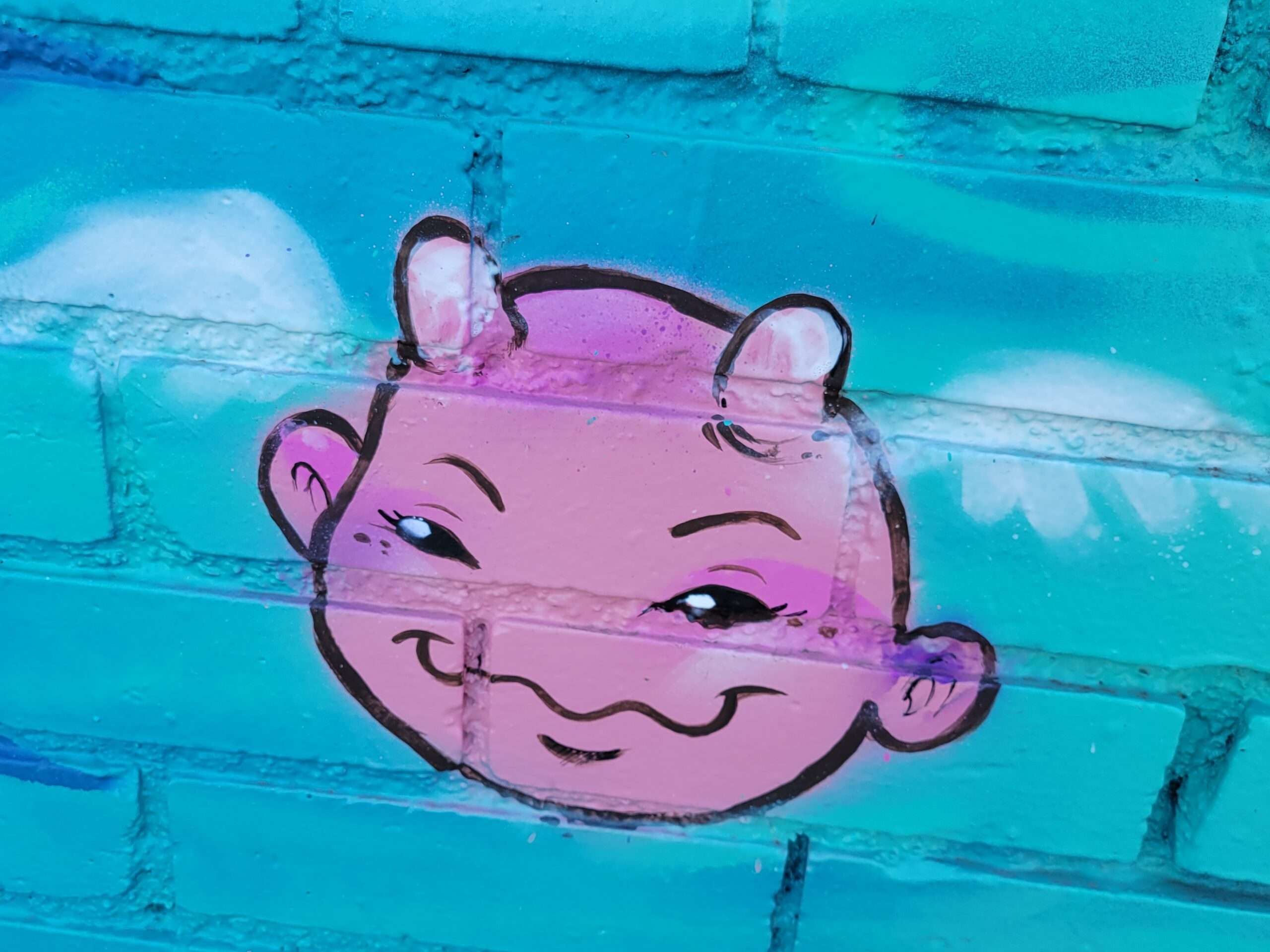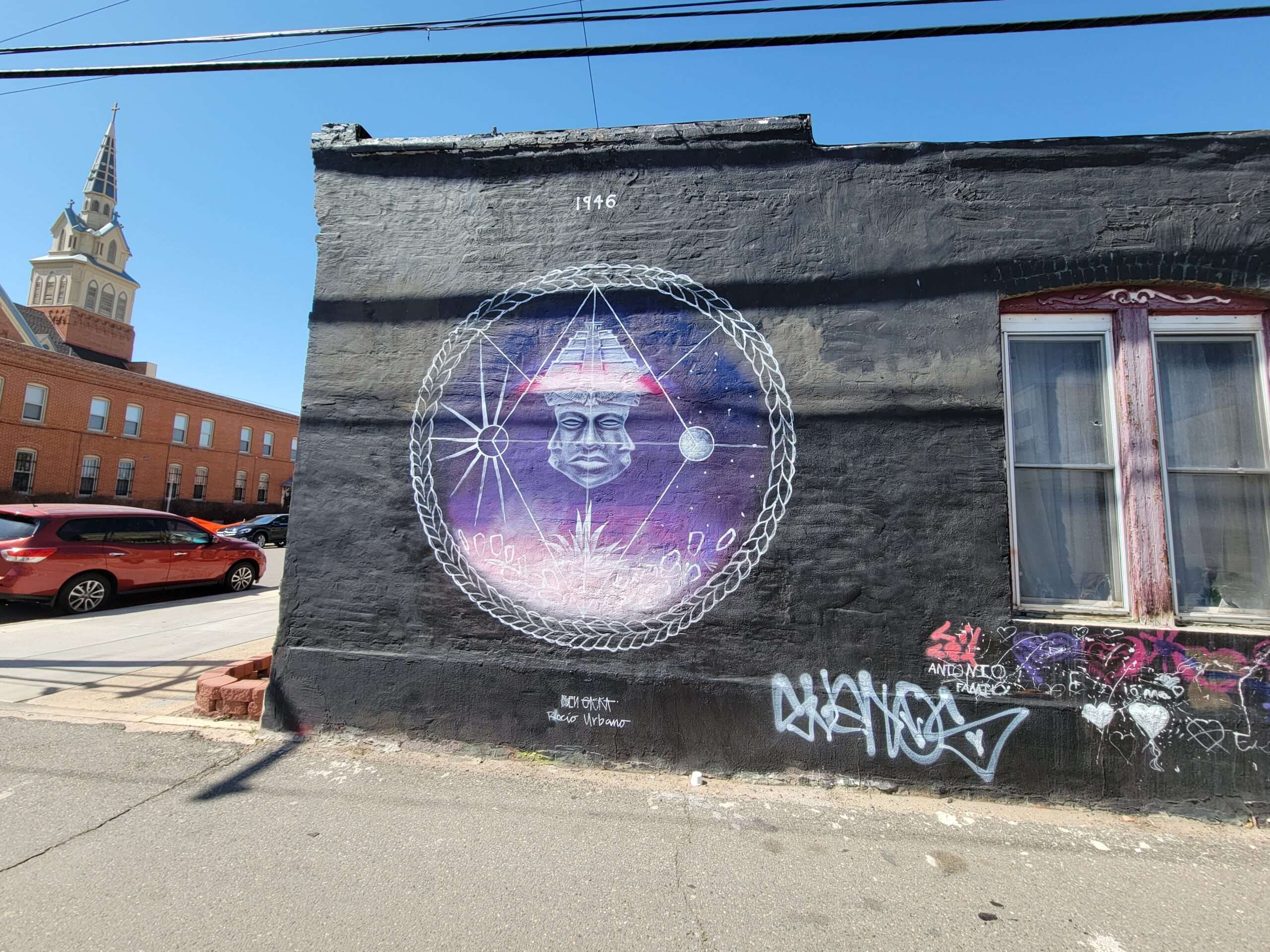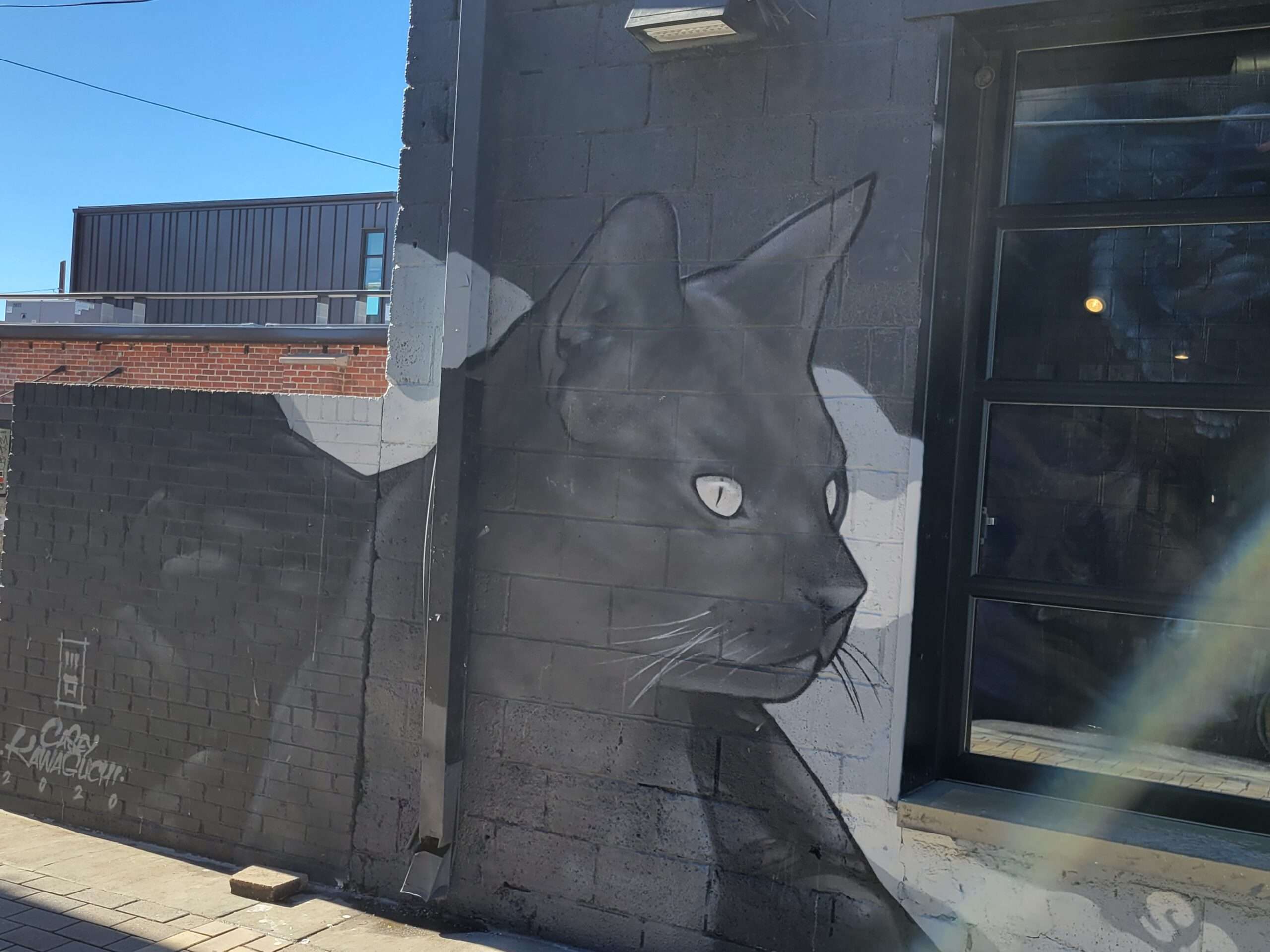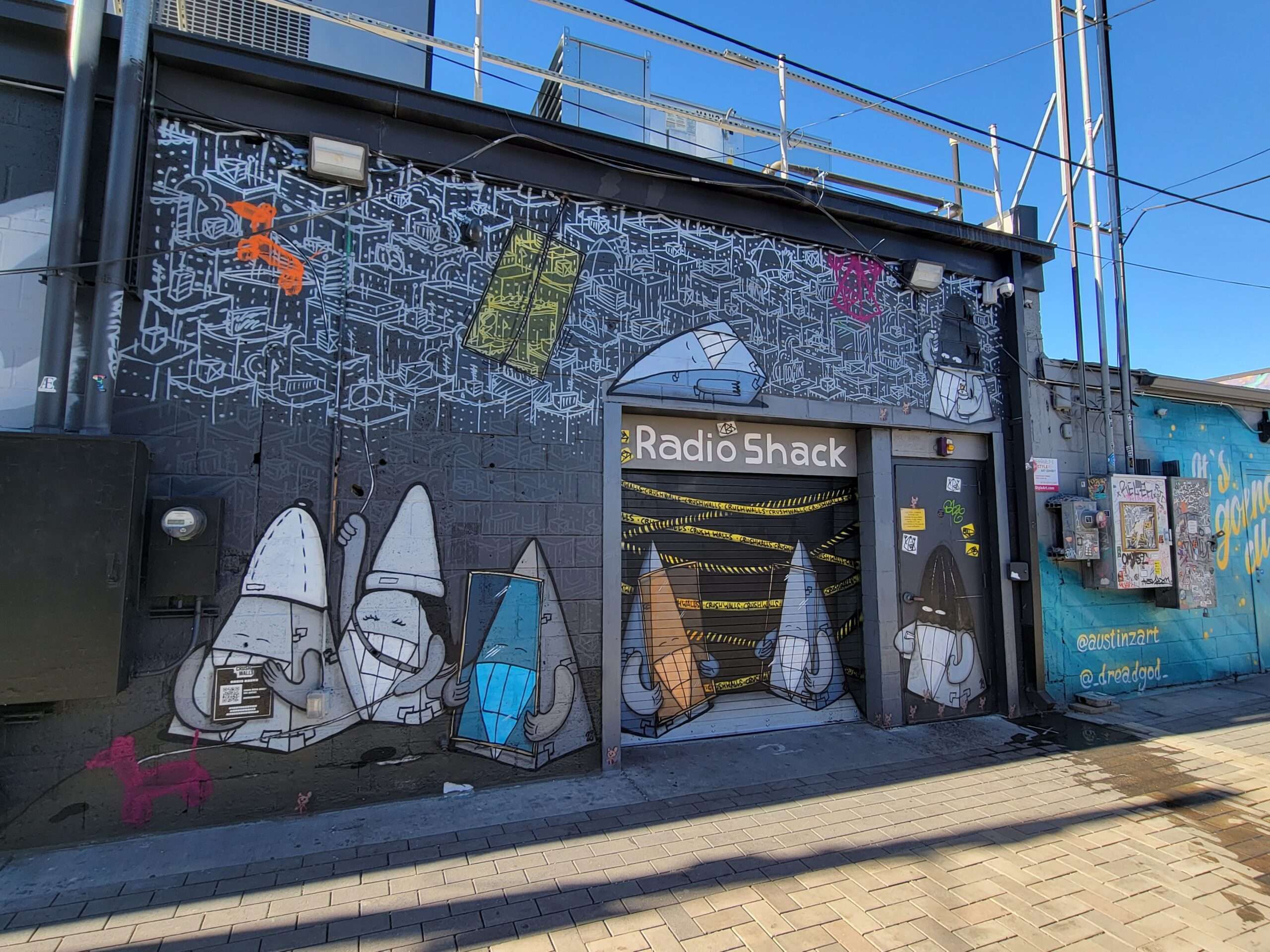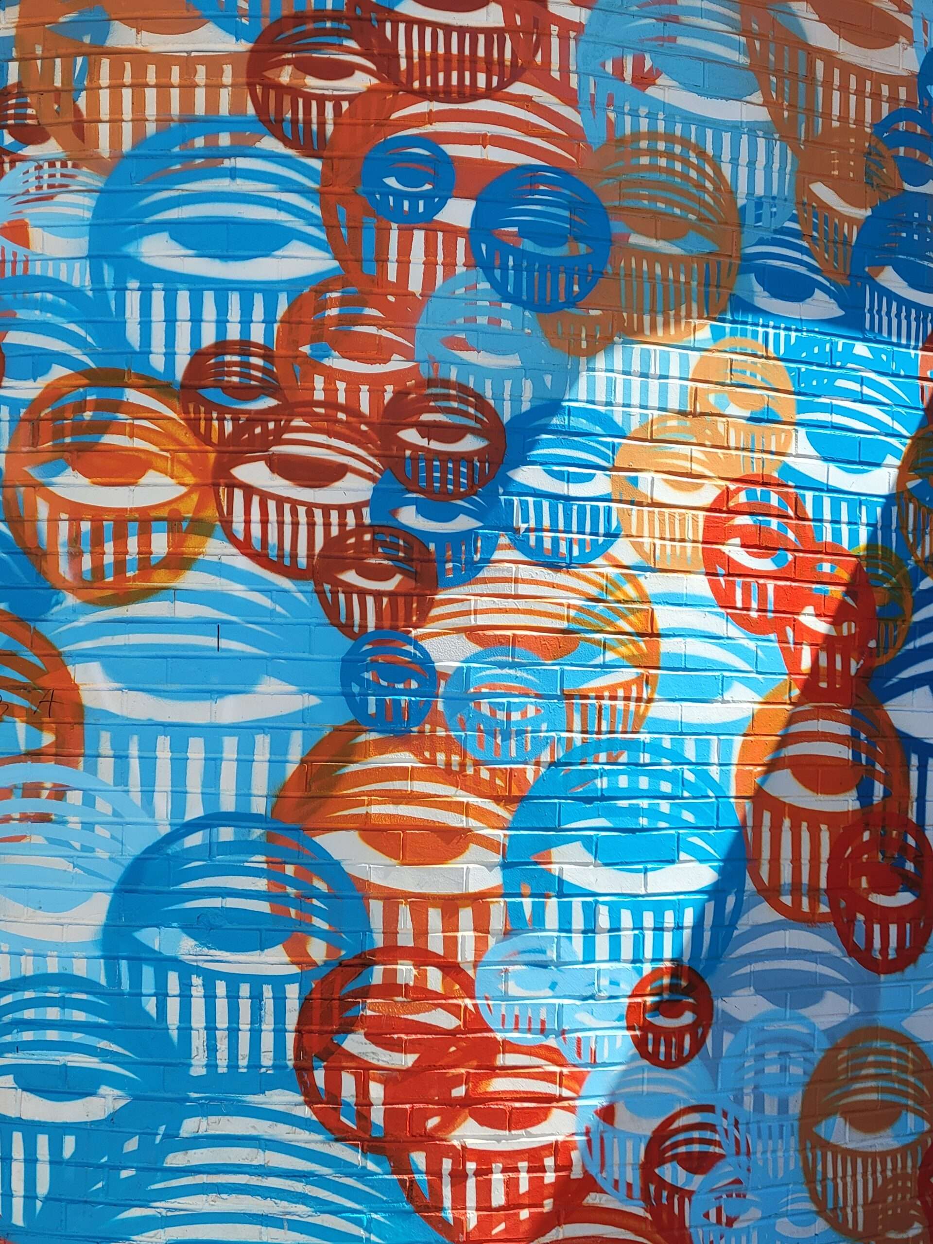 This simplistic but striking piece of street art features a white, abstract face with three eyes painted directly onto a dark grey metal surface in Denver. Rendered with bold black outlines and a subtle, knowing smirk, the enigmatic character transforms an ordinary piece of city infrastructure into a canvas for underground artistic flair.