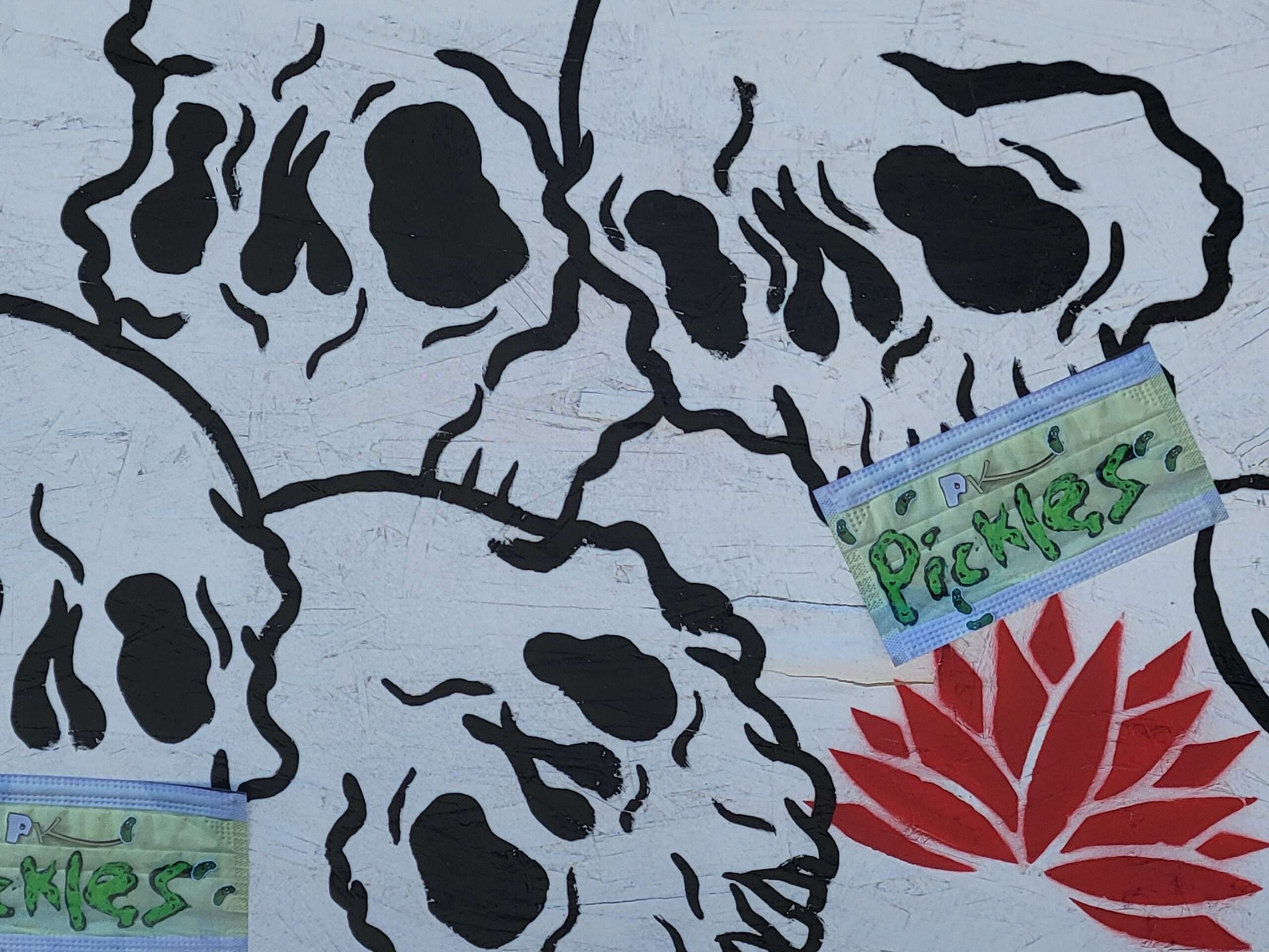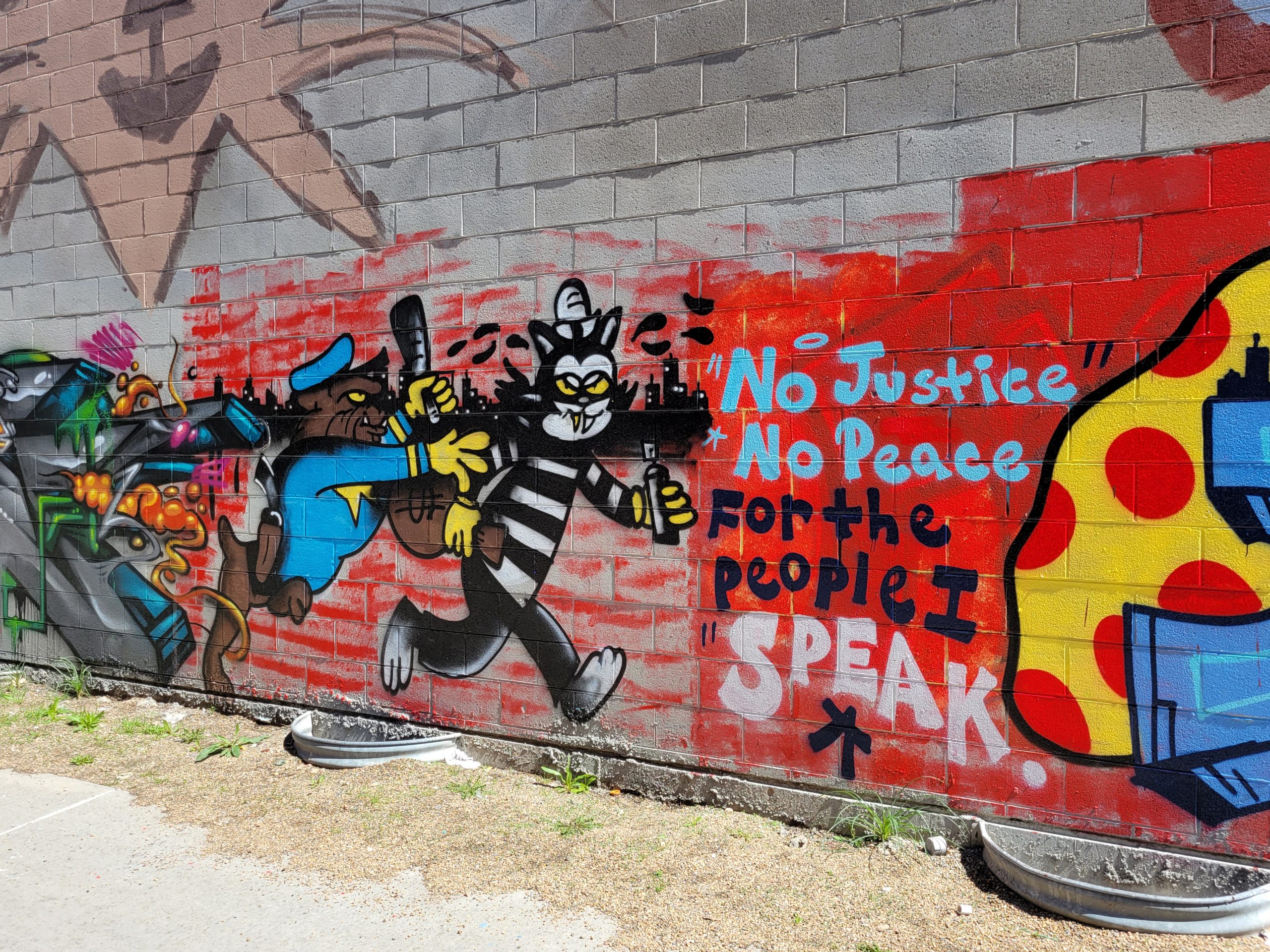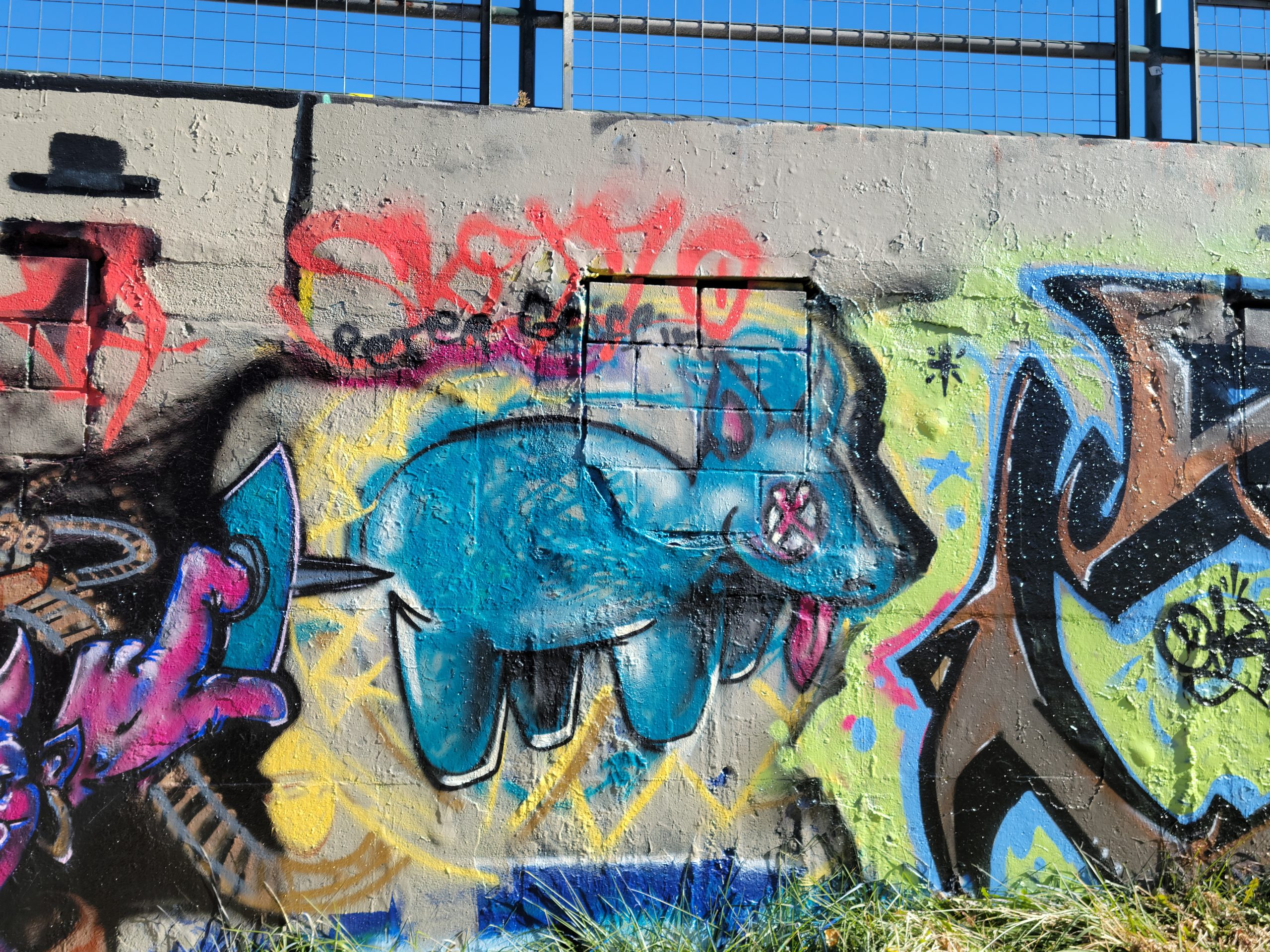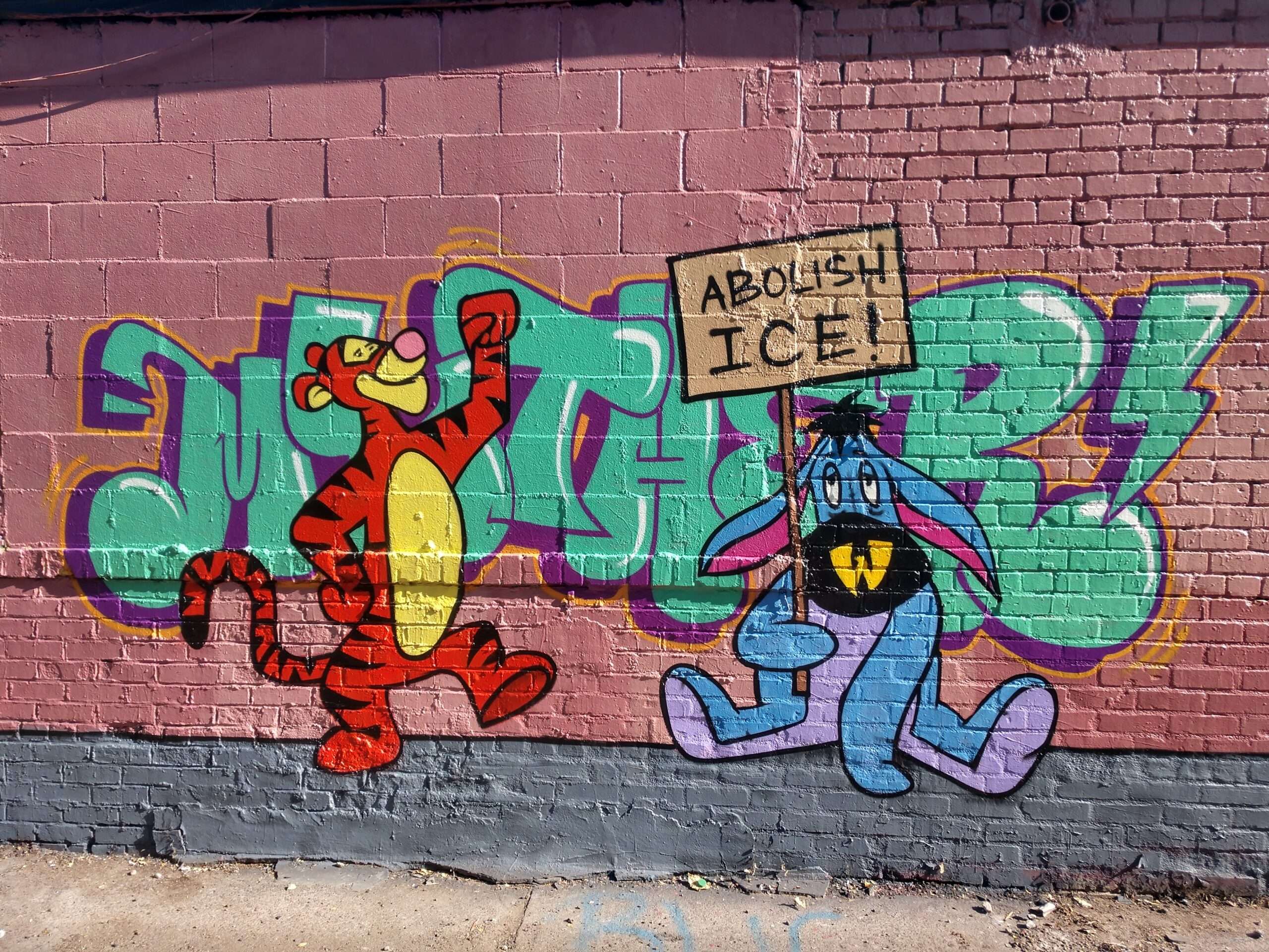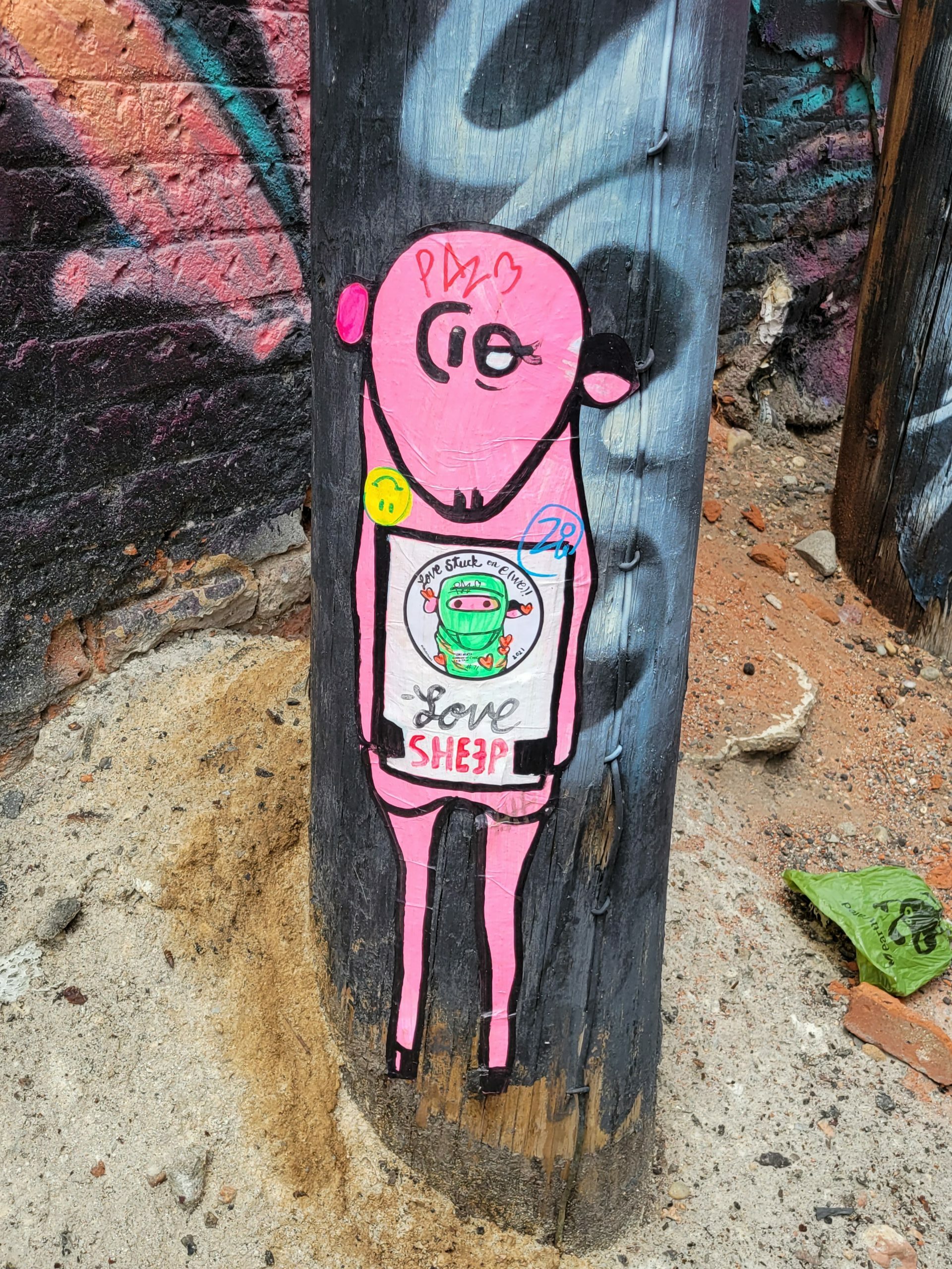 This simplistic but striking piece of street art features a white, abstract face with three eyes painted directly onto a dark grey metal surface in Denver. Rendered with bold black outlines and a subtle, knowing smirk, the enigmatic character transforms an ordinary piece of city infrastructure into a canvas for underground artistic flair.