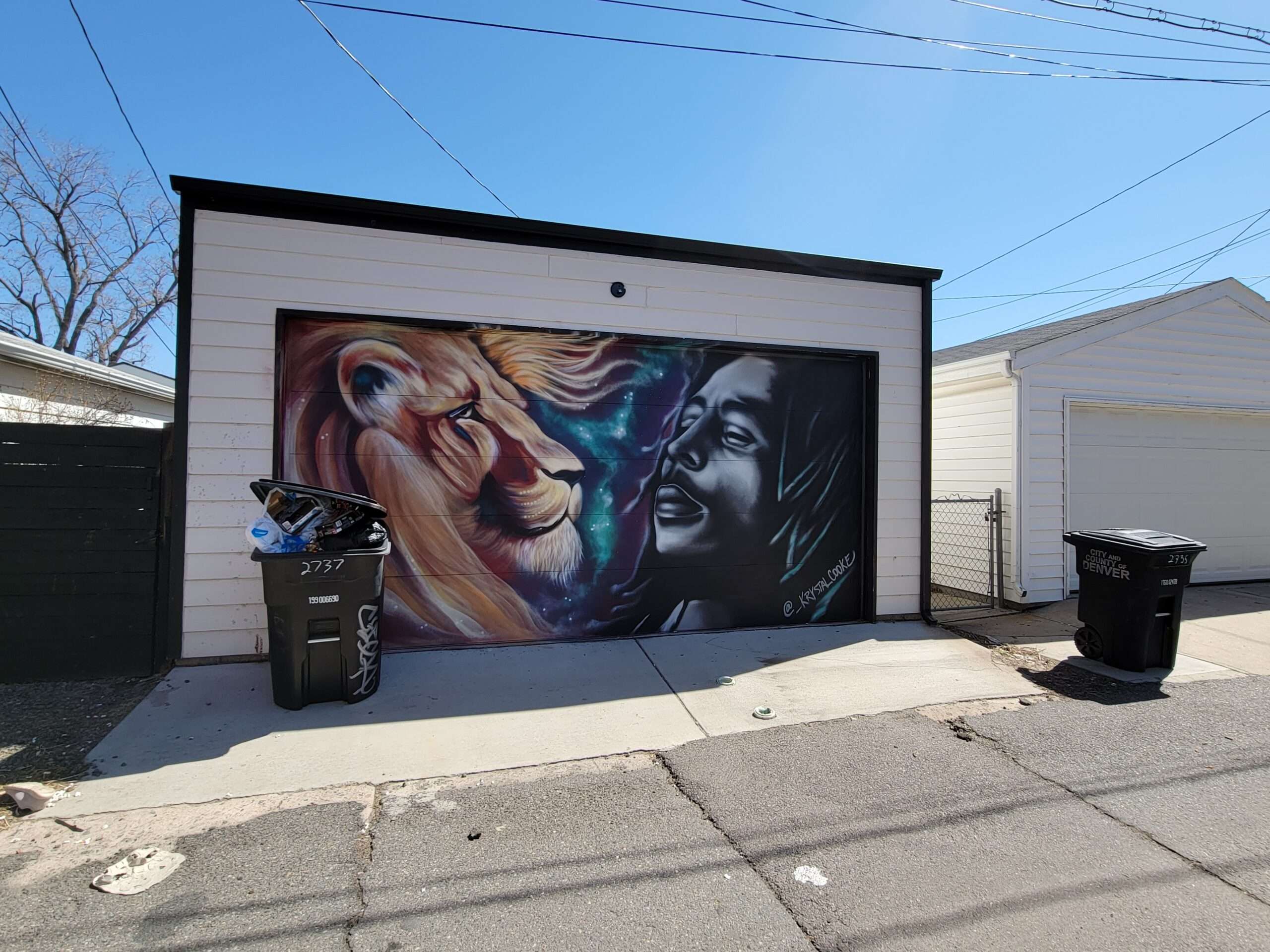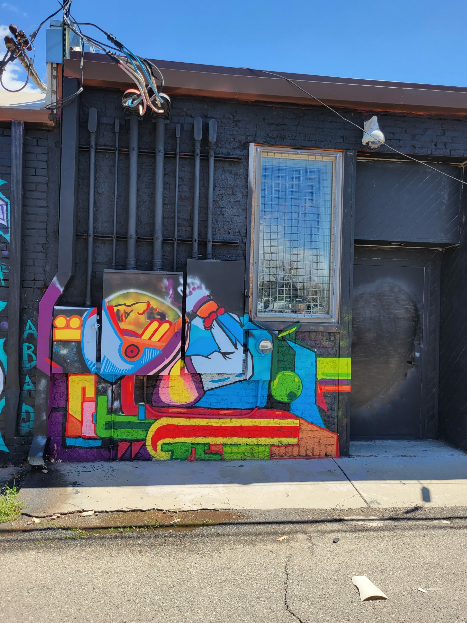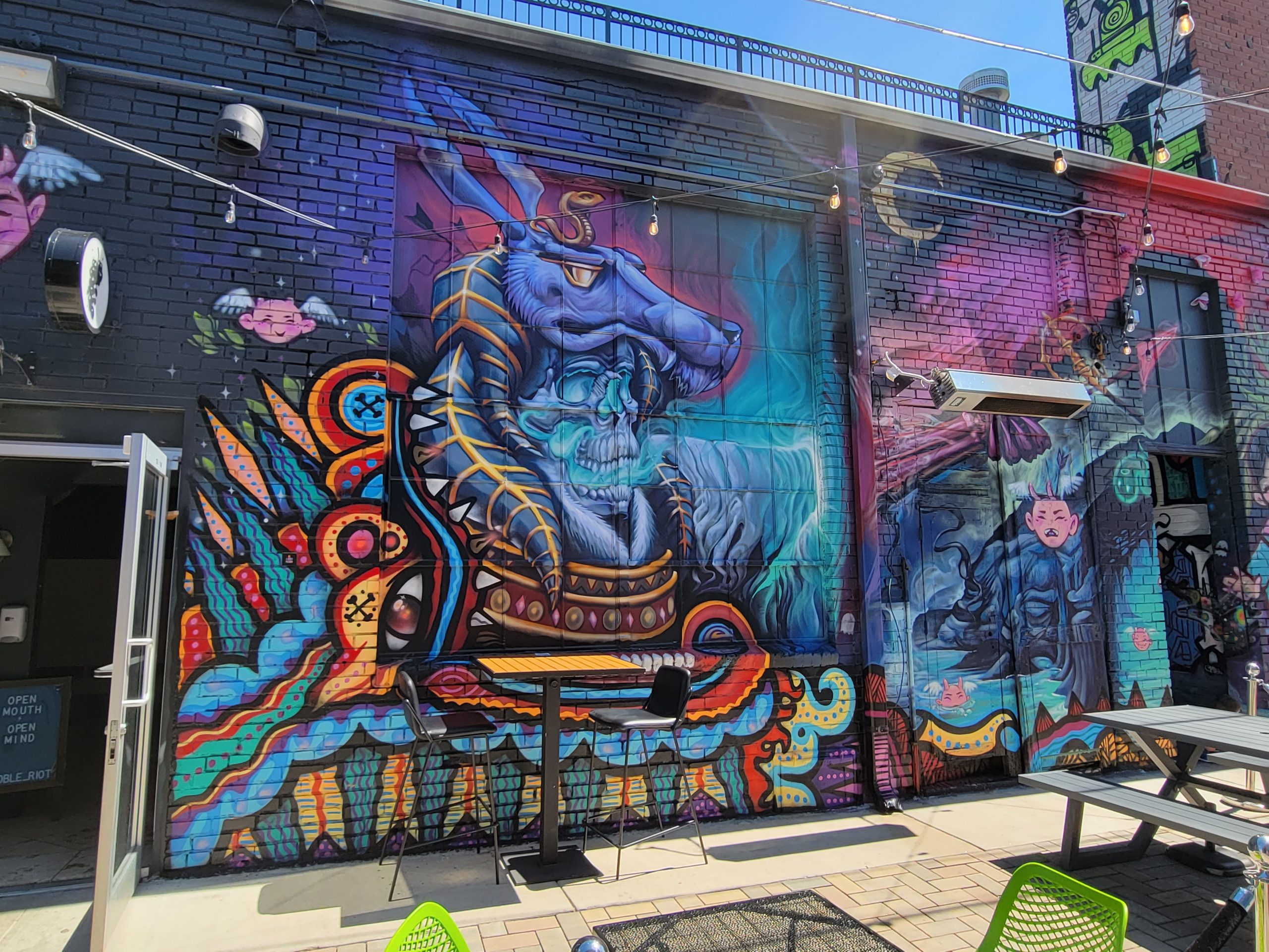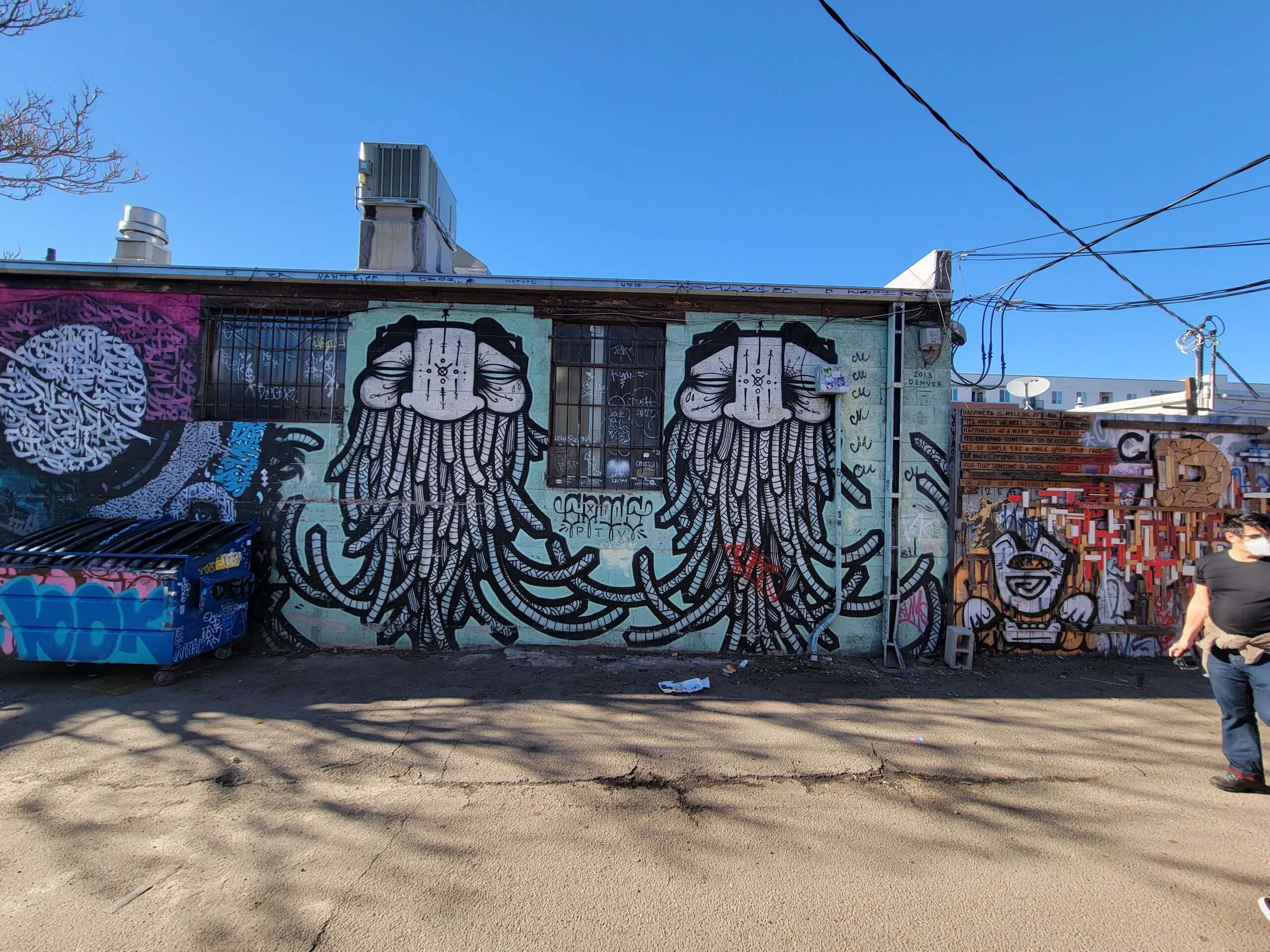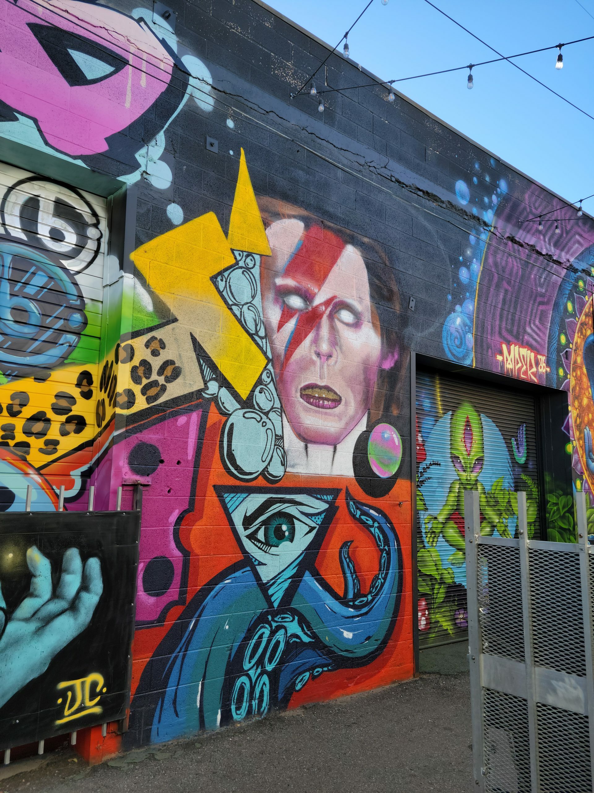This expansive and colorful piece of Denver street art features a striking portrait of David Bowie with his iconic red lightning bolt makeup and blank white eyes. The surreal mural is packed with eclectic imagery, including an all-seeing eye hovering over blue octopus tentacles, floating bubbles, leopard print patterns, and a green meditating alien painted on an adjacent corrugated garage door. Strung patio lights hang above the dark brick canvas, illuminating this incredibly vibrant and imaginative urban masterpiece.