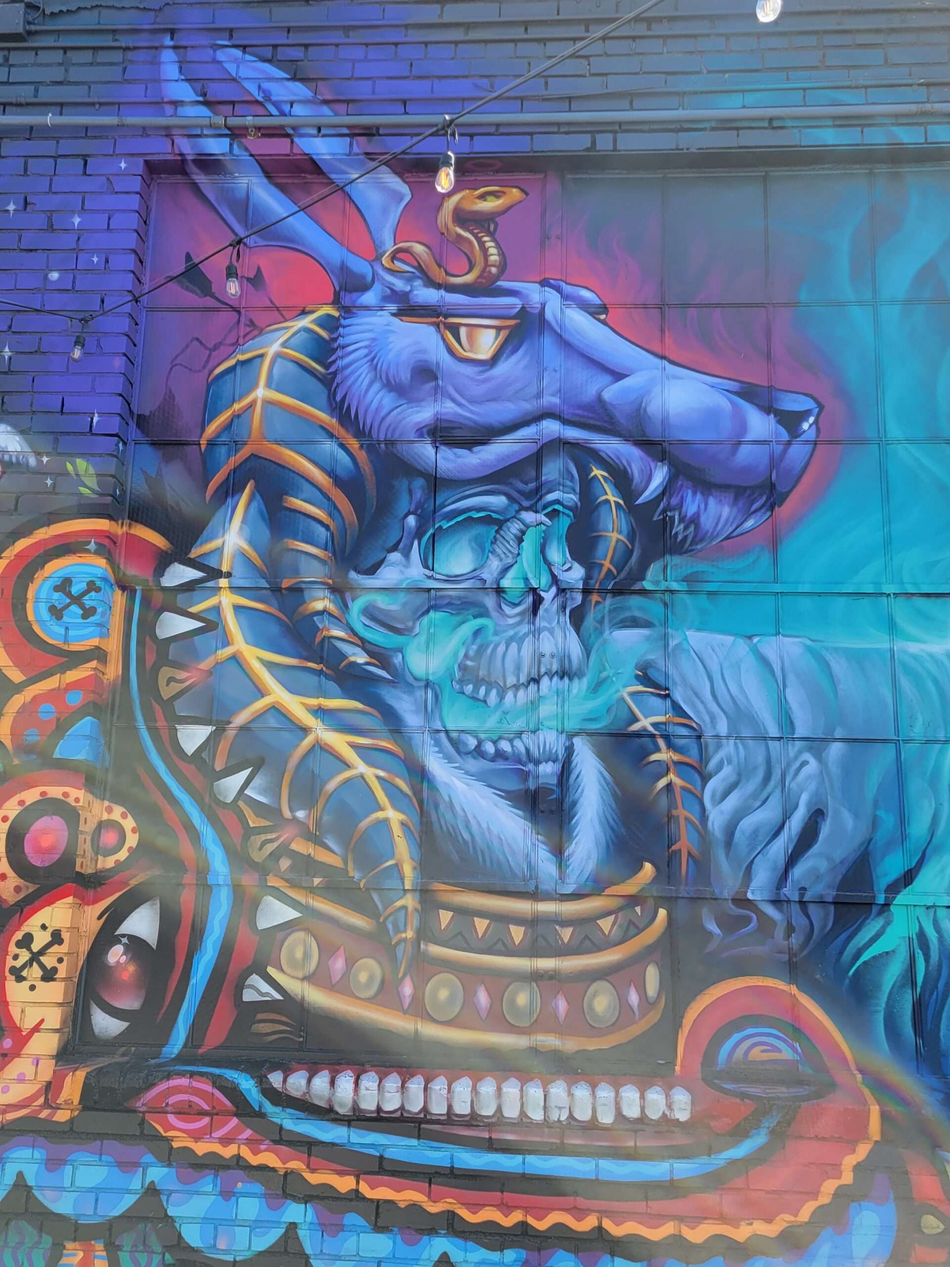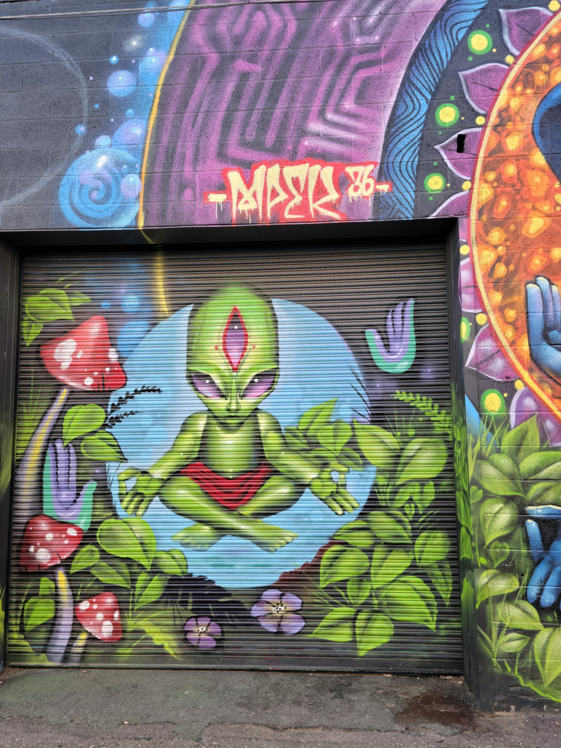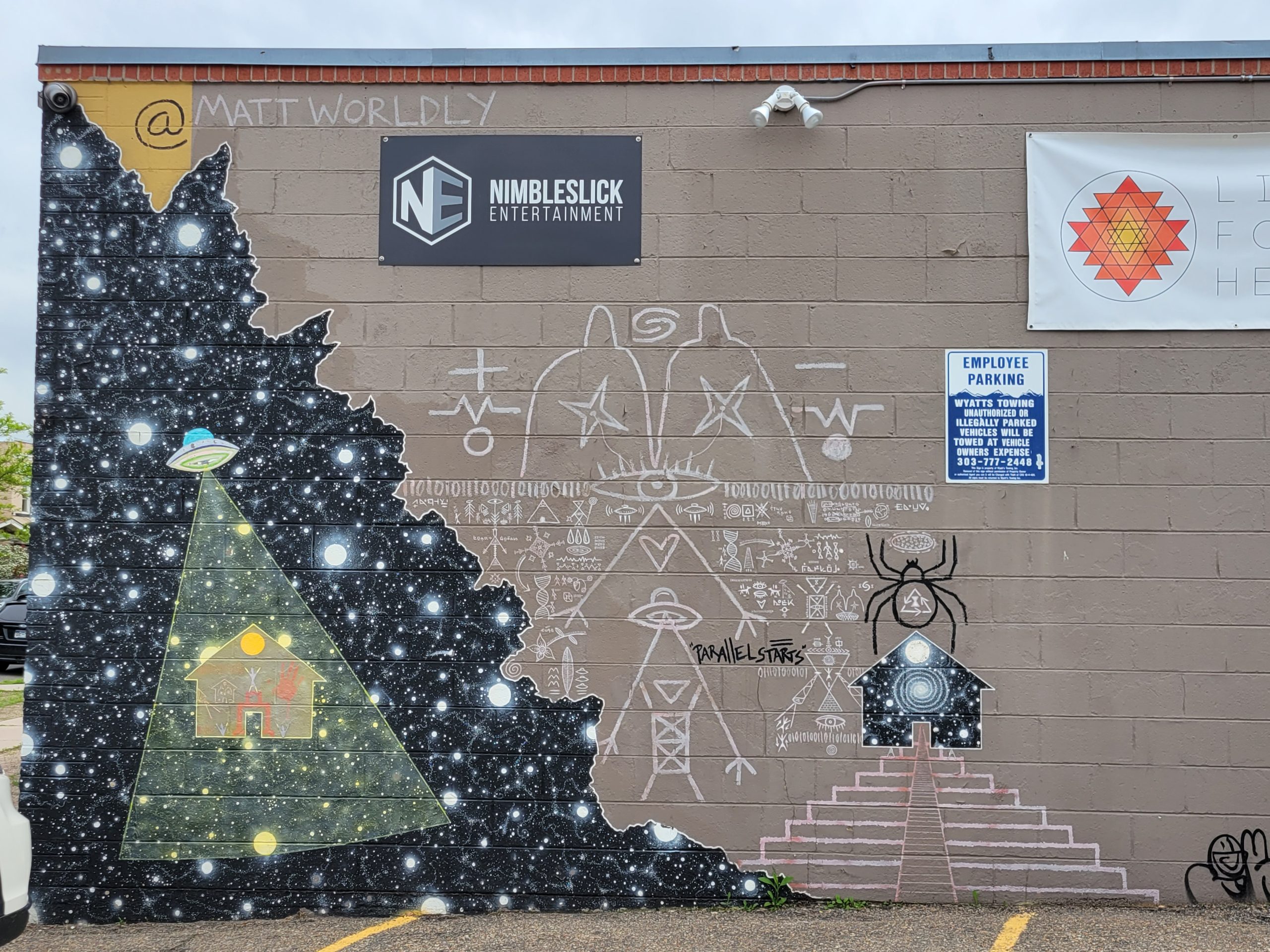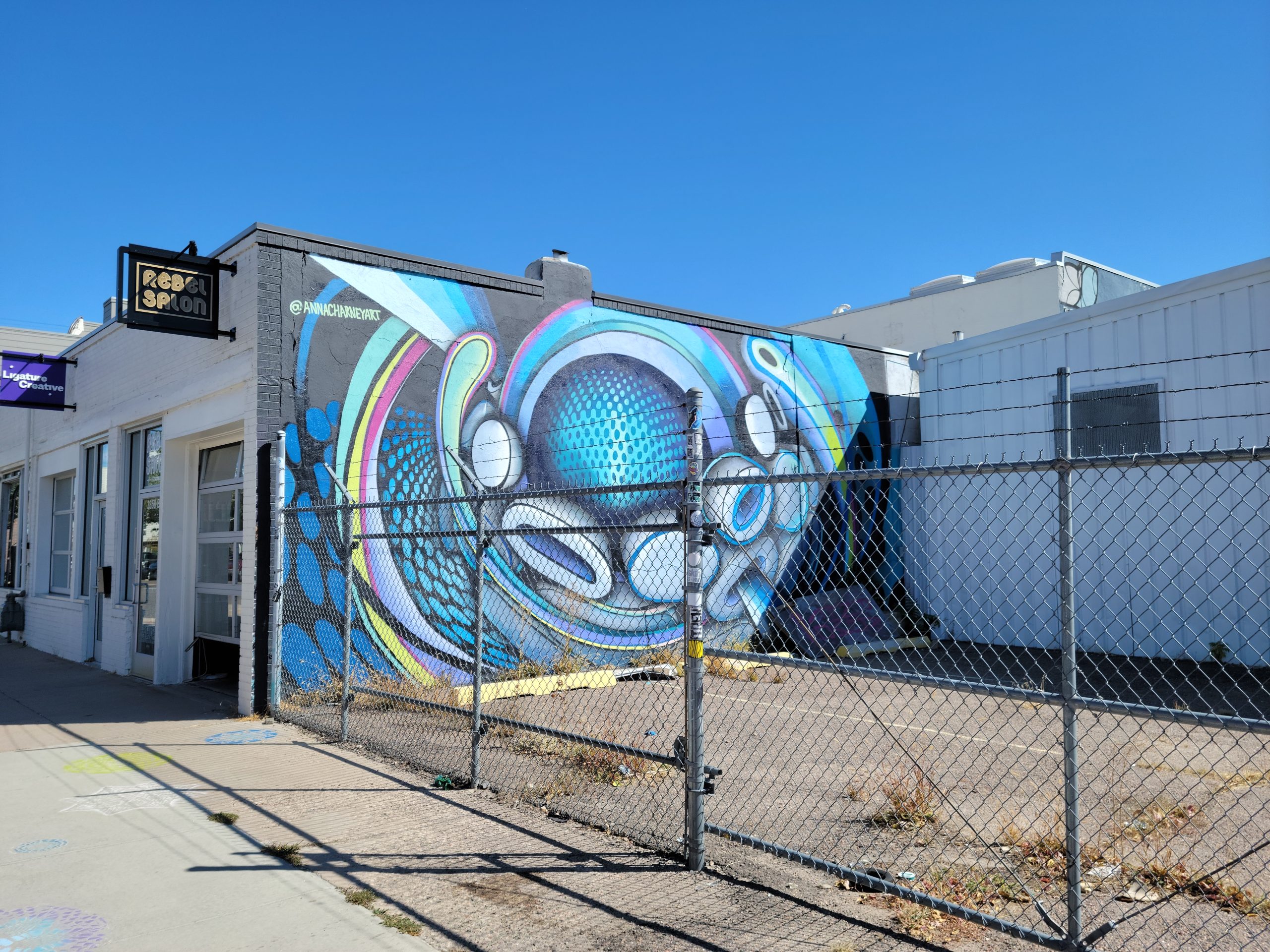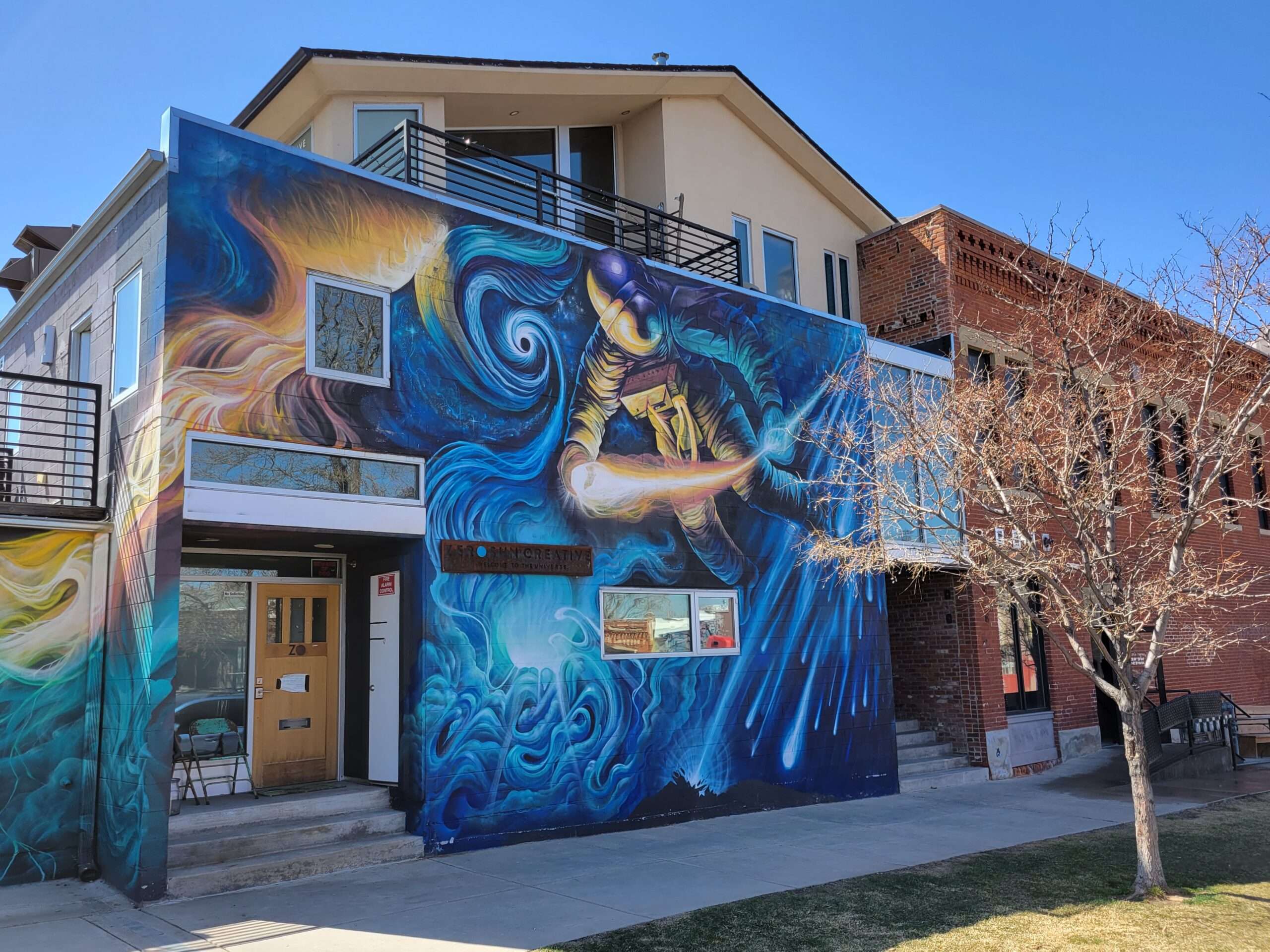 This expansive and colorful piece of Denver street art features a striking portrait of David Bowie with his iconic red lightning bolt makeup and blank white eyes. The surreal mural is packed with eclectic imagery, including an all-seeing eye hovering over blue octopus tentacles, floating bubbles, leopard print patterns, and a green meditating alien painted on an adjacent corrugated garage door. Strung patio lights hang above the dark brick canvas, illuminating this incredibly vibrant and imaginative urban masterpiece.