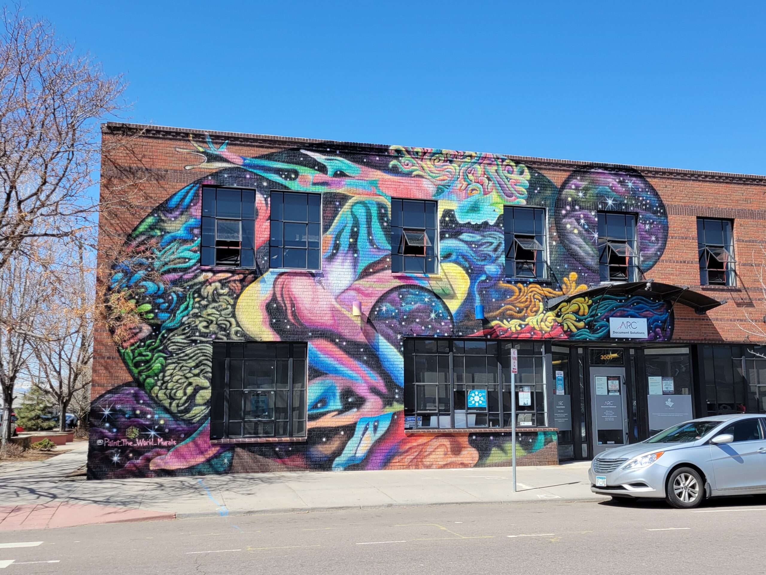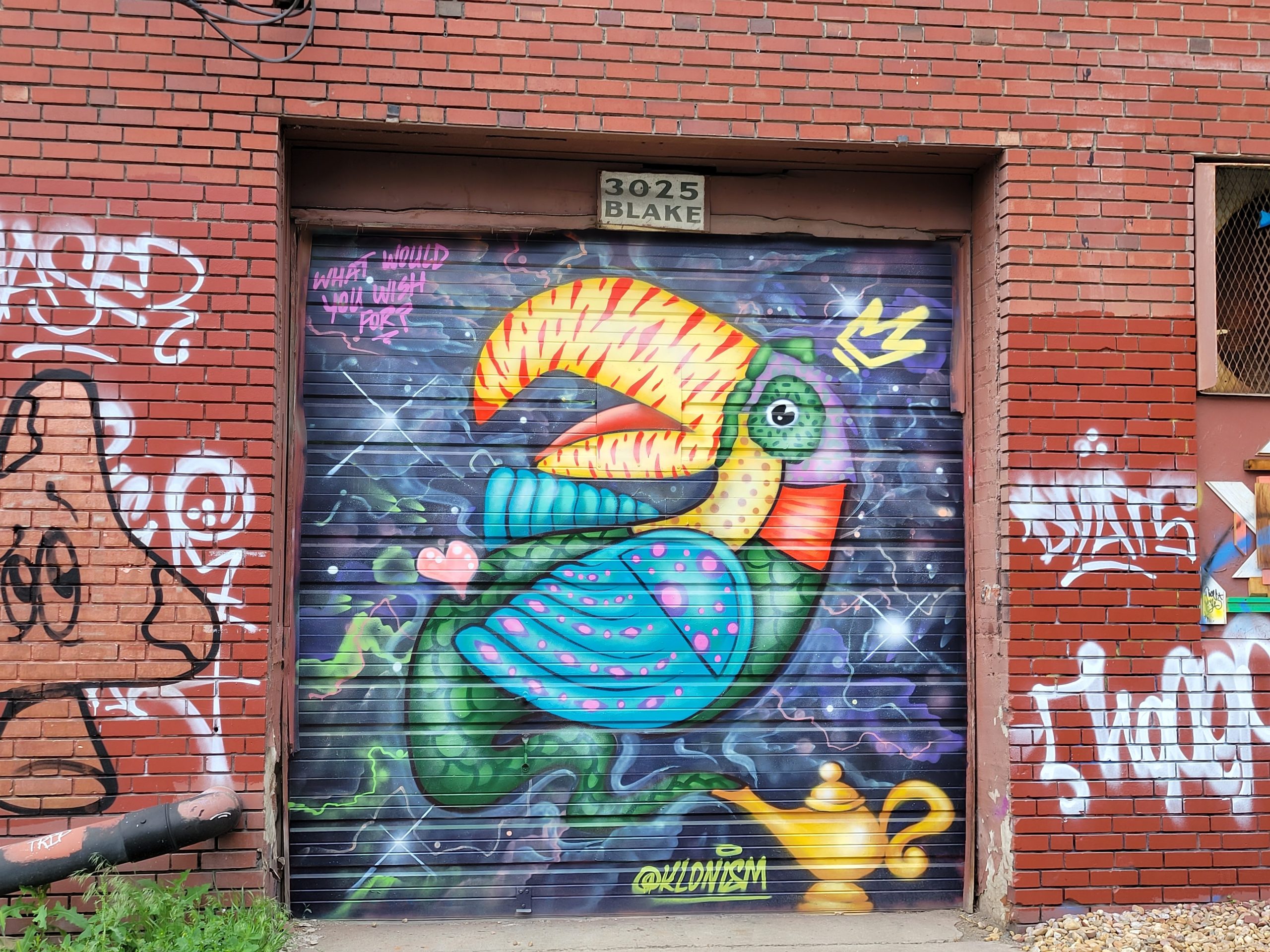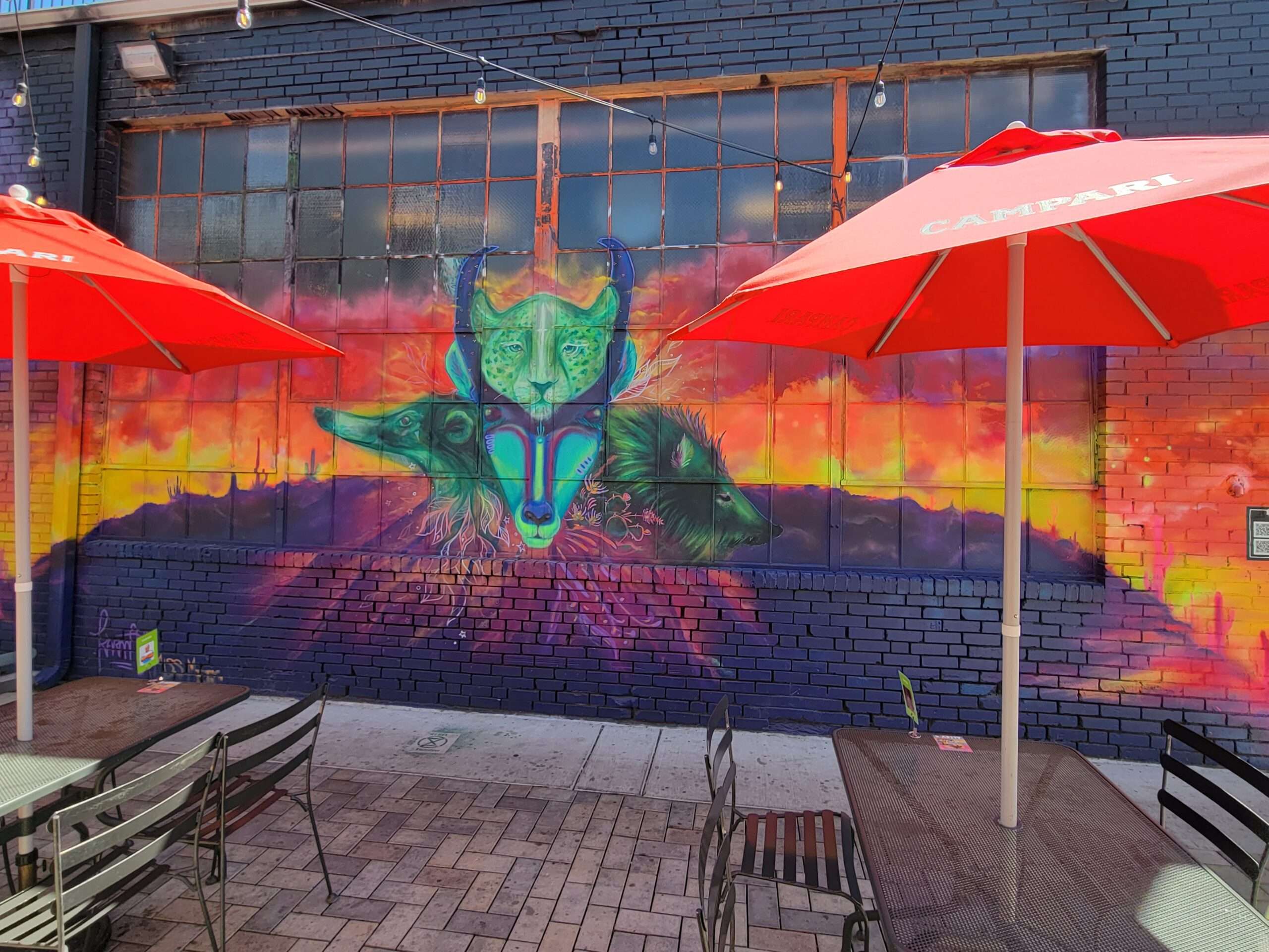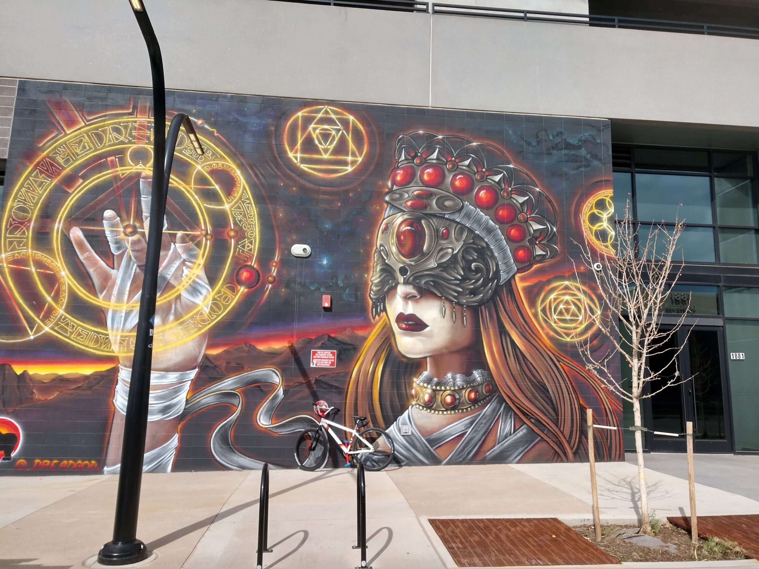 This expansive and colorful piece of Denver street art features a striking portrait of David Bowie with his iconic red lightning bolt makeup and blank white eyes. The surreal mural is packed with eclectic imagery, including an all-seeing eye hovering over blue octopus tentacles, floating bubbles, leopard print patterns, and a green meditating alien painted on an adjacent corrugated garage door. Strung patio lights hang above the dark brick canvas, illuminating this incredibly vibrant and imaginative urban masterpiece.