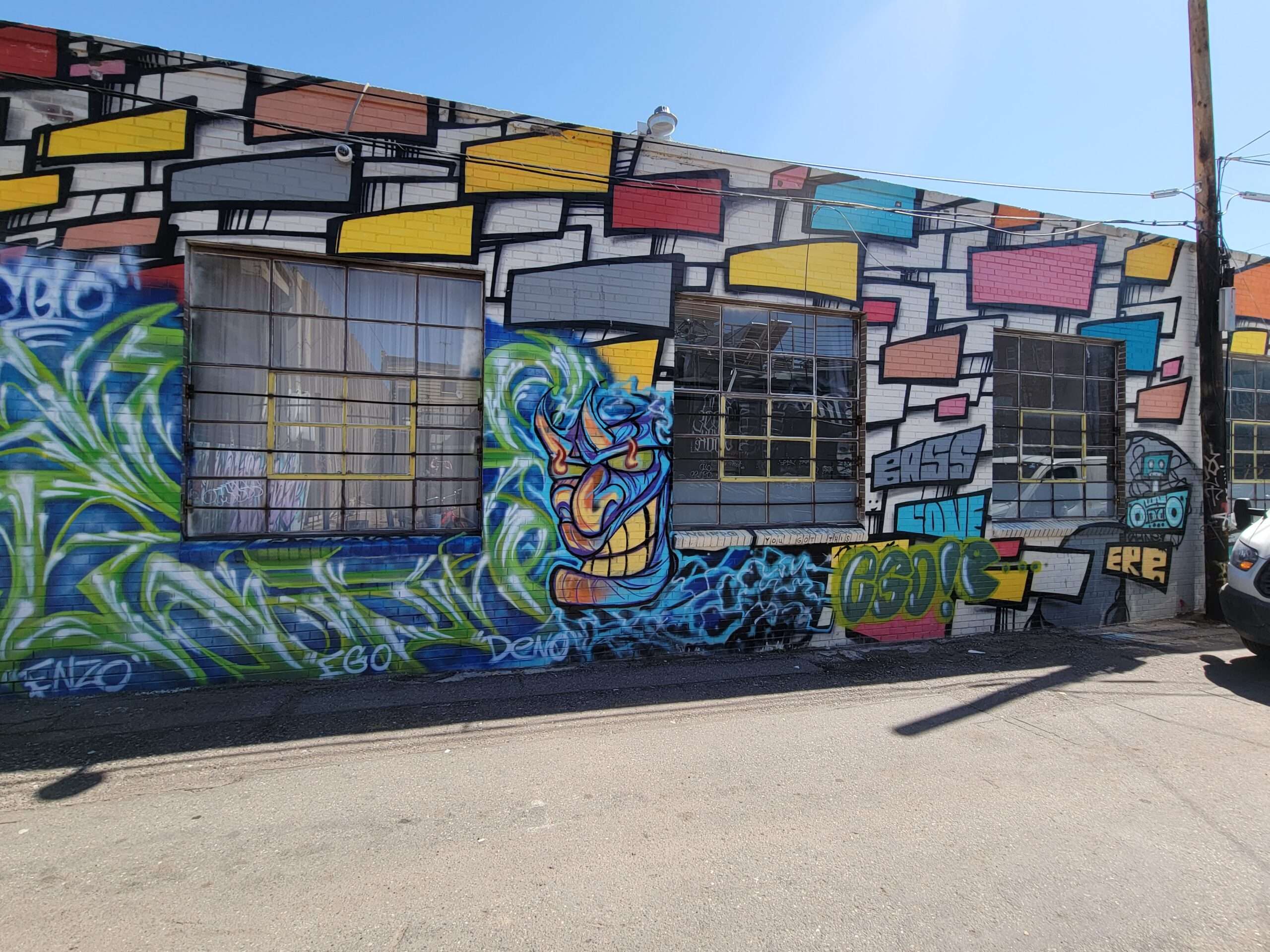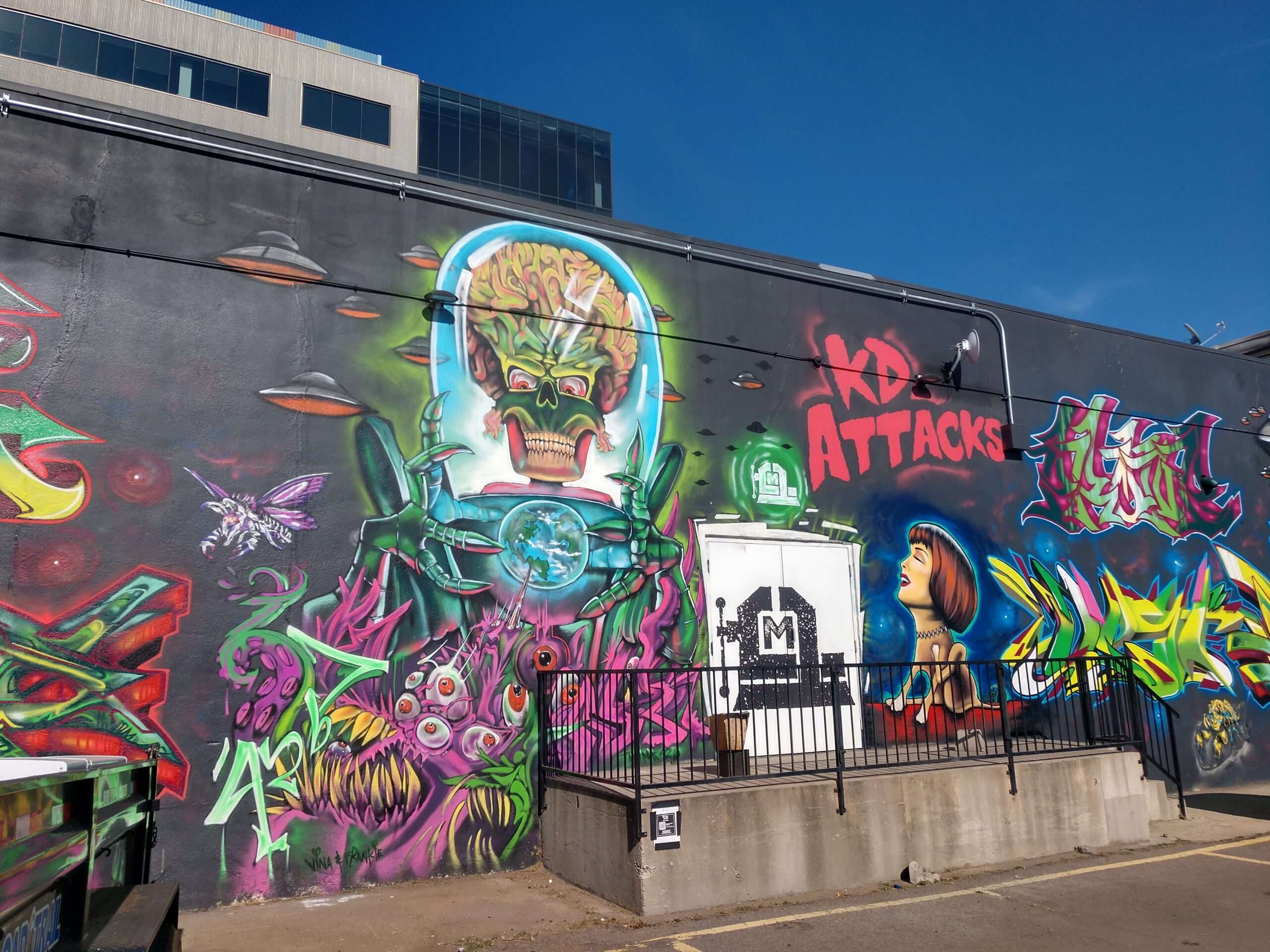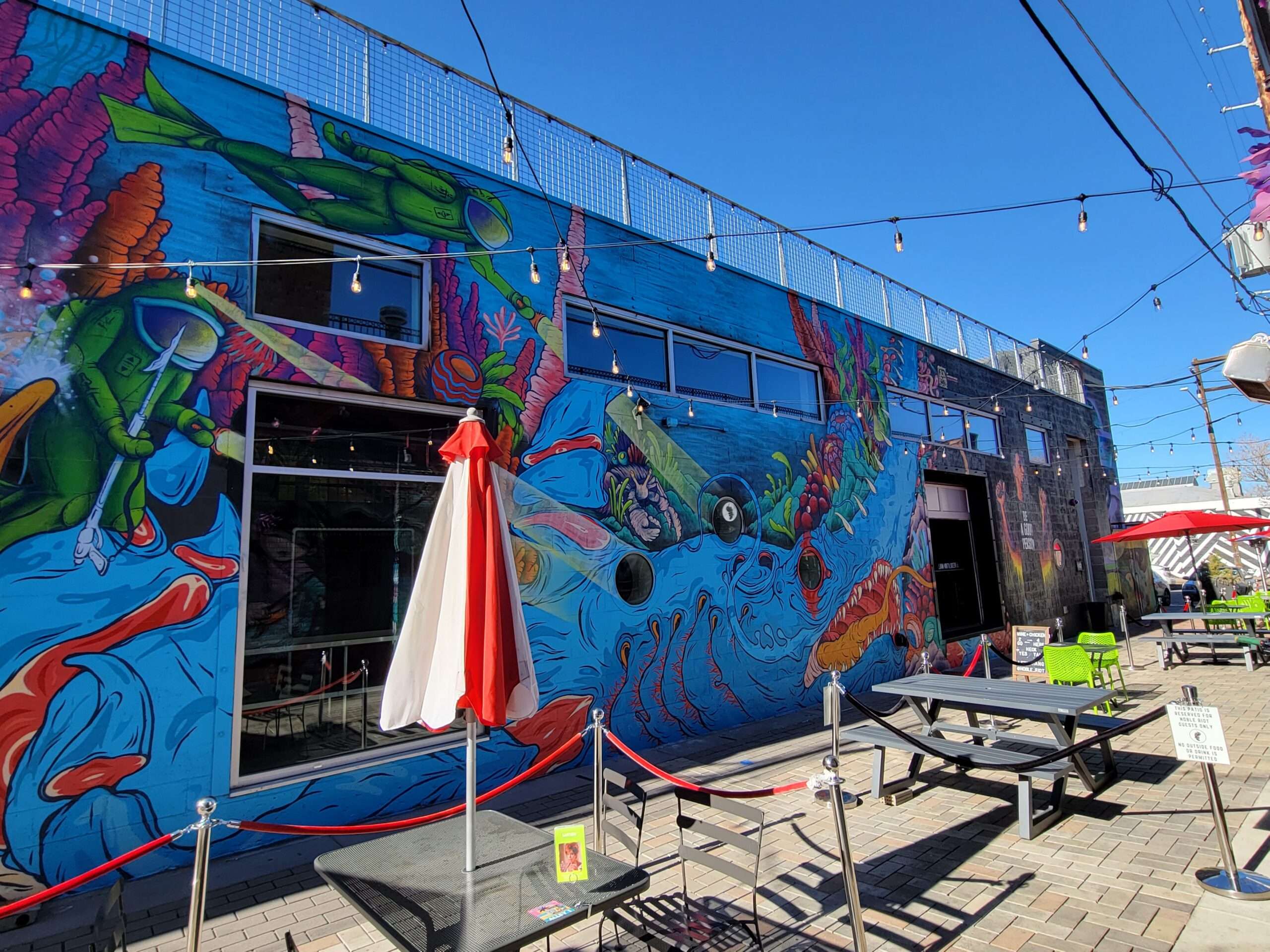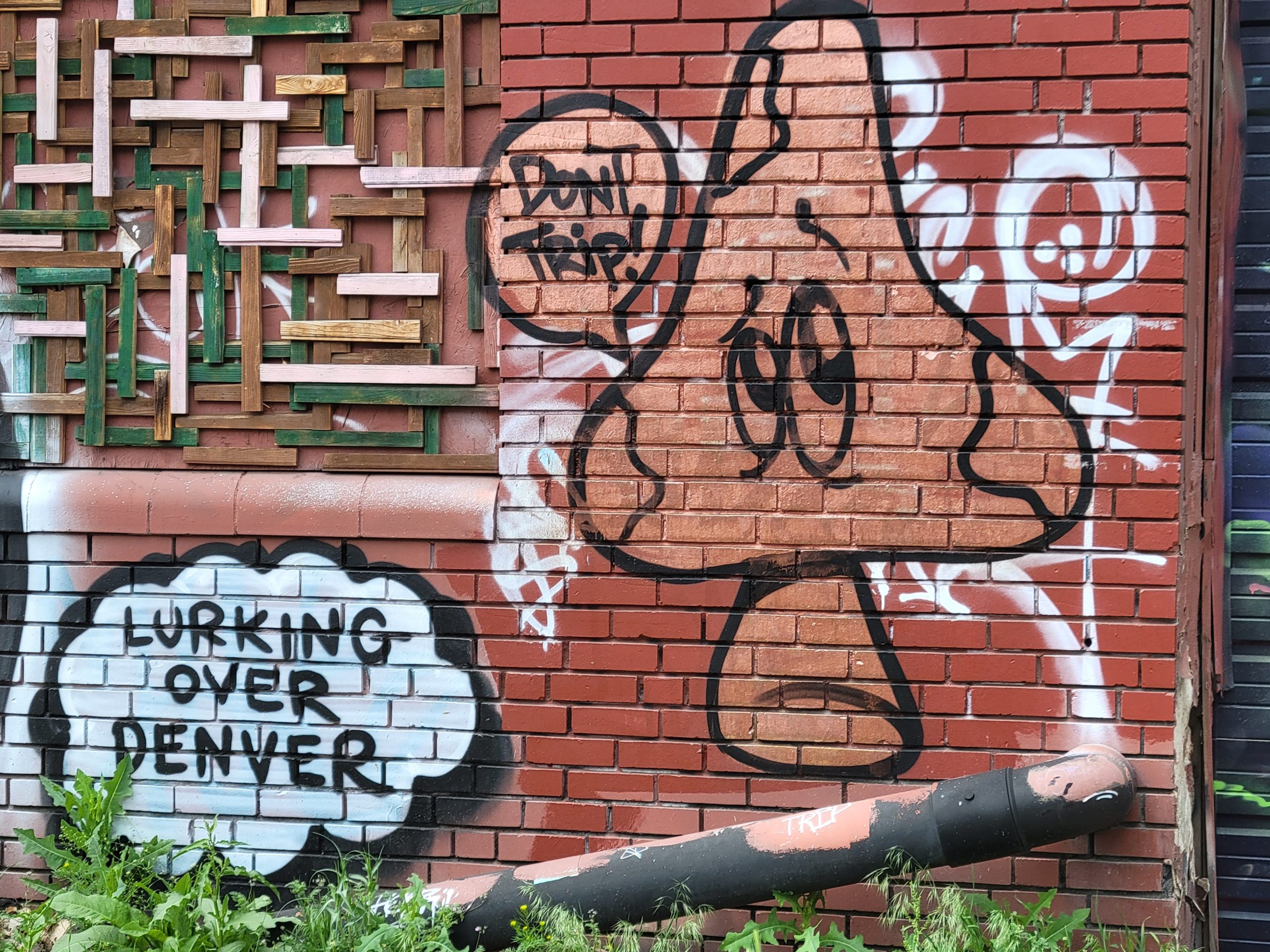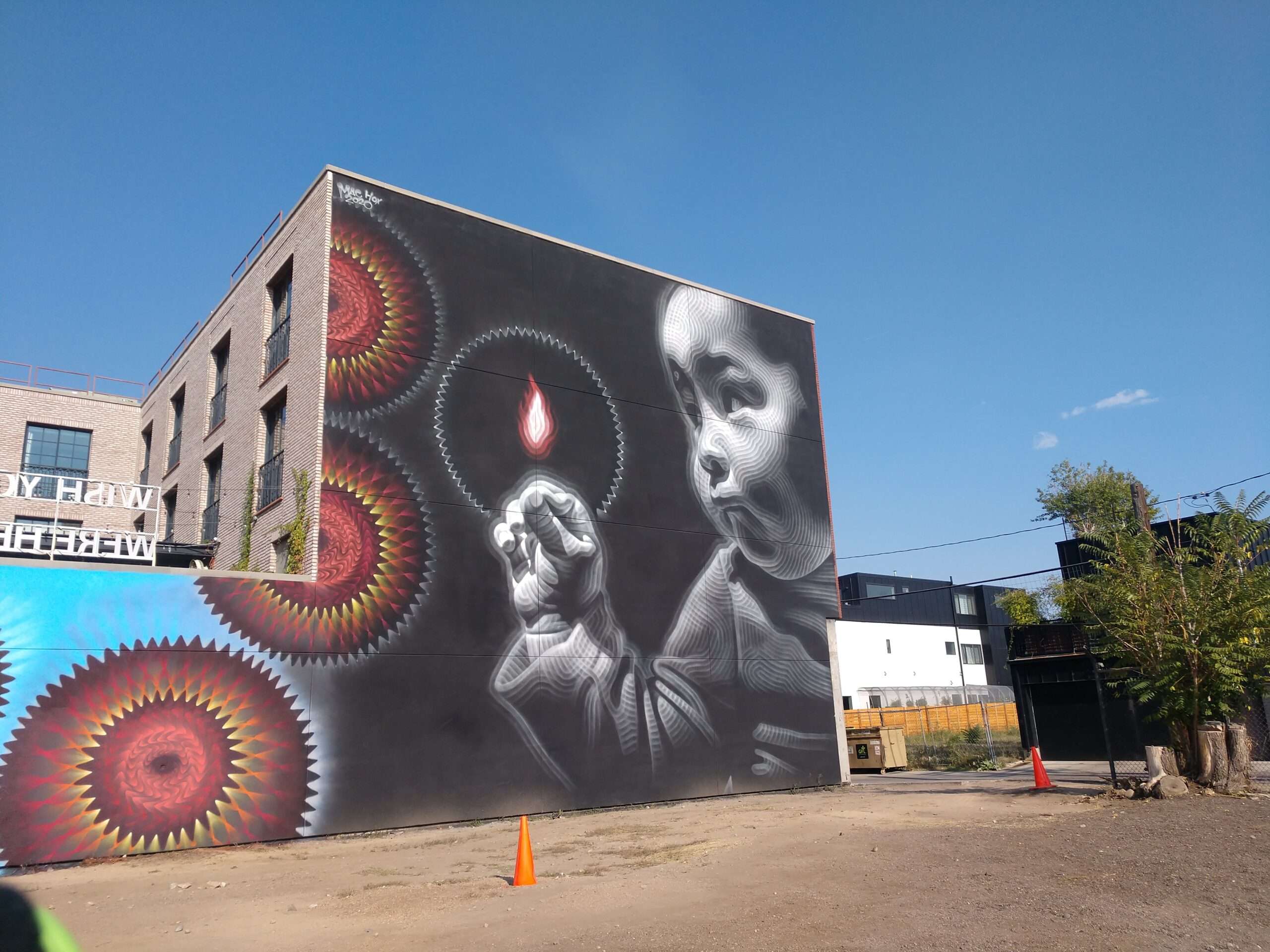 This expansive and colorful piece of Denver street art features a striking portrait of David Bowie with his iconic red lightning bolt makeup and blank white eyes. The surreal mural is packed with eclectic imagery, including an all-seeing eye hovering over blue octopus tentacles, floating bubbles, leopard print patterns, and a green meditating alien painted on an adjacent corrugated garage door. Strung patio lights hang above the dark brick canvas, illuminating this incredibly vibrant and imaginative urban masterpiece.
