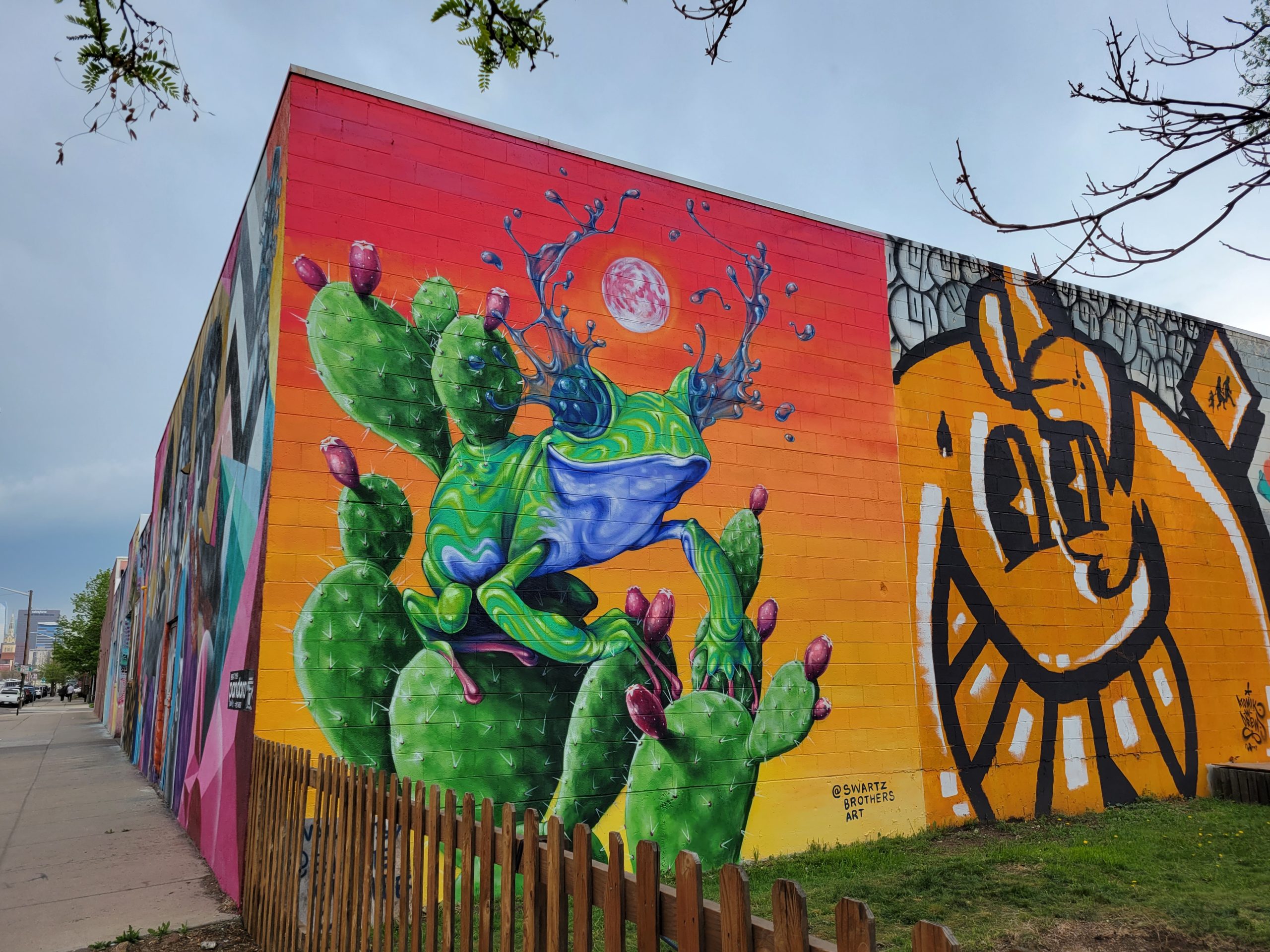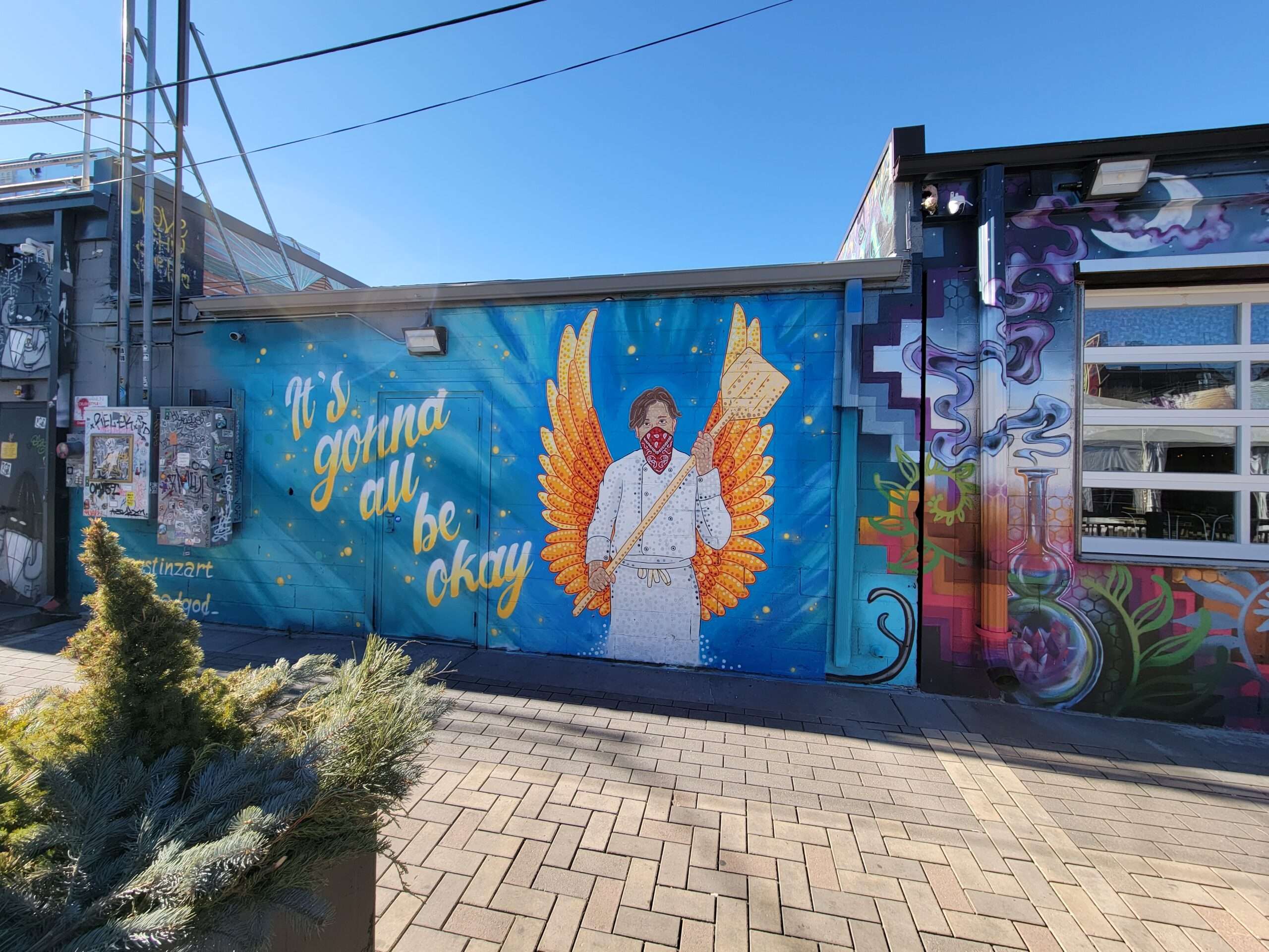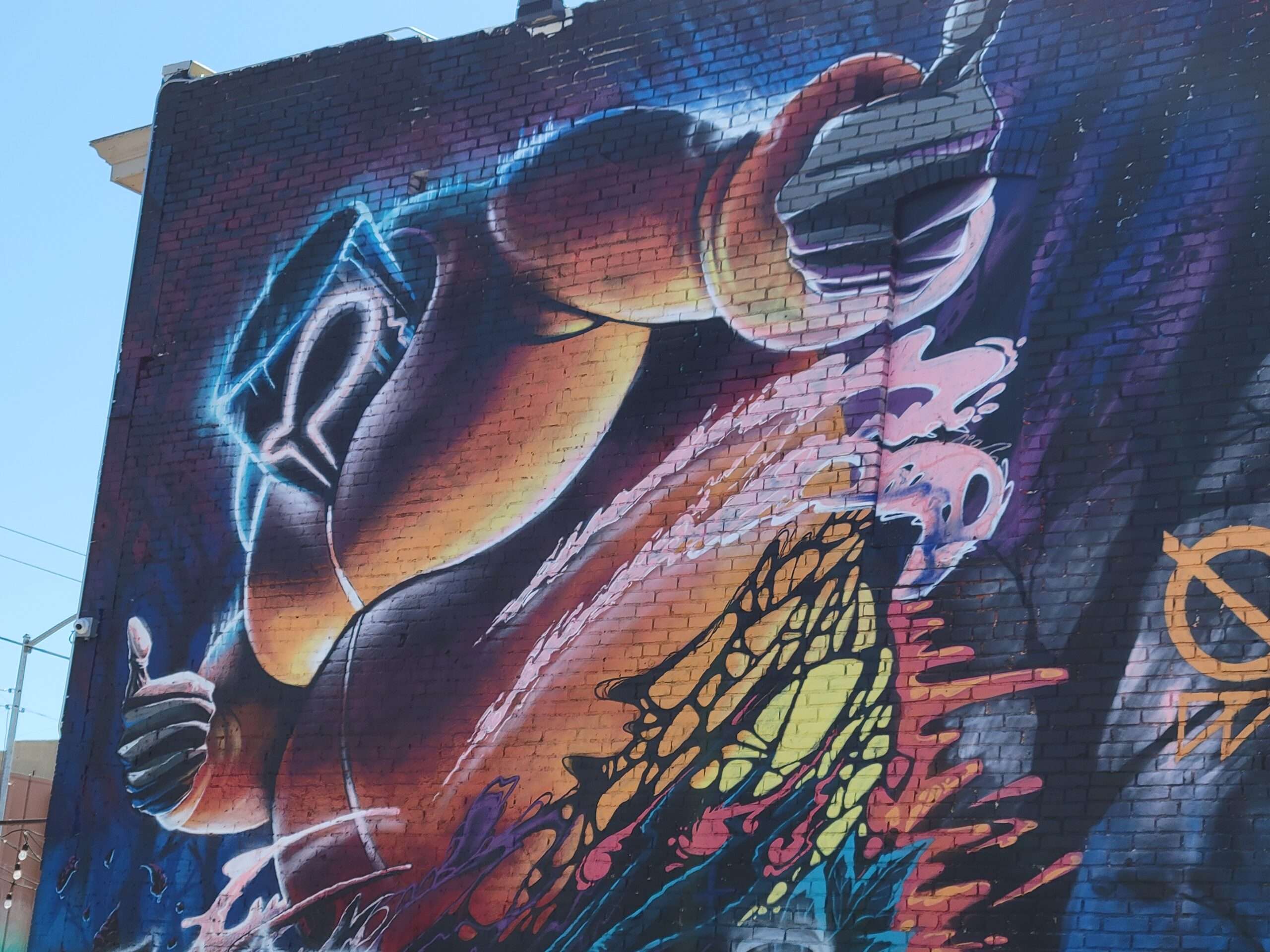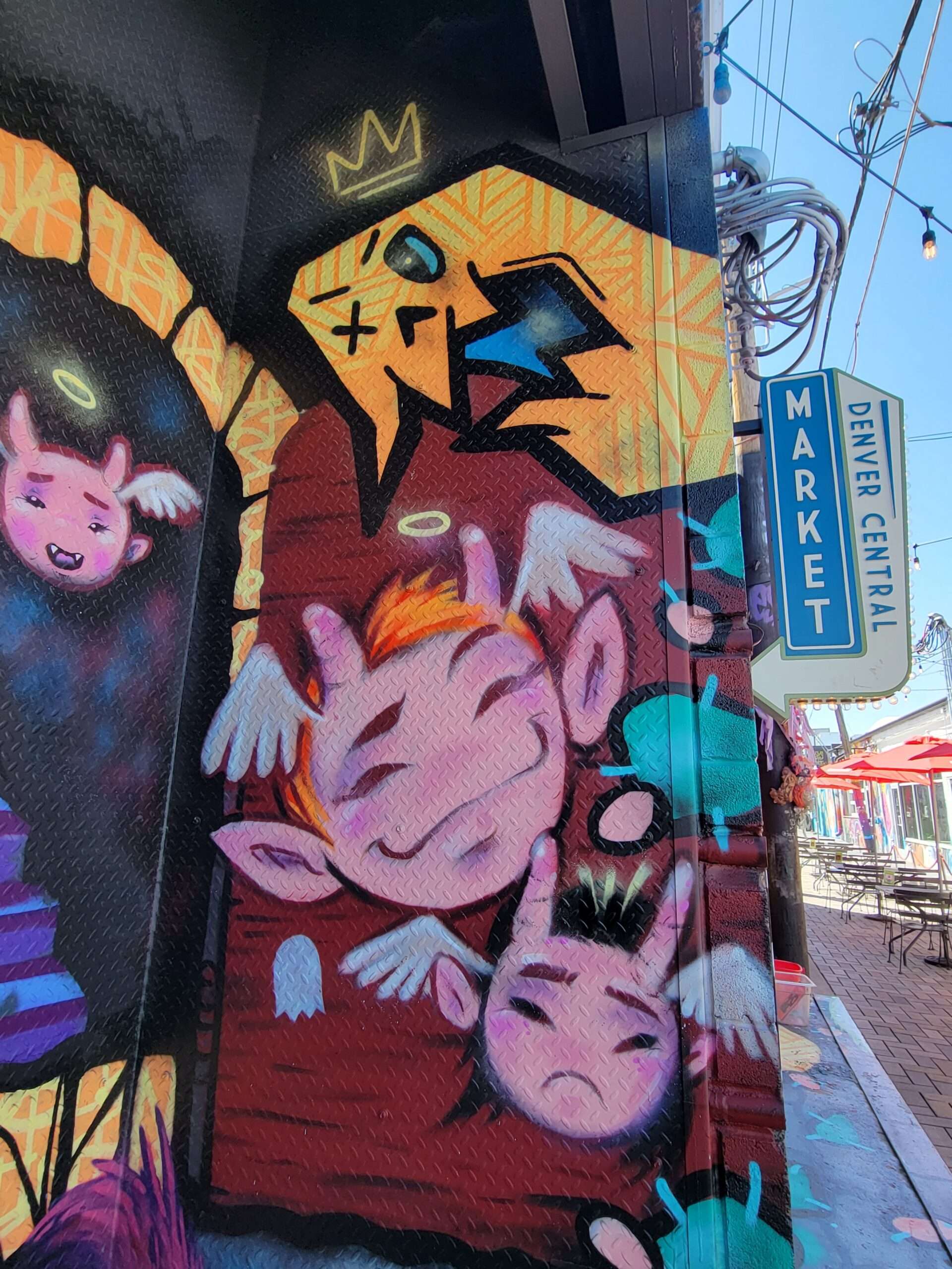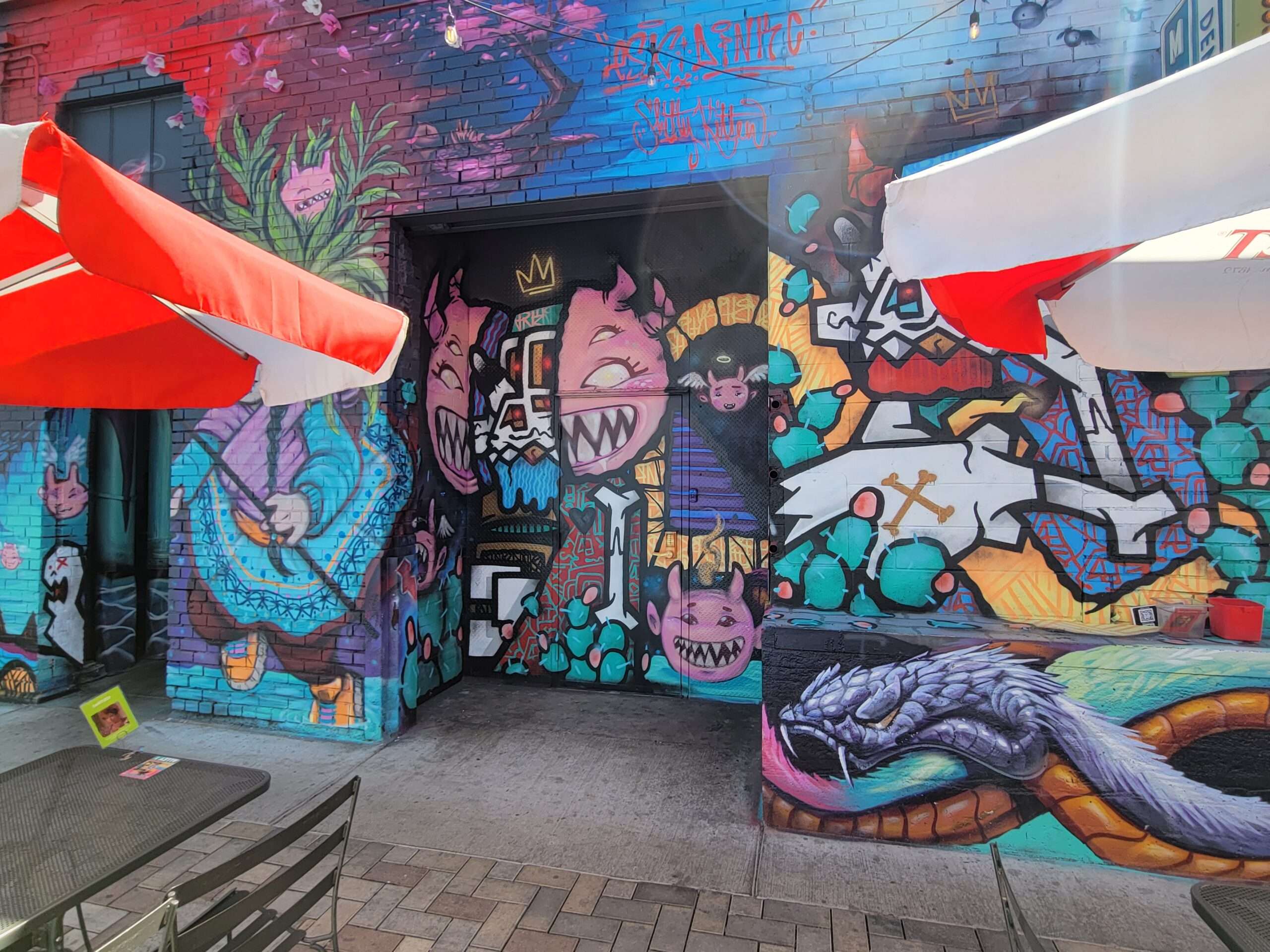 This expansive and colorful piece of Denver street art features a striking portrait of David Bowie with his iconic red lightning bolt makeup and blank white eyes. The surreal mural is packed with eclectic imagery, including an all-seeing eye hovering over blue octopus tentacles, floating bubbles, leopard print patterns, and a green meditating alien painted on an adjacent corrugated garage door. Strung patio lights hang above the dark brick canvas, illuminating this incredibly vibrant and imaginative urban masterpiece.