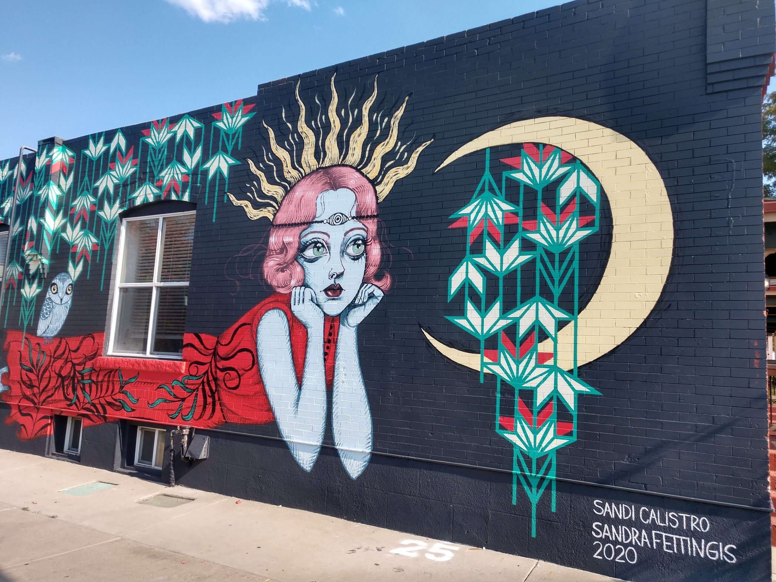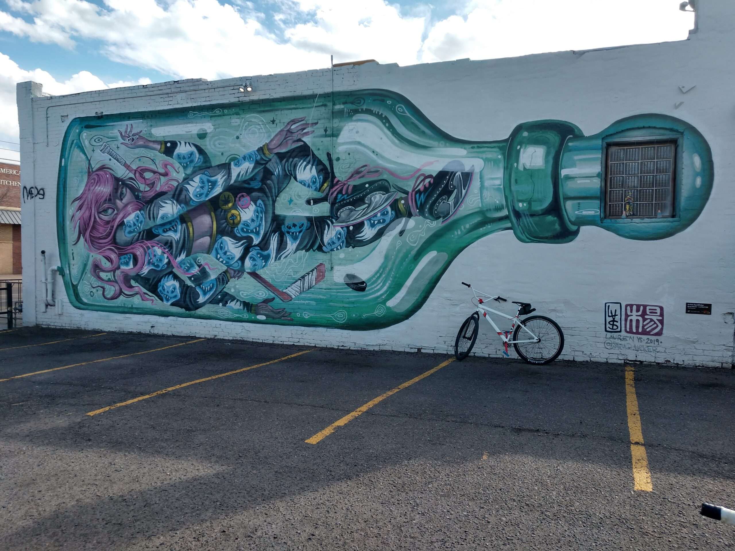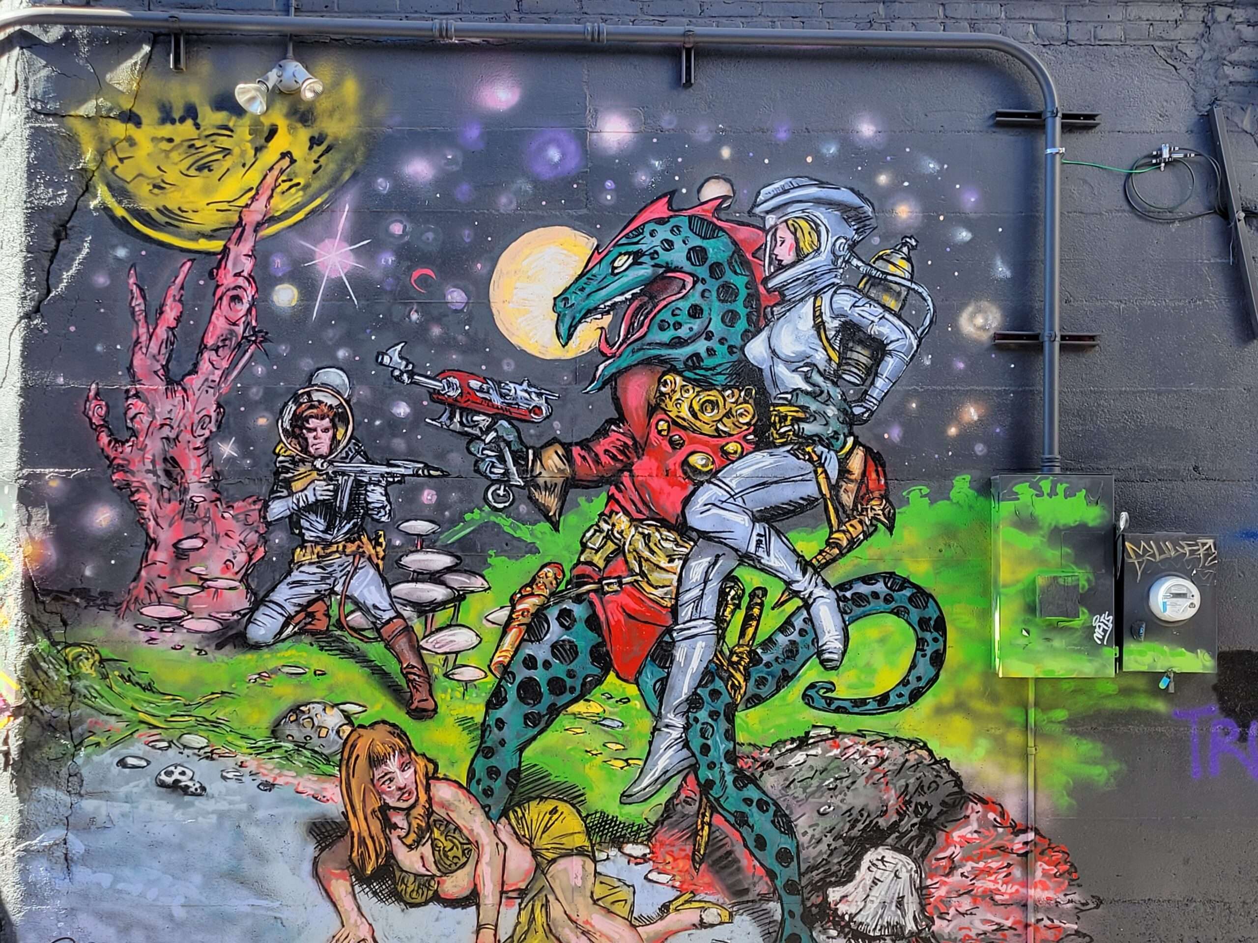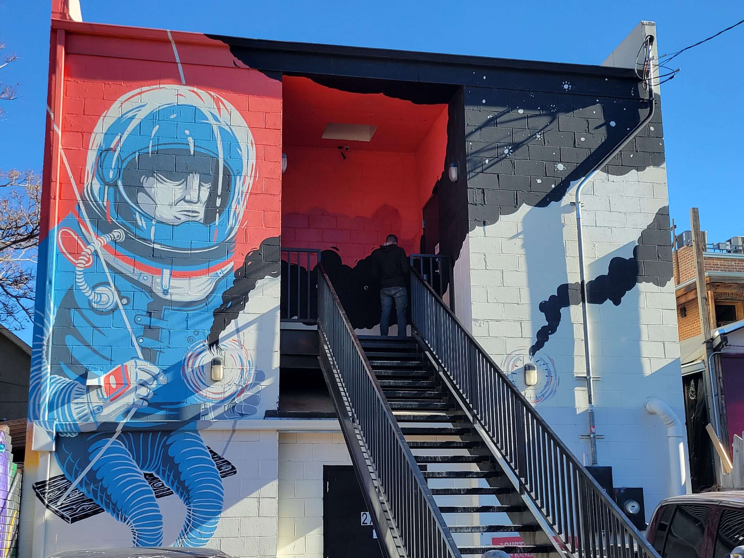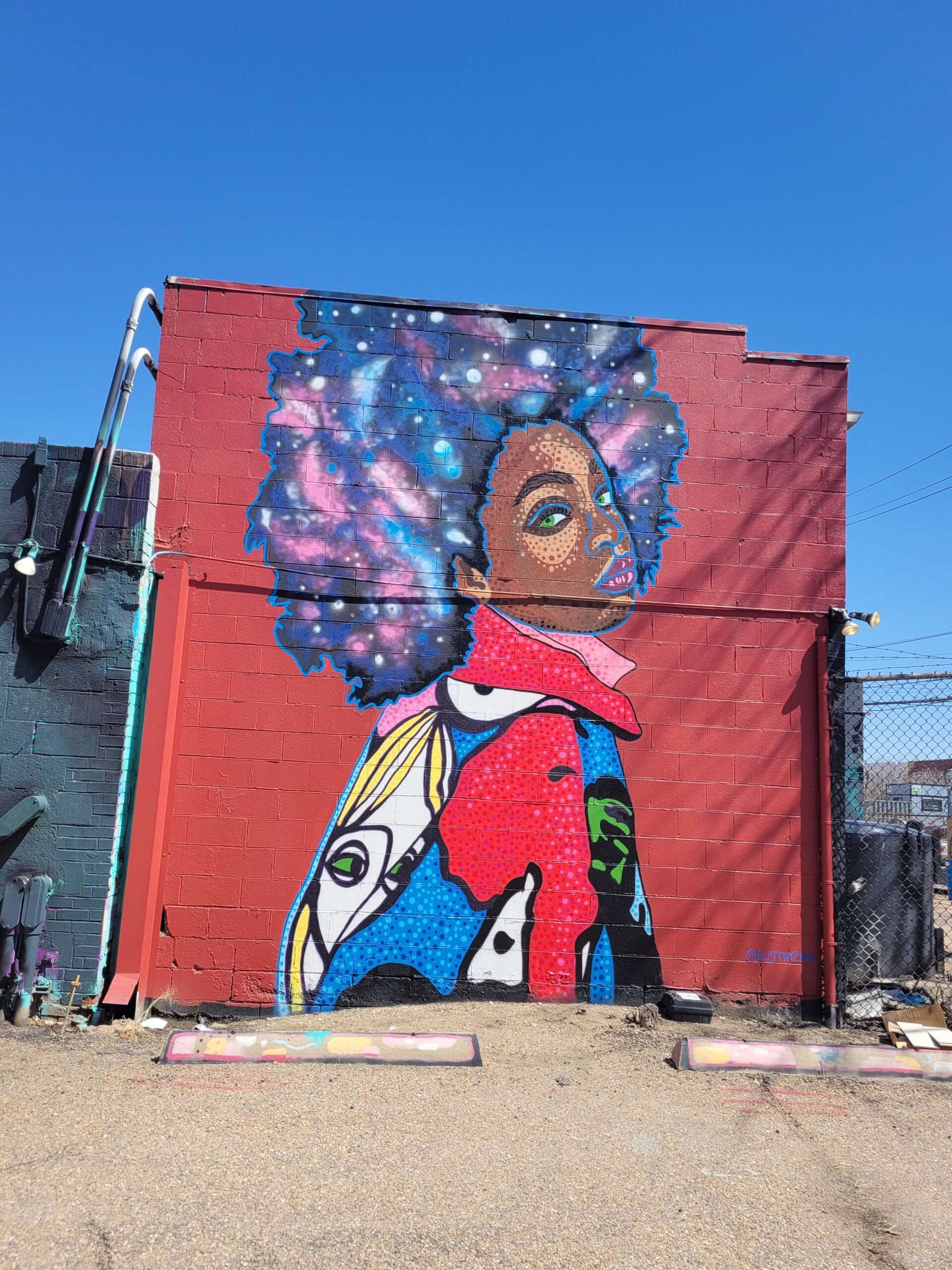 This expansive and colorful piece of Denver street art features a striking portrait of David Bowie with his iconic red lightning bolt makeup and blank white eyes. The surreal mural is packed with eclectic imagery, including an all-seeing eye hovering over blue octopus tentacles, floating bubbles, leopard print patterns, and a green meditating alien painted on an adjacent corrugated garage door. Strung patio lights hang above the dark brick canvas, illuminating this incredibly vibrant and imaginative urban masterpiece.