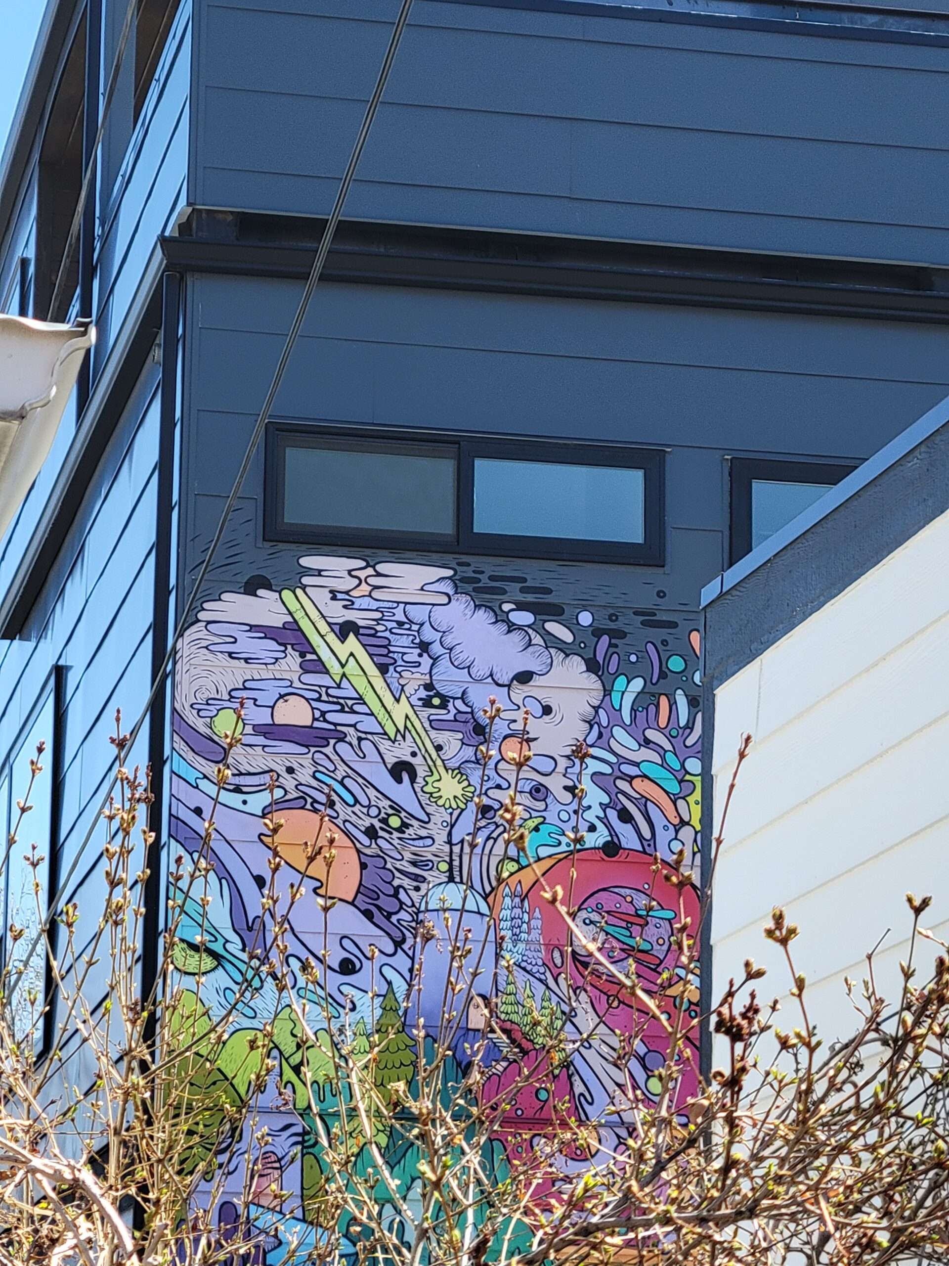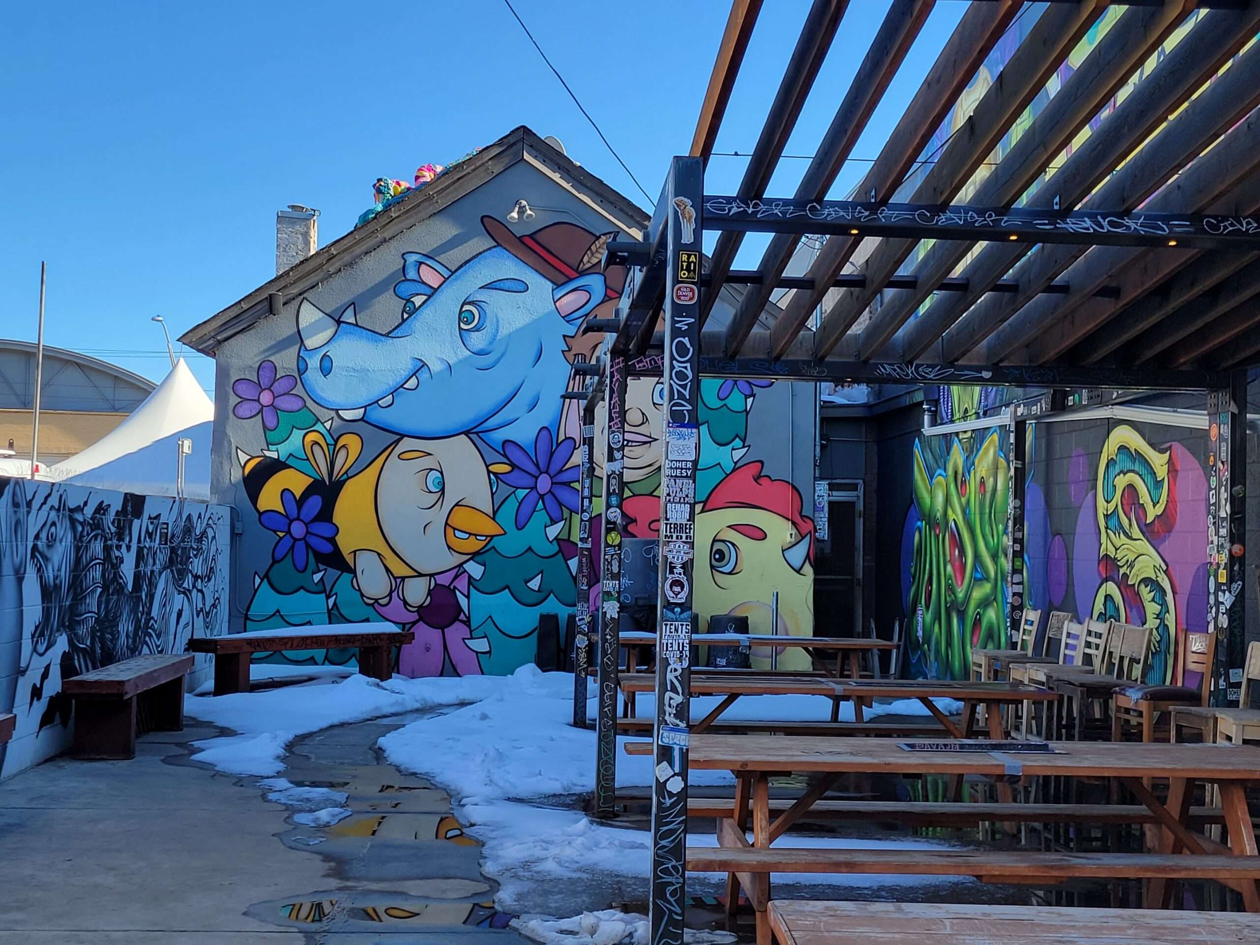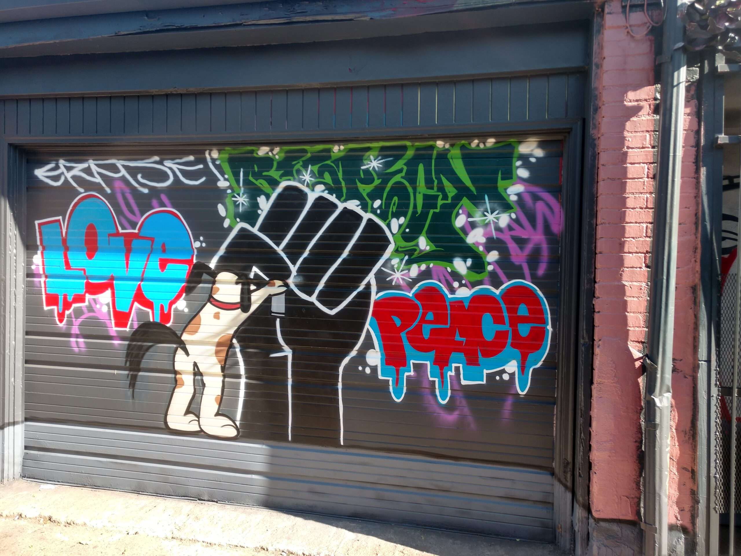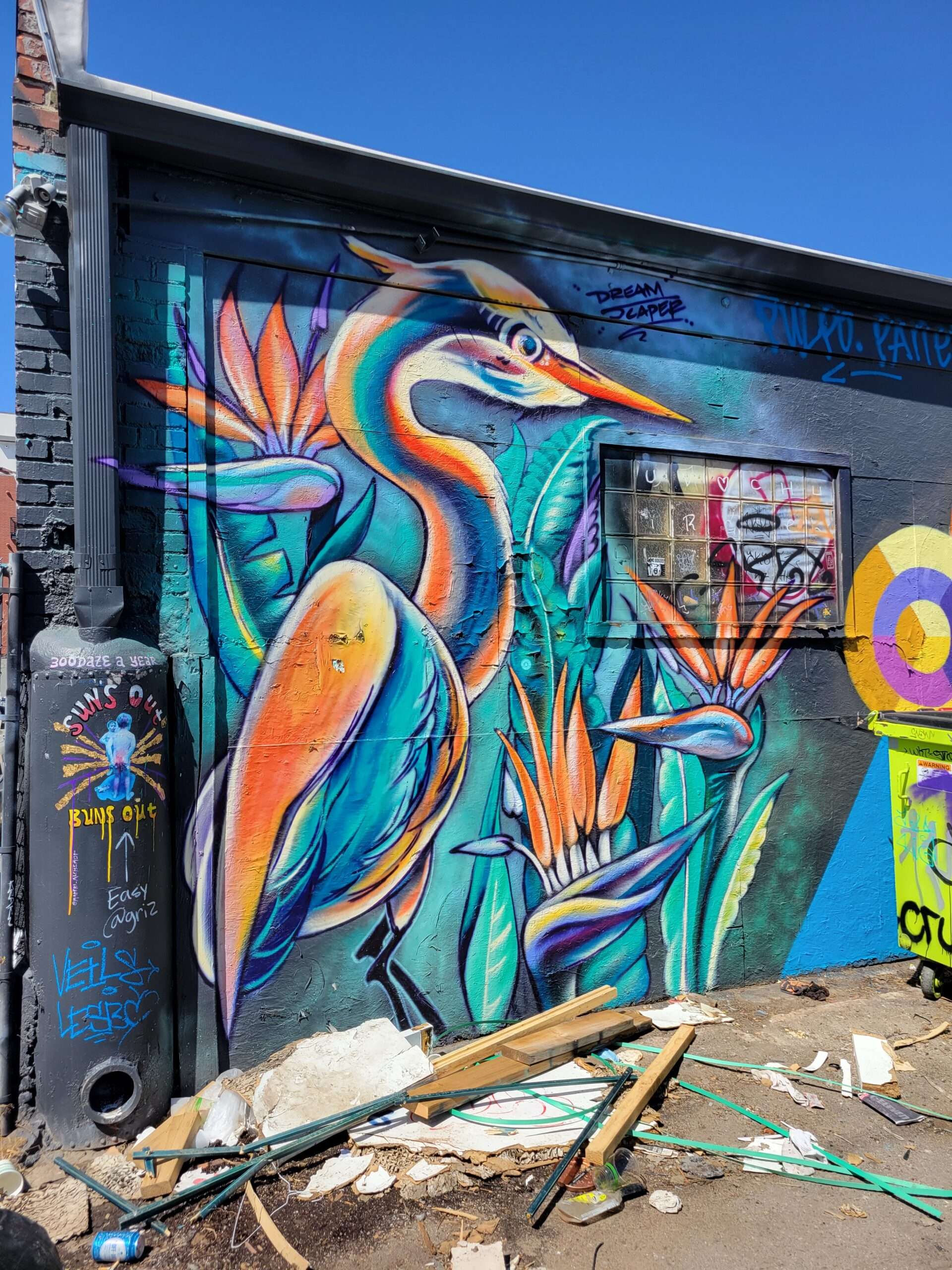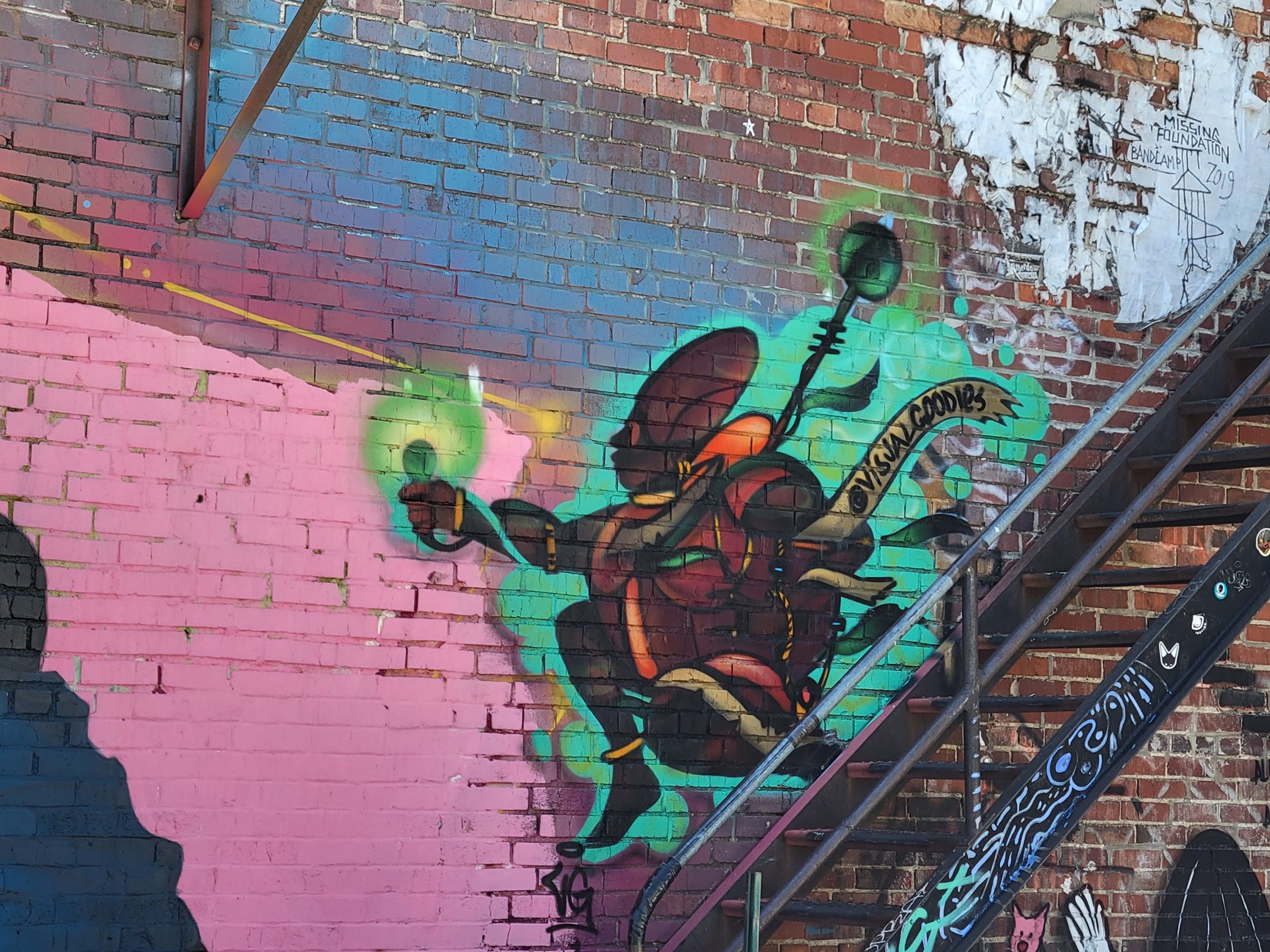 This expansive and colorful piece of Denver street art features a striking portrait of David Bowie with his iconic red lightning bolt makeup and blank white eyes. The surreal mural is packed with eclectic imagery, including an all-seeing eye hovering over blue octopus tentacles, floating bubbles, leopard print patterns, and a green meditating alien painted on an adjacent corrugated garage door. Strung patio lights hang above the dark brick canvas, illuminating this incredibly vibrant and imaginative urban masterpiece.