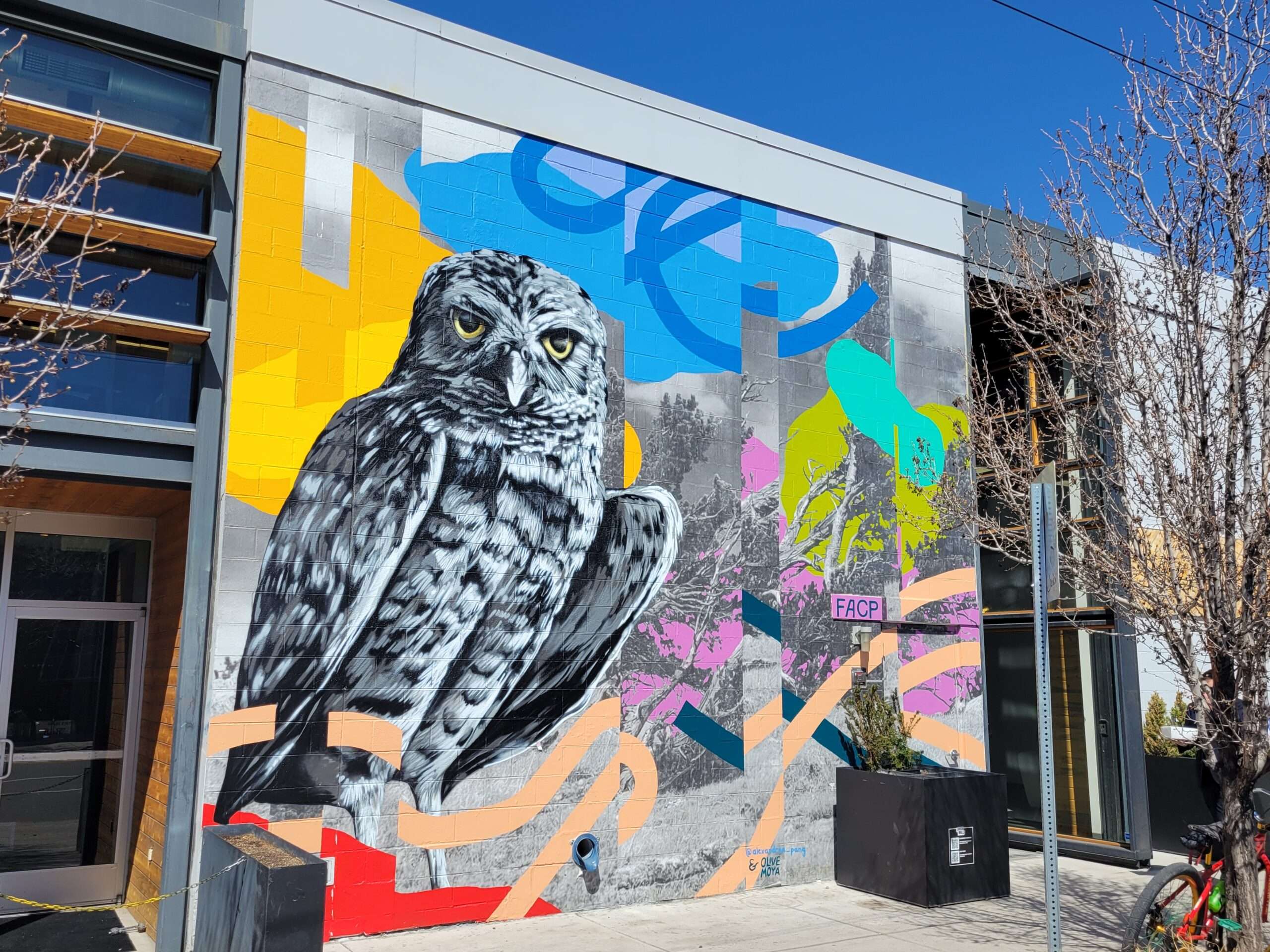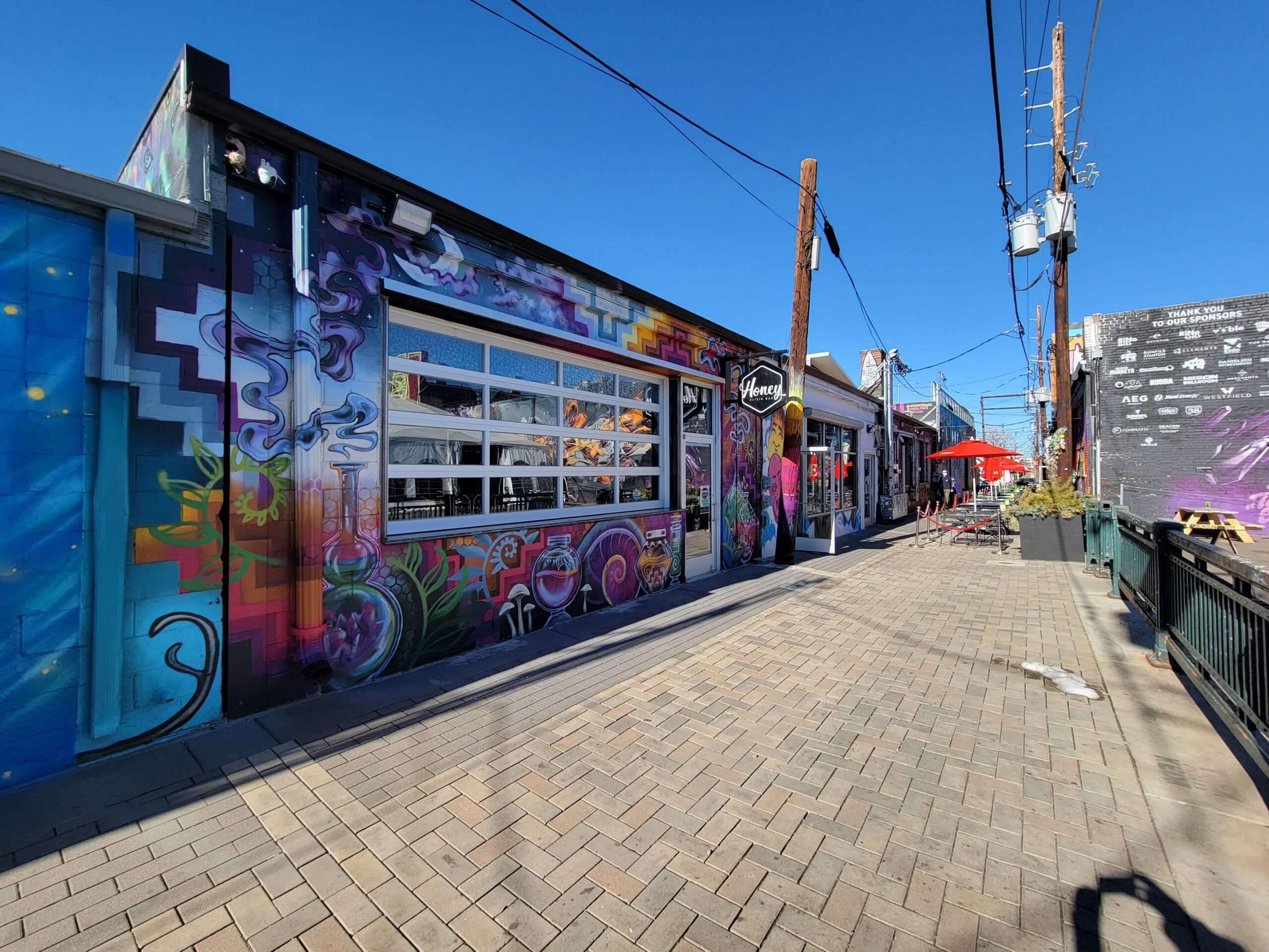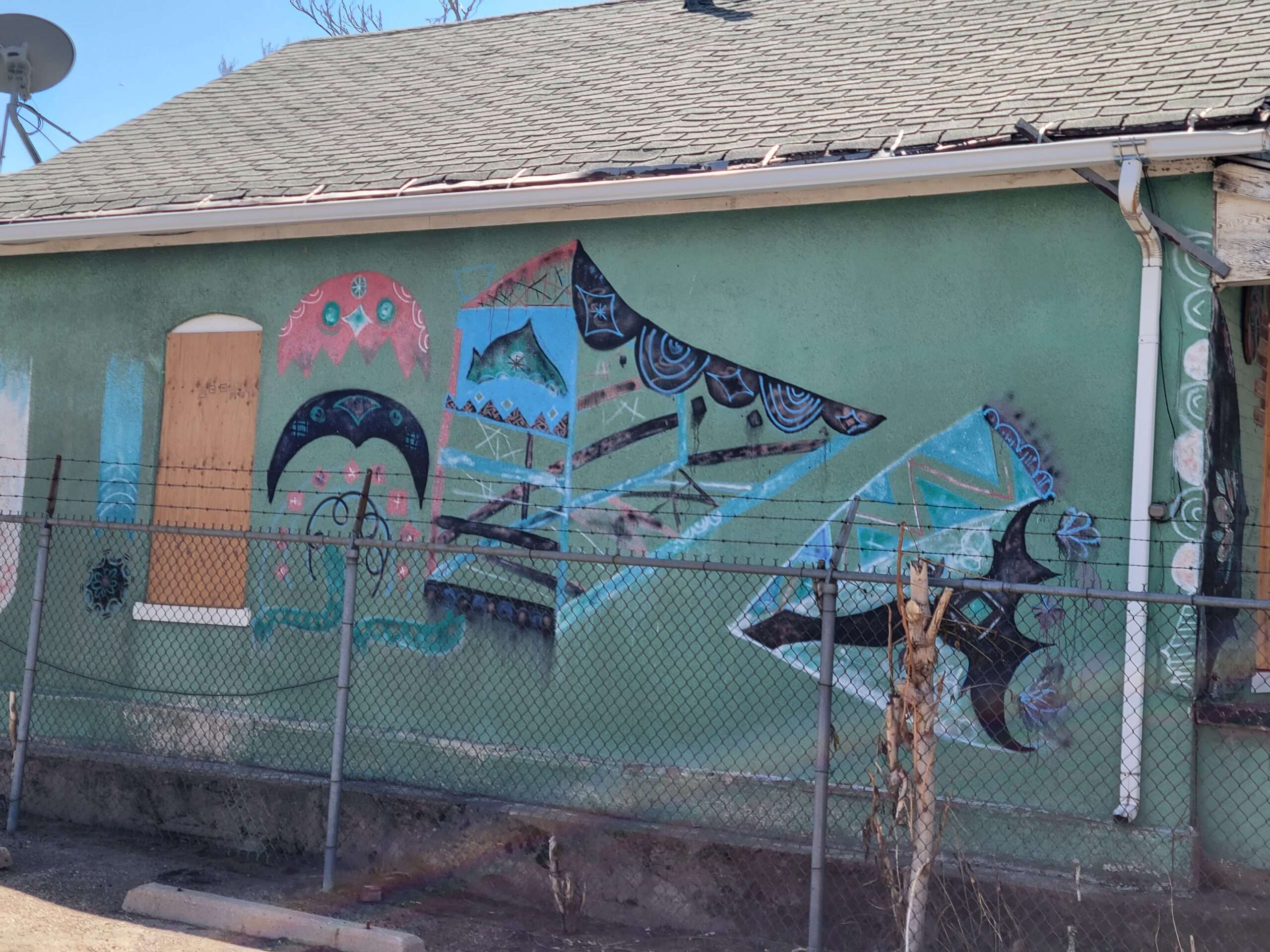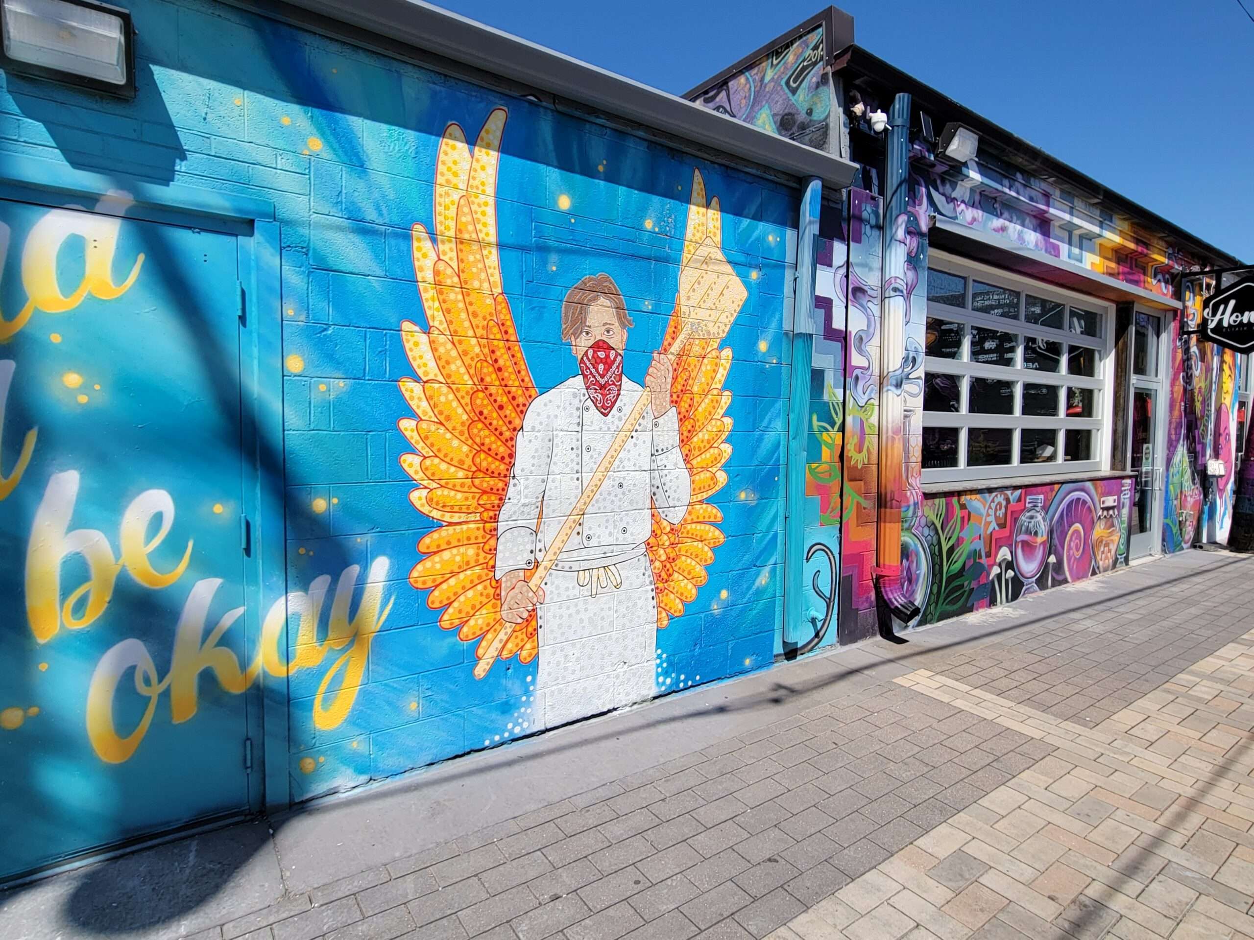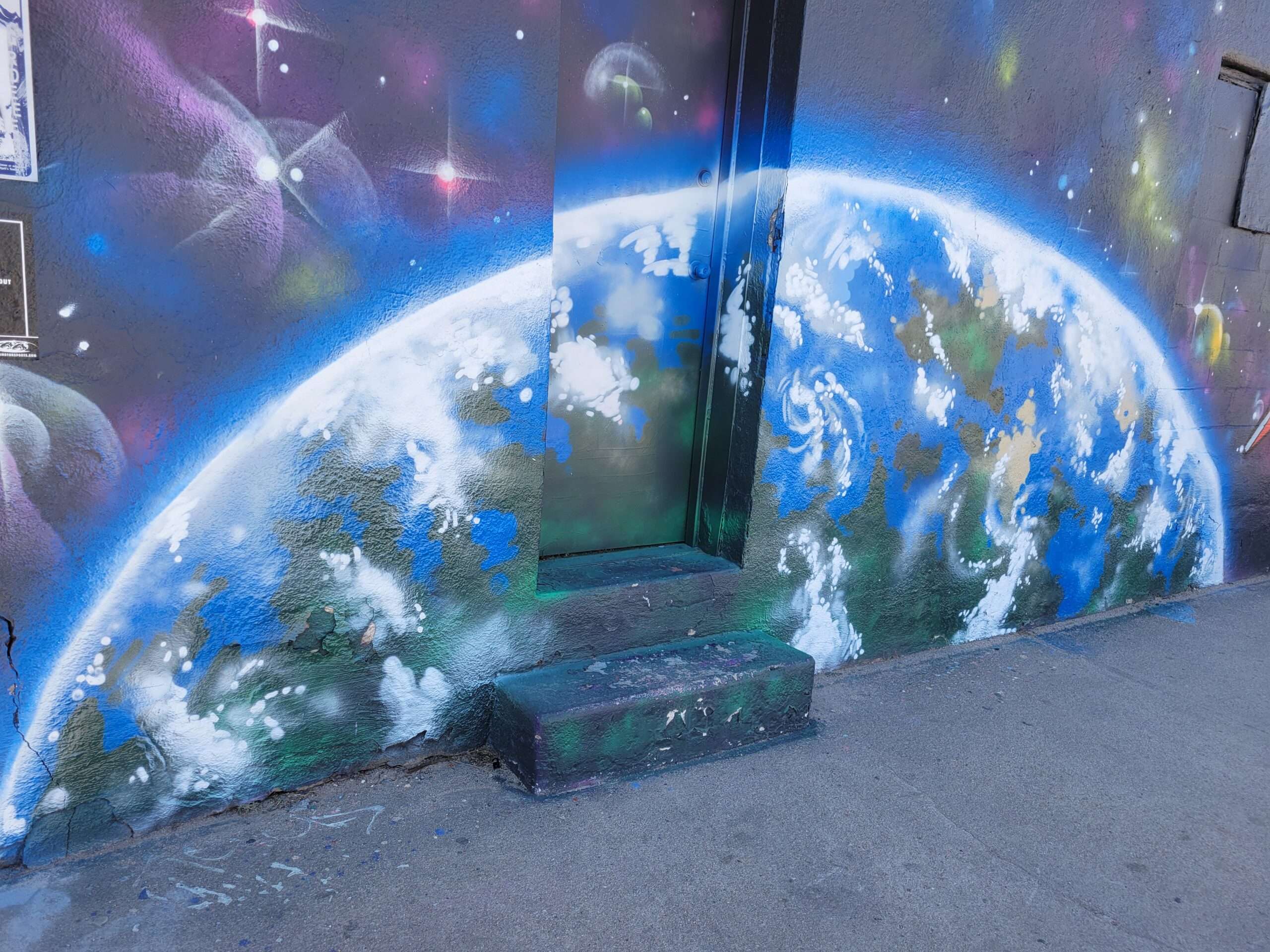 This expansive and colorful piece of Denver street art features a striking portrait of David Bowie with his iconic red lightning bolt makeup and blank white eyes. The surreal mural is packed with eclectic imagery, including an all-seeing eye hovering over blue octopus tentacles, floating bubbles, leopard print patterns, and a green meditating alien painted on an adjacent corrugated garage door. Strung patio lights hang above the dark brick canvas, illuminating this incredibly vibrant and imaginative urban masterpiece.