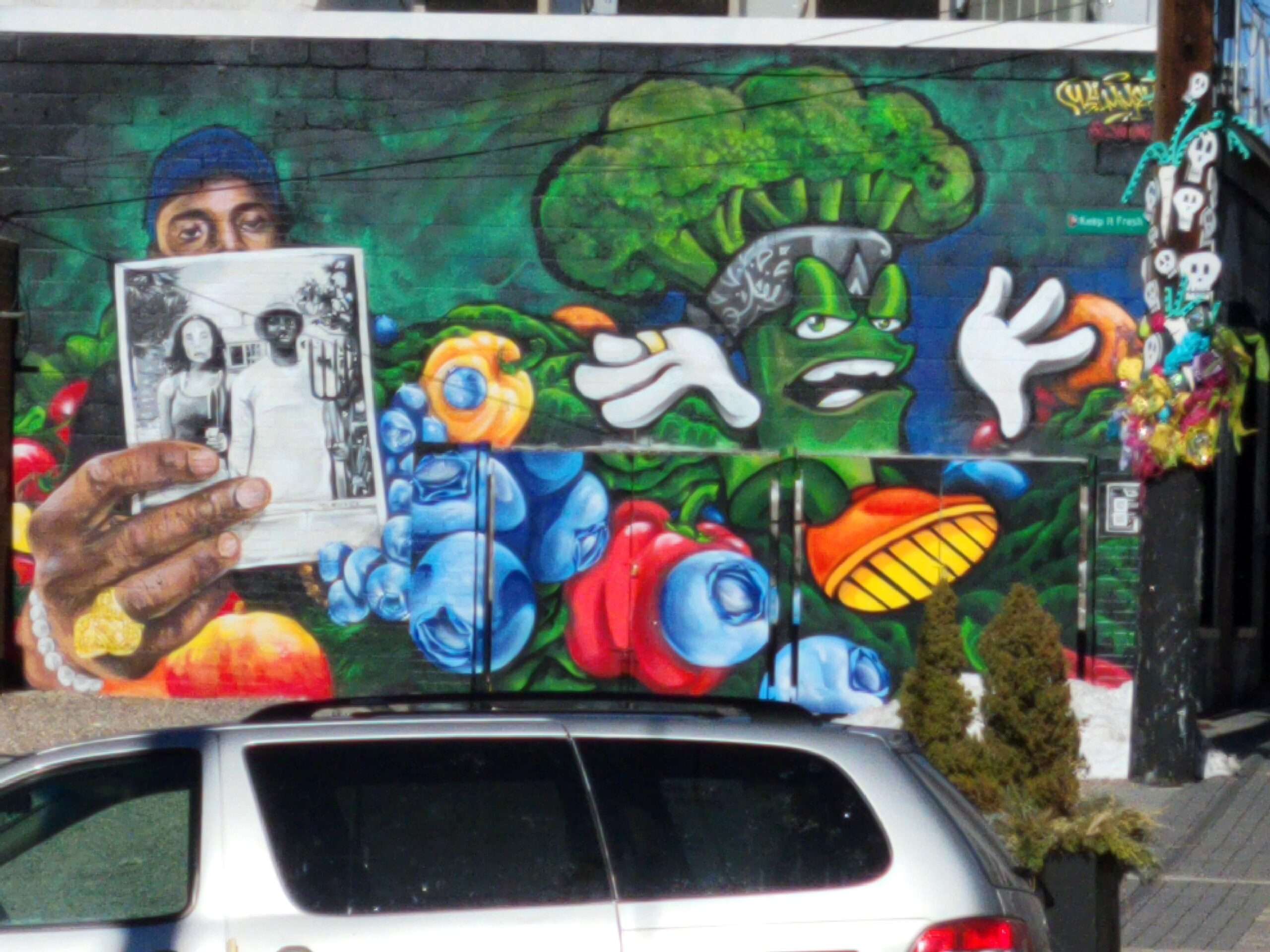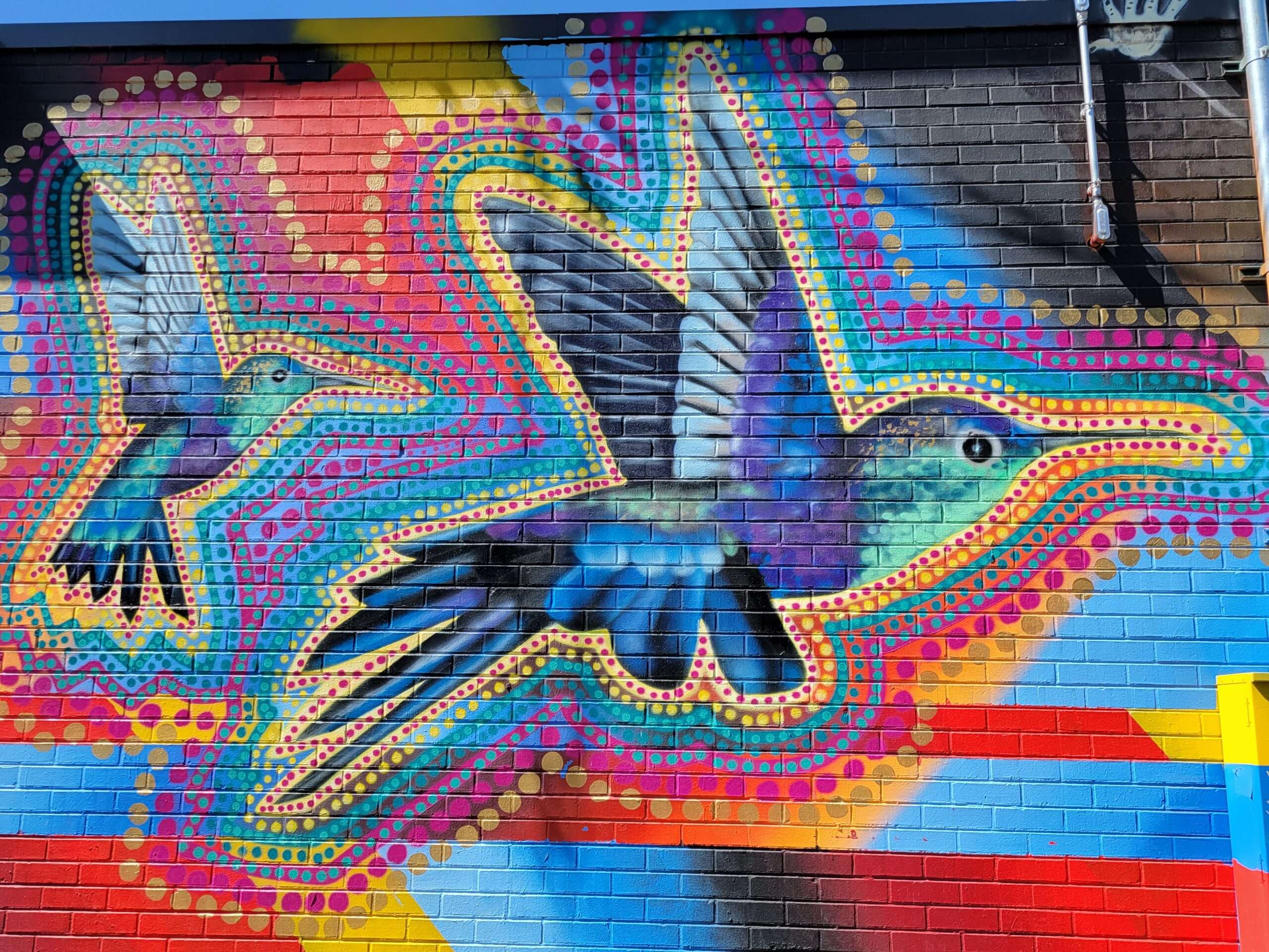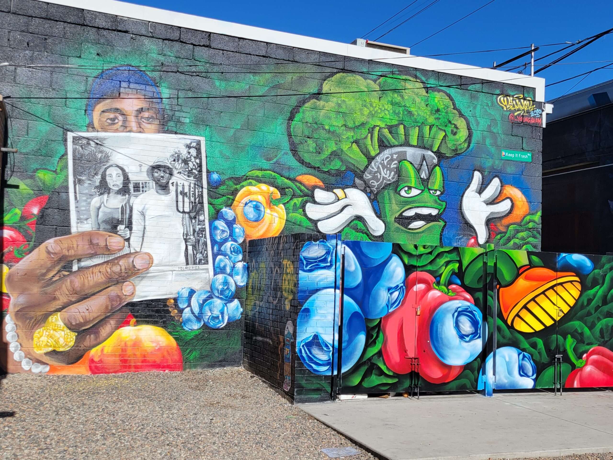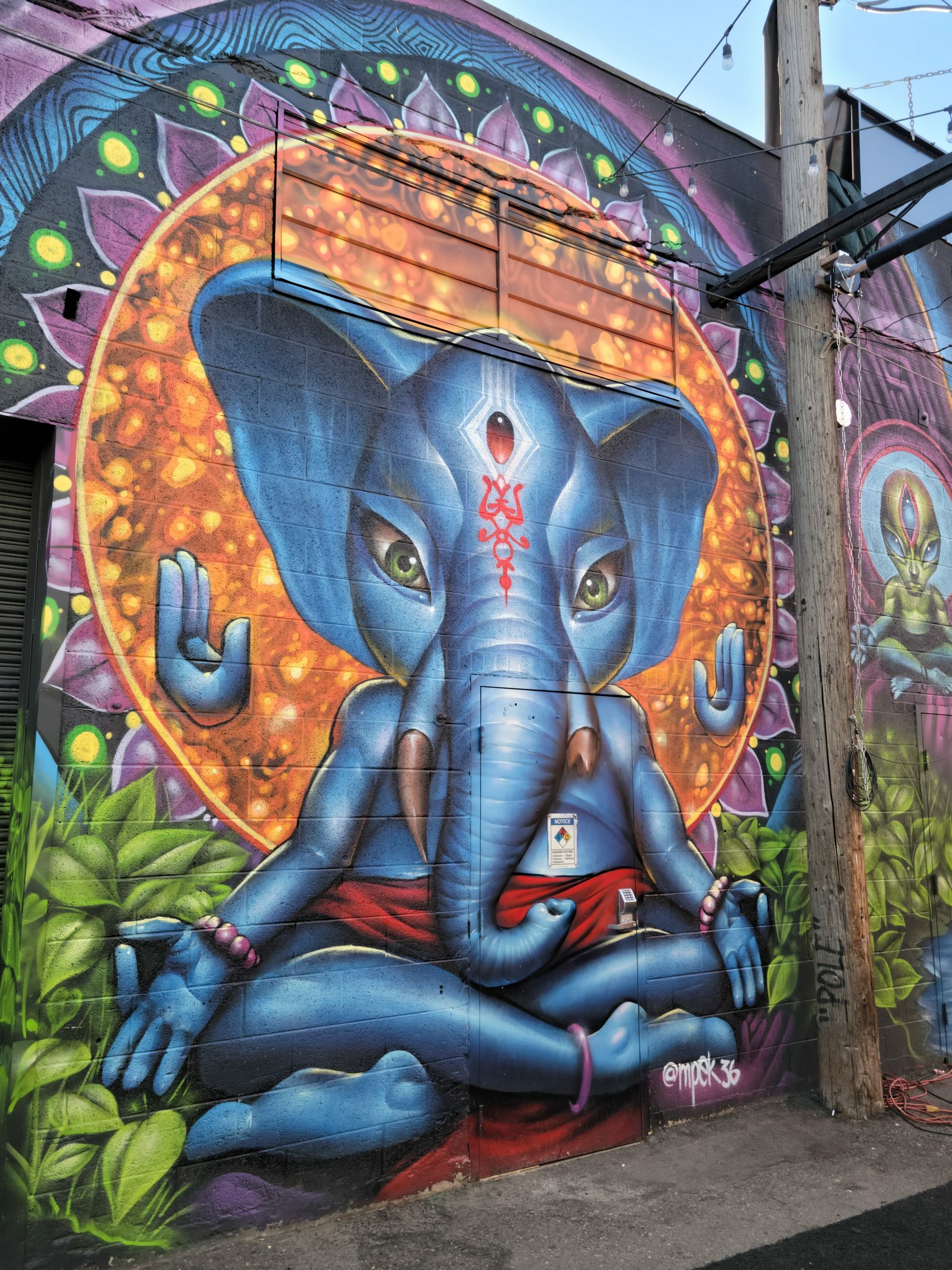 This expansive and colorful piece of Denver street art features a striking portrait of David Bowie with his iconic red lightning bolt makeup and blank white eyes. The surreal mural is packed with eclectic imagery, including an all-seeing eye hovering over blue octopus tentacles, floating bubbles, leopard print patterns, and a green meditating alien painted on an adjacent corrugated garage door. Strung patio lights hang above the dark brick canvas, illuminating this incredibly vibrant and imaginative urban masterpiece.