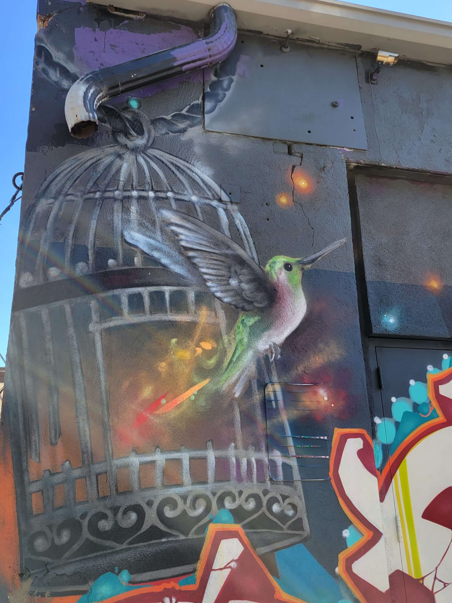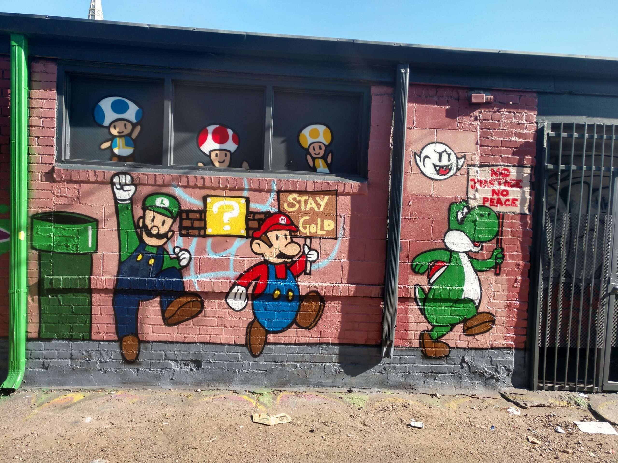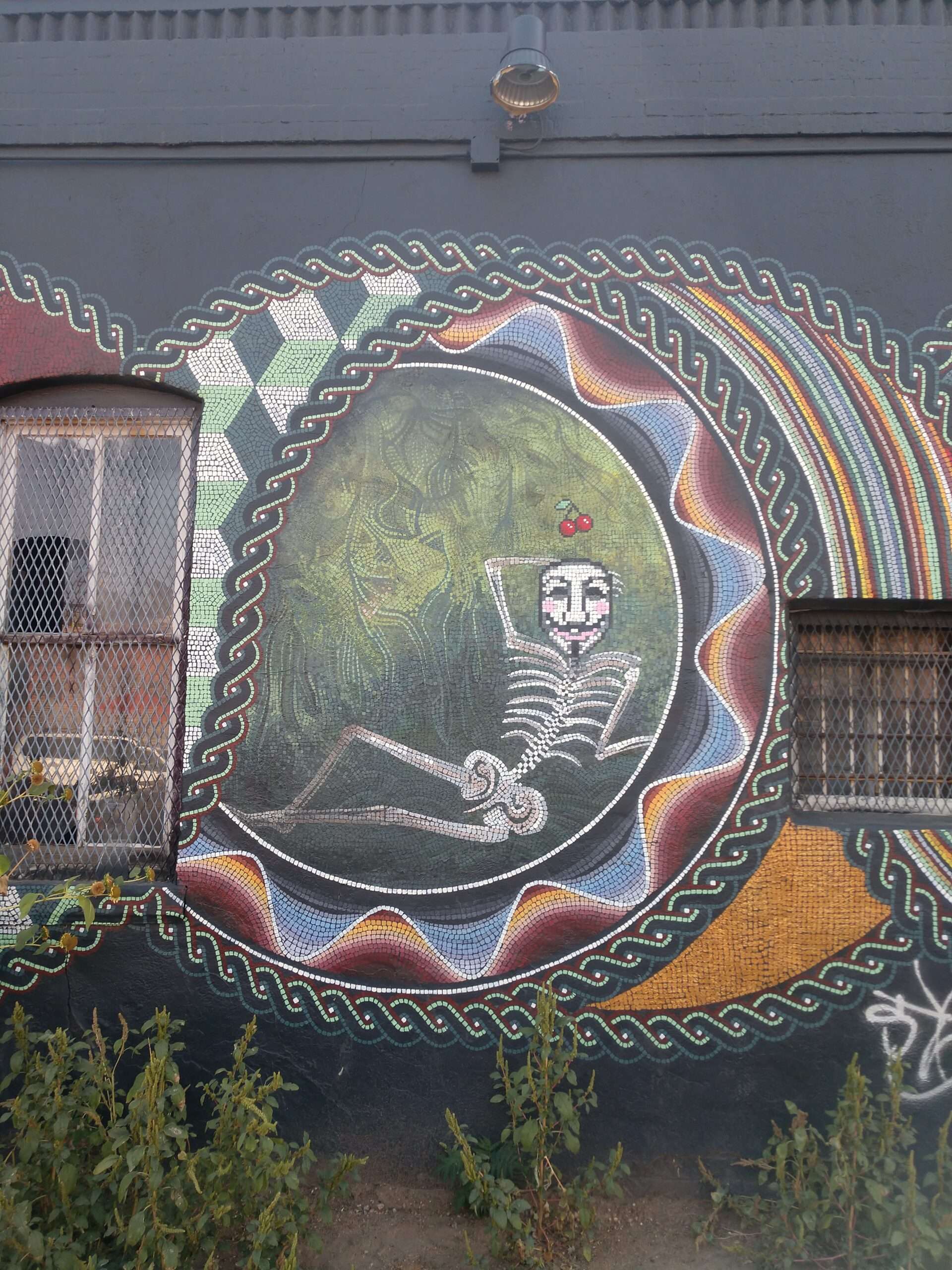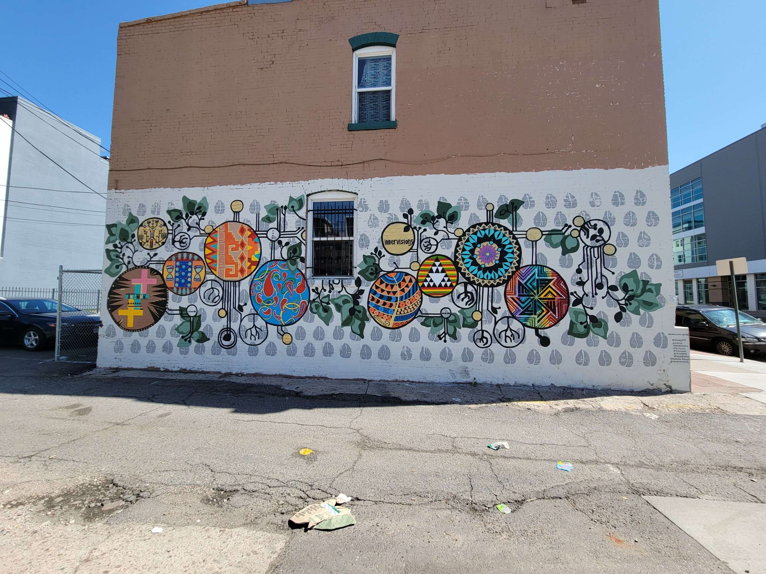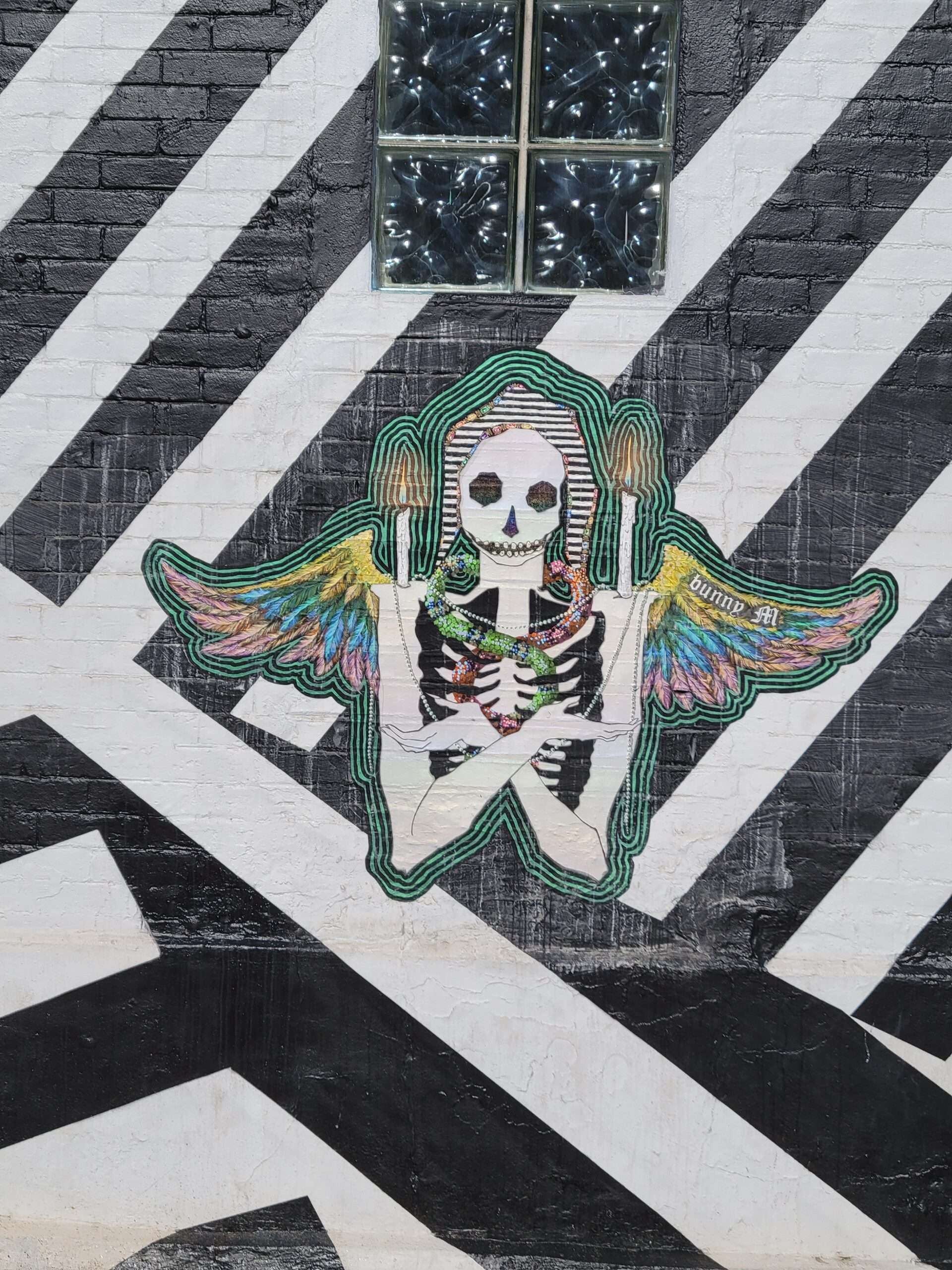 This expansive and colorful piece of Denver street art features a striking portrait of David Bowie with his iconic red lightning bolt makeup and blank white eyes. The surreal mural is packed with eclectic imagery, including an all-seeing eye hovering over blue octopus tentacles, floating bubbles, leopard print patterns, and a green meditating alien painted on an adjacent corrugated garage door. Strung patio lights hang above the dark brick canvas, illuminating this incredibly vibrant and imaginative urban masterpiece.