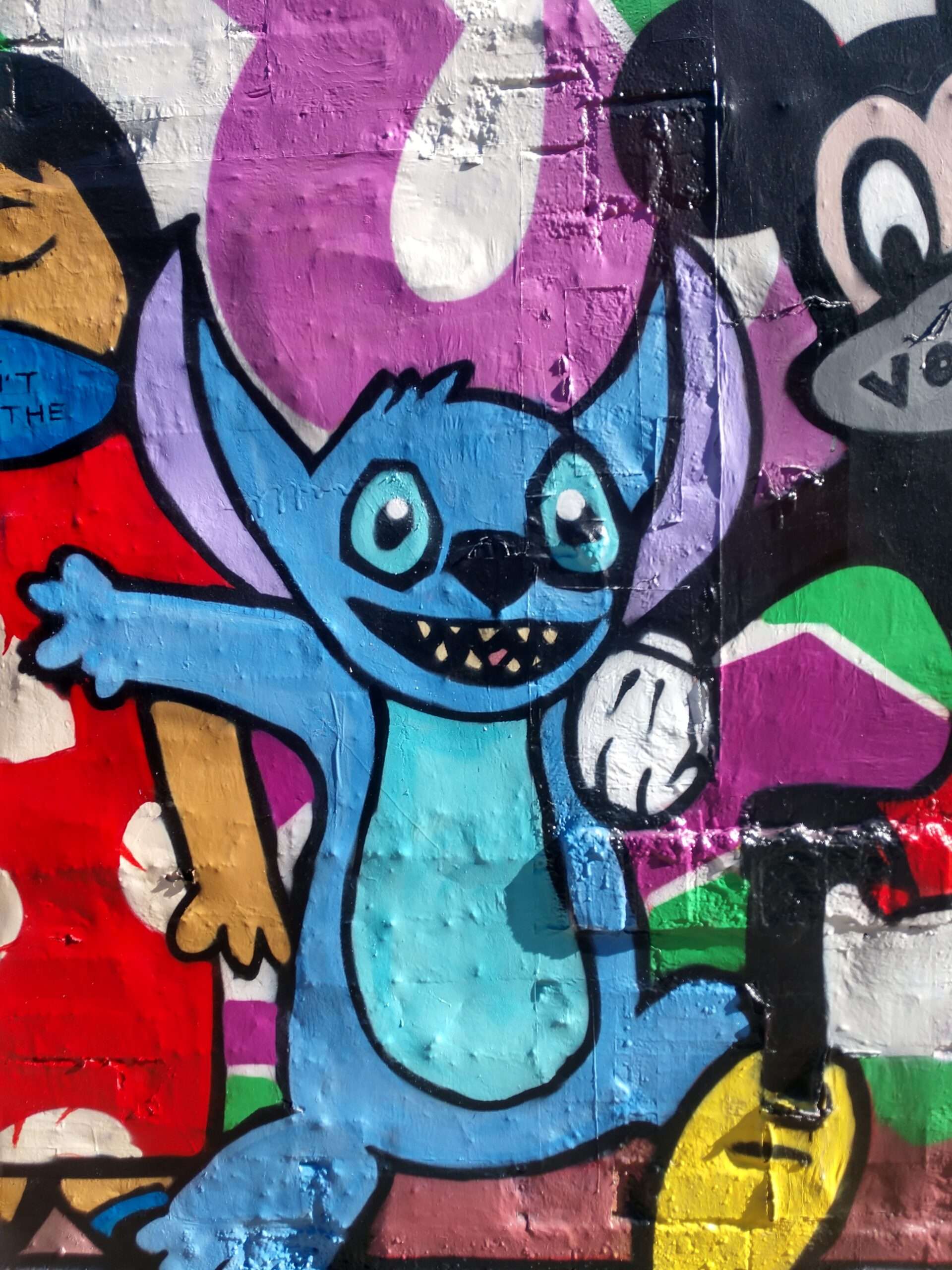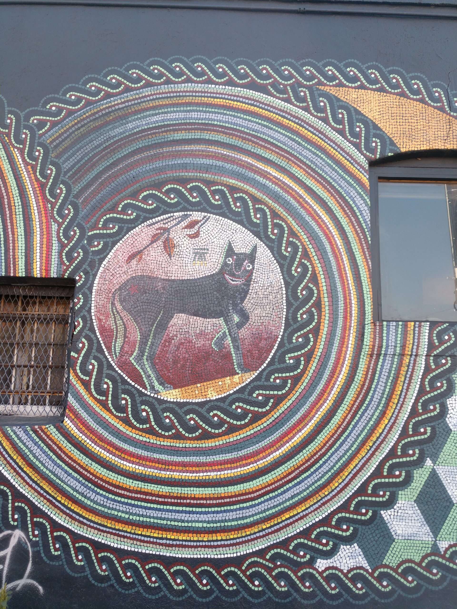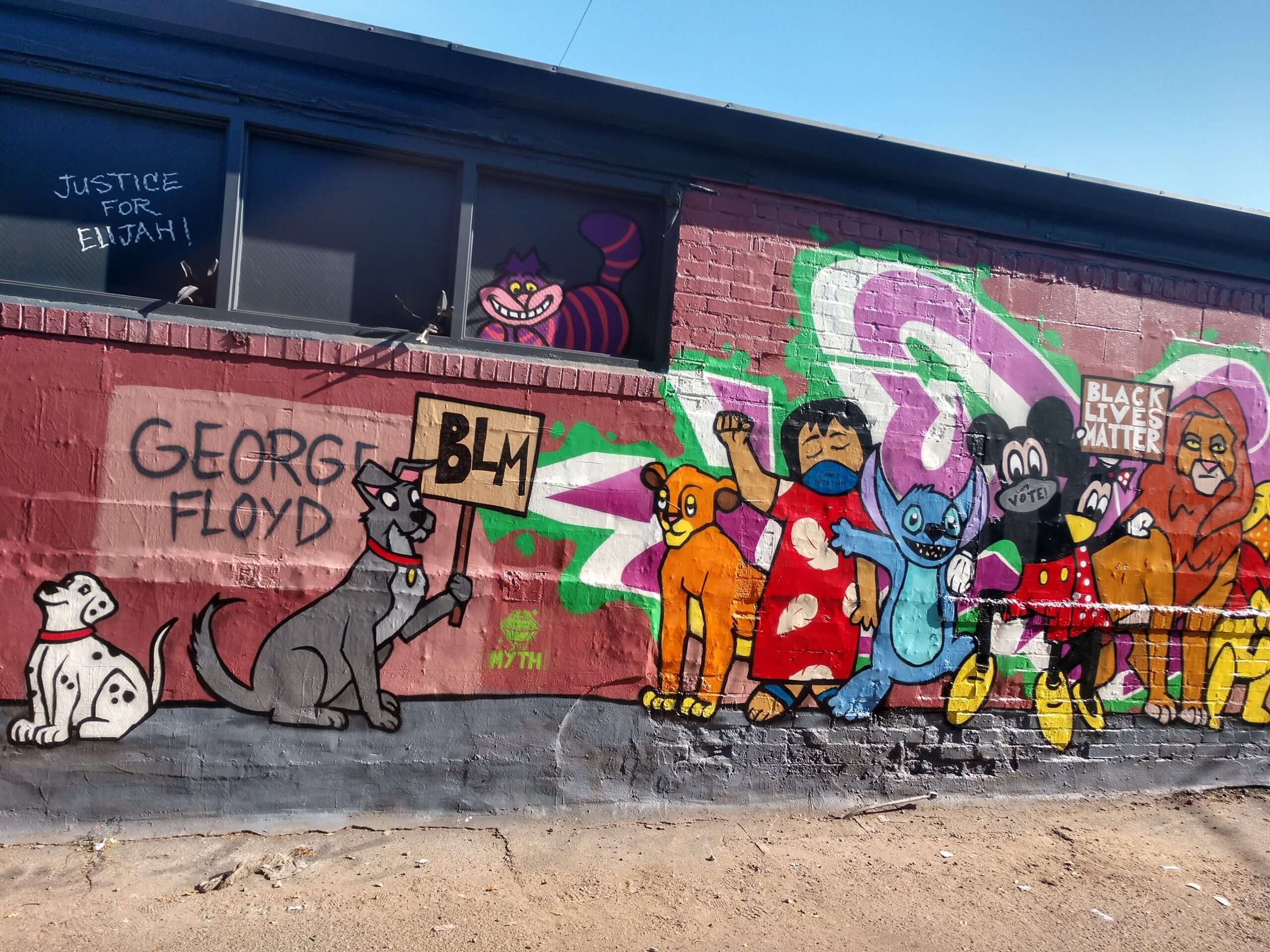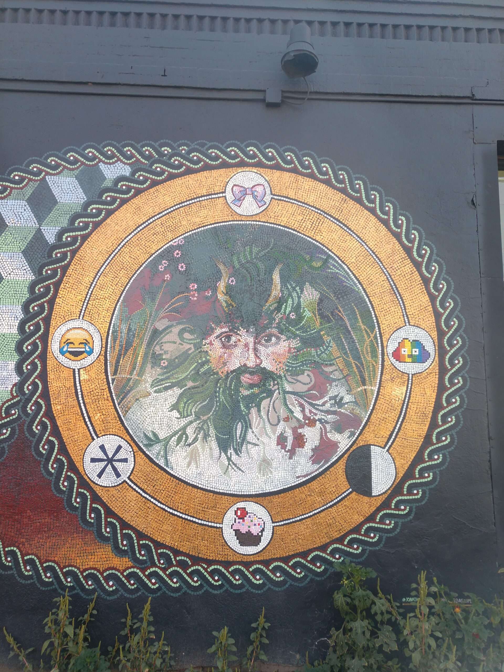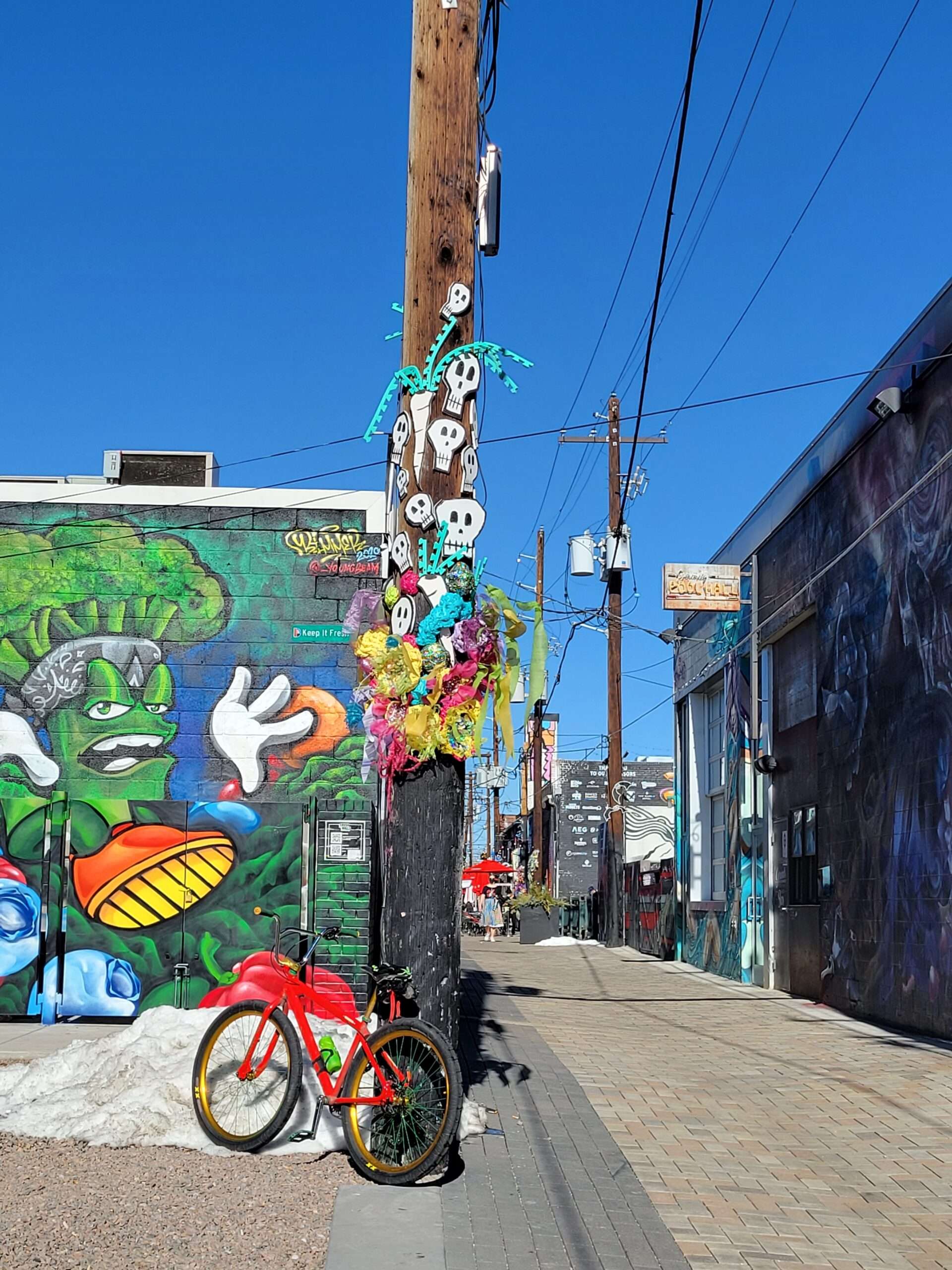 This expansive and colorful piece of Denver street art features a striking portrait of David Bowie with his iconic red lightning bolt makeup and blank white eyes. The surreal mural is packed with eclectic imagery, including an all-seeing eye hovering over blue octopus tentacles, floating bubbles, leopard print patterns, and a green meditating alien painted on an adjacent corrugated garage door. Strung patio lights hang above the dark brick canvas, illuminating this incredibly vibrant and imaginative urban masterpiece.