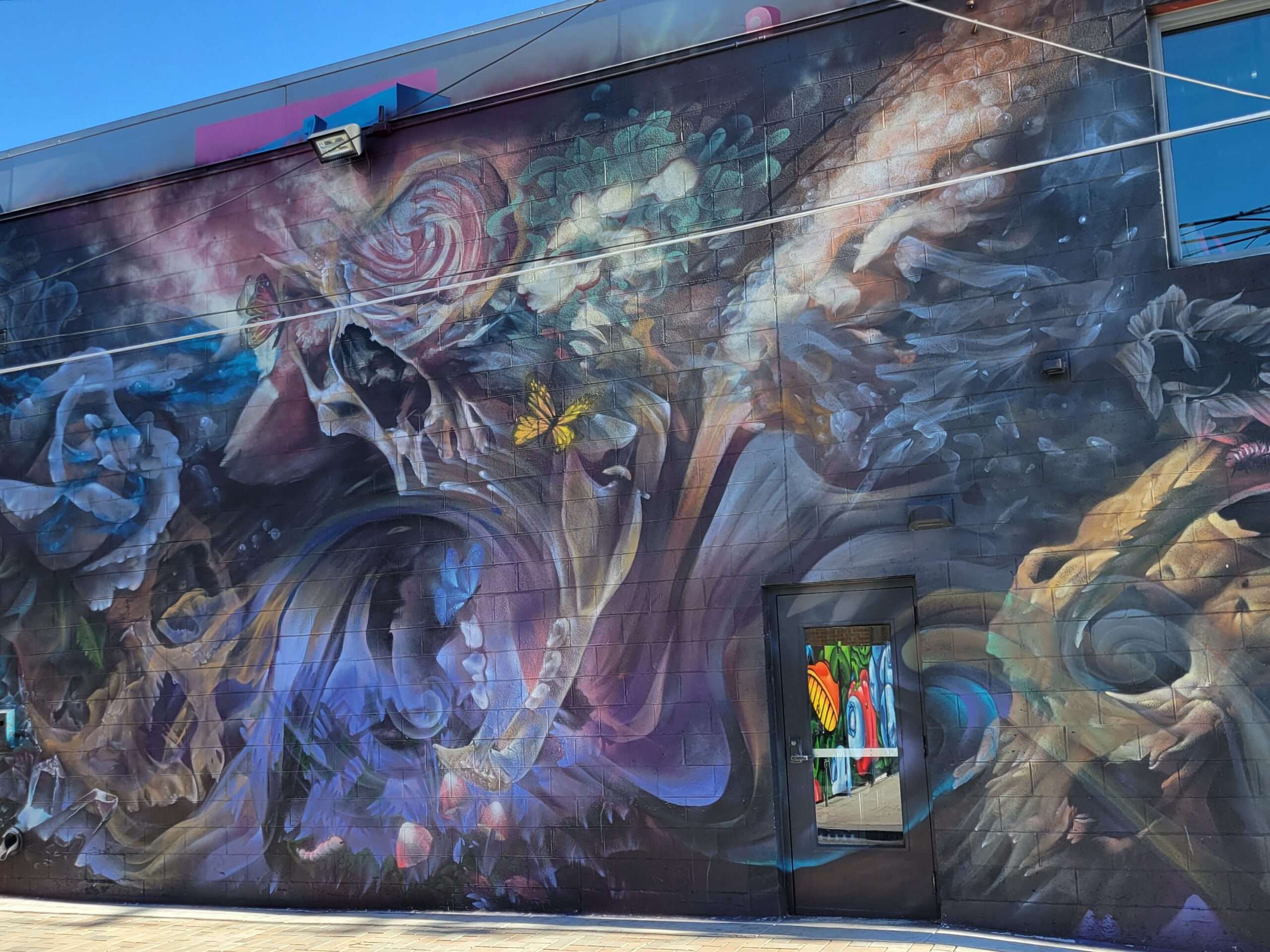 This photograph captures a massive, highly detailed mural on a dark-painted masonry wall. The central focus is a large human skull, rendered in weathered white and grey tones, which appears to be blooming with life. Vibrant blue and purple roses, swirling pink nebulas, and delicate yellow butterflies emerge from and surround the skull. The composition is fluid, with thick, smoke-like vapors in shades of lavender and grey trailing across the facade. In the lower left, smaller skulls and translucent mushrooms are nestled among the floral forms. A black metal door is integrated into the wall on the right, reflecting a colorful mural from across the alleyway. The entire scene is captured under a clear, bright blue sky with a single overhead power line cutting across the upper left.
