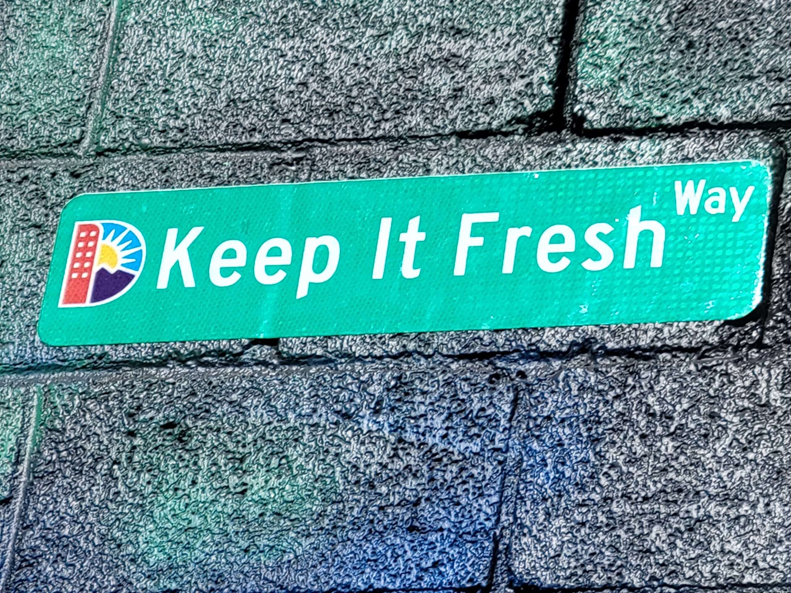 This photograph captures a close-up of a long, rectangular green sign mounted horizontally against a dark, rough-textured masonry wall. The sign features the phrase "Keep It Fresh" in bold white sans-serif lettering, with the word "Way" in smaller white text at the top right. On the far left of the sign is a stylized logo containing a red and white building, a blue sky with a yellow sun, and a purple mountain—a likely reference to the Denver city skyline and local geography. The wall behind the sign shows a subtle green and blue overspray, suggesting the presence of nearby murals.