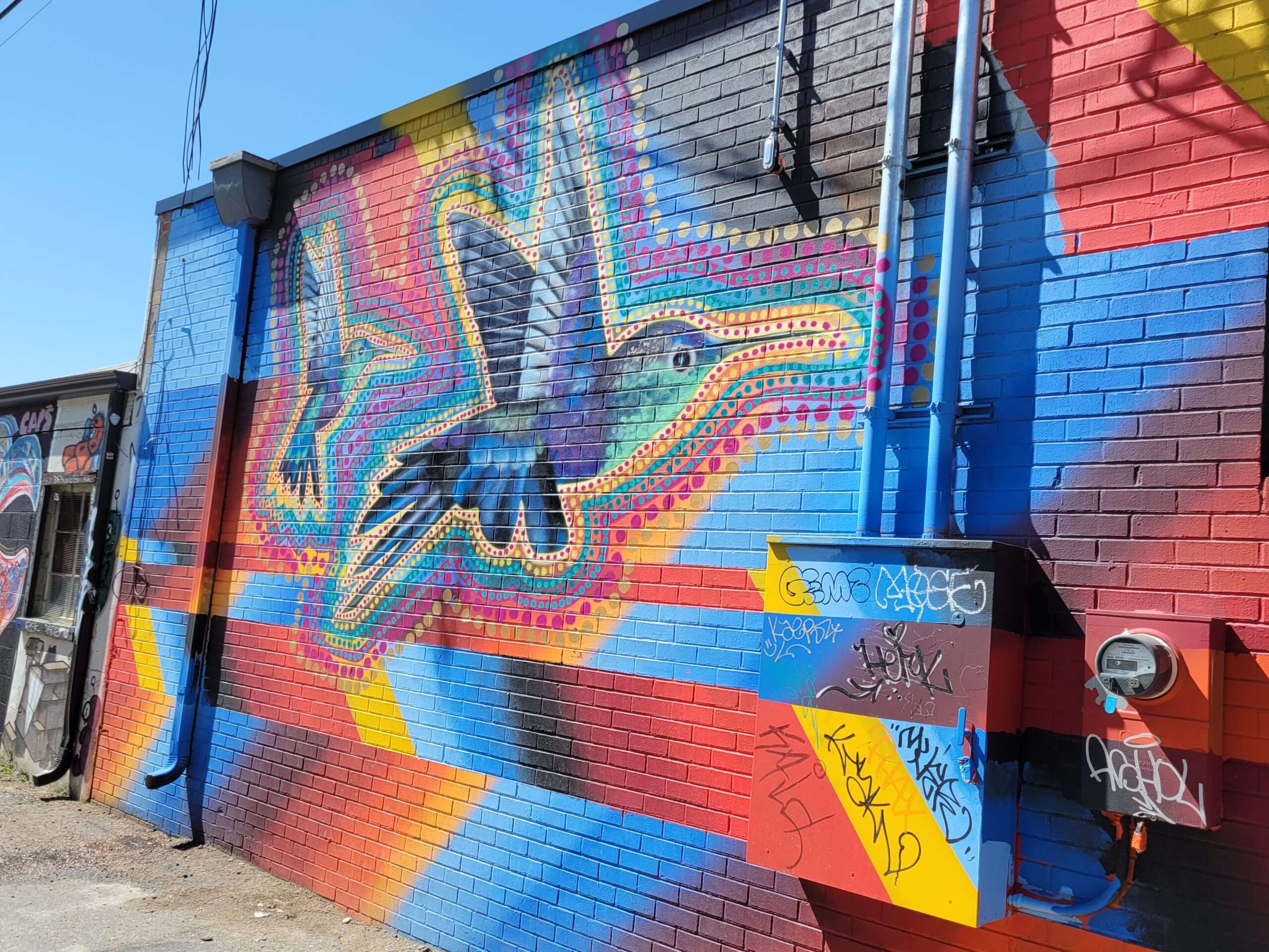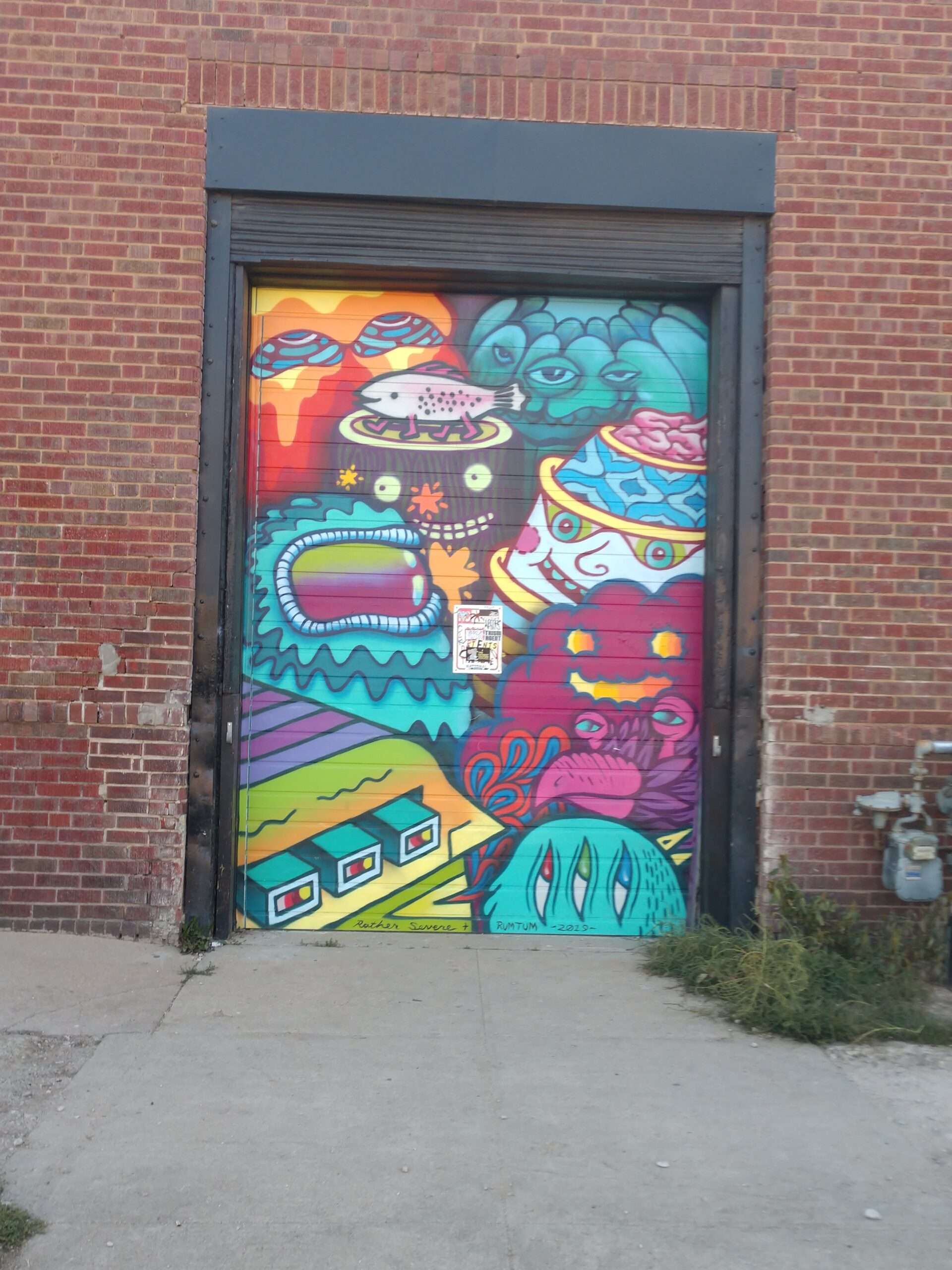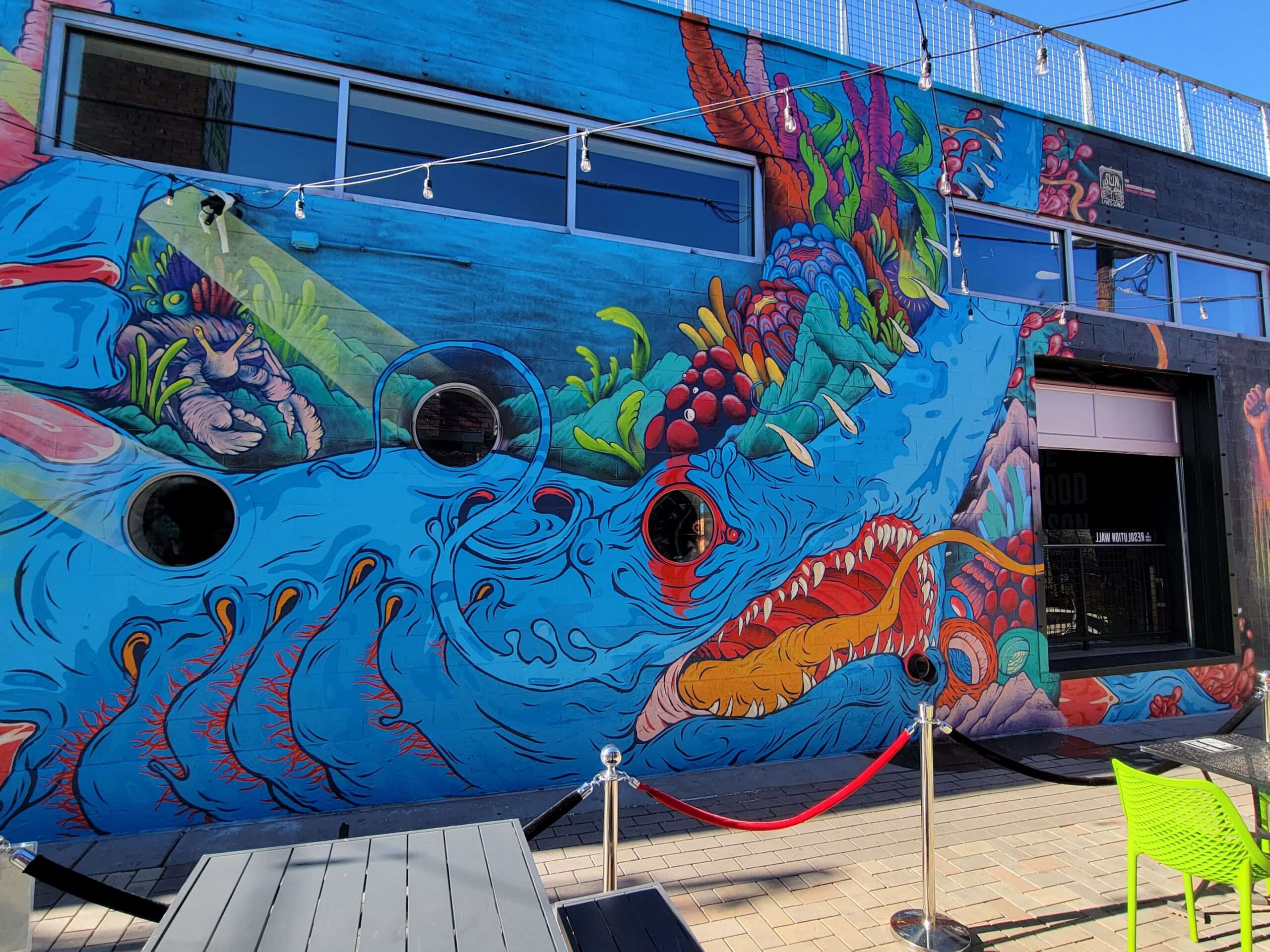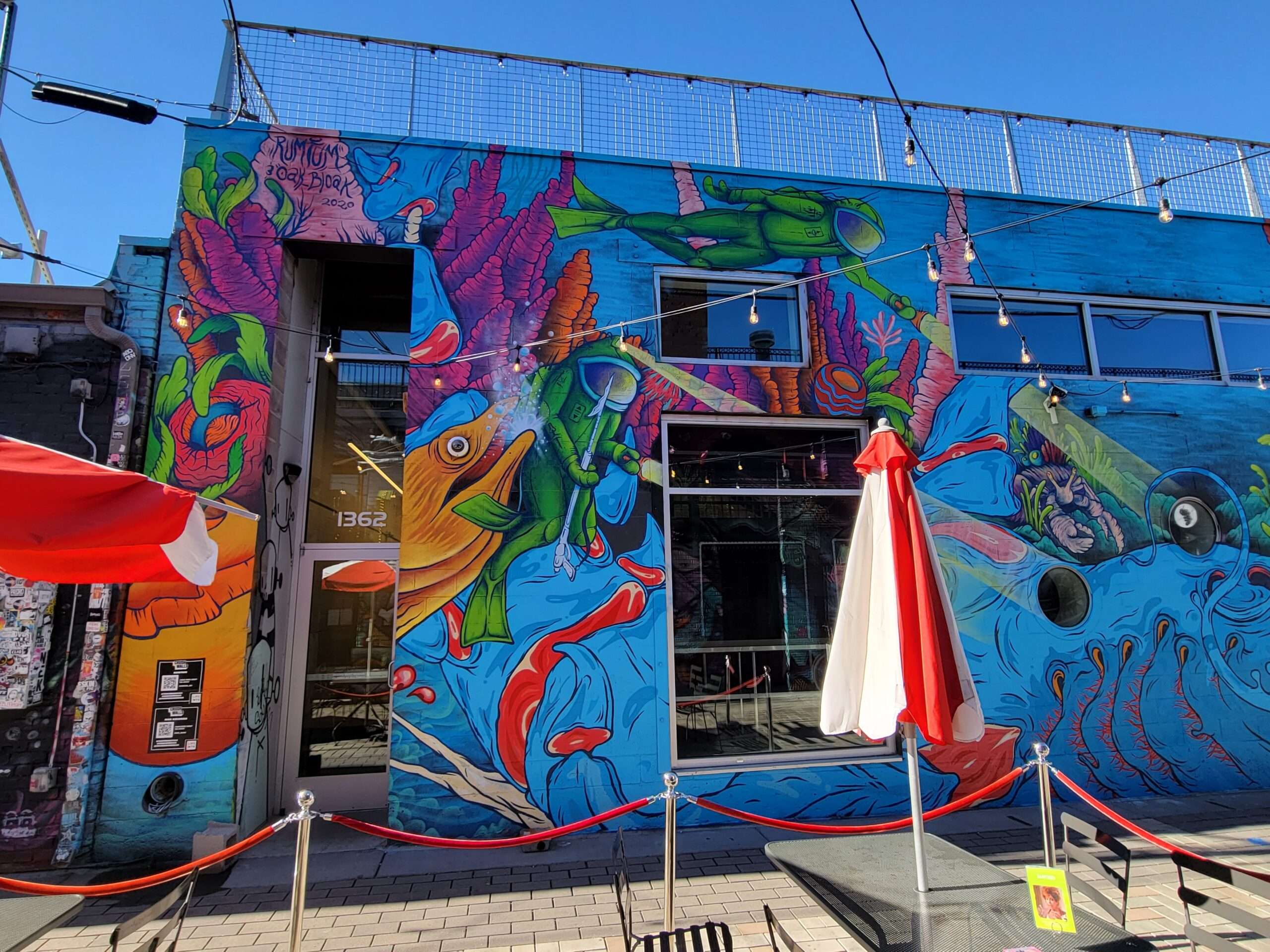 This captivating piece of Denver street art features a psychedelic, cybernetic bull rendered in vivid reds, purples, and greens against a rolling metal door. The surrounding brickwork continues the aquatic theme with jellyfish and organic shapes, showcasing the high-energy urban gallery atmosphere found throughout the River North area.